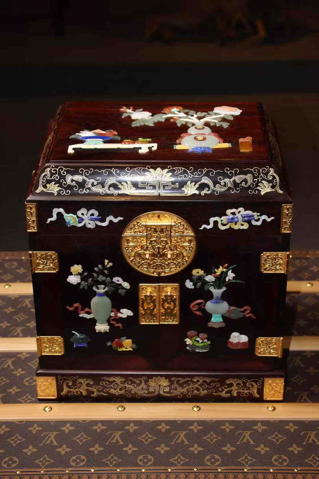 箱体面板为小叶紫檀紫檀老料独板,面百宝玉嵌瓶花清供图,边角花片皆錾纹镀金,又与描金卷草、团花呼应。