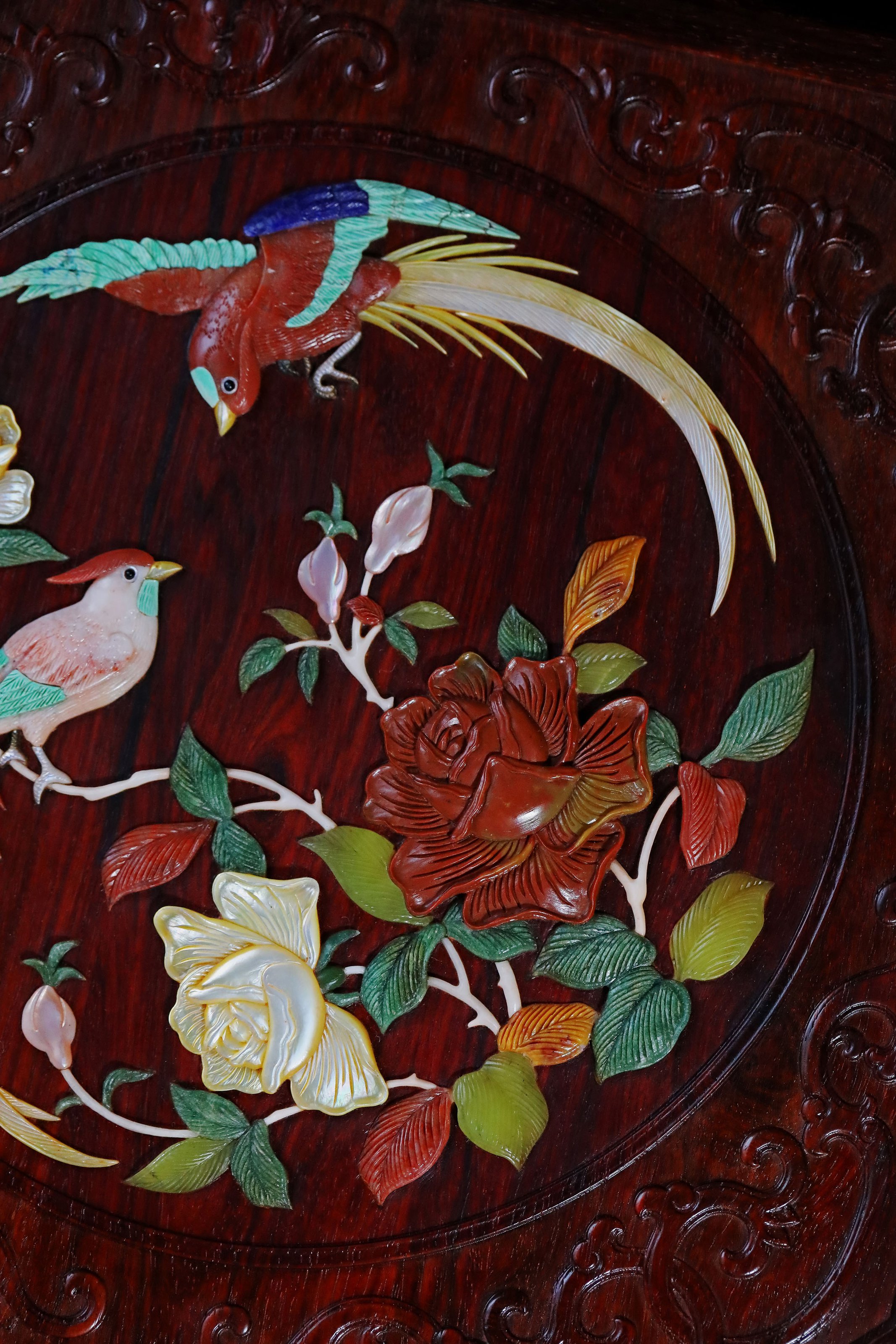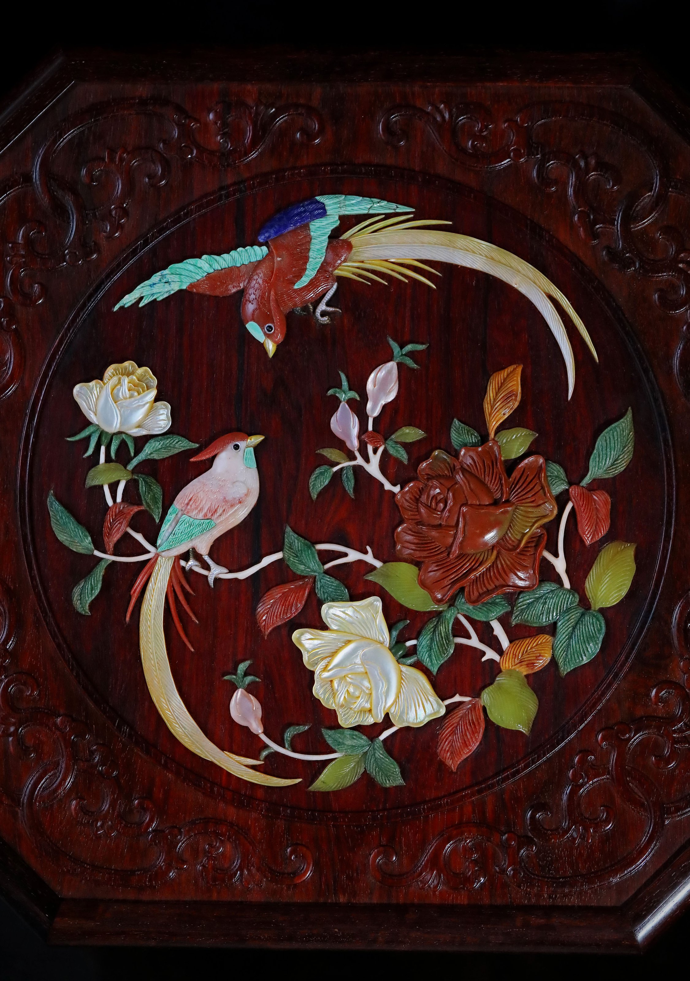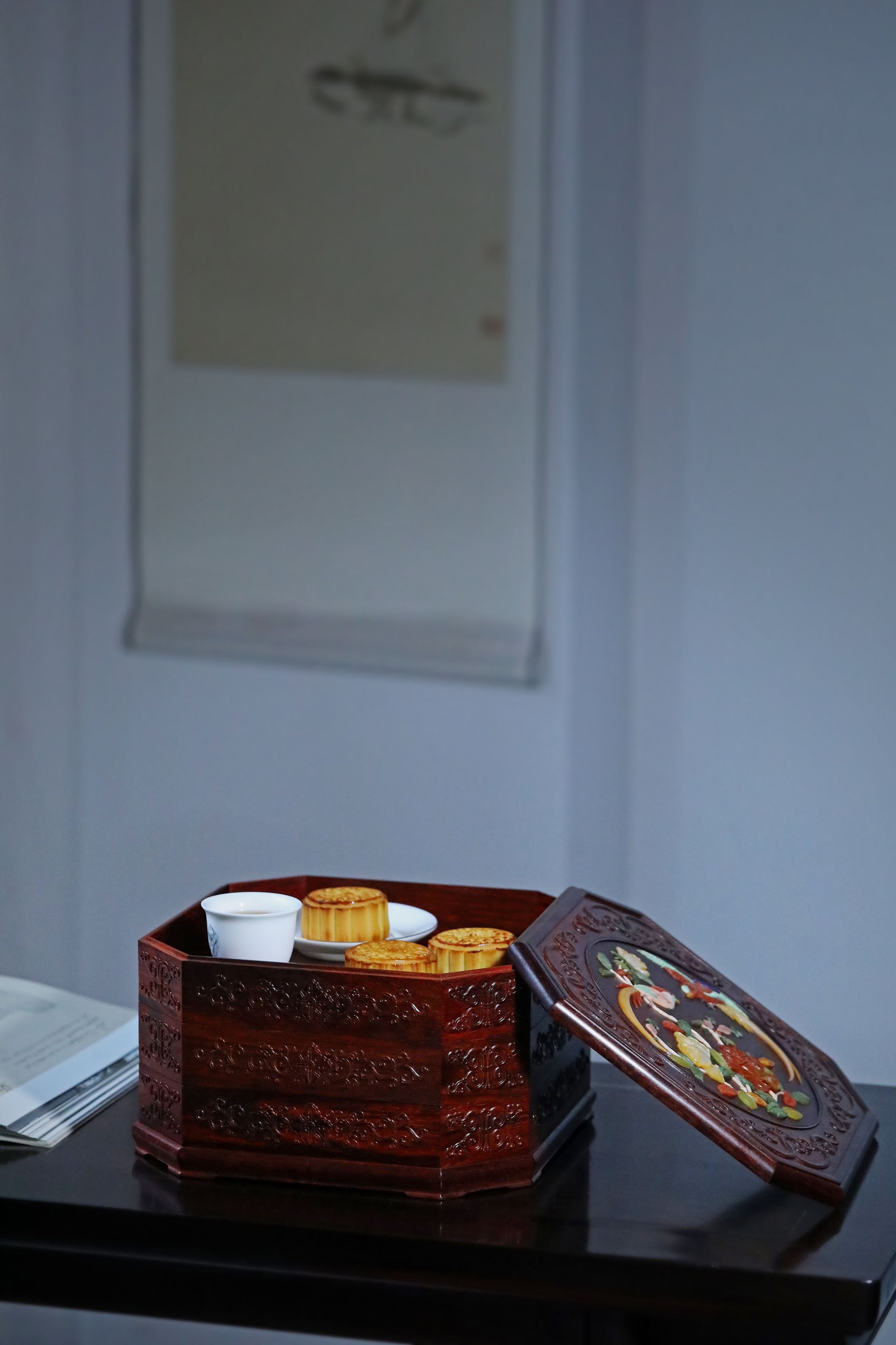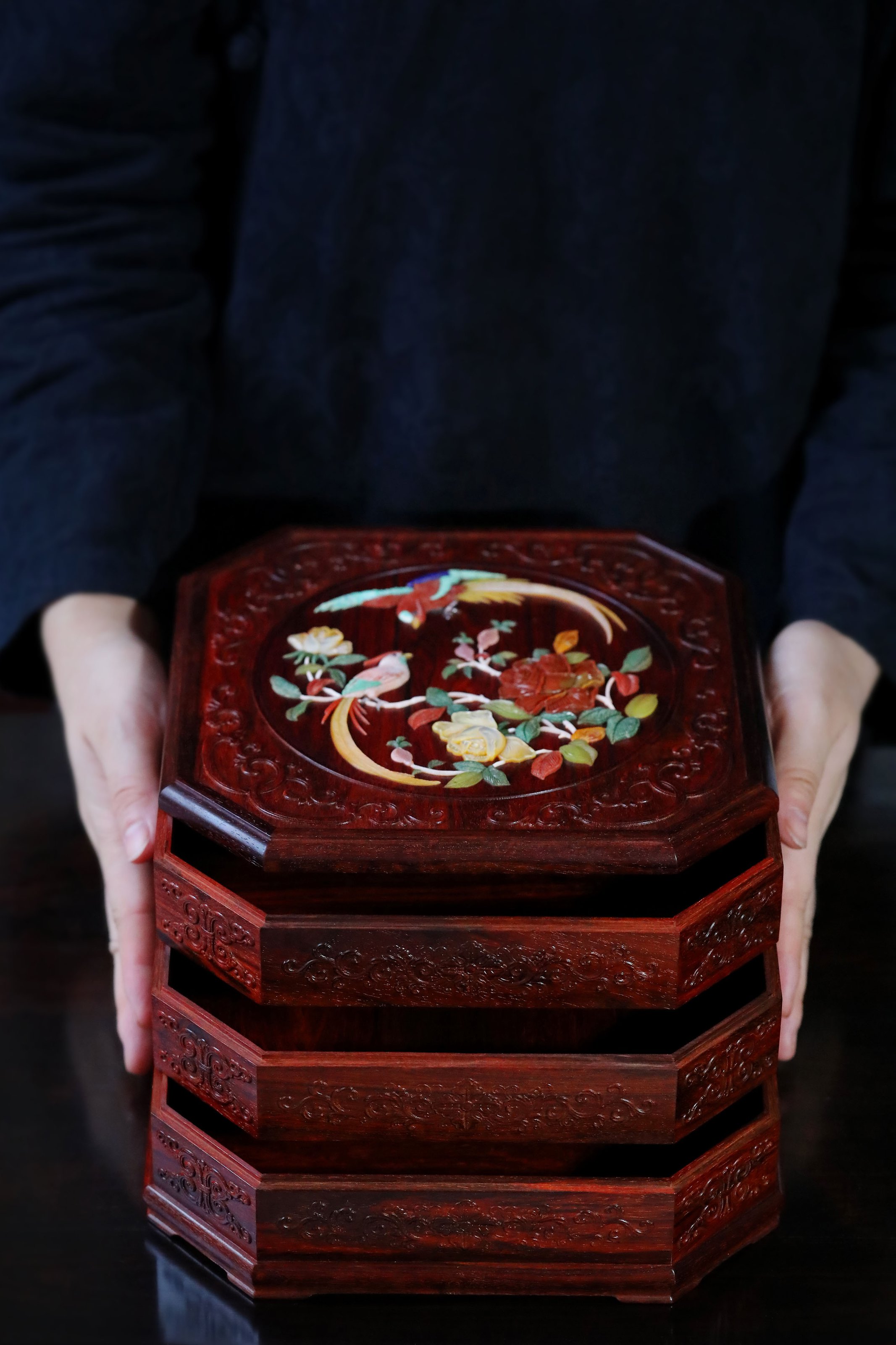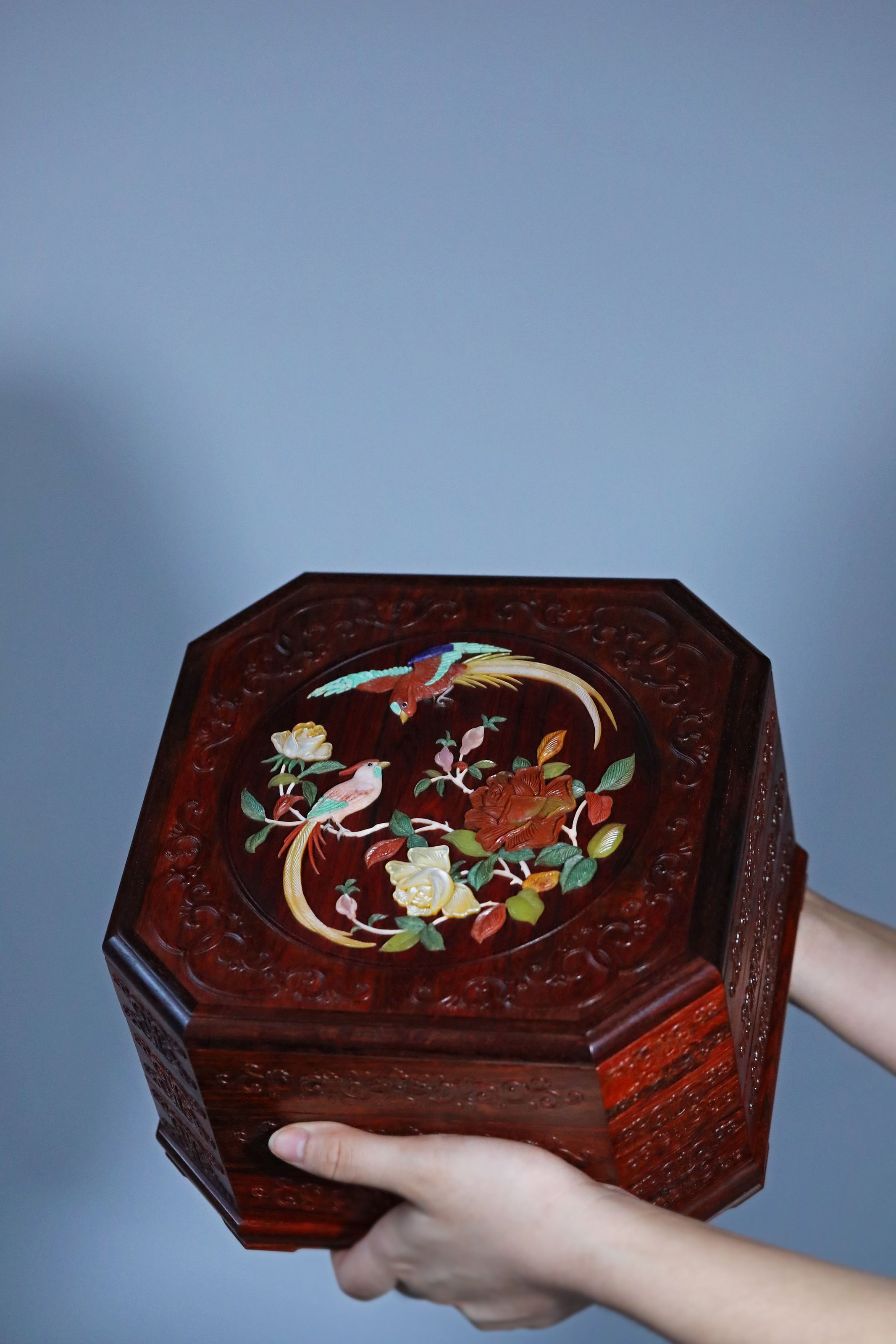 直径:23.8cm 宽:23.8cm 高1:3.5cm 喜上眉梢茶盒 小叶紫檀制,盒八角三层,榫卯结构,百宝嵌花鸟,牡丹富贵向荣,喜鹊一双更添生机。周身以缠枝莲纹为饰,寓富贵祥瑞。 直径23.8cm 23.8cm 高13.5cm