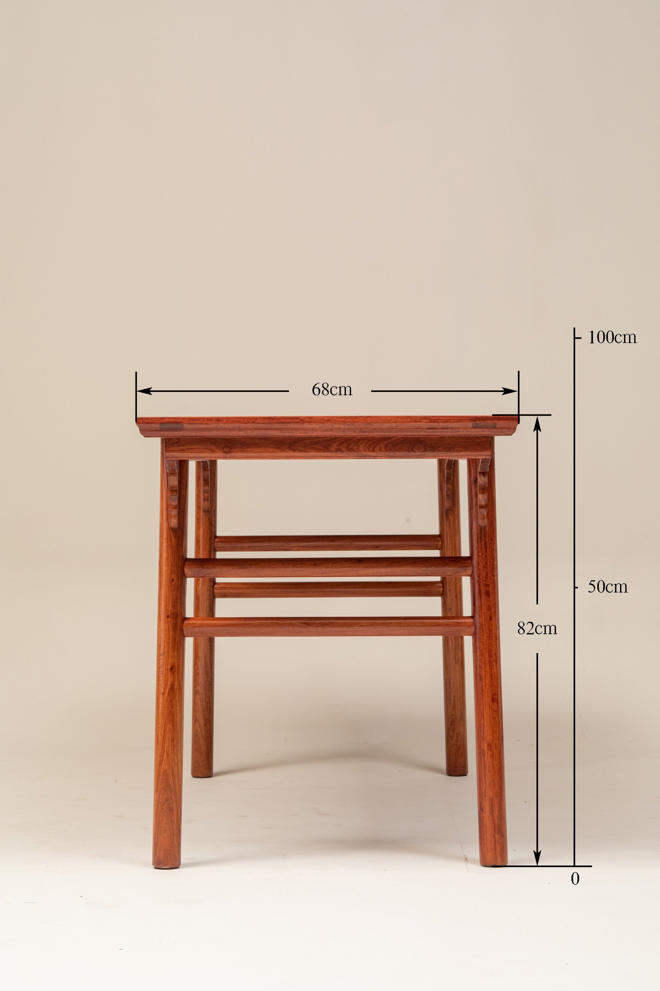 此案以赞比亚紫檀制,色泽沉穆,纹理美观。桌面以格角攒边框镶嵌板心,边抹冰盘沿上舒下敛。夹头榫结构,牙头锼挖如意云耳,线条有力,沿边锼流畅的线脚,为整案增添神韵。四腿八挓,结构稳固。方材腿足雕瓜棱形,是本器一大特色,两侧装双横枨,形式和谐而统一。整器线脚丰富,简约中透着灵动。