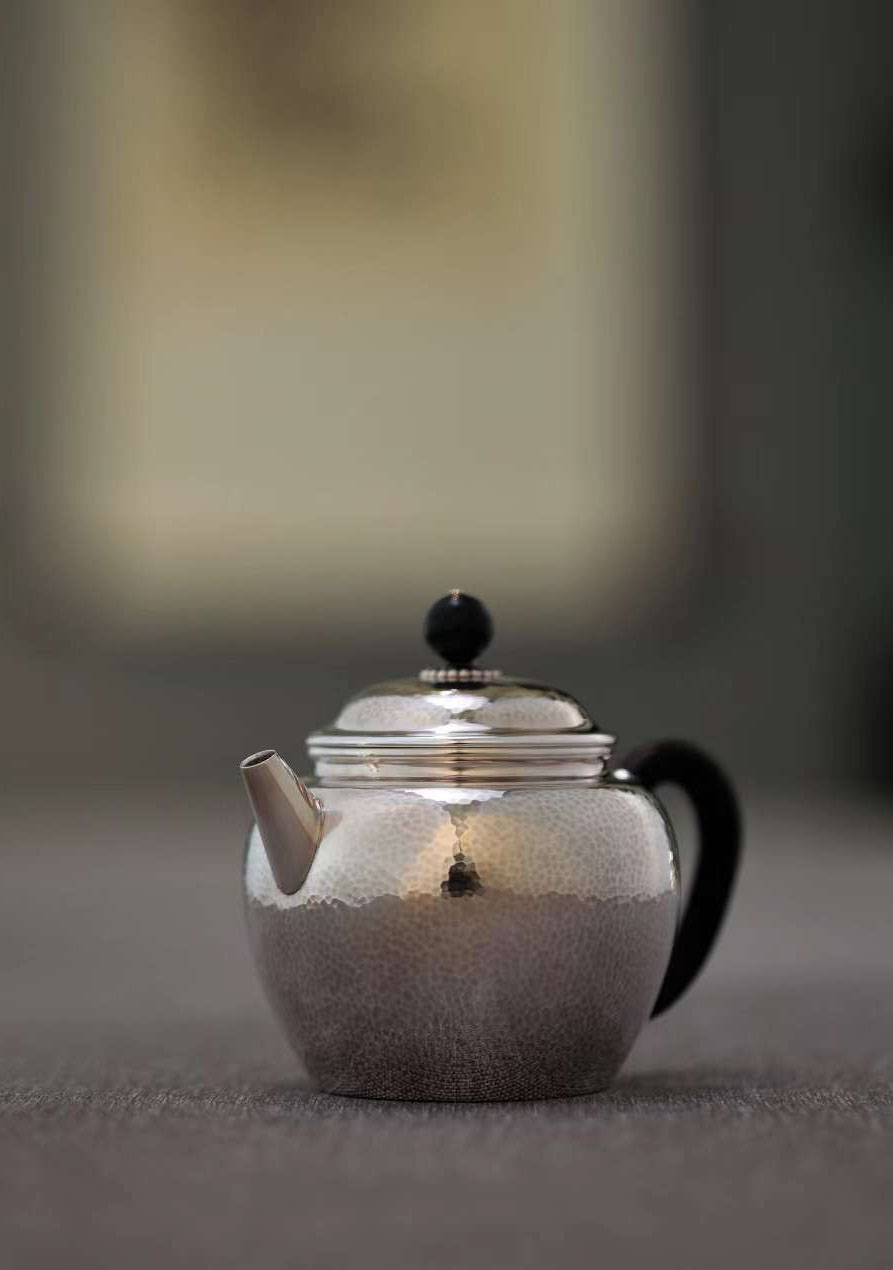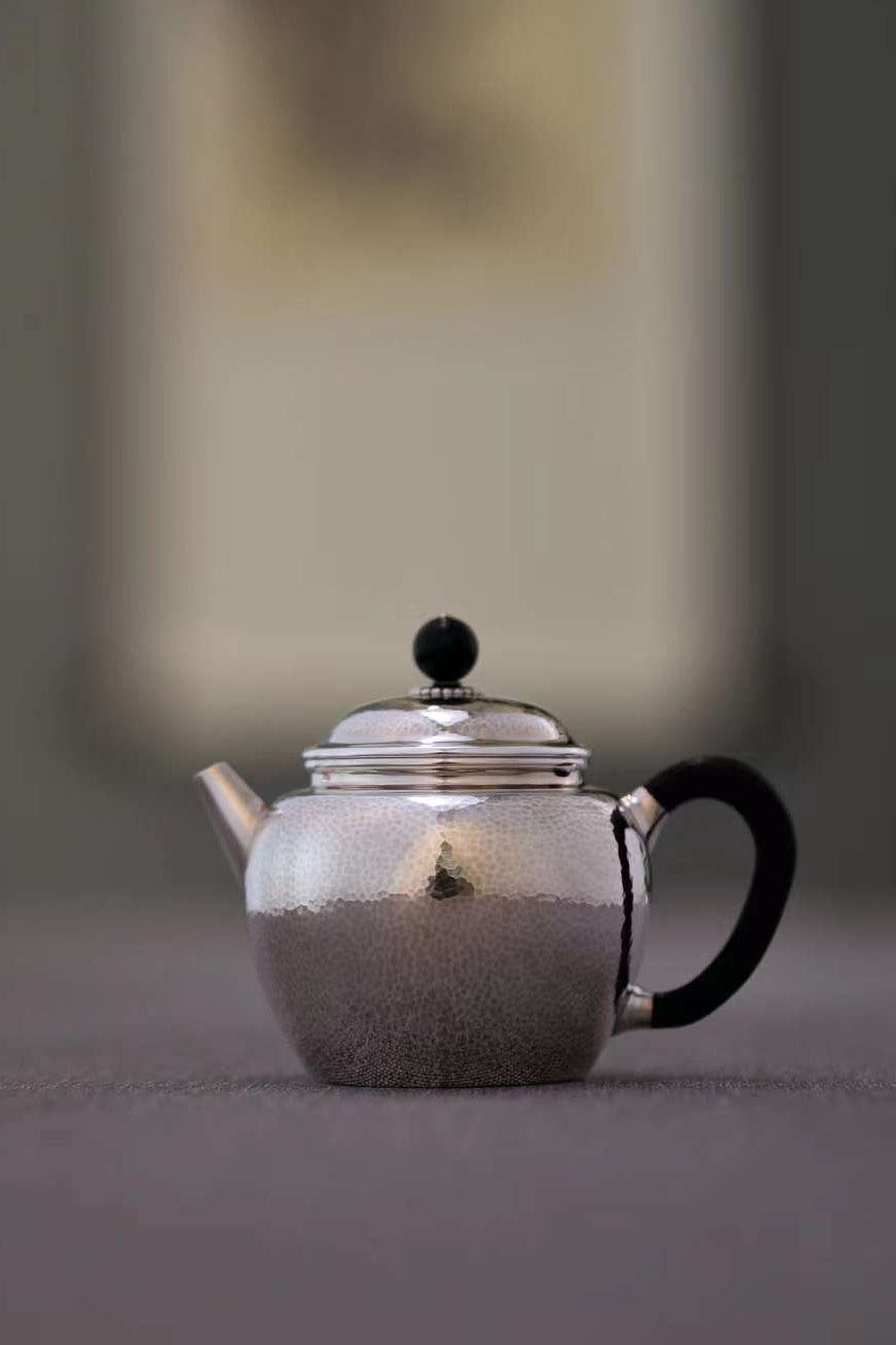 掇只纯银泡壶 大雅堂出品 非遗传人李福明造 掇只壶是紫砂壶造型中特有的一种壶型,造型像宜兴当地以前使用的一种装调料、糖果的容器“掇子”,所以又被称为“掇子”,李福明老师吧流口处理成直口,保留成掇只壶身器型,颇具特色。 大雅堂主赵清涛与李福明探讨金银器设计及锻造