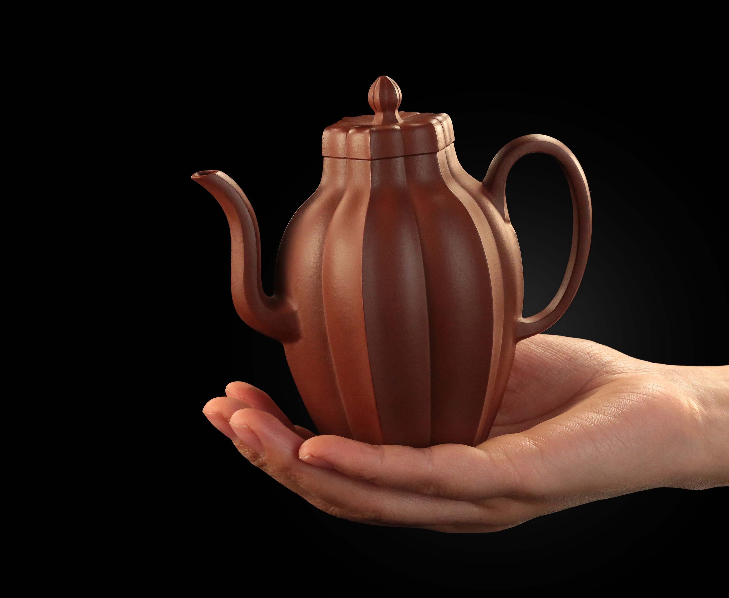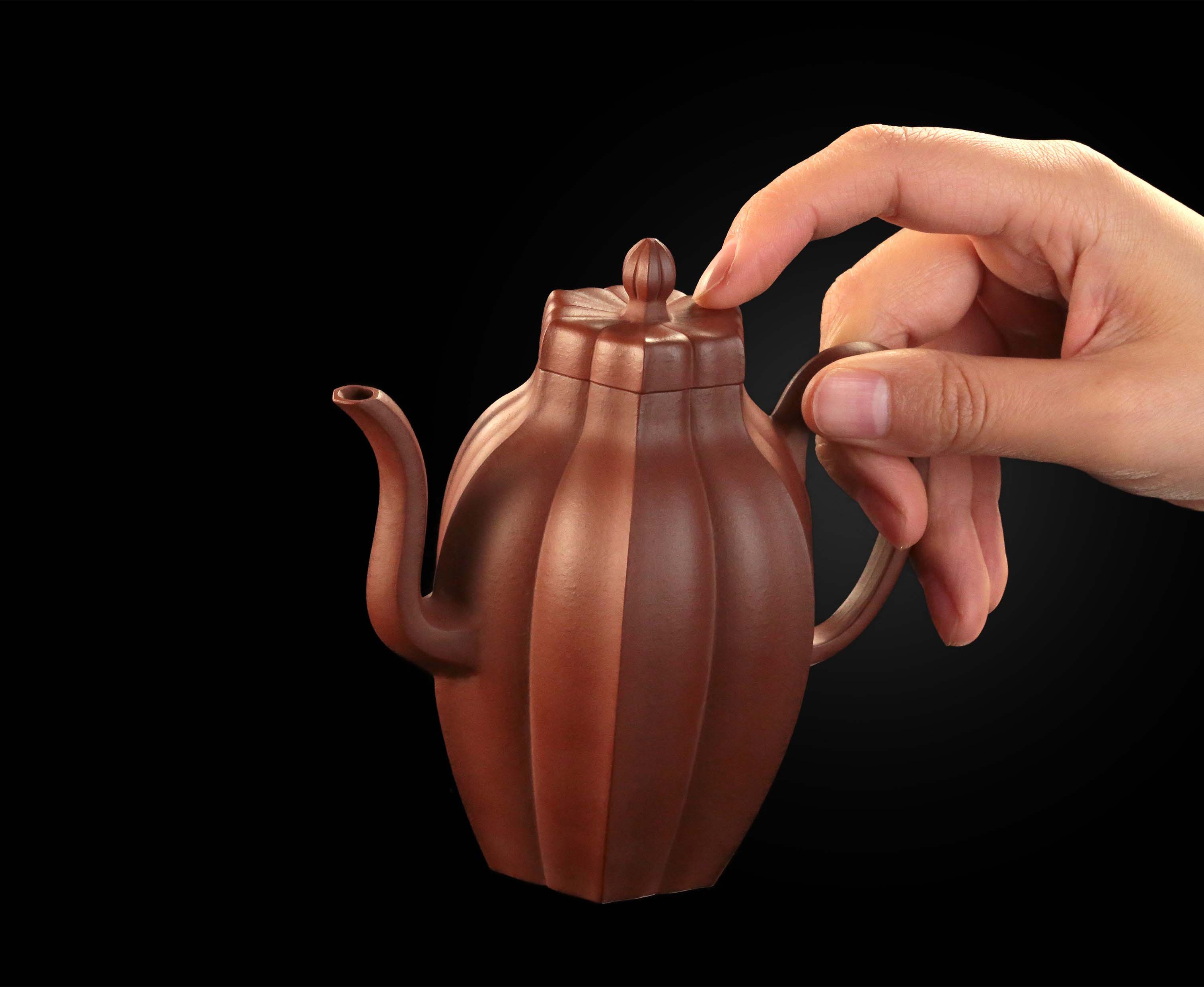 菱花高宫灯壶 材质:紫泥 容量:250ml 规格:长14cm高13cm 内口径4cm 此款“菱花宫灯壶”结合了菱花造型制成,造型别致,宫灯造型始于清代雍正年间,其原型为灯笼,为屯头村一老汉设计后来屯头灯笼被一县级官员进贡到宫中,屯头灯笼被定为贡品取名贡灯,成为皇宫专用品,后来人们把“贡”换做“宫”字,成了现在的“宫灯”宫灯壶就是根据此种灯笼设计而成,气韵高雅,筋纹凹凸有致,沉稳不骄,精美灵动。