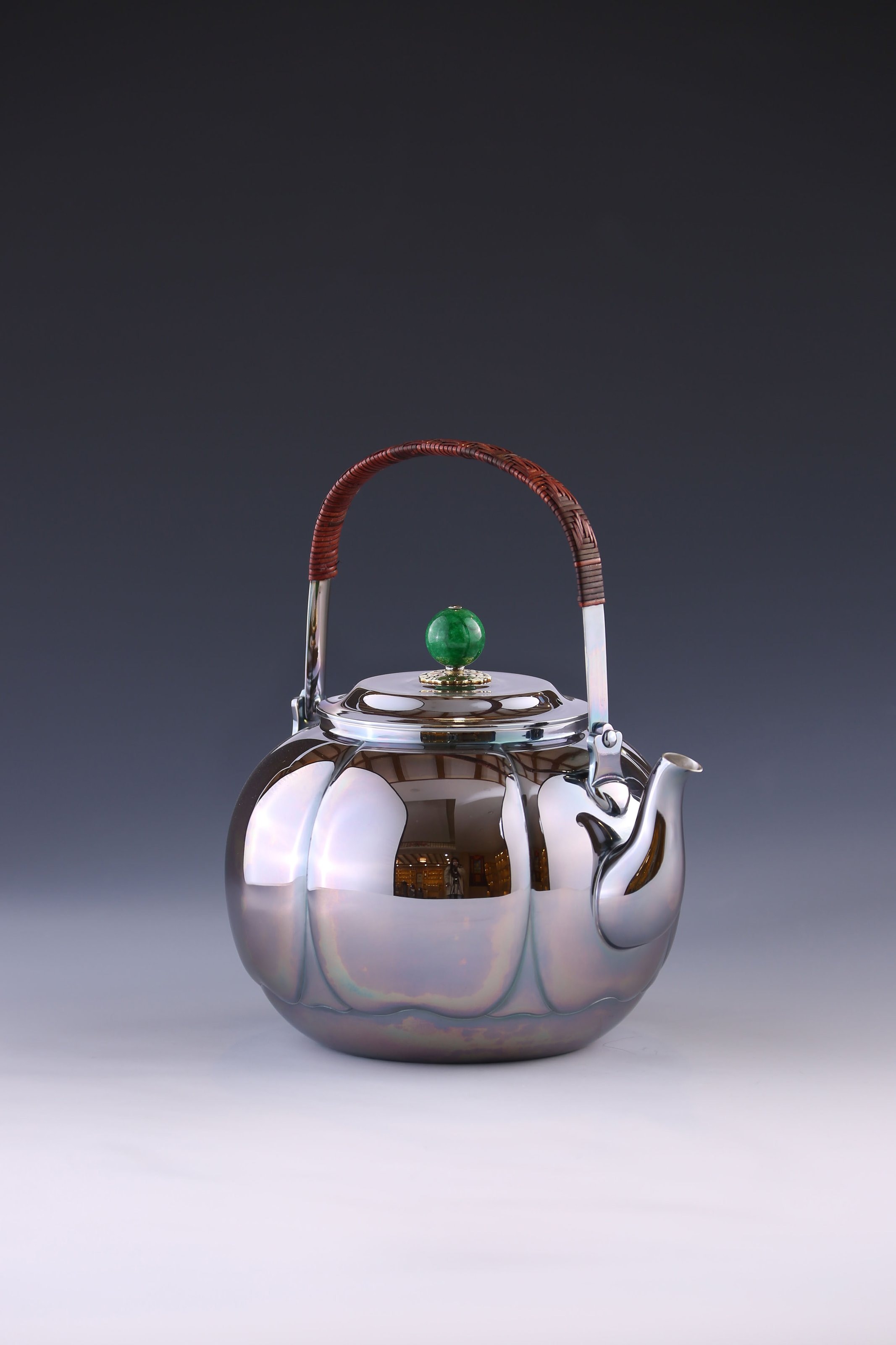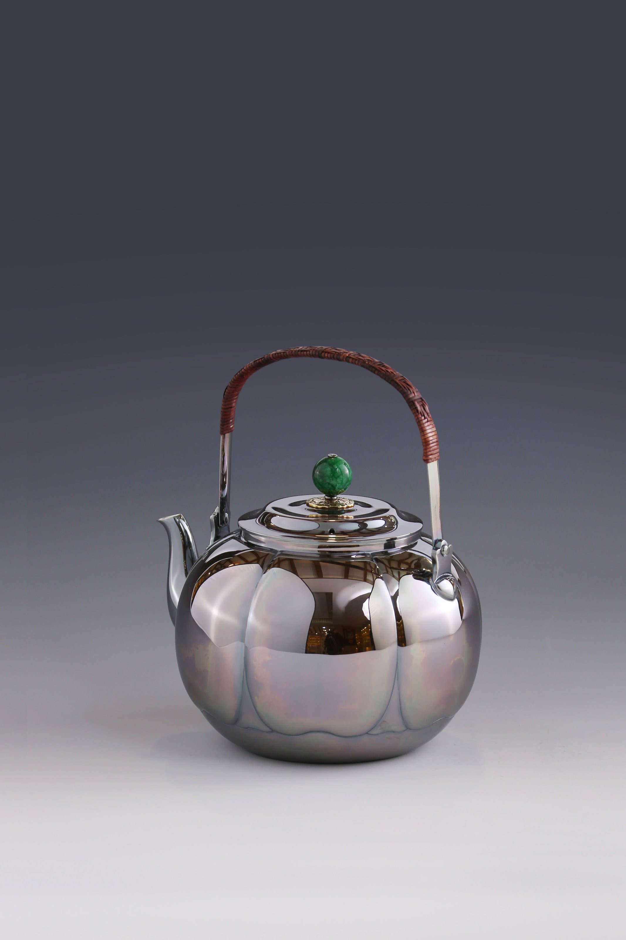 花瓣银壶 容量:约1100毫升 克重:约508克 为六瓣花式造型,整体光素,做工精细纤巧,不失毫匣。 三弯流口,老红木把防烫,硫化处理退去表面浮华。型素简,线流畅,弯如虹,气高洁, 有菊花般的清幽,乃冲茗、赏藏雅物。
