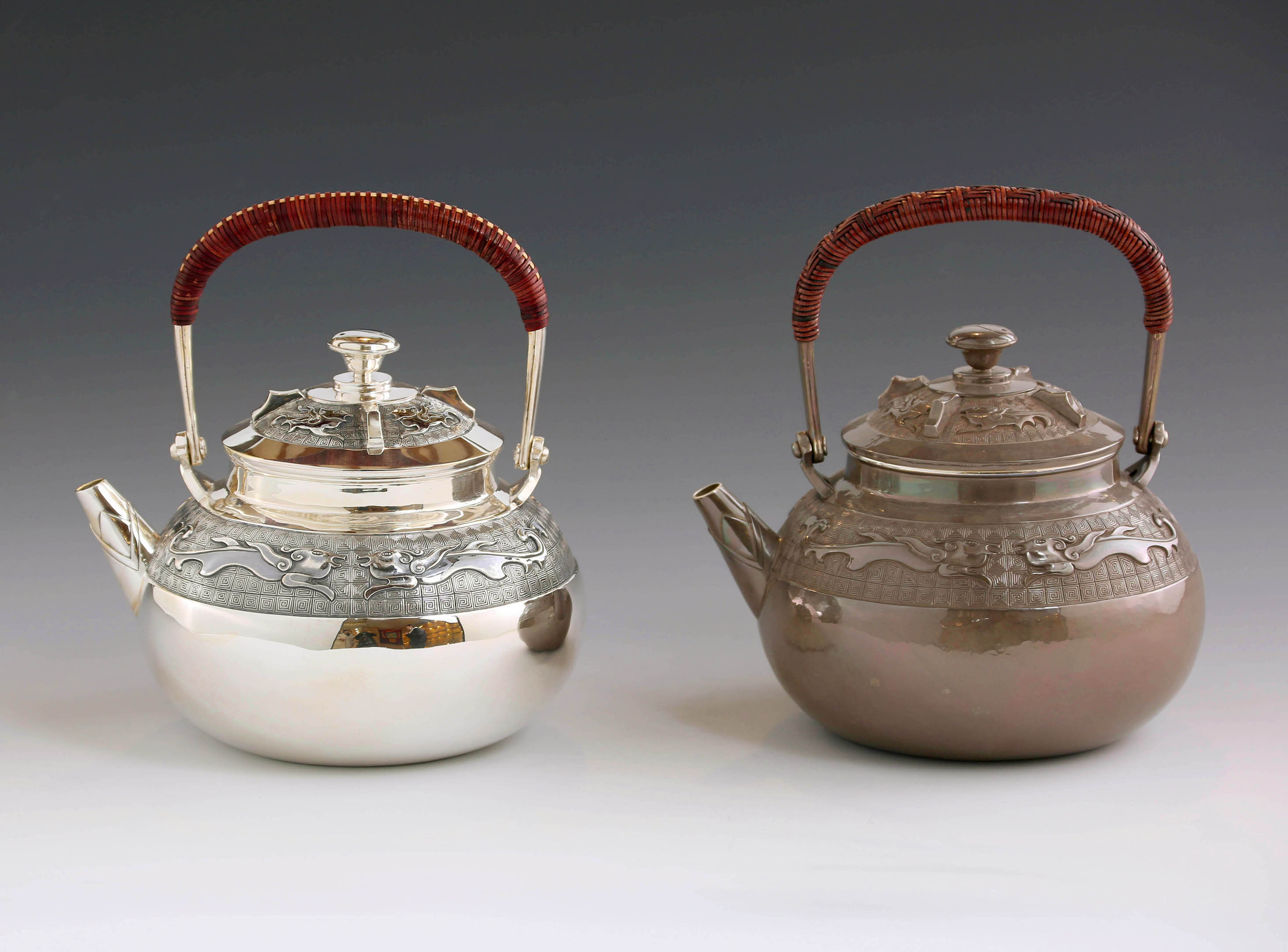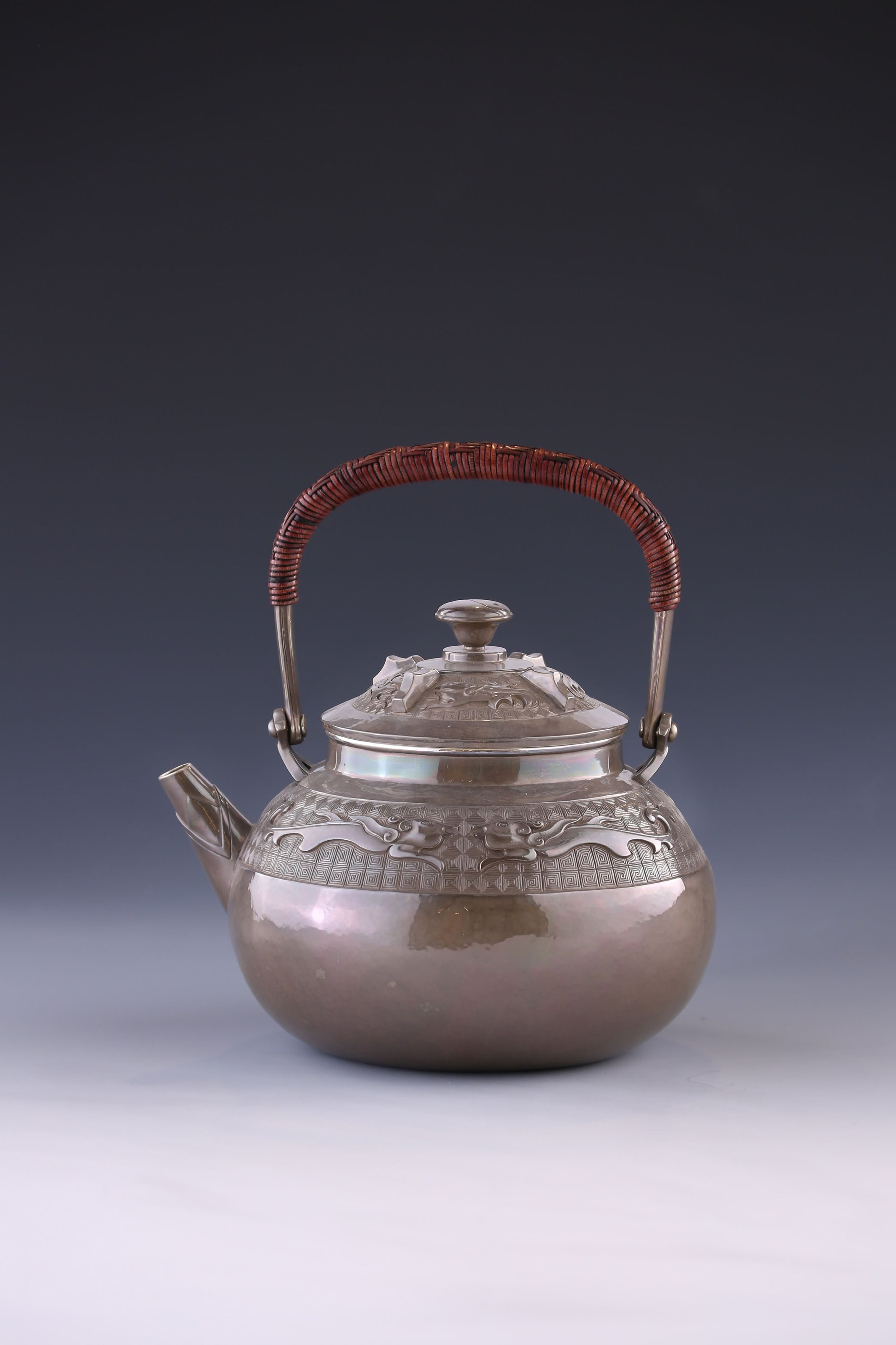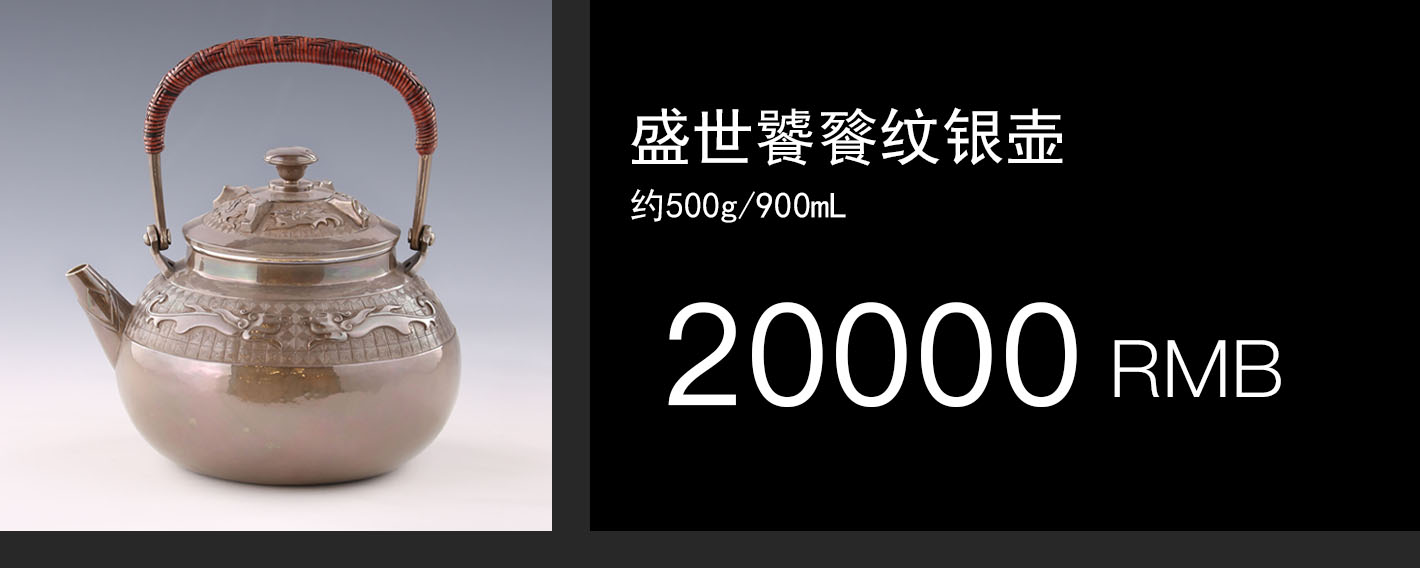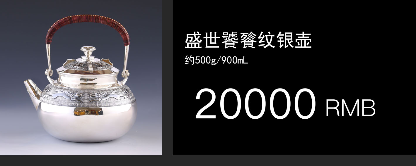 大雅堂出品 非遗传人洪继科 造 盛世饕餮纹银壶 容量:约900毫升 克重:约500克 直口,圆腹,束腰,壶身壶盖錾刻饕餮纹,老藤编把,硫化表面处理浮华褪去,沉稳安静,风格内敛古雅。 饕餮纹卣式银壶 克重:约580克 容量:约1000毫升