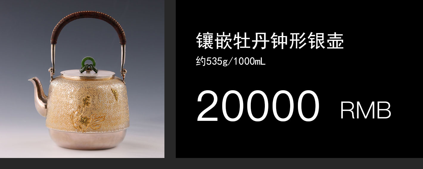 容量:约1000毫升 克重:约535克 镶嵌牡丹钟形银壶 壶身造型沉稳;三弯流口舒朗挺拔;提梁俊逸,老藤编把;碧玉三环壶摘。壶身錾刻牡丹富贵纹,壶身处理成岩纹,缝隙填金,花朵错金。雅致中暗藏贵气。 大雅堂出品 银器锻造非遗传人 洪继科 造