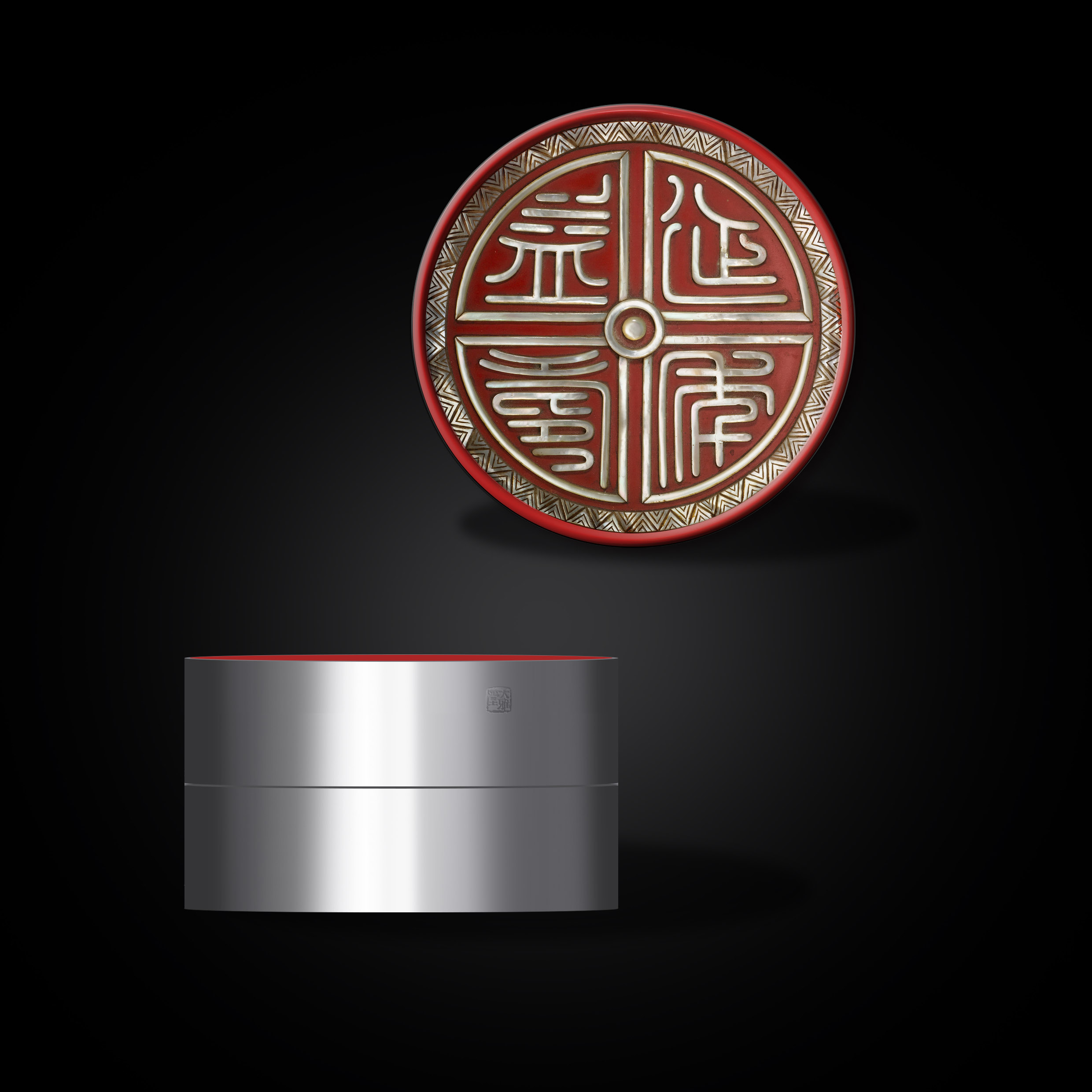 设计灵感从汉印而来。圆圆满满的朱红中镶嵌珐琅“延年益寿”四个字。