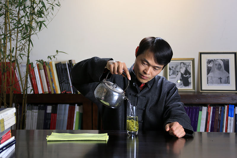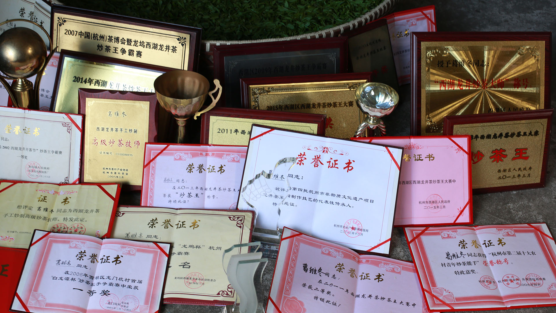 西湖龙井制作技艺非遗传承人 葛维冬 5届炒茶王,至今已有20多年炒茶经验。在炒茶王葛维冬看来,正宗的西湖龙井,不光鲜叶产区要地道,还得秉承传统炒制工艺。 葛维冬一家有4亩多茶园,通常能采春茶160斤左右,他的主要任务就是炒茶。 作为国茶,西湖龙井具有1500多年的历史,其独特的品质除了特殊的地理位置和小气候外,更重要的是精绝的手工炒制加工工艺。 2008年,“西湖龙井茶制作技艺”被列入国家级非物质文化遗产名录。从这一年起,为了传承该技艺,葛维冬每年需带3到5名徒弟。走不善言谈的葛维冬欣慰地说:如今炒茶后继有人,手下好几位徒弟,技艺都颇为精湛。 炒茶关键在于控制火候与手法 葛维冬说 一般都会把刚采下的鲜叶放于阴凉干燥处,两小时后再开始炒茶。炒茶时还分两个步骤,先杀青炒15分钟左右,好了之后放半小时,然后回锅炒好就可以拿来卖了,不过一般一锅只有3两左右茶叶。 高档西湖龙井全凭一双手在一口光滑的特制铁锅中,不断变换手法炒制而成。炒制手法有“抖、搭、搨、捺、甩、抓、推、扣、压、磨”等十大手法。炒制时根据鲜叶大小、老嫩程度和锅中茶坯的成型程度,不断变化手法,非常巧妙。只有掌握了熟练技艺的人,才能制作出色、香、味、形俱佳的西湖龙井。 控制火候与手法正确是炒好茶必备的两点。炒茶开始的时候温度不能太高,要维持在200℃左右,接下去才慢慢提升些温度,发现温度高后又要马上降下来。炒的时候十大手法要按顺序来进行,不能把顺序弄反了,用劲要灵巧,该用劲的时候就要用劲,该轻的时候则需要少用劲。炒得好的茶颜色会比较鲜艳,外形也比较美观,像一把利剑一样又扁又锋利,因为炒的时候叶子会一点点缩进去,茶叶泡出来也不会散开。
