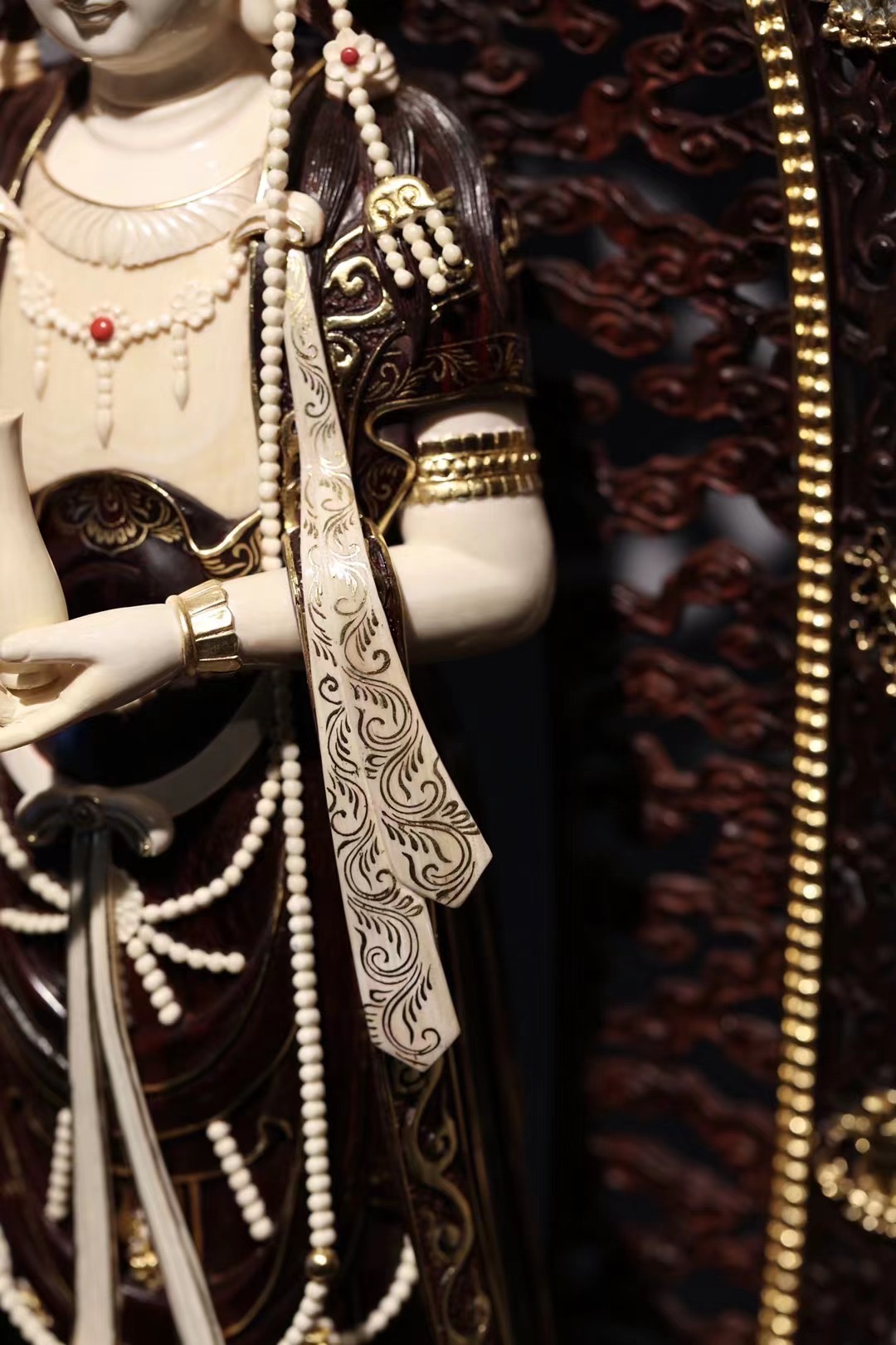长:27cm 宽:23.5cm 高:74.5cm 佛像高:42cm 重:6020g小叶紫檀|猛犸牙雕 杨柳观音 猛犸为肤,甄选老紫檀做衣。雕刻纹饰璎珞细谨,嵌猛犸宛如一体,更添描金彩绘,处处可见制者虔诚用心。 长:27cm 宽:23.5cm 高:74.5cm 佛像高:42cm 重:6020g