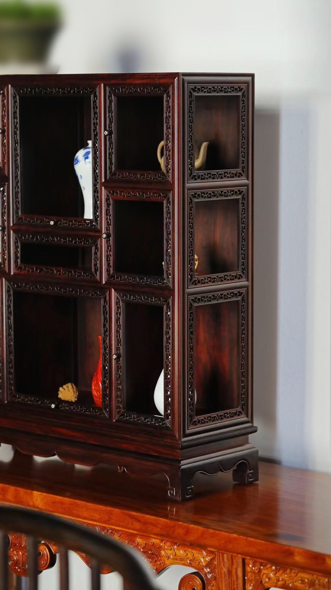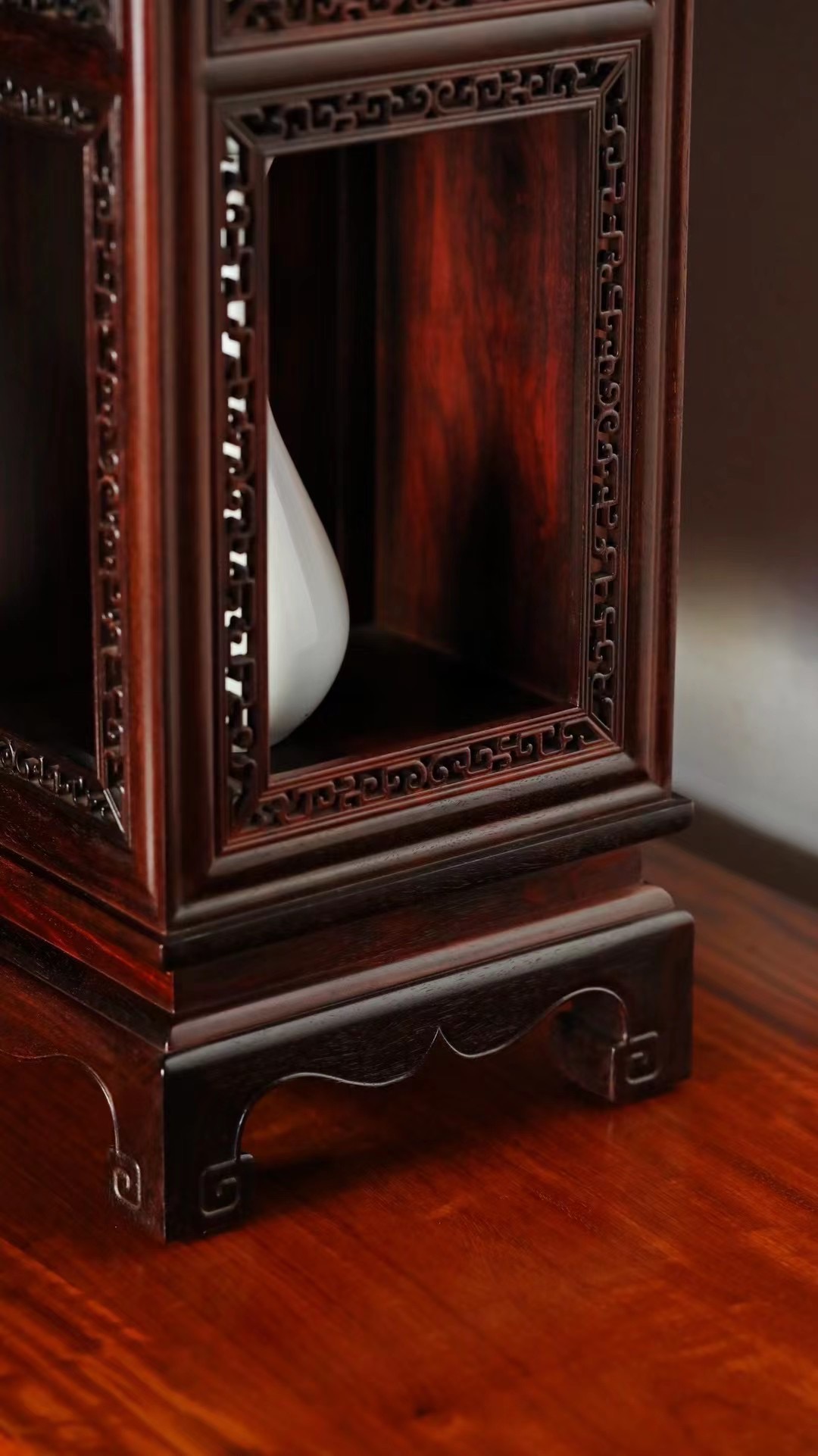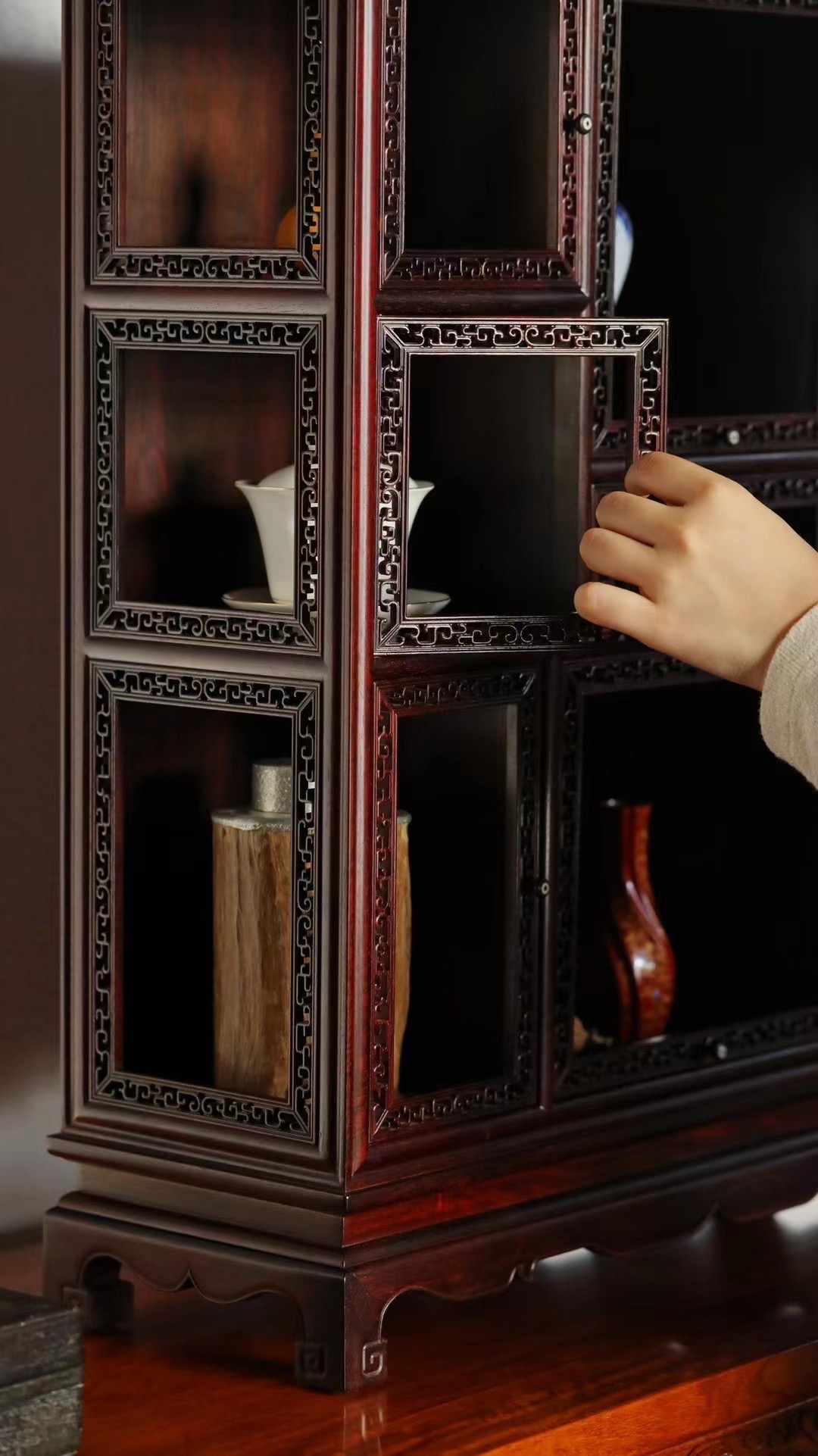 多宝阁做工严谨,用材方正,雕镂方直,满雕拐子纹,线条劲挺。