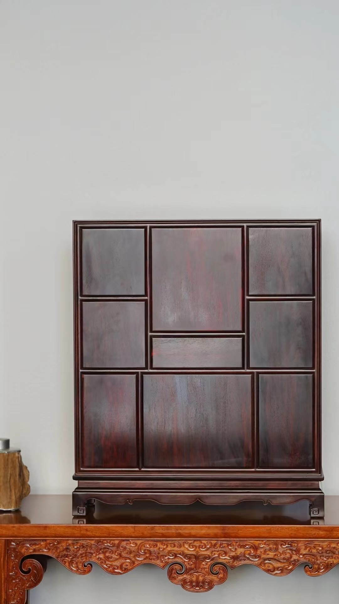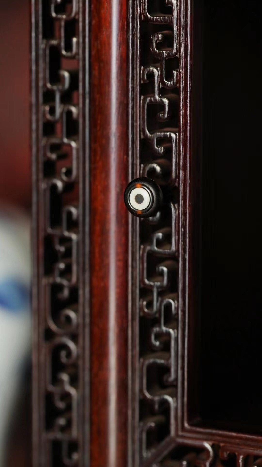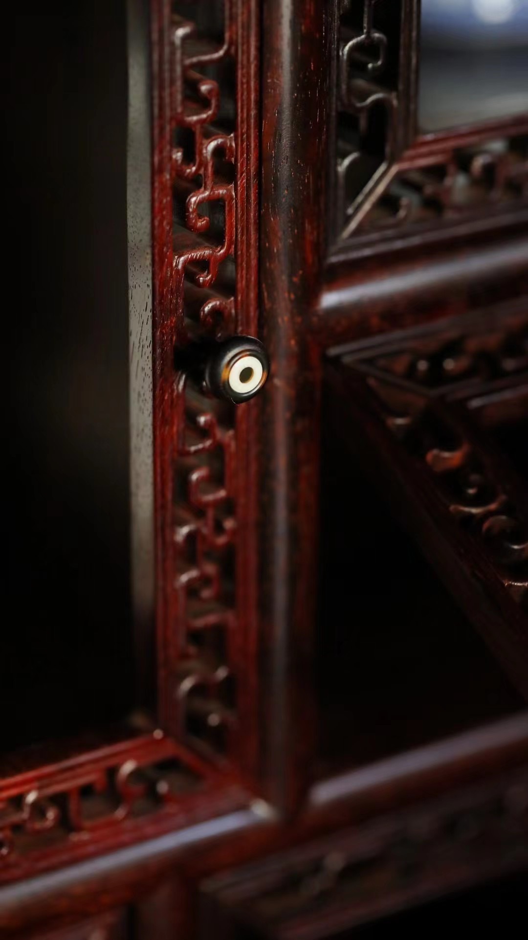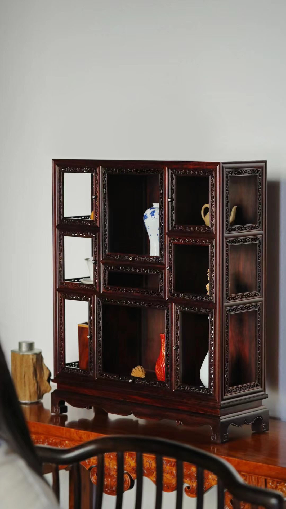 多宝阁做工严谨,用材方正,雕镂方直,满雕拐子纹,线条劲挺。