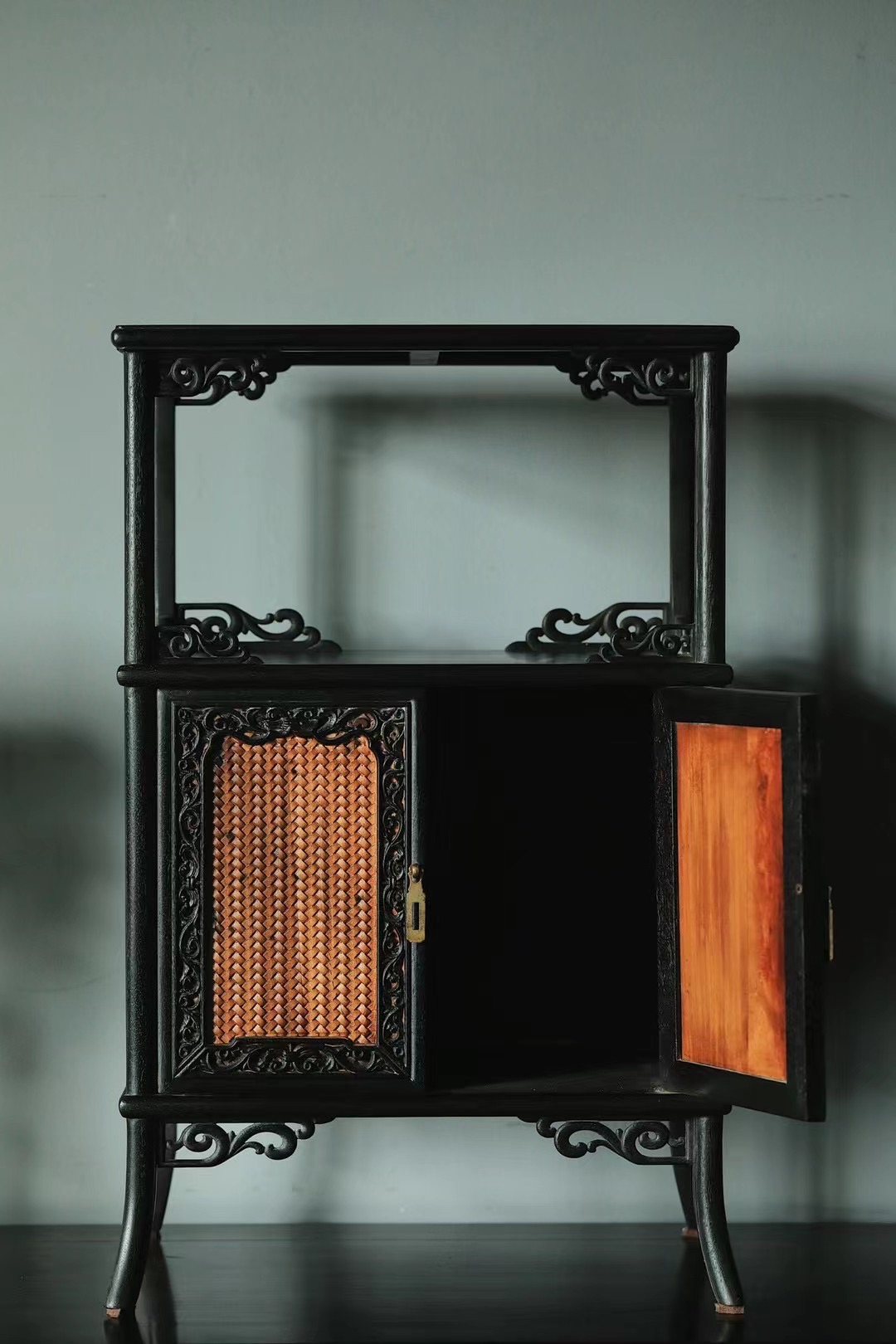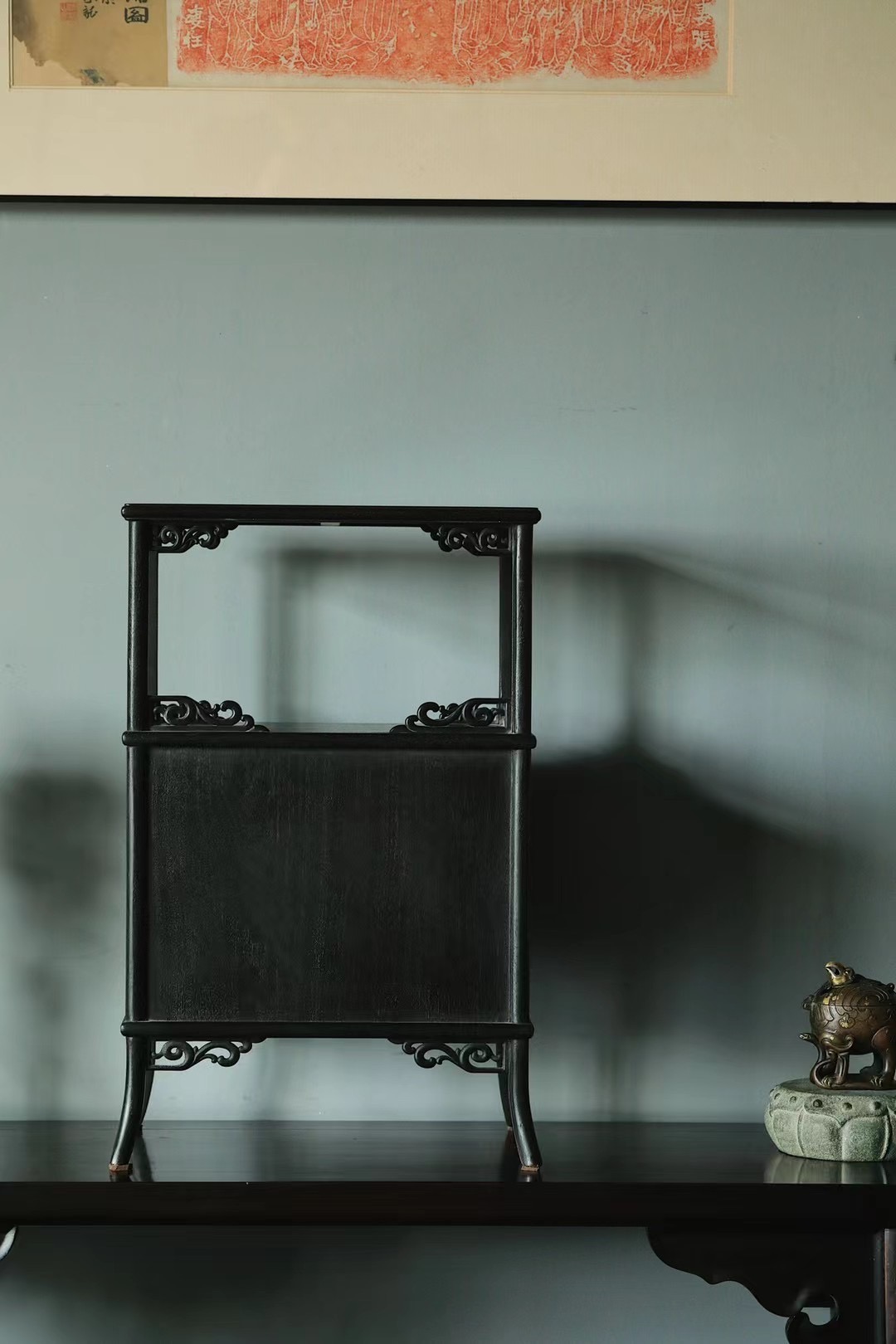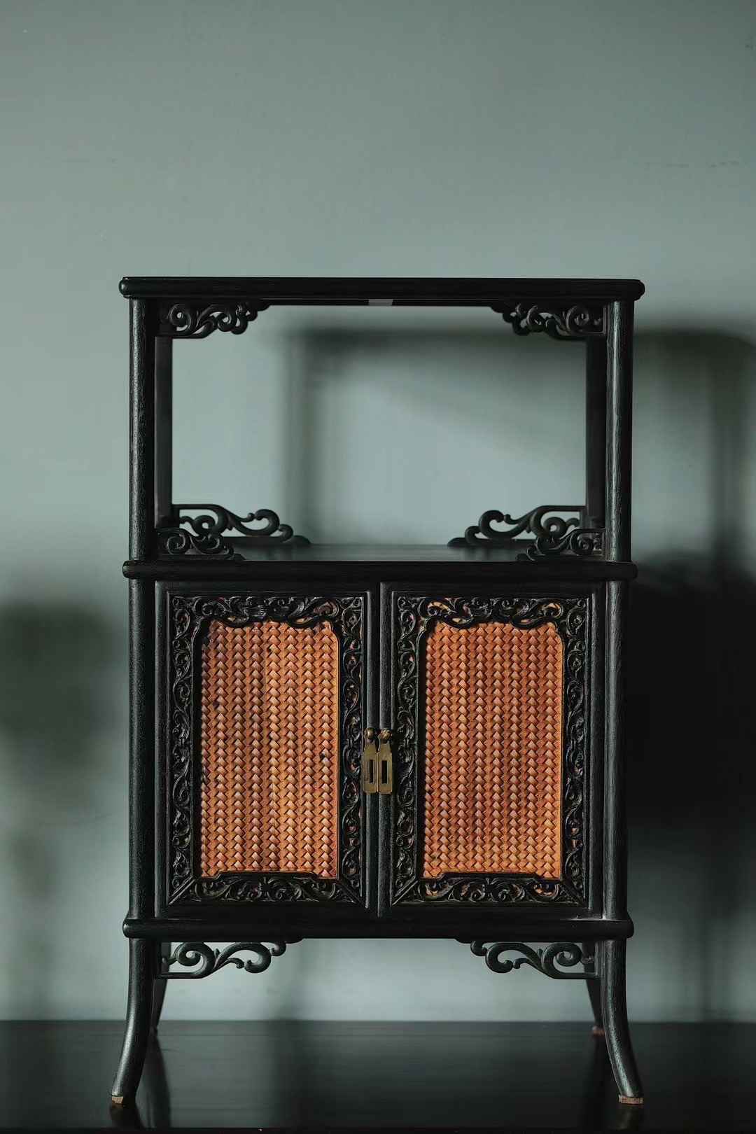 仿古制式,上为亮格,明朗可观,下为藏柜,面嵌黄杨,陈设文房茶室,颇增古意。