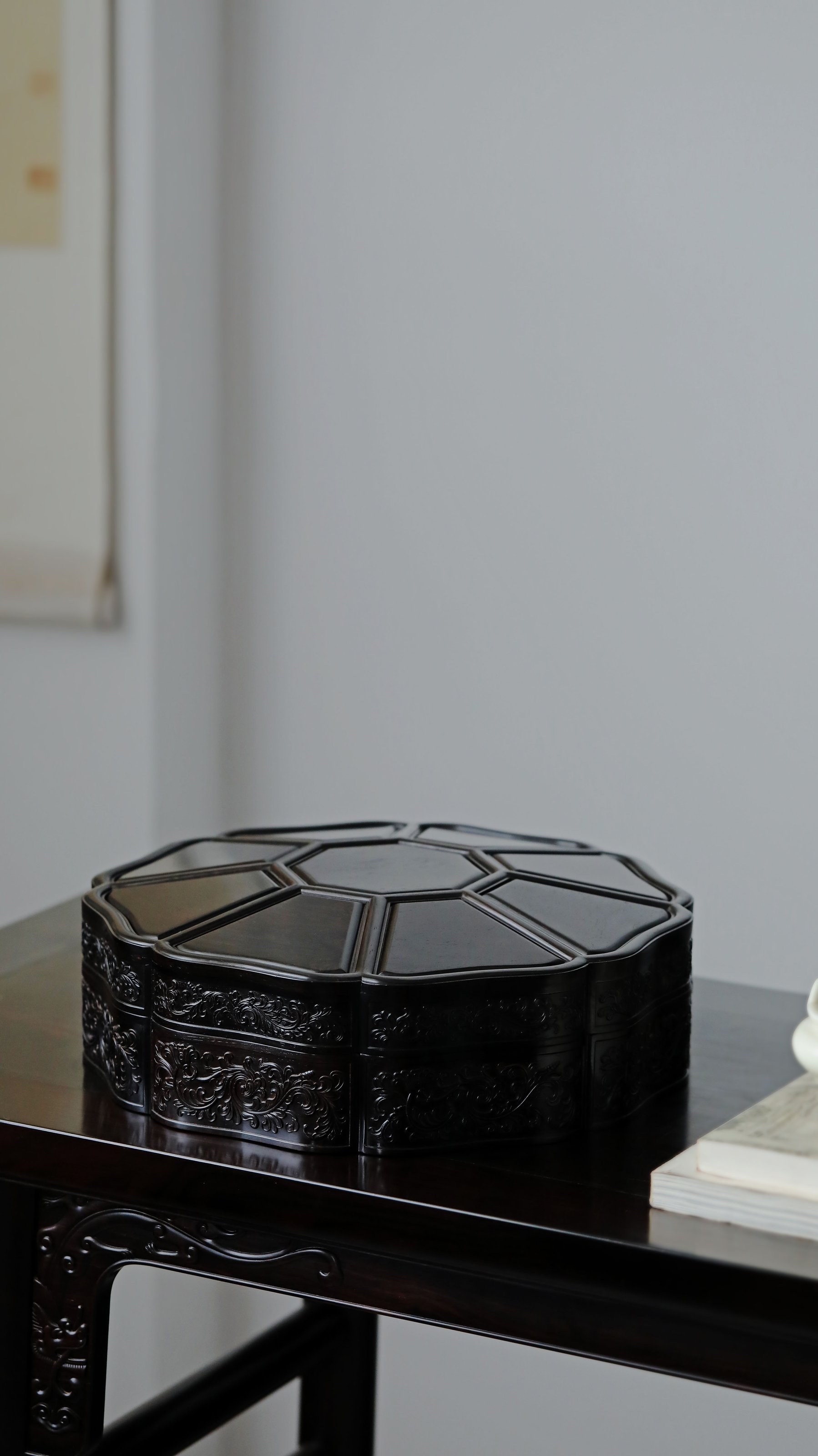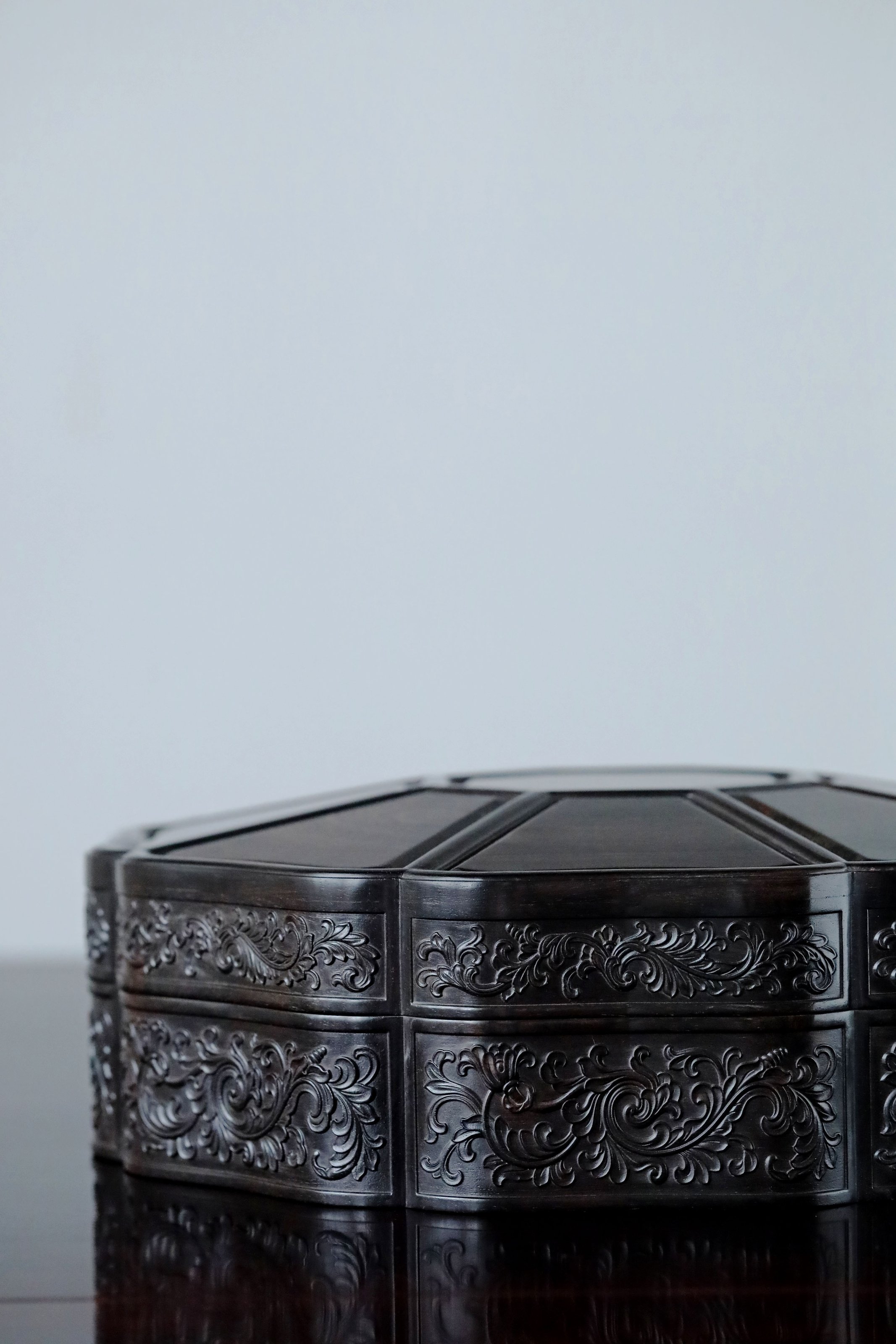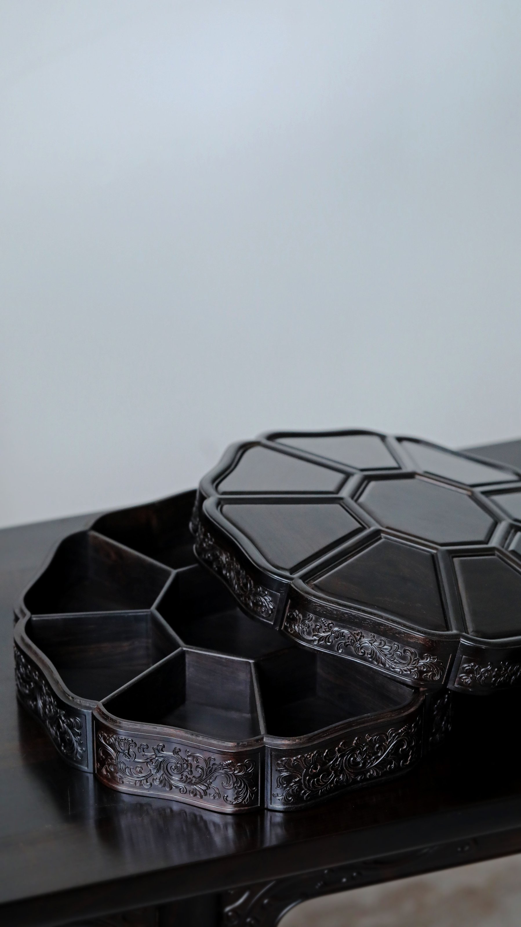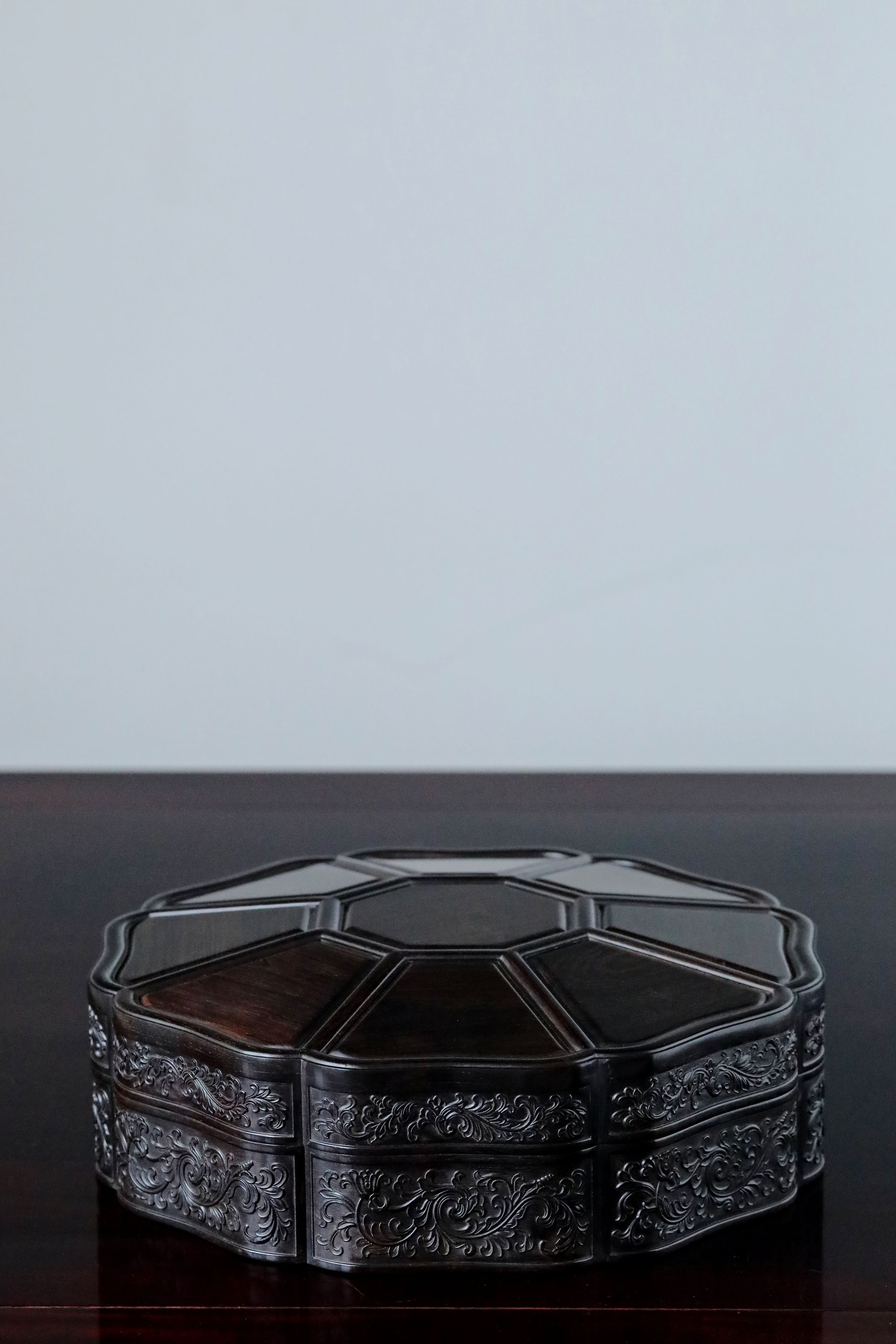 盖盒紫光檀制,榫卯精工,色泽玄紫,沉穆静雅,葵花为形,盖面以宽线廓形,微微向上凸起,简约大气,侧面满雕西番莲纹,花叶翻卷自如,雍容华贵。盒内亦设小格,方便分类收纳。