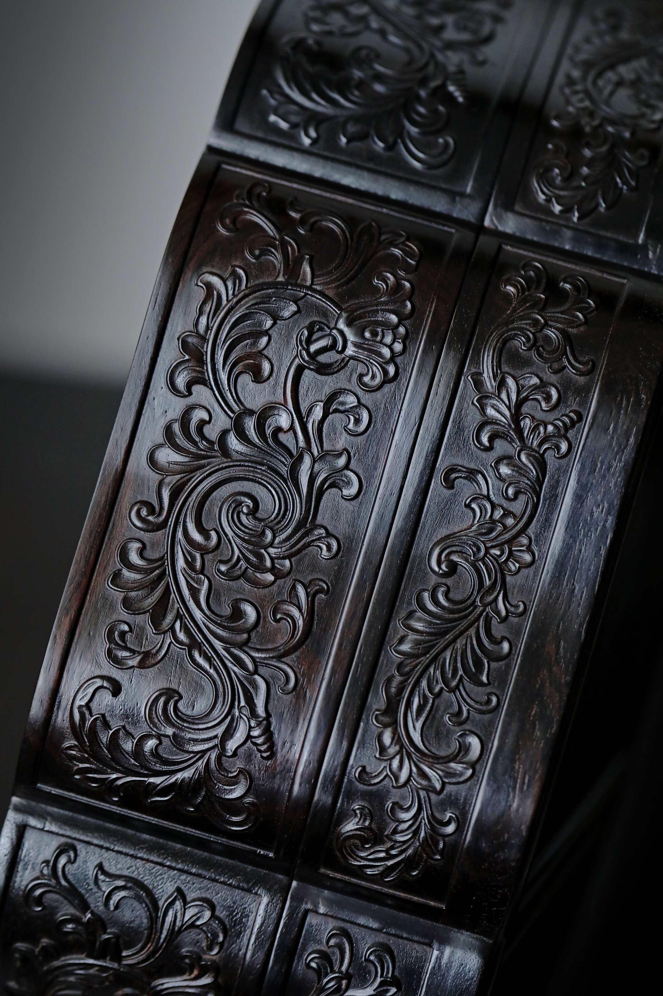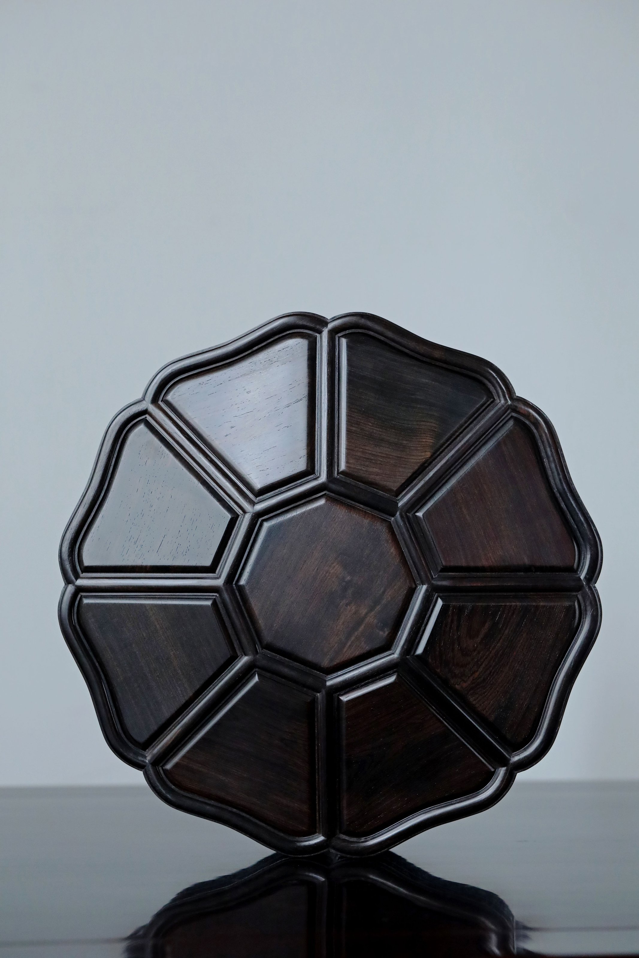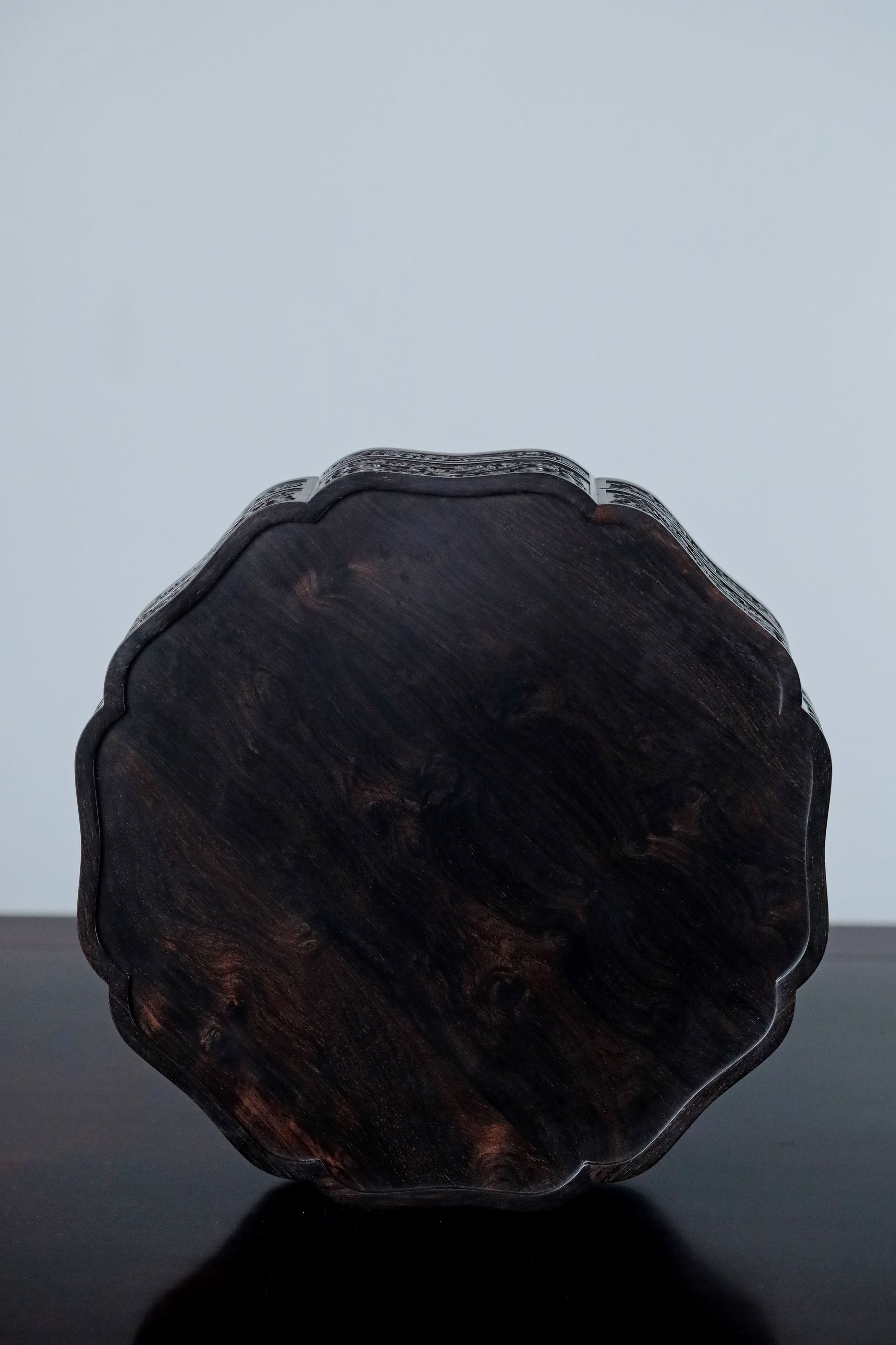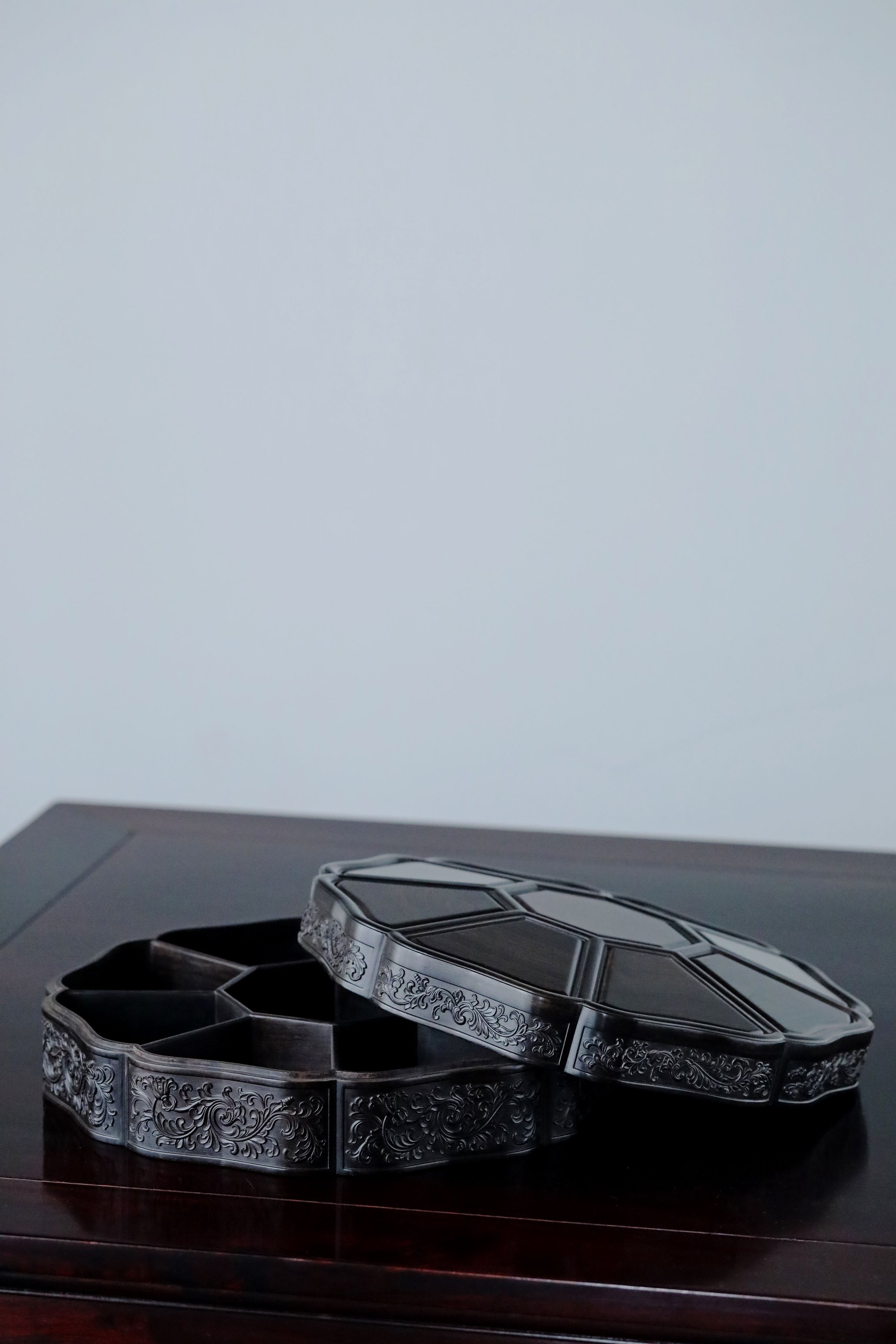 盖盒紫光檀制,榫卯精工,色泽玄紫,沉穆静雅,葵花为形,盖面以宽线廓形,微微向上凸起,简约大气,侧面满雕西番莲纹,花叶翻卷自如,雍容华贵。盒内亦设小格,方便分类收纳。