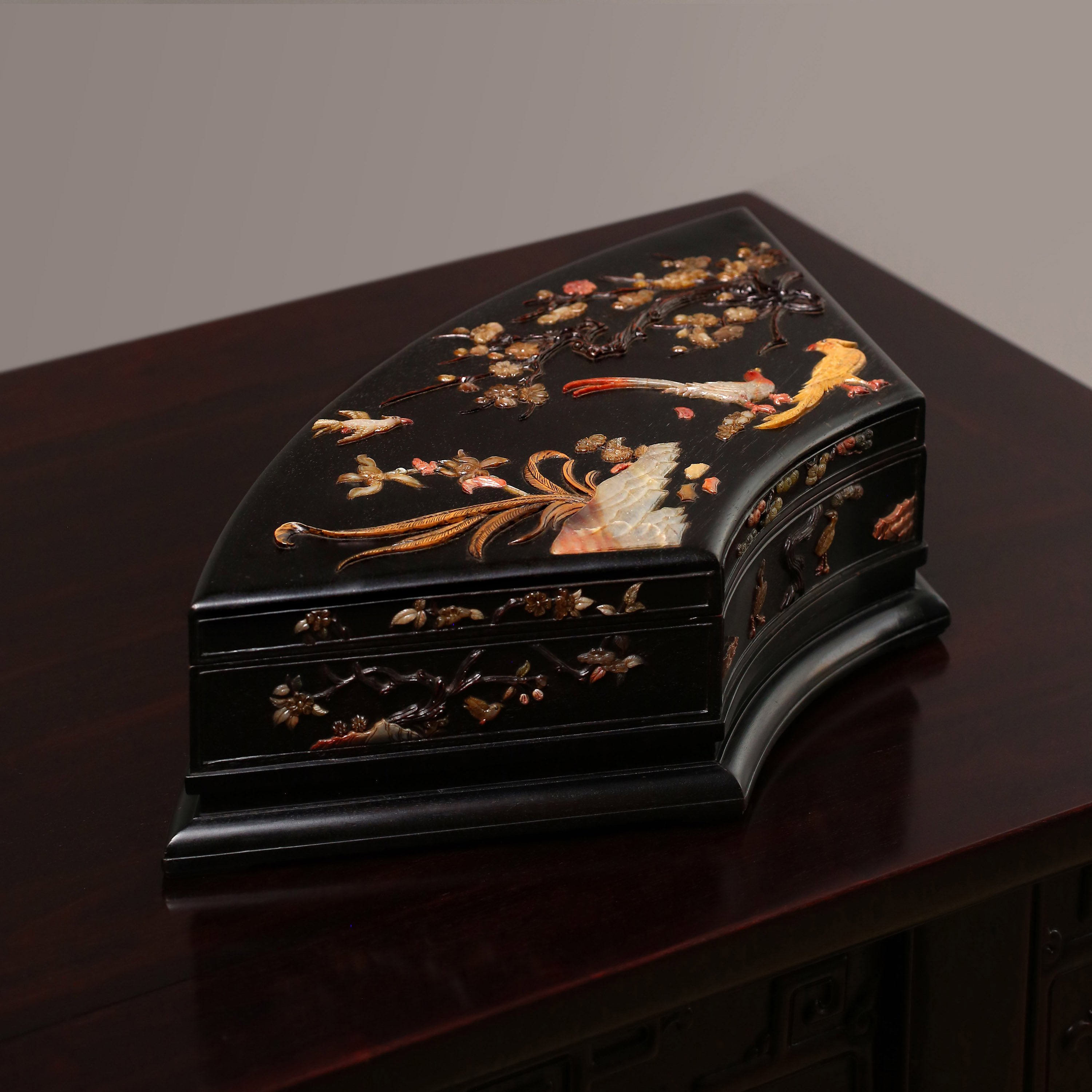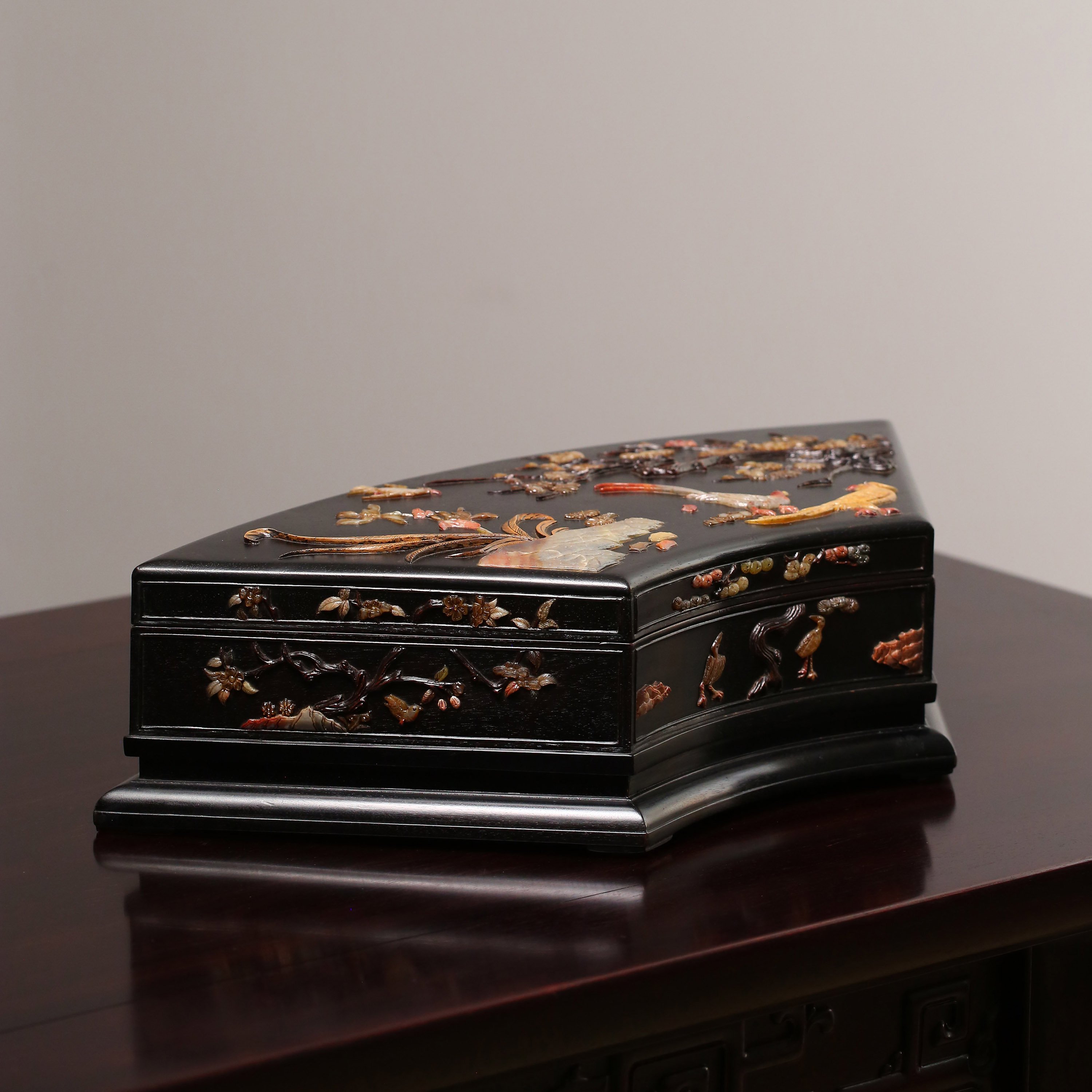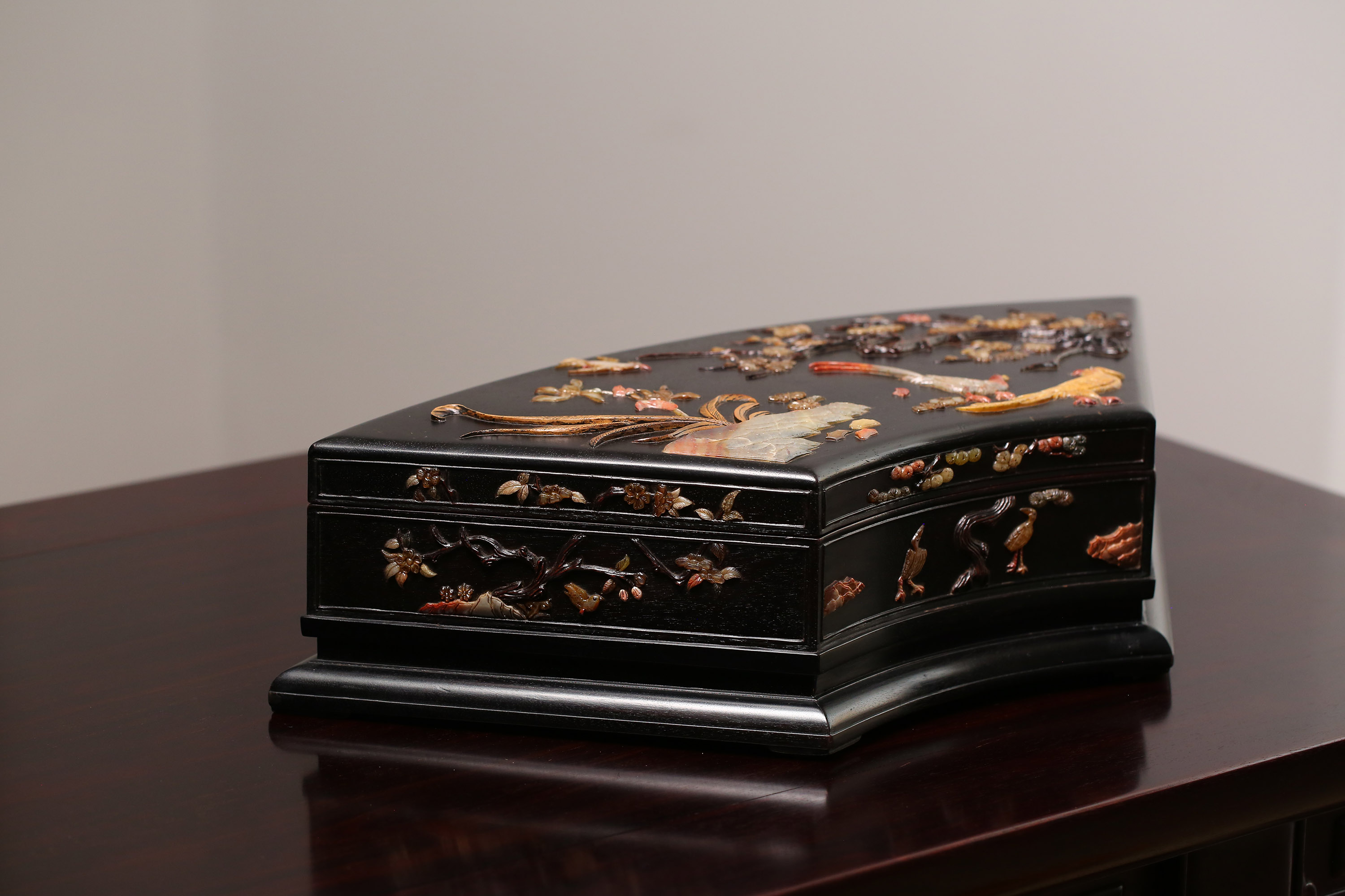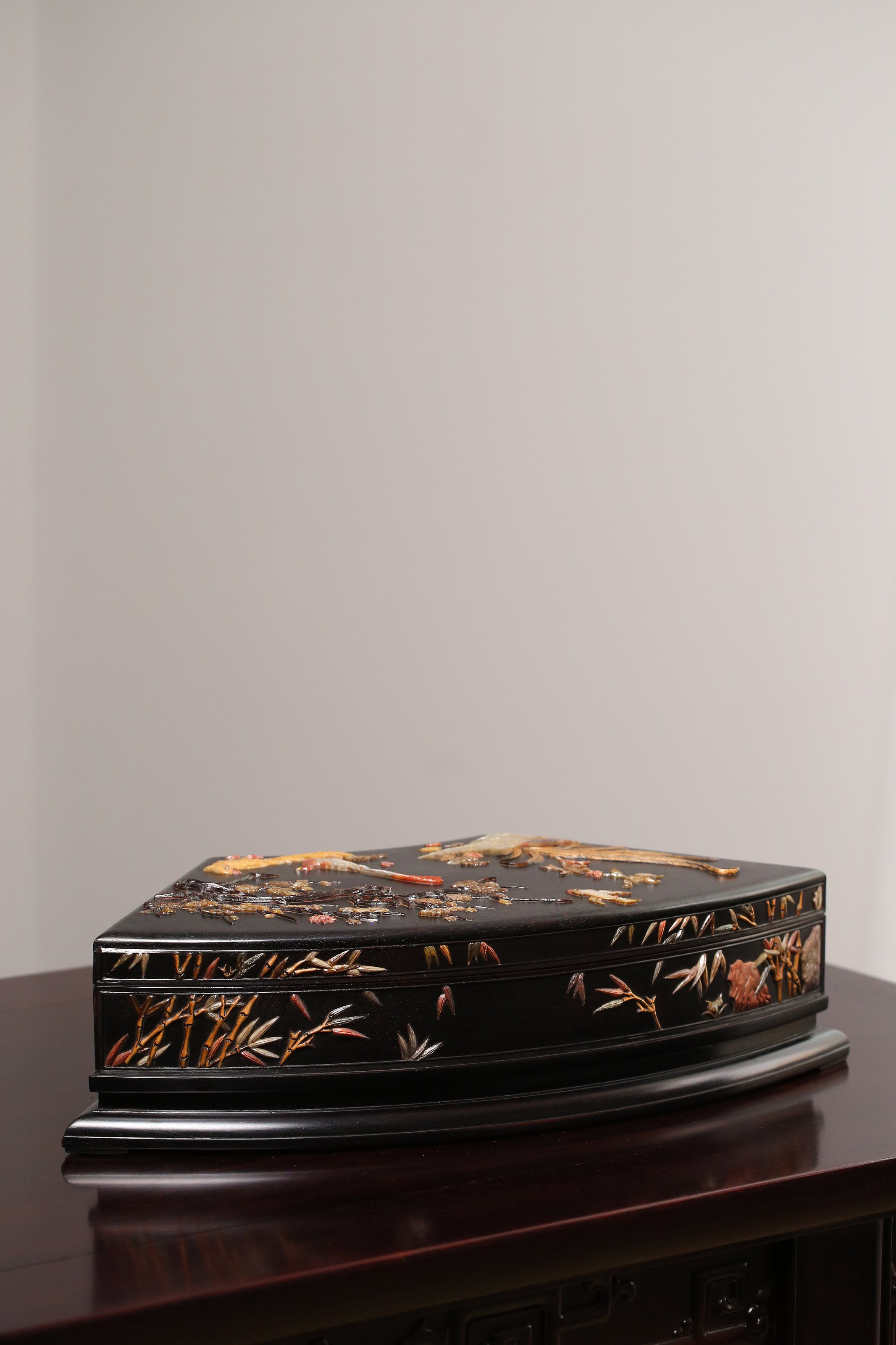 长:49cm 宽:22.2cm 高:12cm 百宝嵌扇形宝盒 盒为扇形,美观别致。盖、盒以子母口相接,运用百宝嵌工艺,以木、玉石等镶嵌松竹梅和花鸟图,具象写实,赏心悦目。盖面微微鼓起,工艺考究,盒身带底座。