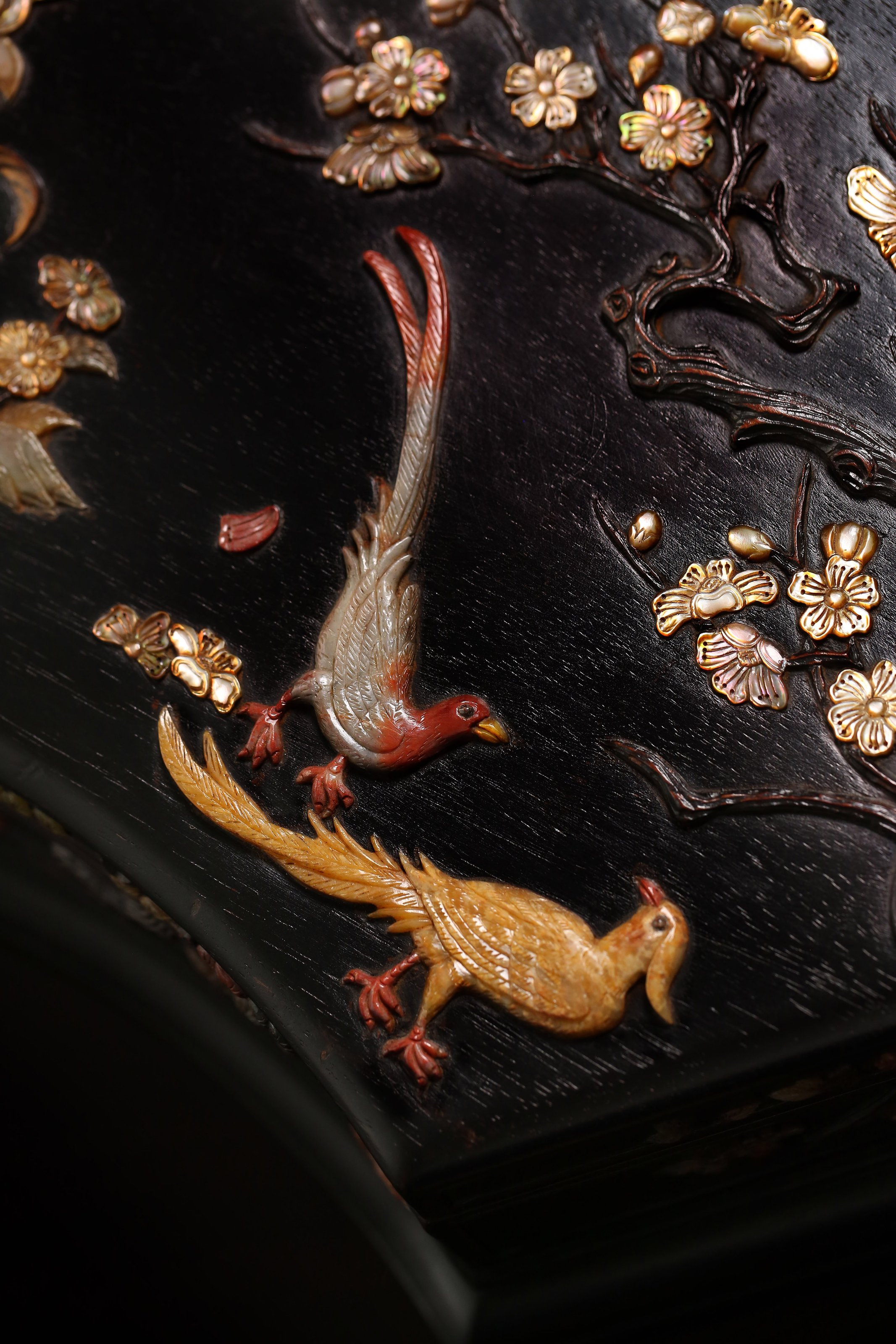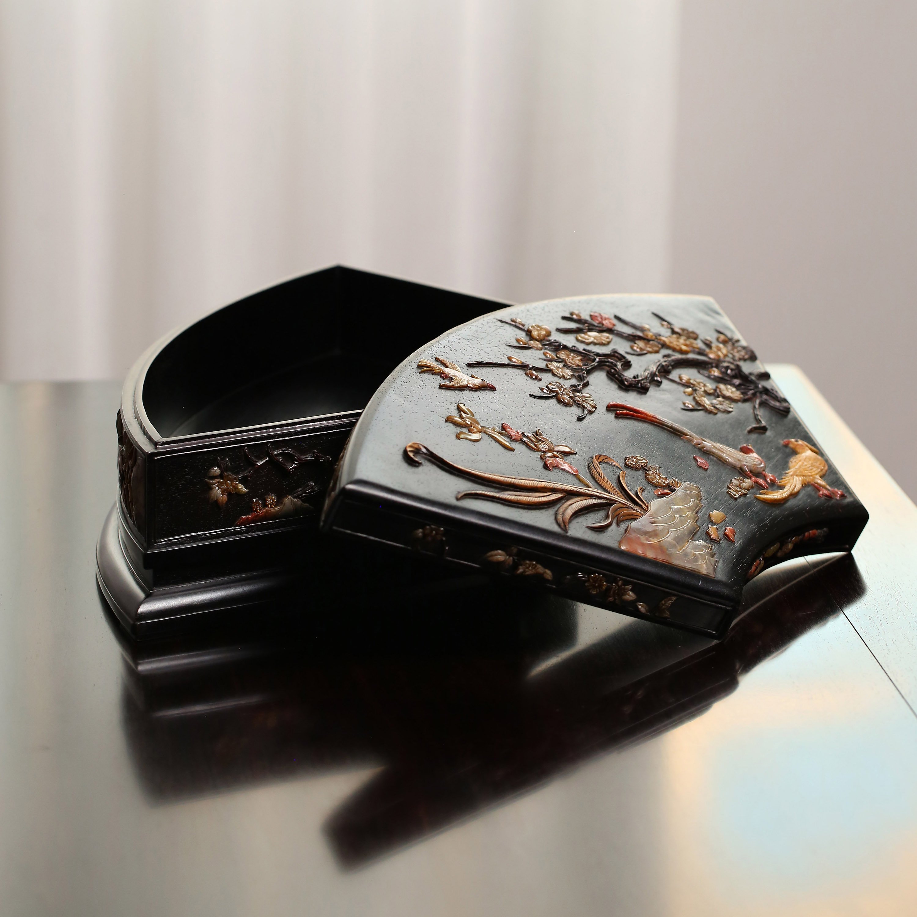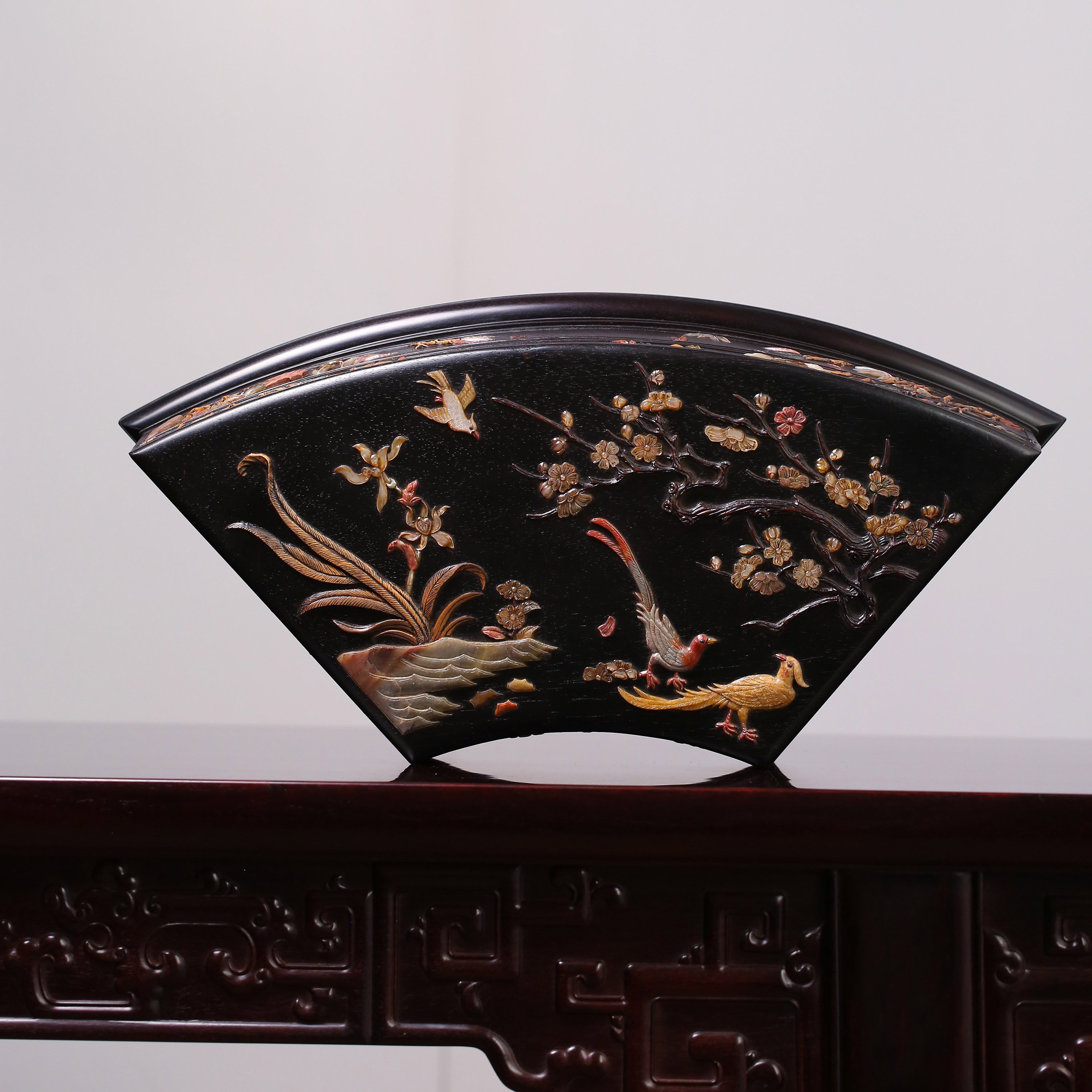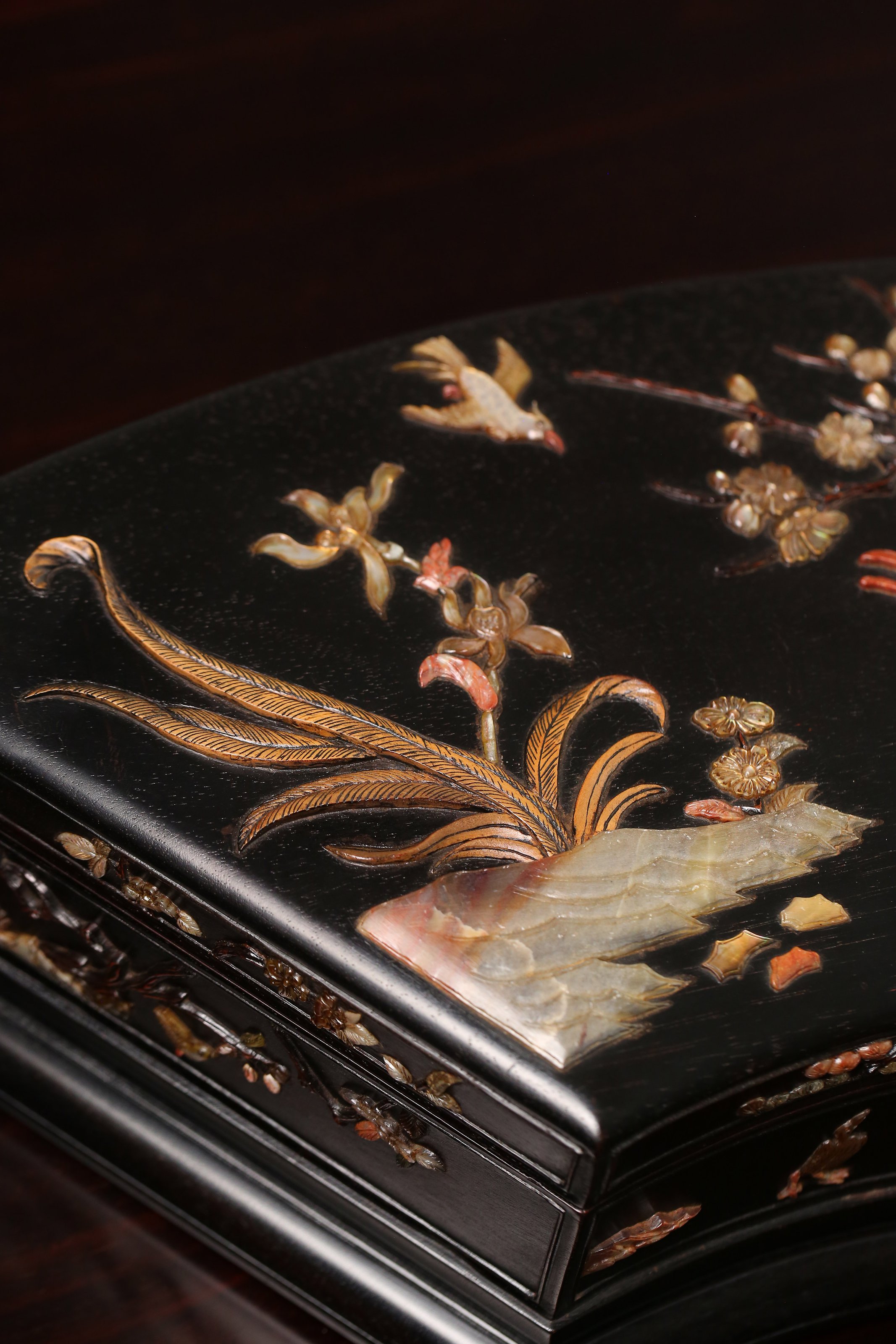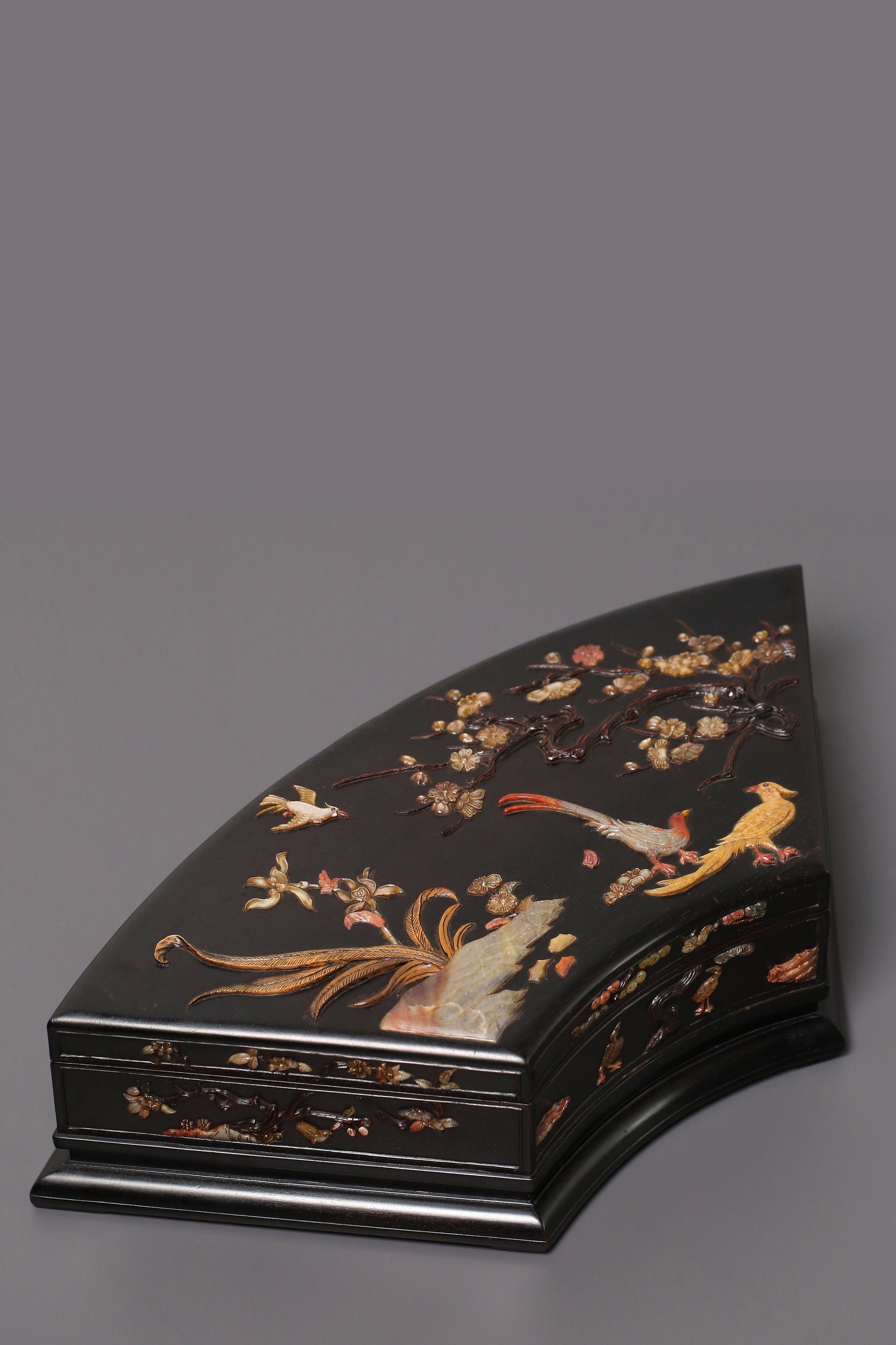 长:49cm 宽:22.2cm 高:12cm 百宝嵌扇形宝盒 盒为扇形,美观别致。盖、盒以子母口相接,运用百宝嵌工艺,以木、玉石等镶嵌松竹梅和花鸟图,具象写实,赏心悦目。盖面微微鼓起,工艺考究,盒身带底座。