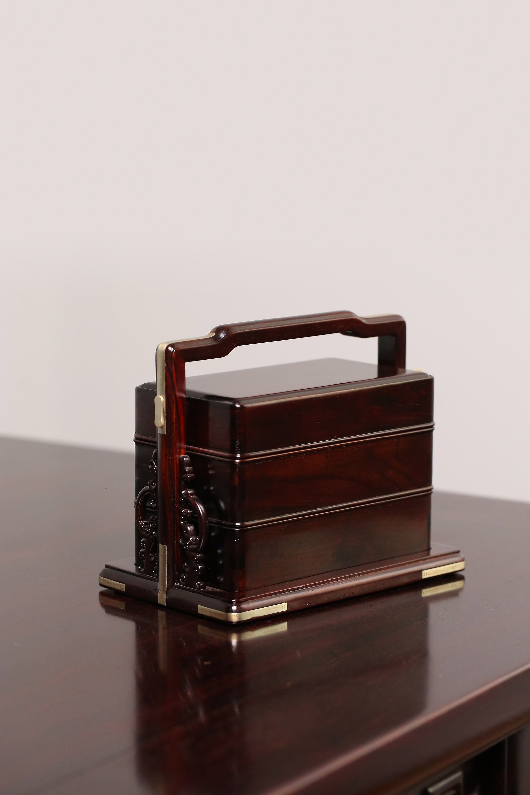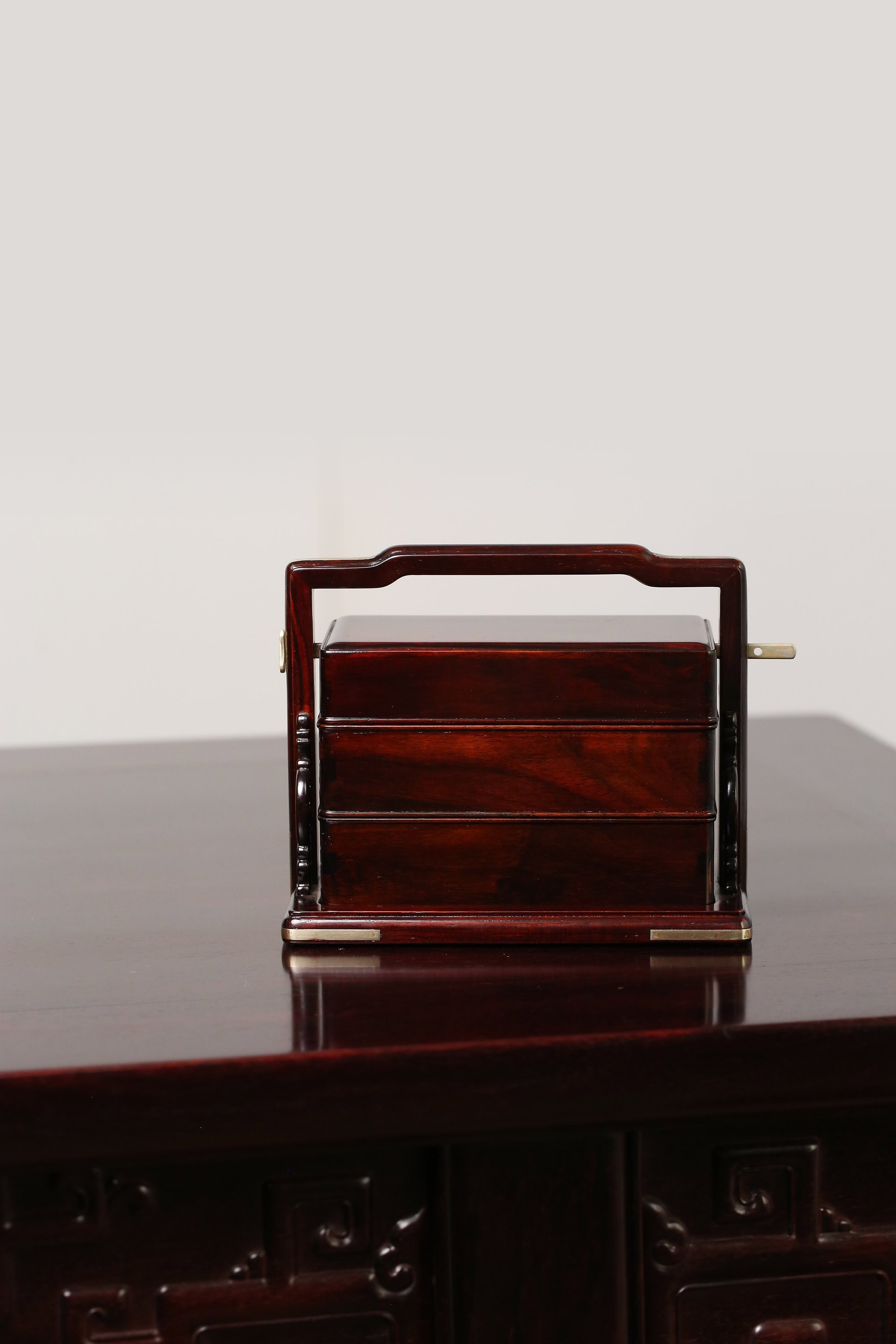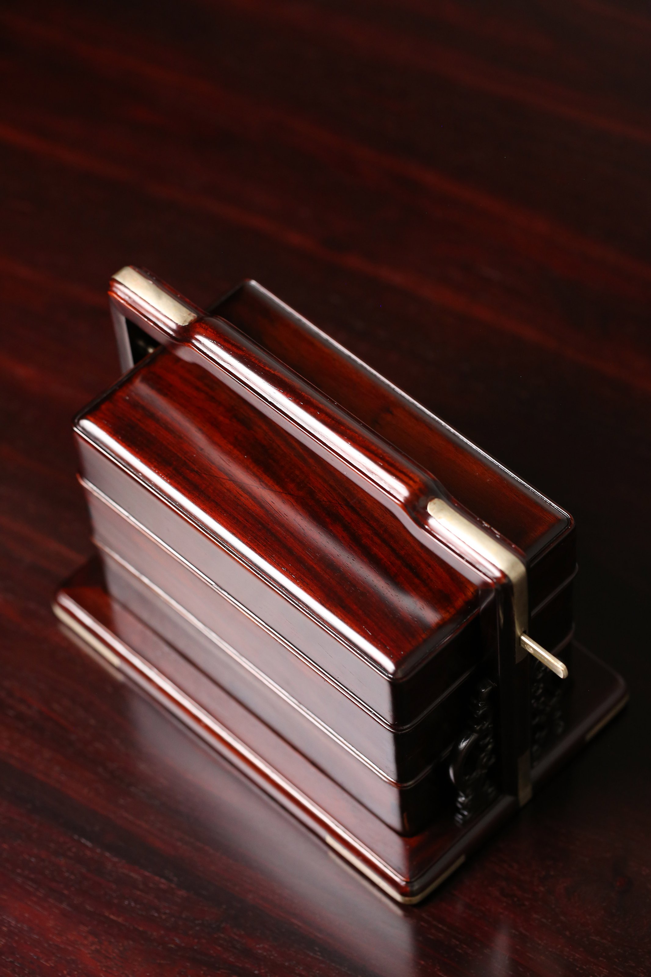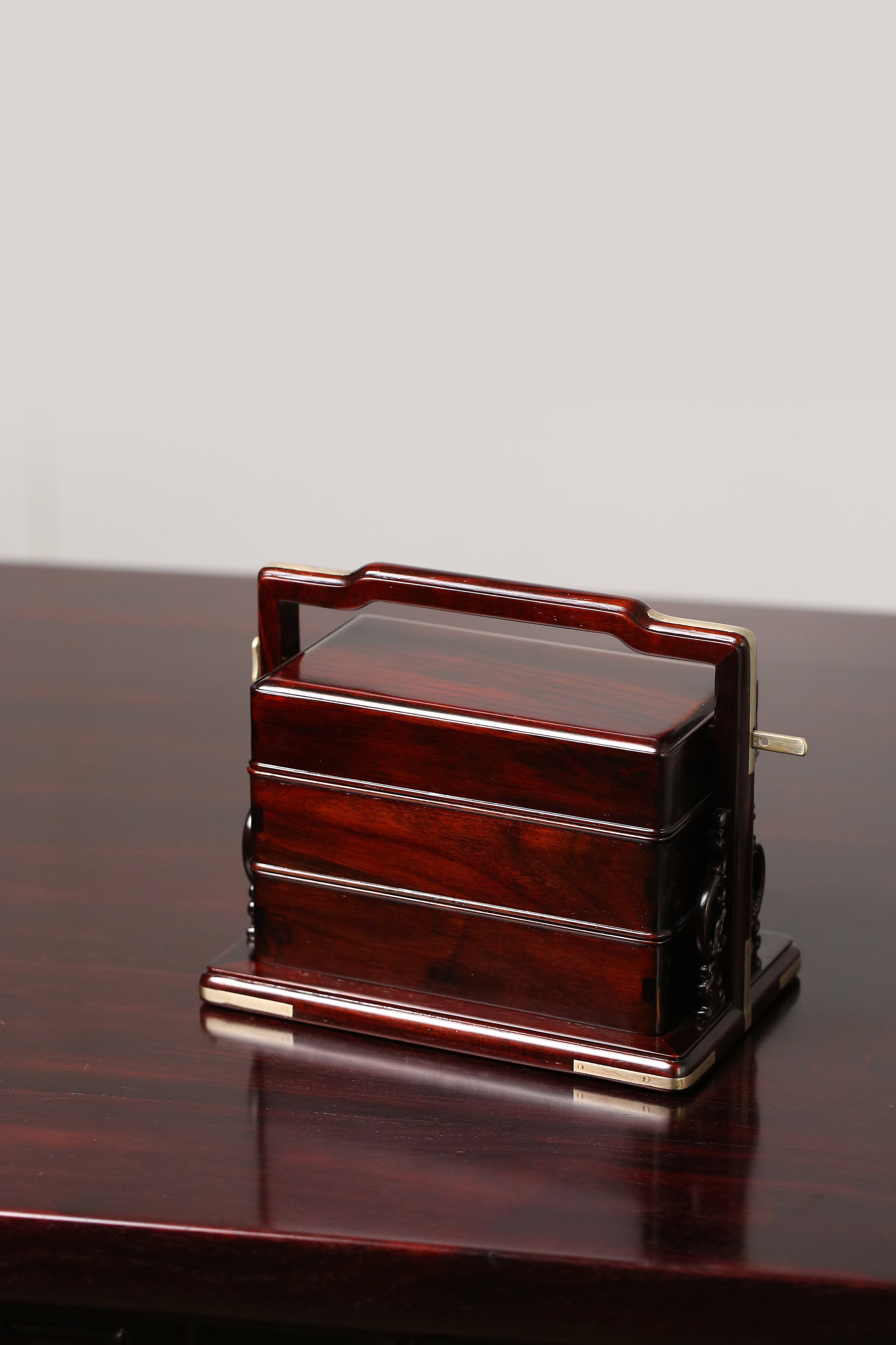 长:17.5cm 宽:11cm 高:14.5cm 酸枝木两撞提盒 提盒酸枝木制,色泽沉郁,长方框做底,加盖三层。两侧设立柱,以镂空螭龙纹站牙抵夹,上安素面罗锅式提梁,有铜条加固。提梁侧面与盒盖侧面开孔,可插入金属条上锁,以增加提拿时的稳定性,每层子母口均起灯草线条线,相连简洁大气,工艺考究。