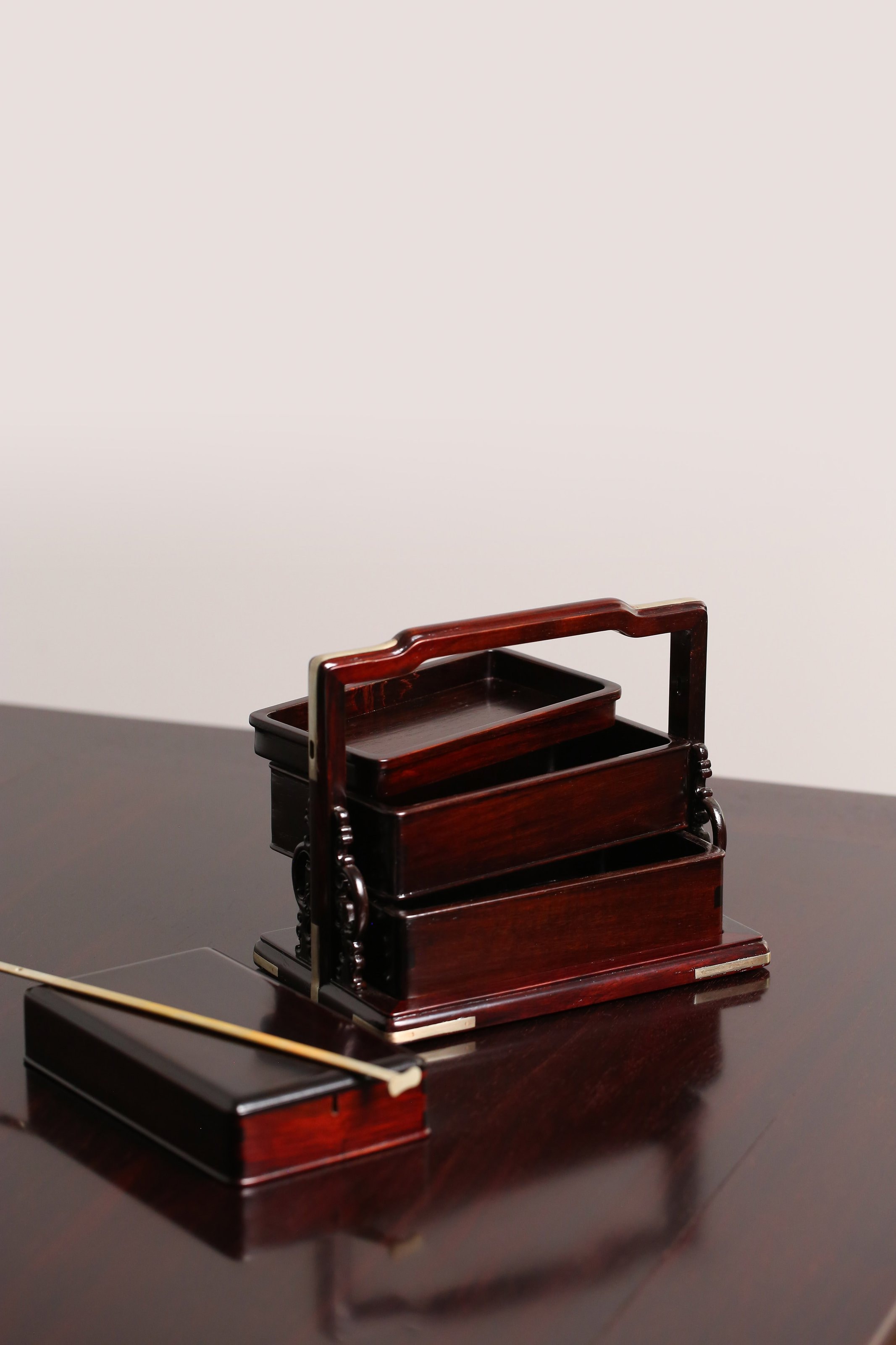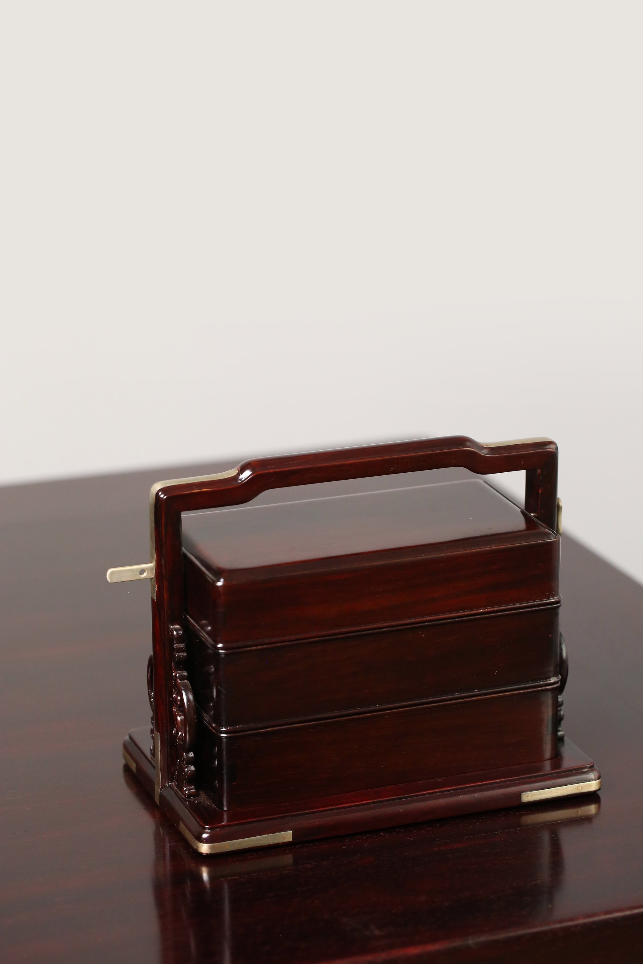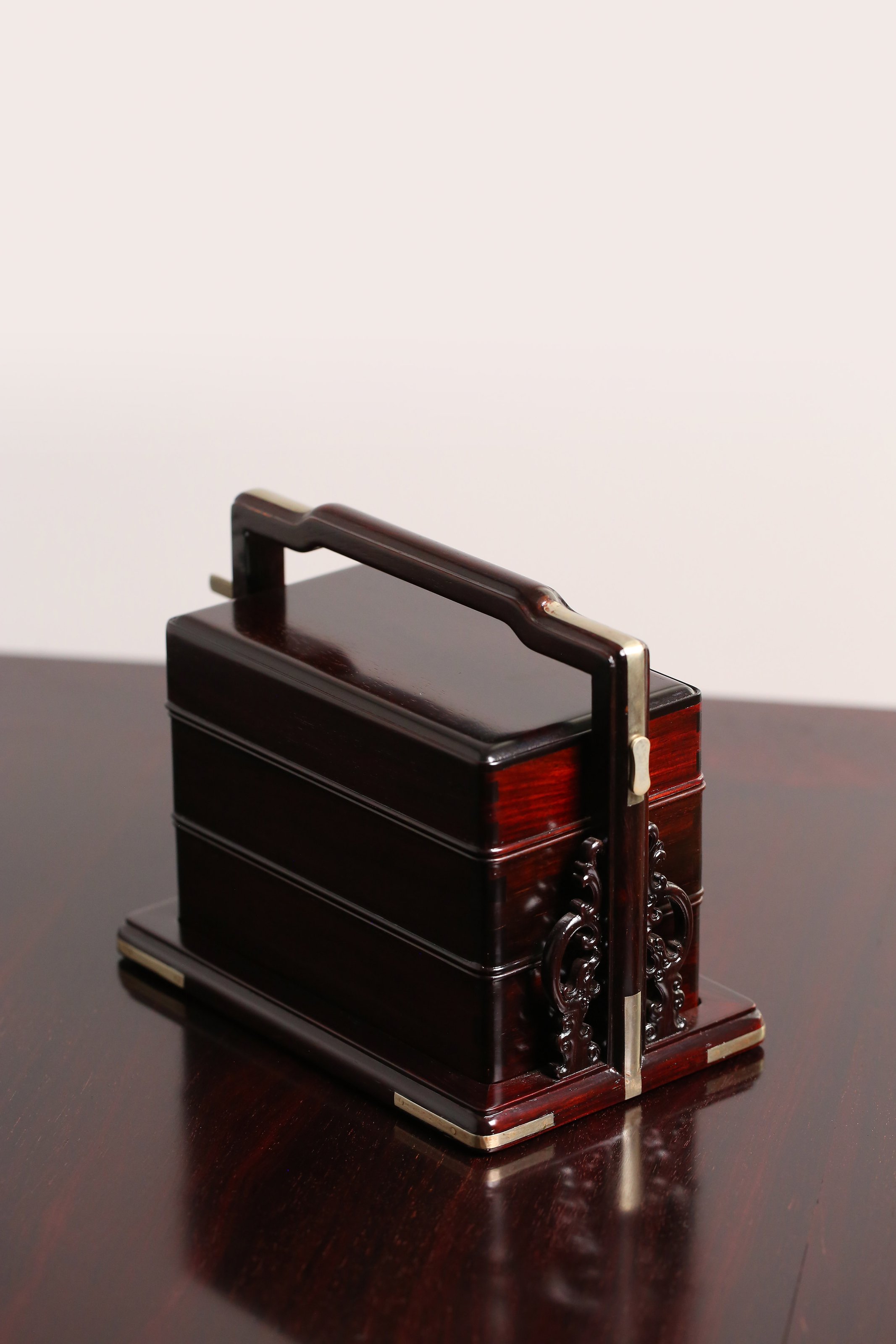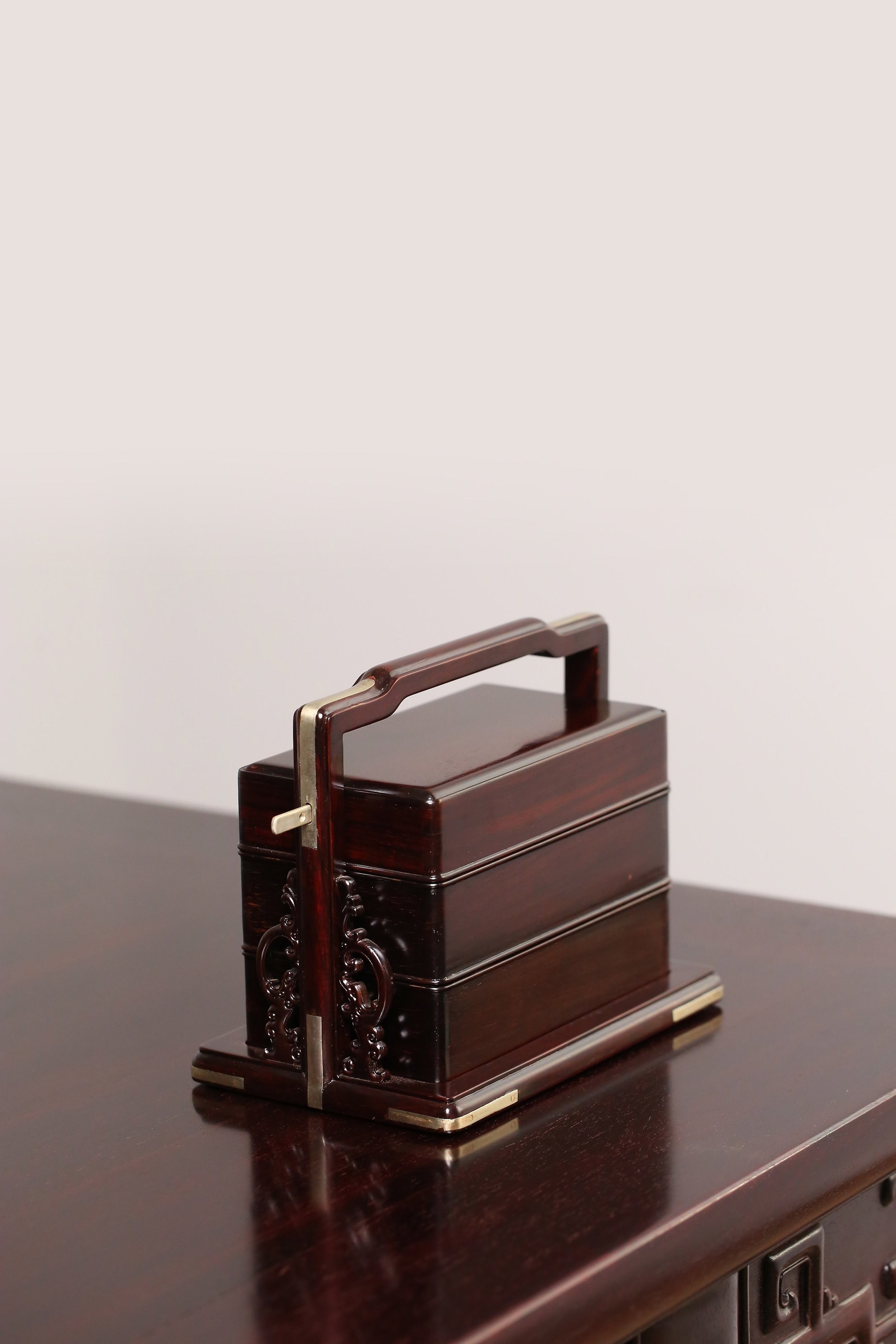 长:17.5cm 宽:11cm 高:14.5cm 酸枝木两撞提盒 提盒酸枝木制,色泽沉郁,长方框做底,加盖三层。两侧设立柱,以镂空螭龙纹站牙抵夹,上安素面罗锅式提梁,有铜条加固。提梁侧面与盒盖侧面开孔,可插入金属条上锁,以增加提拿时的稳定性,每层子母口均起灯草线条线,相连简洁大气,工艺考究。