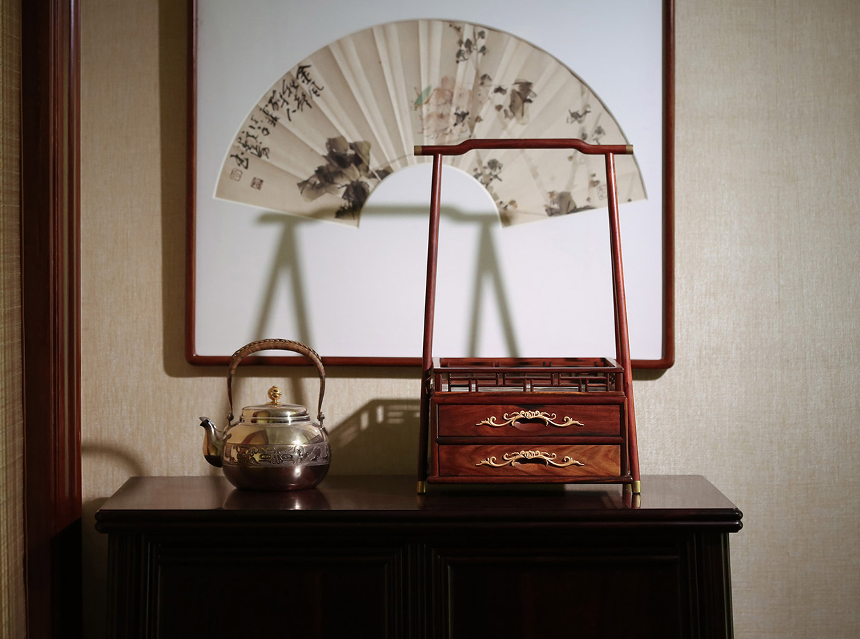 此大红酸枝提梁茶盒为普洱茶饼存放和茶罐置于其上陈设之用。