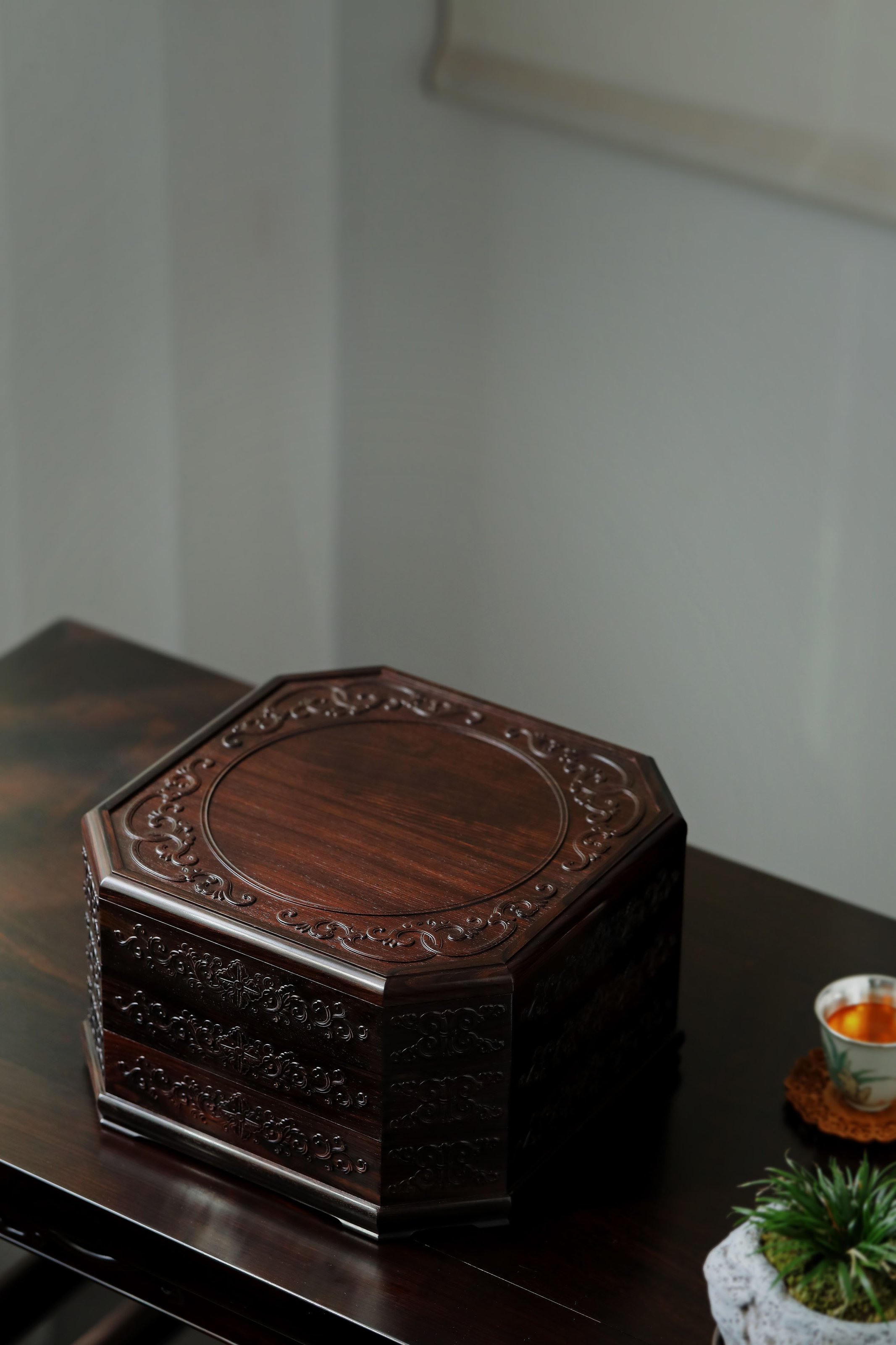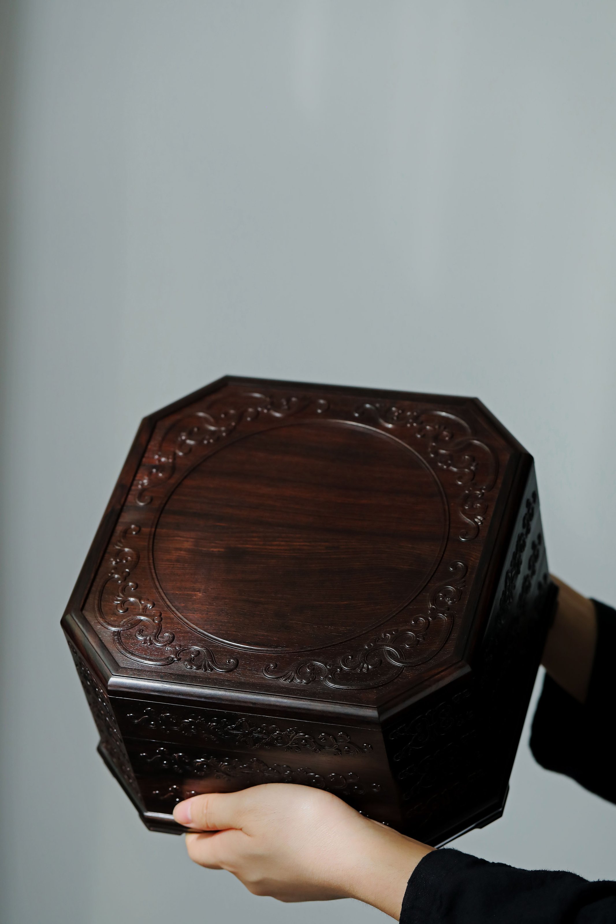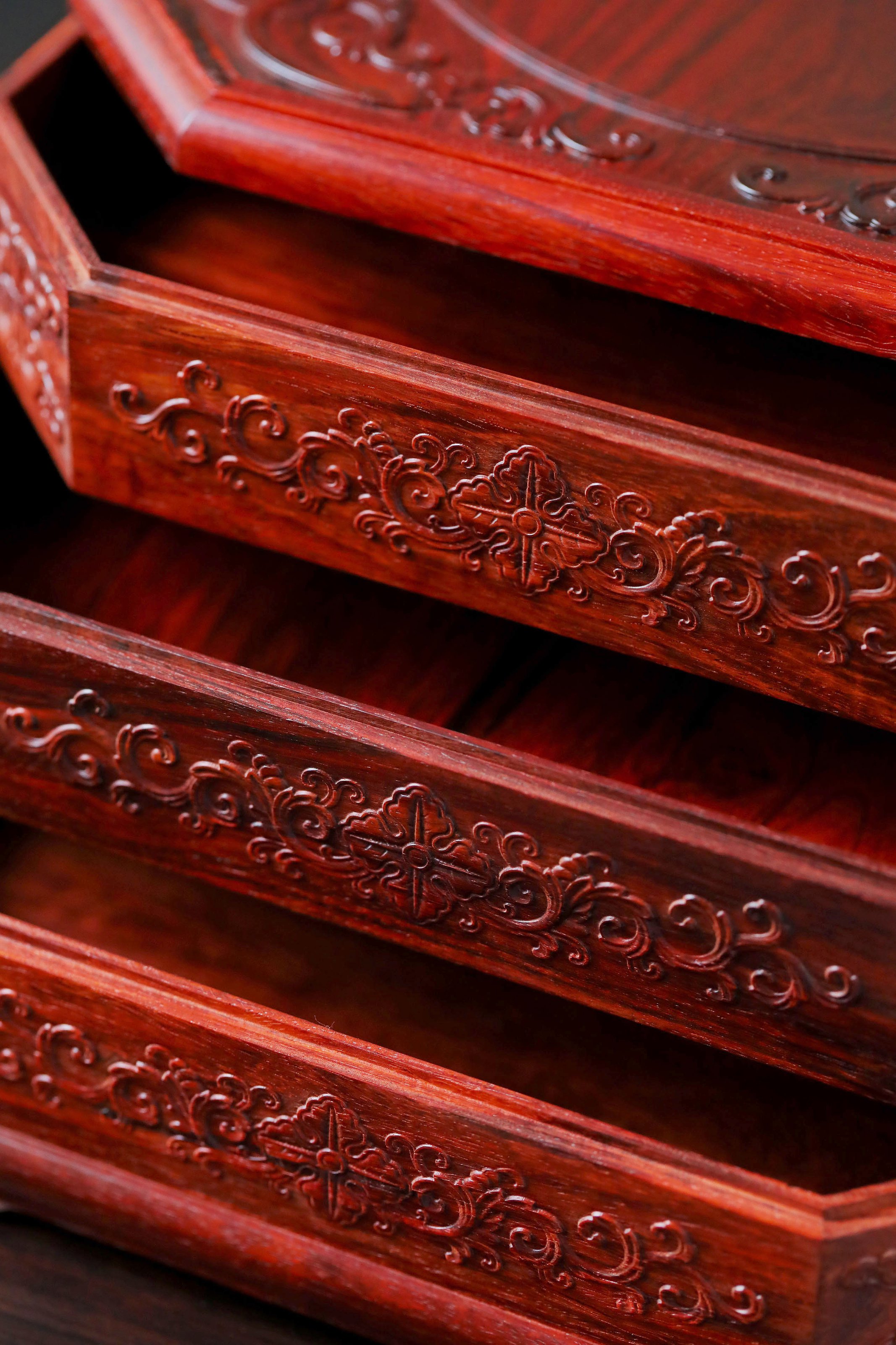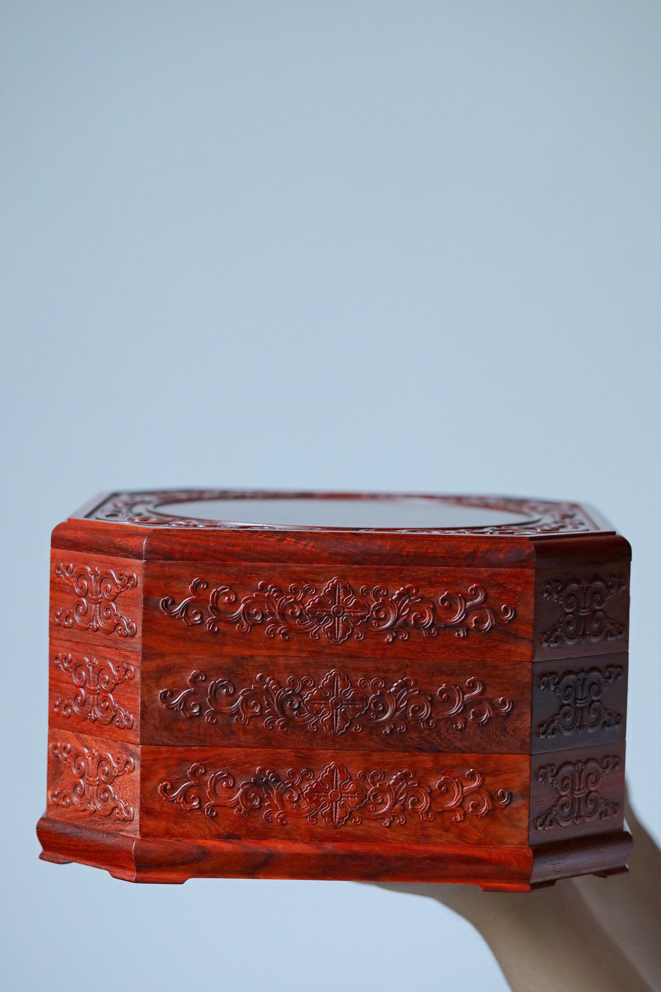 直径23.8cm 高13.5cm 大雅堂茶盒 材料:紫光檀 取材紫光檀老料,盒八角三层天地盖,榫卯结构,周身雕饰西番莲纹,茶室存茶,文人雅致。 直径23.8 高13.5cm 小叶紫檀茶盒 取材小叶紫檀,质坚细腻;盒八角三层天地盖,榫卯结构,周身雕饰西番莲纹,茶室存茶,文人雅致。