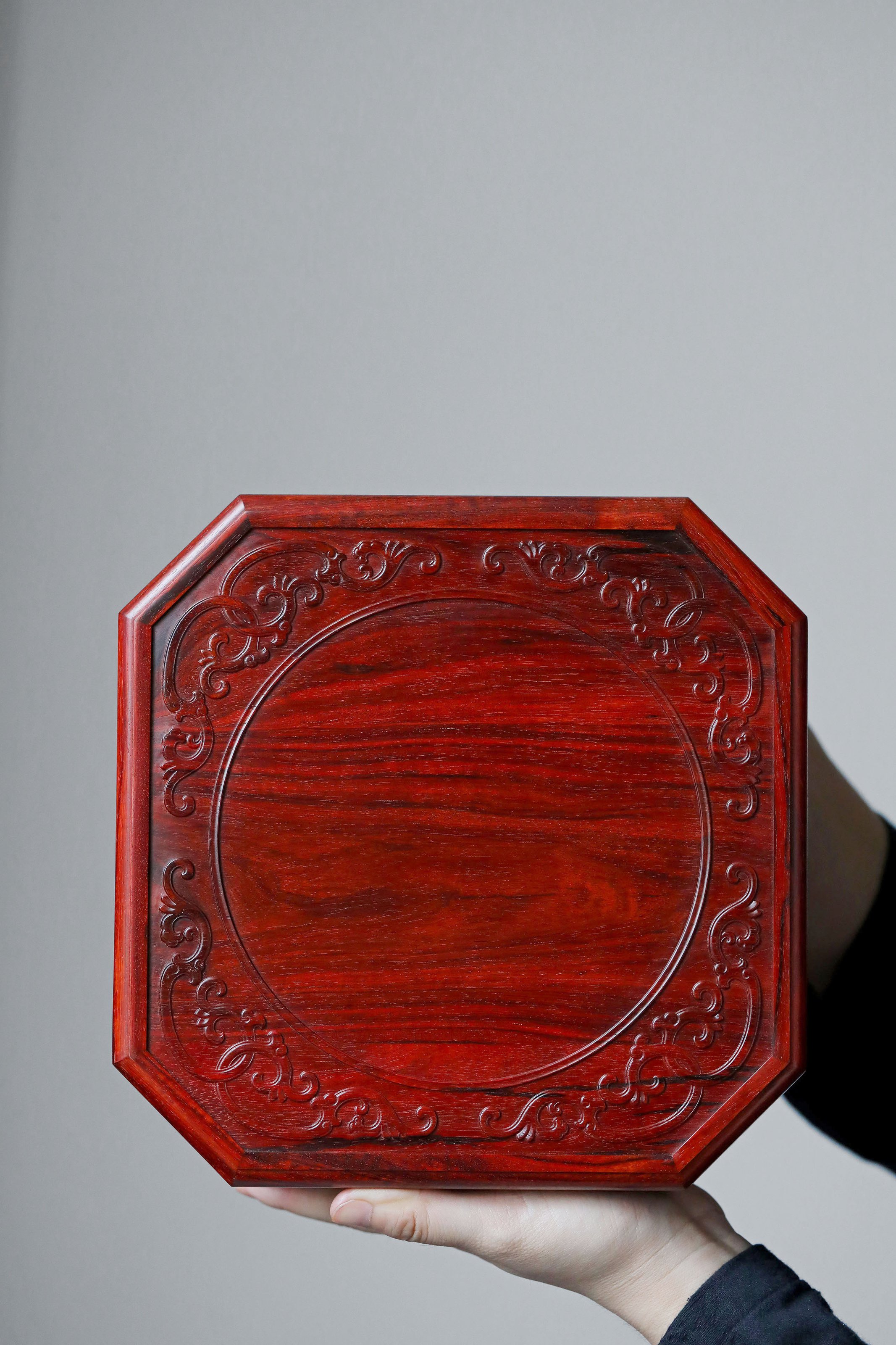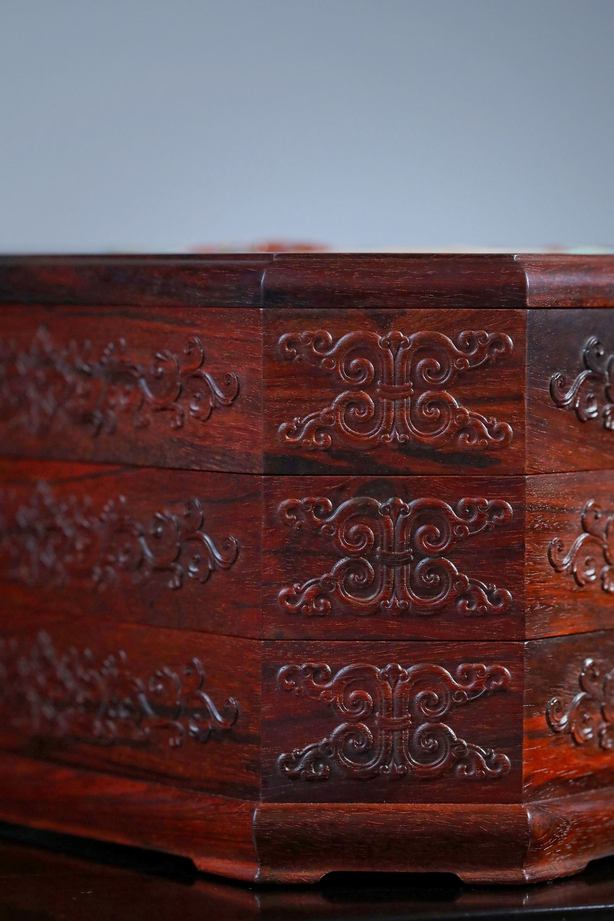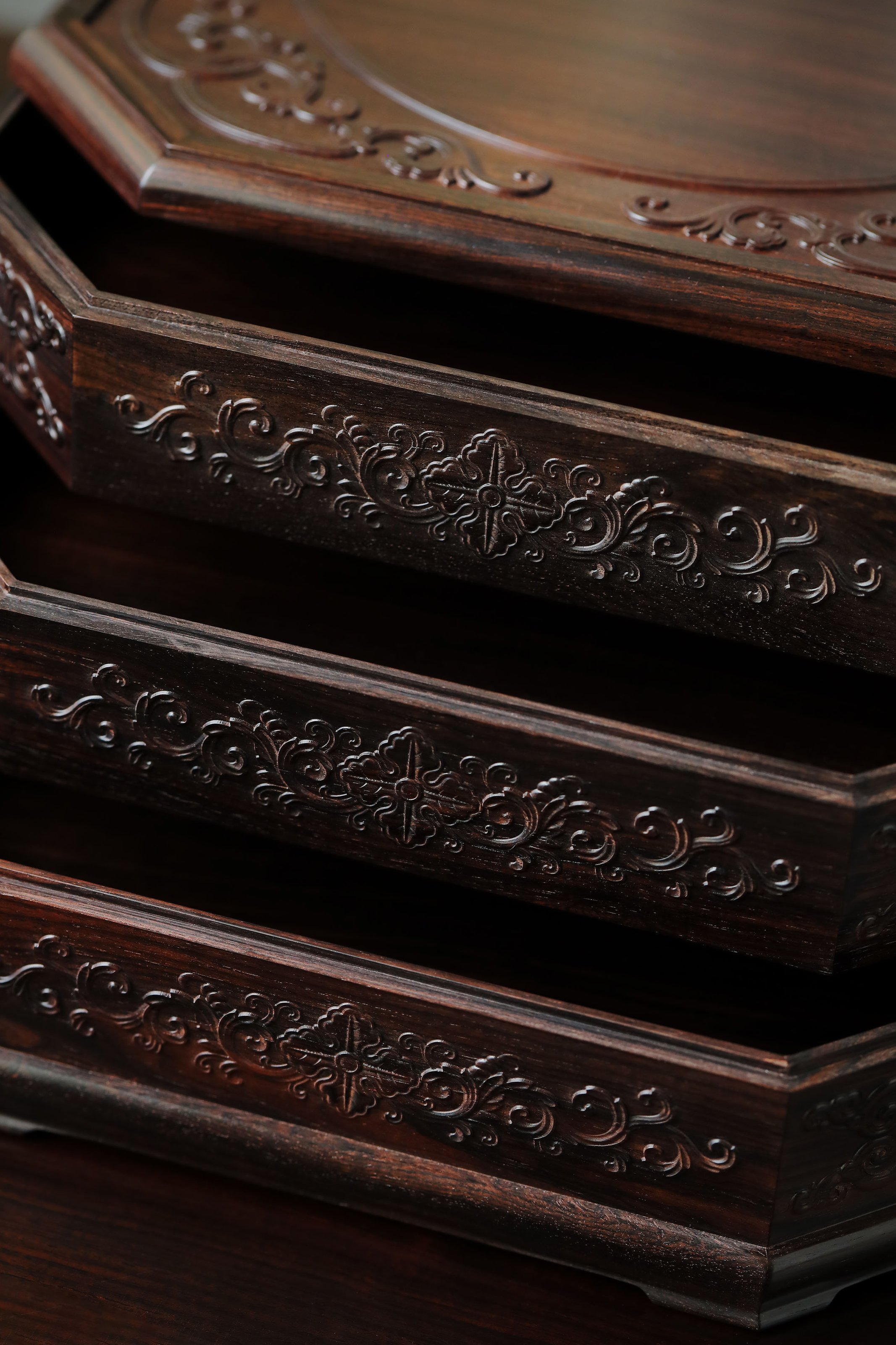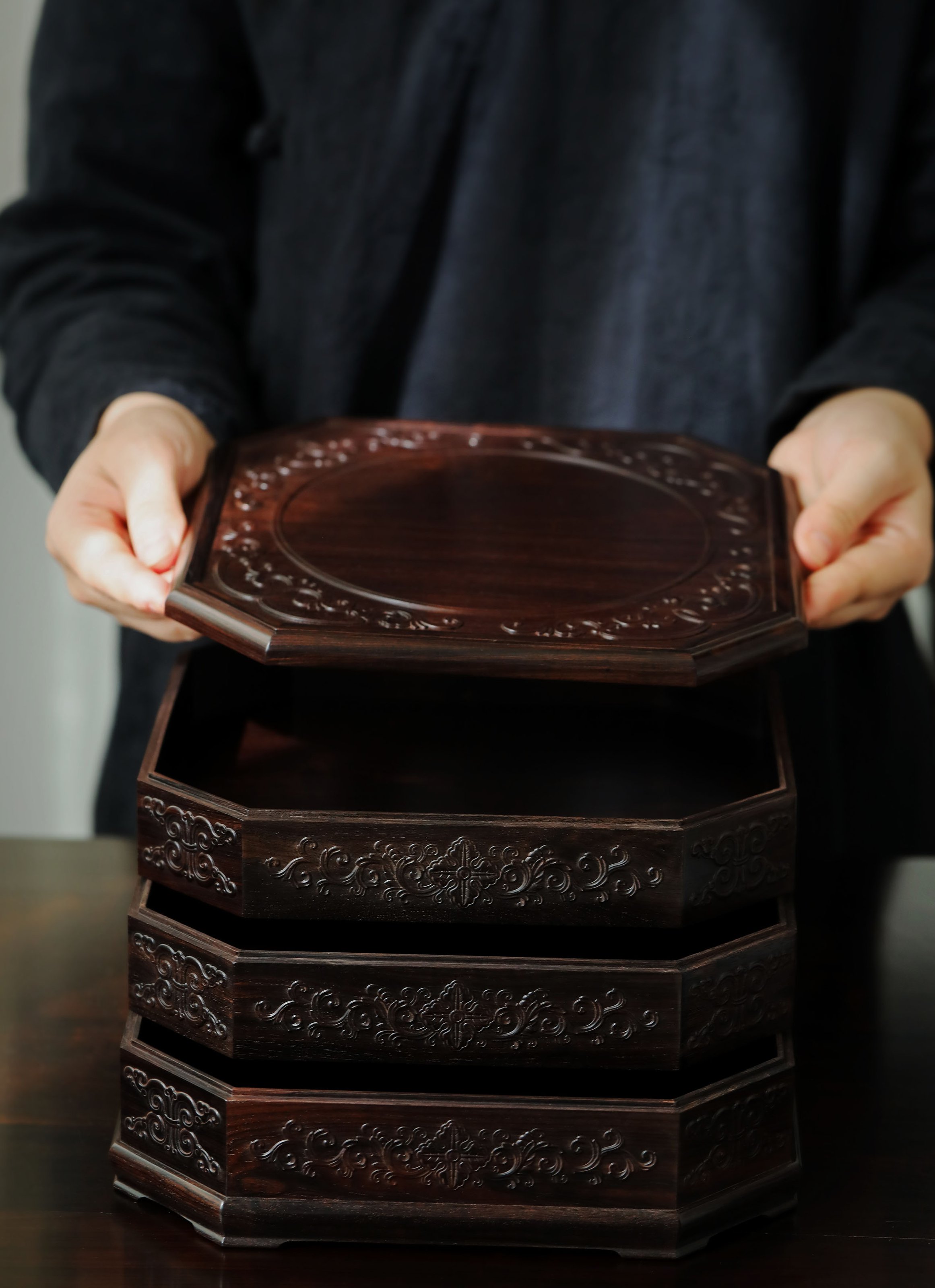 直径23.8cm 高13.5cm 大雅堂茶盒 材料:紫光檀 取材紫光檀老料,盒八角三层天地盖,榫卯结构,周身雕饰西番莲纹,茶室存茶,文人雅致。 直径23.8 高13.5cm 小叶紫檀茶盒 取材小叶紫檀,质坚细腻;盒八角三层天地盖,榫卯结构,周身雕饰西番莲纹,茶室存茶,文人雅致。