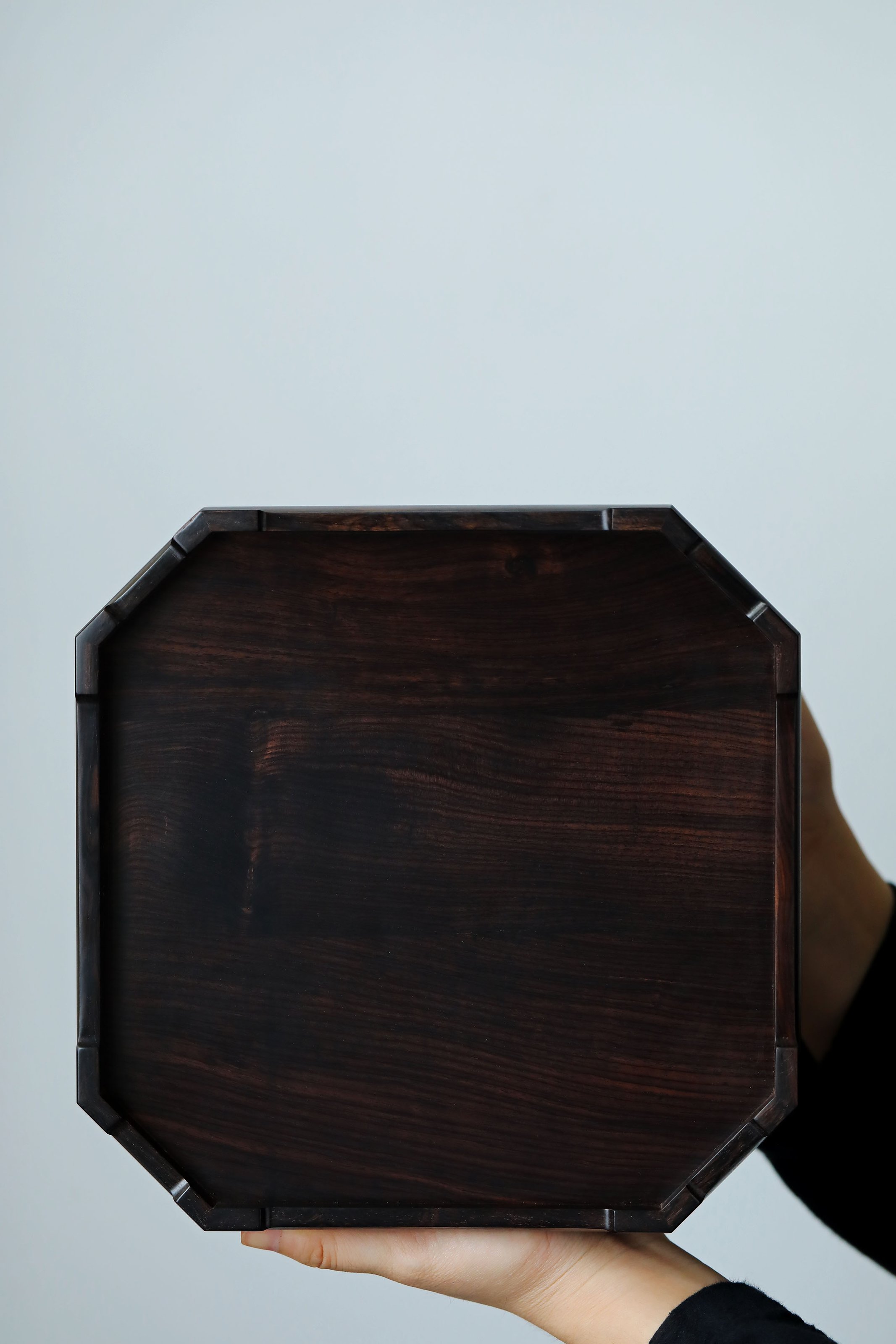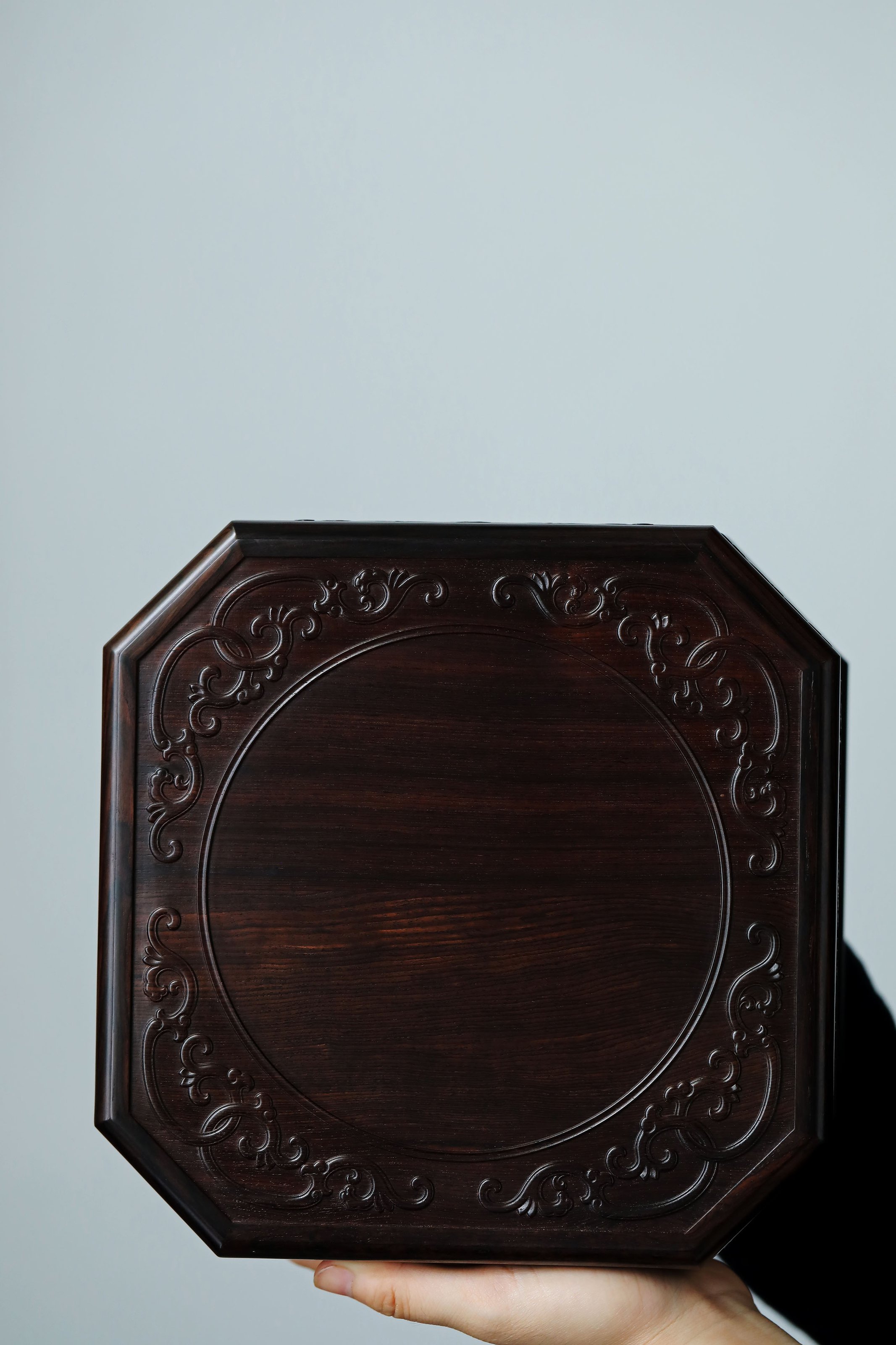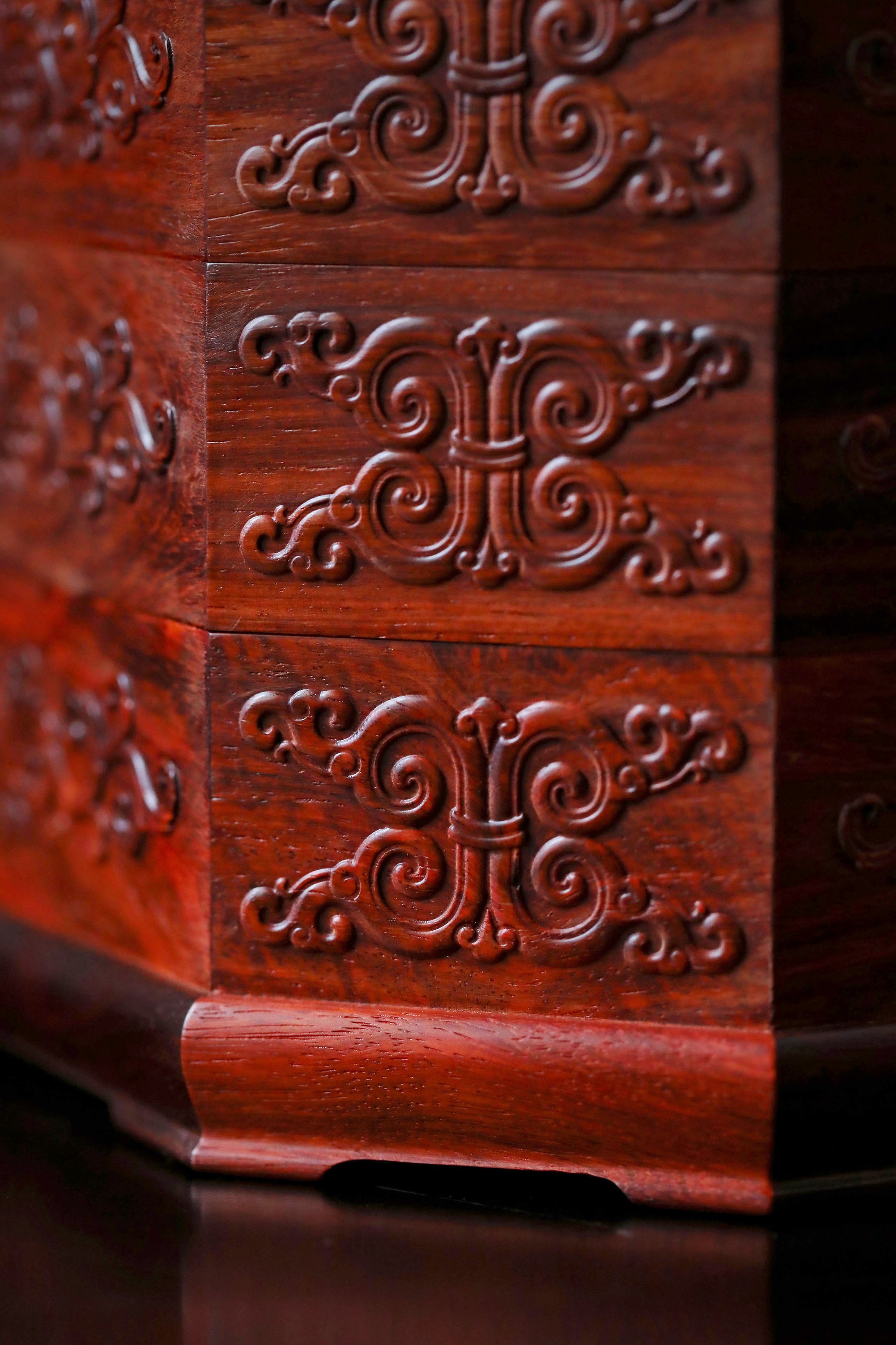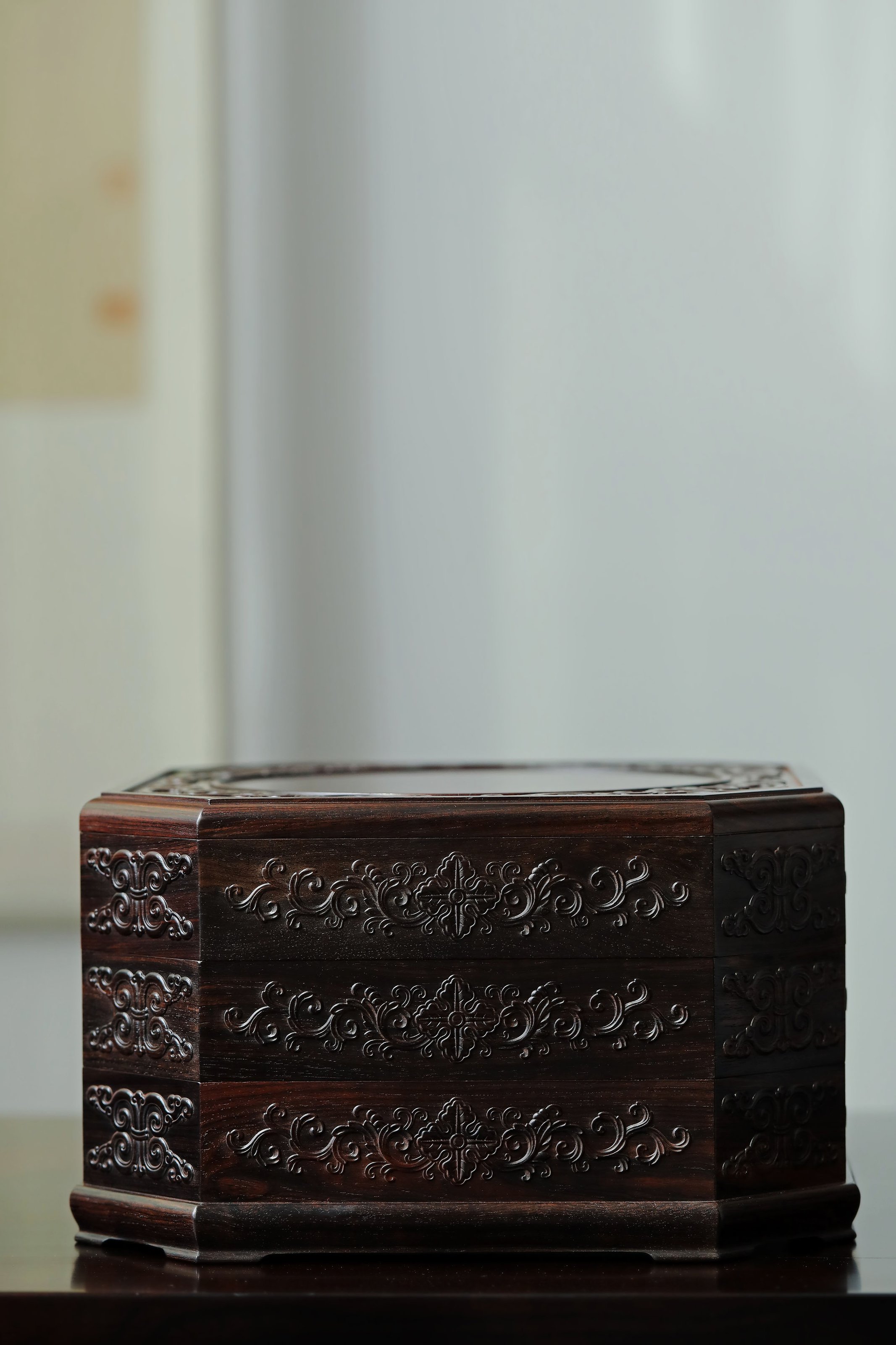 直径23.8cm 高13.5cm 大雅堂茶盒 材料:紫光檀 取材紫光檀老料,盒八角三层天地盖,榫卯结构,周身雕饰西番莲纹,茶室存茶,文人雅致。 直径23.8 高13.5cm 小叶紫檀茶盒 取材小叶紫檀,质坚细腻;盒八角三层天地盖,榫卯结构,周身雕饰西番莲纹,茶室存茶,文人雅致。