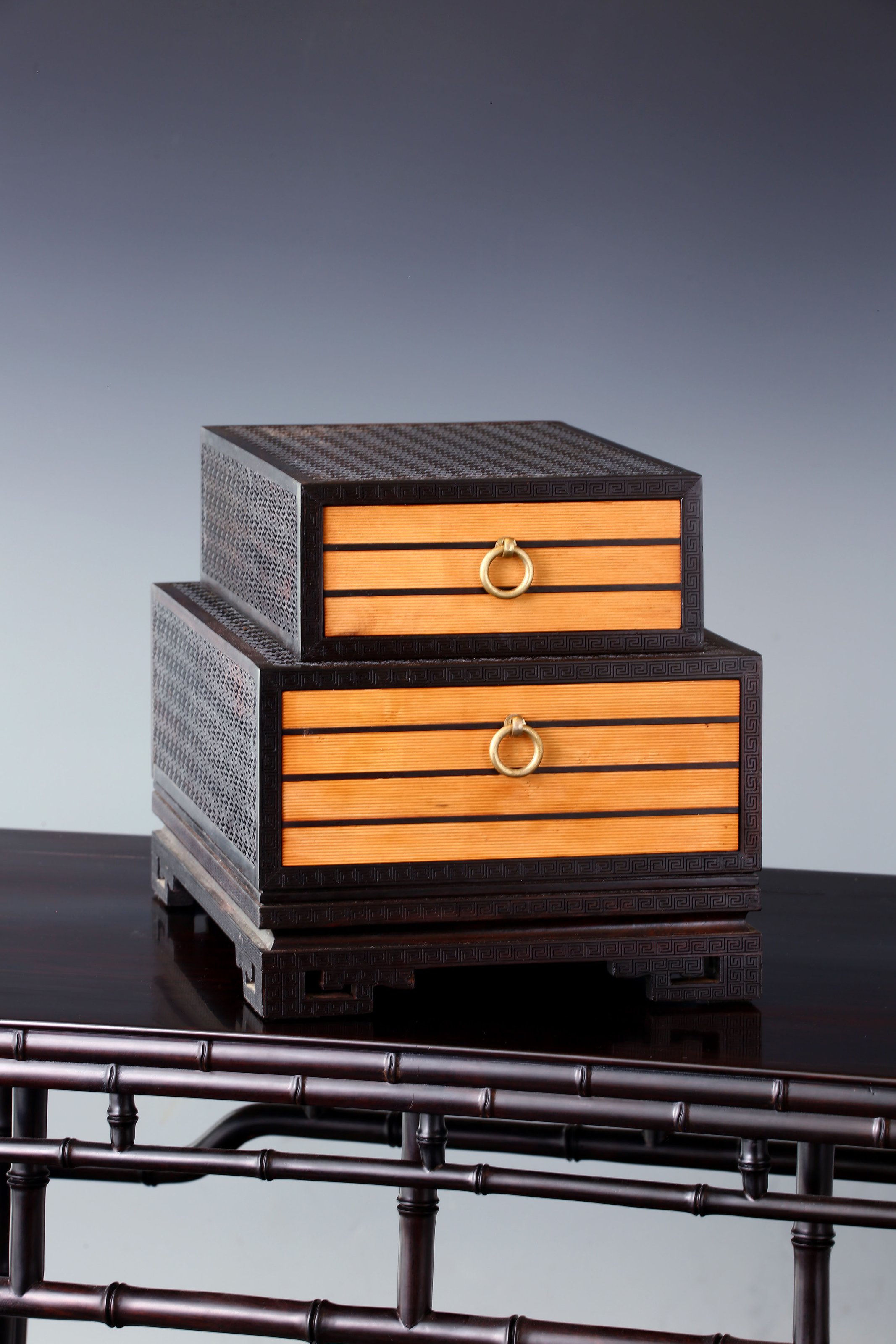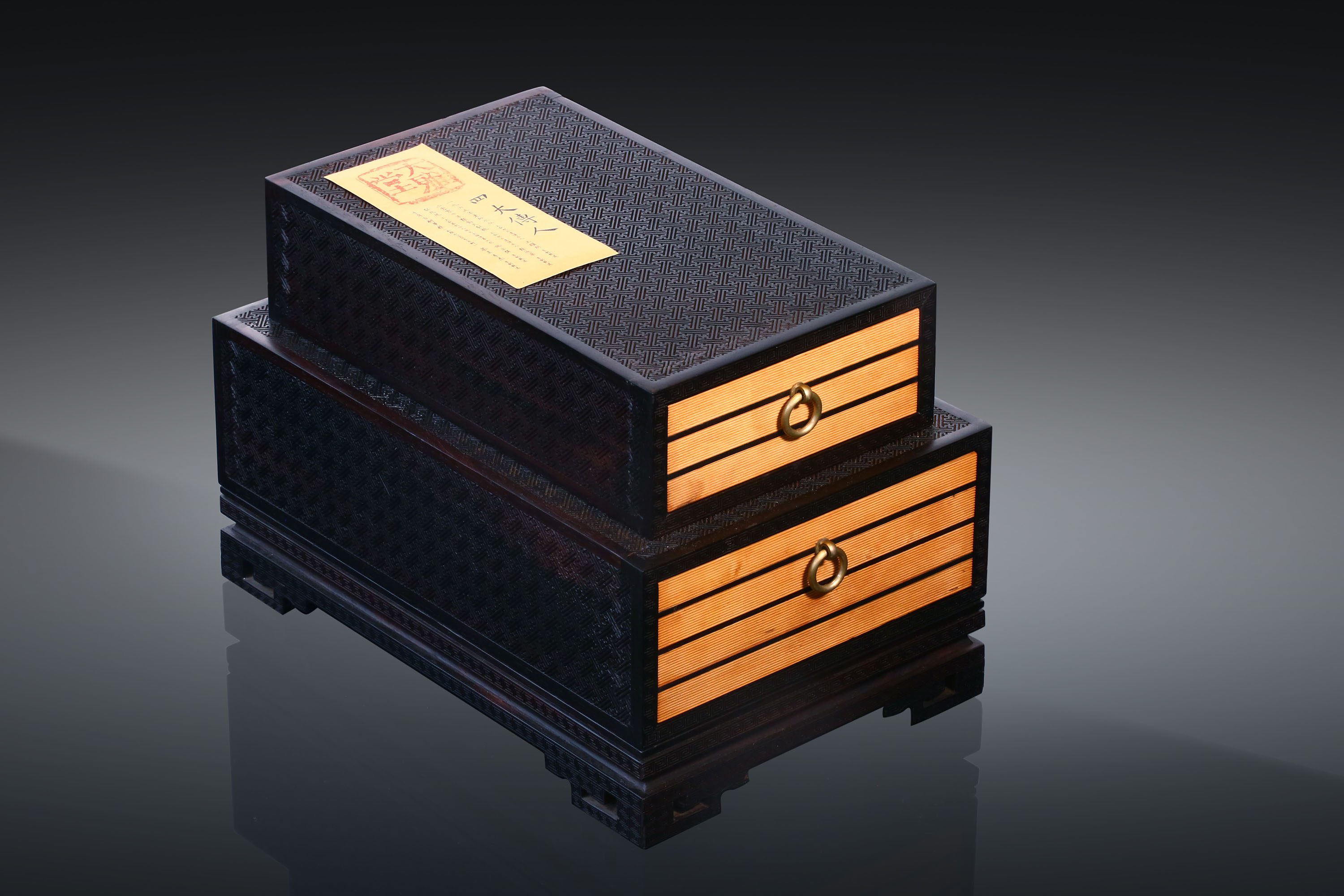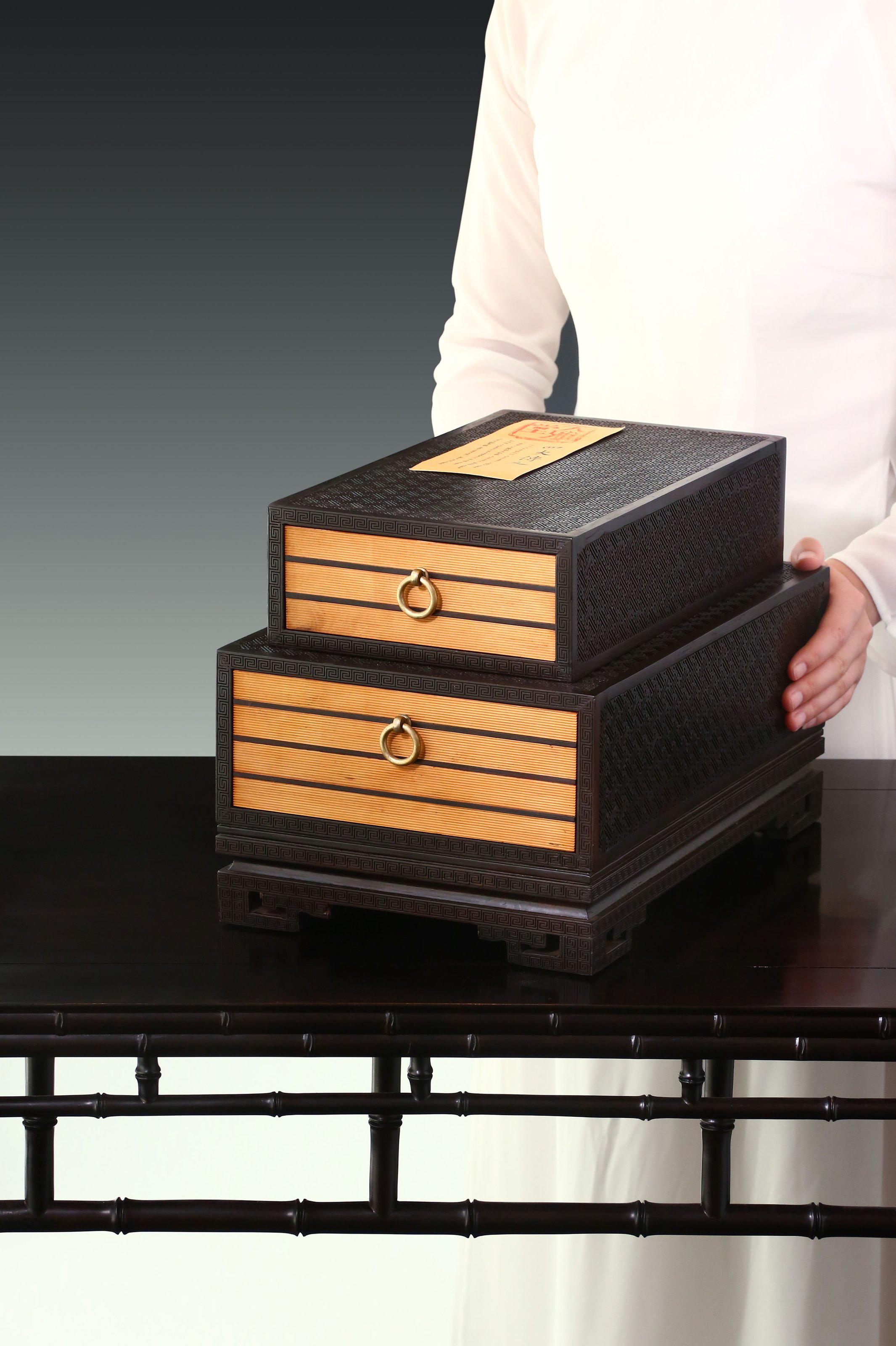 长:36cm宽:24cm高:28cm 大叶紫檀嵌黄杨卷书式茶盒 茶盒卢氏黑黄檀制,卢氏黑黄檀又称大叶紫檀,双层书函为形,上小下大,底部承束腰四足座。器身满工,侧面万字流水纹,繁复细密,精而不乱,正面环饰回字纹,黄杨木刻均匀书页,设环形拉环,榫卯相合,精工细作,奢华尊贵。