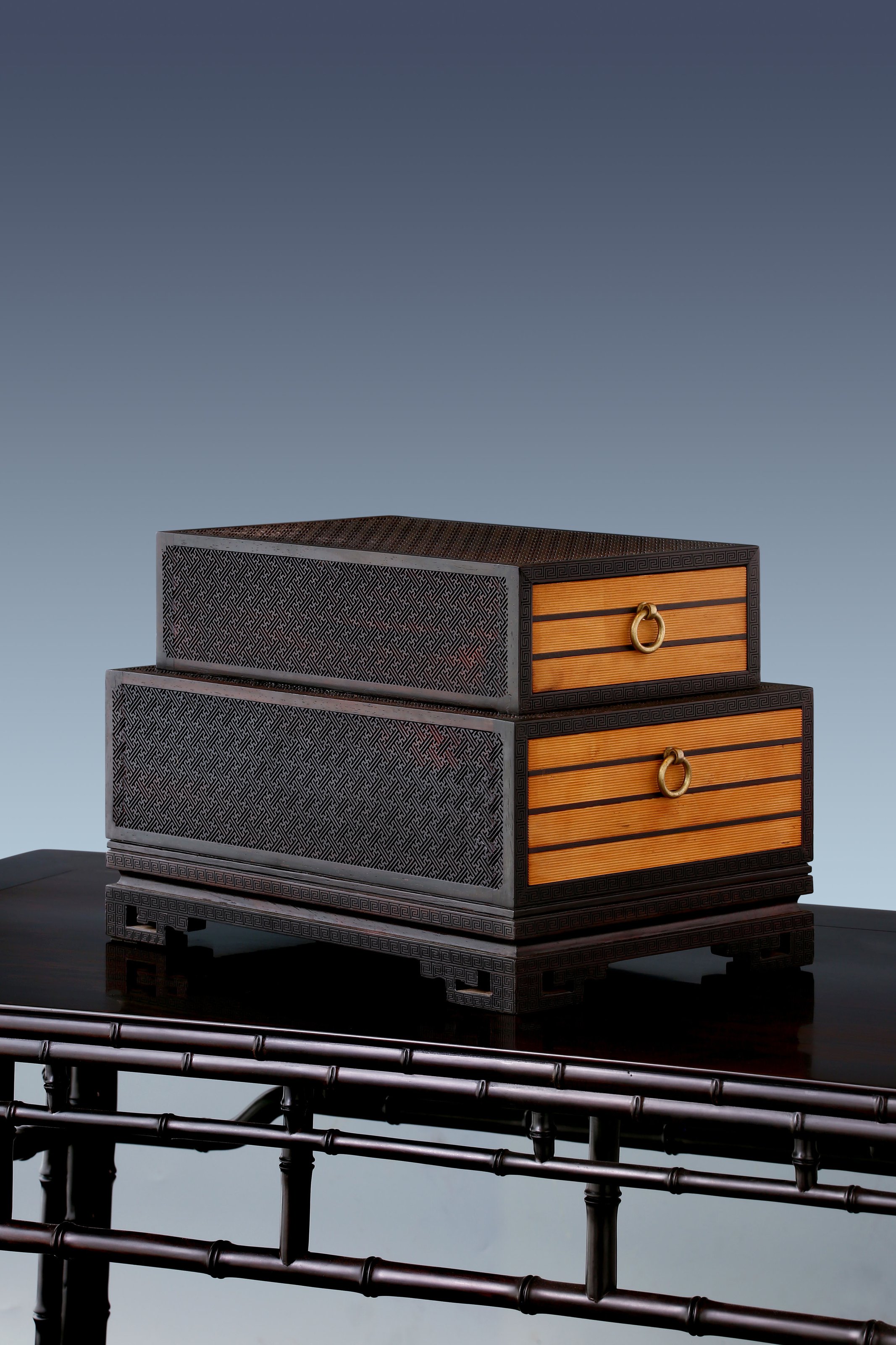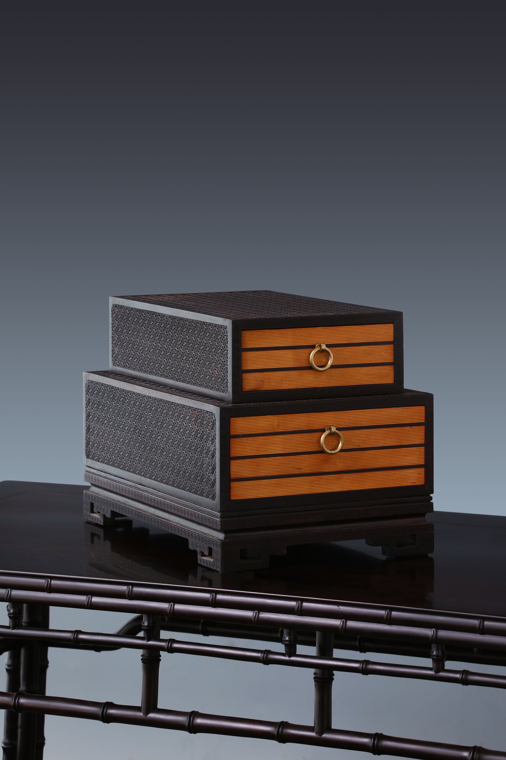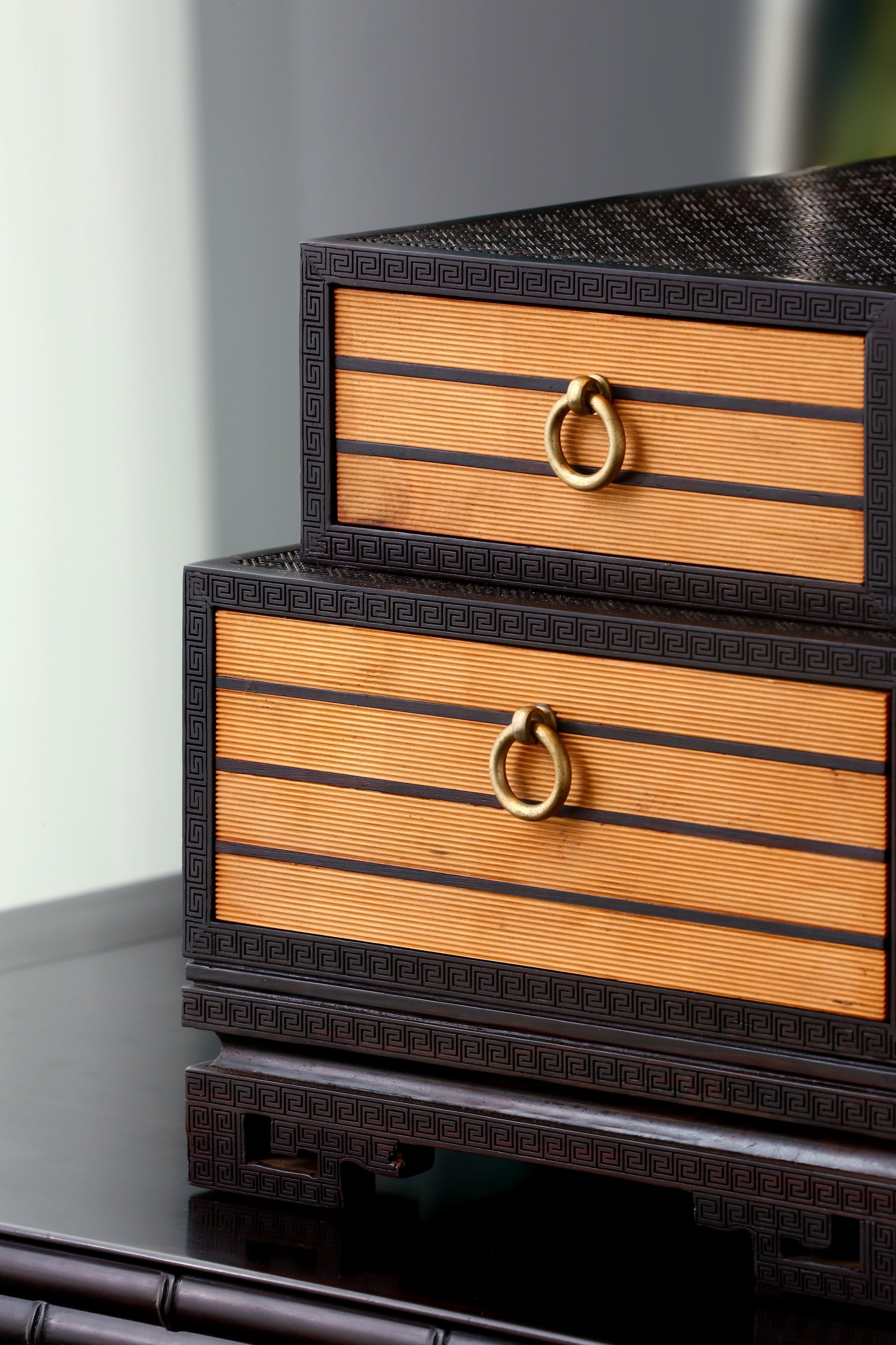 长:36cm宽:24cm高:28cm 大叶紫檀嵌黄杨卷书式茶盒 茶盒卢氏黑黄檀制,卢氏黑黄檀又称大叶紫檀,双层书函为形,上小下大,底部承束腰四足座。器身满工,侧面万字流水纹,繁复细密,精而不乱,正面环饰回字纹,黄杨木刻均匀书页,设环形拉环,榫卯相合,精工细作,奢华尊贵。