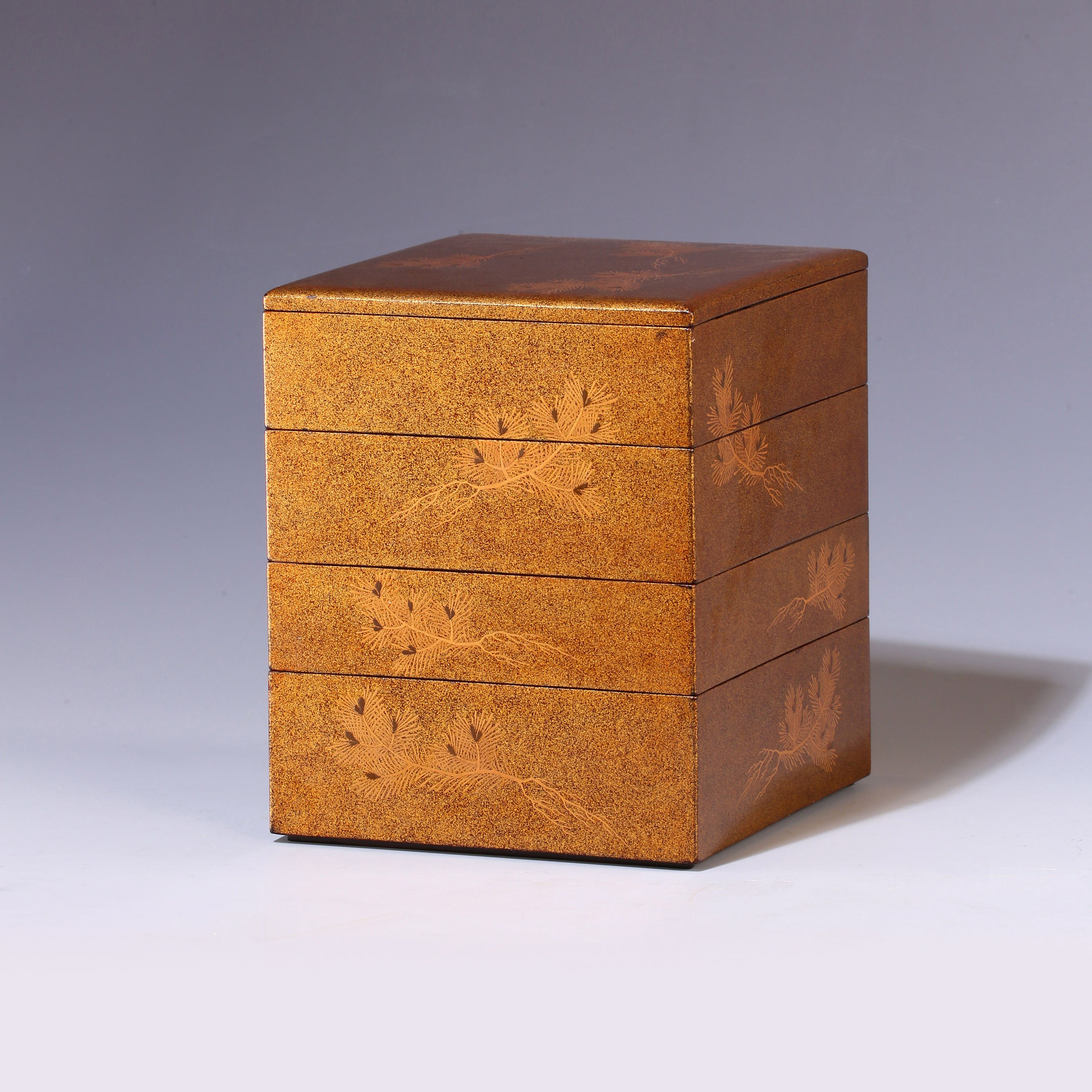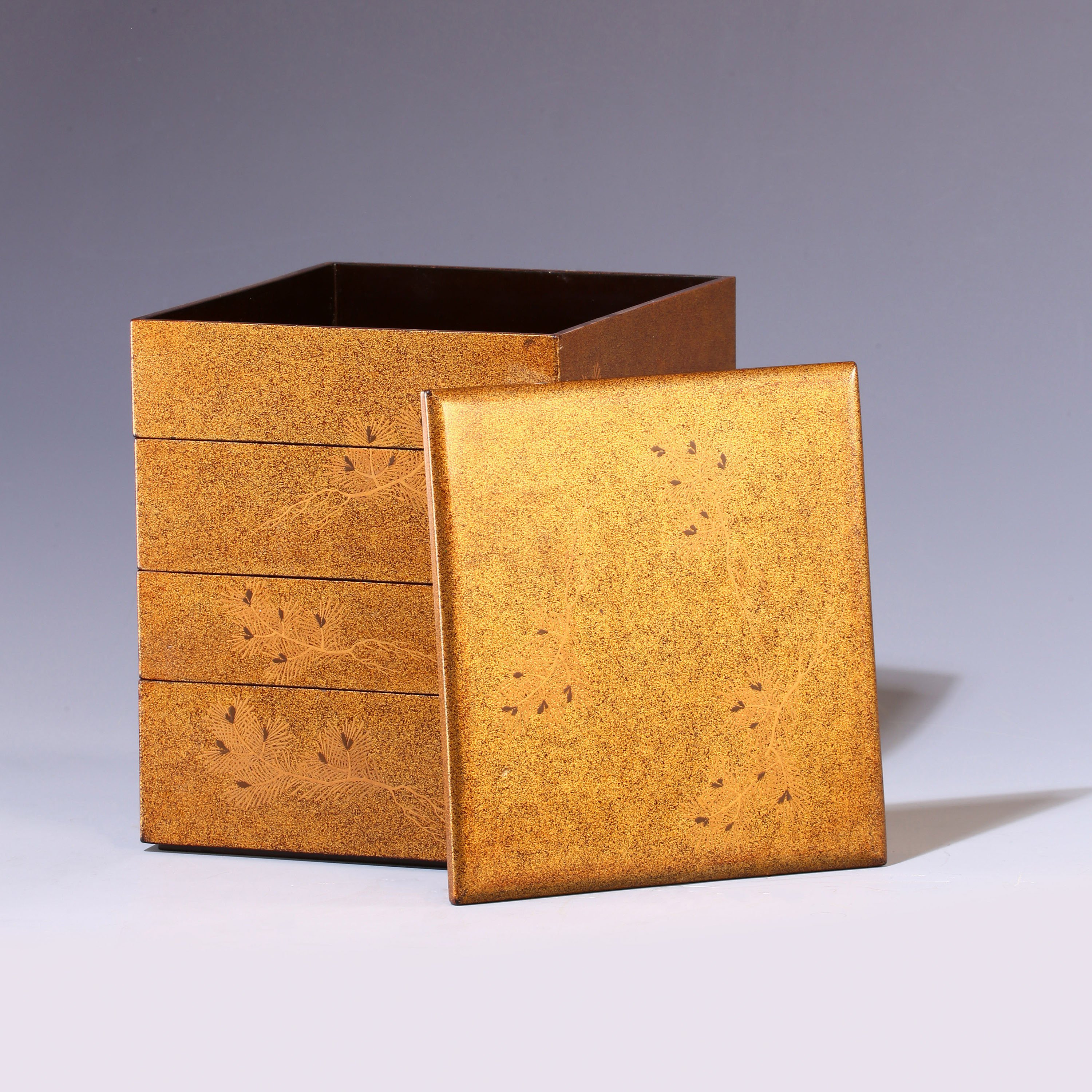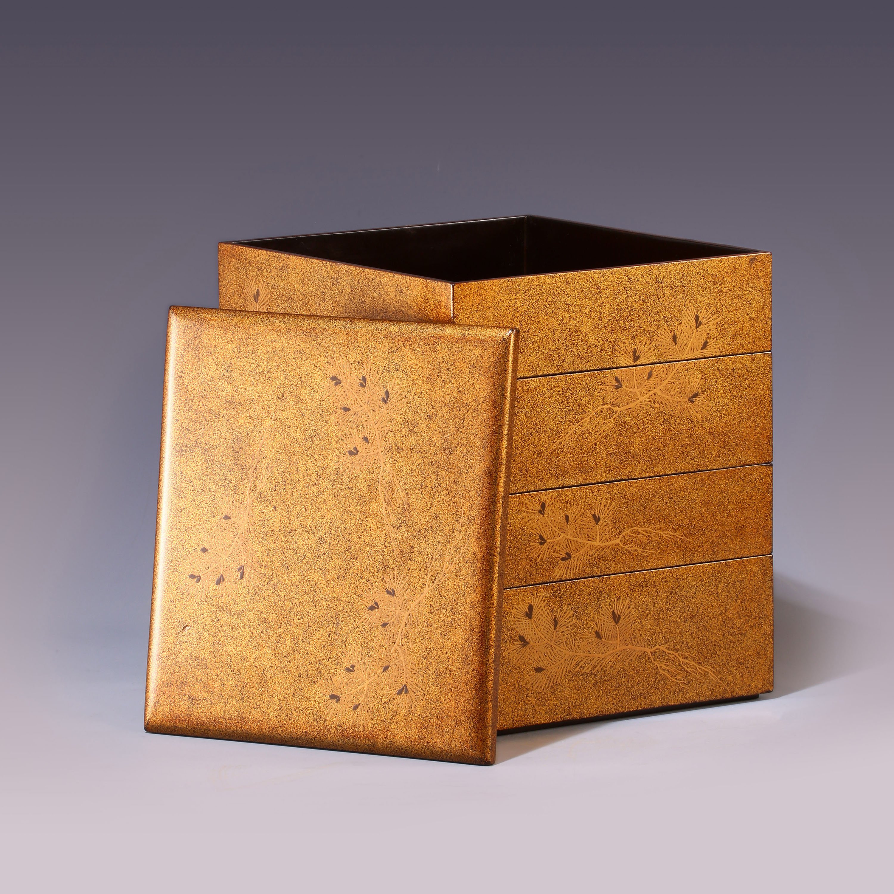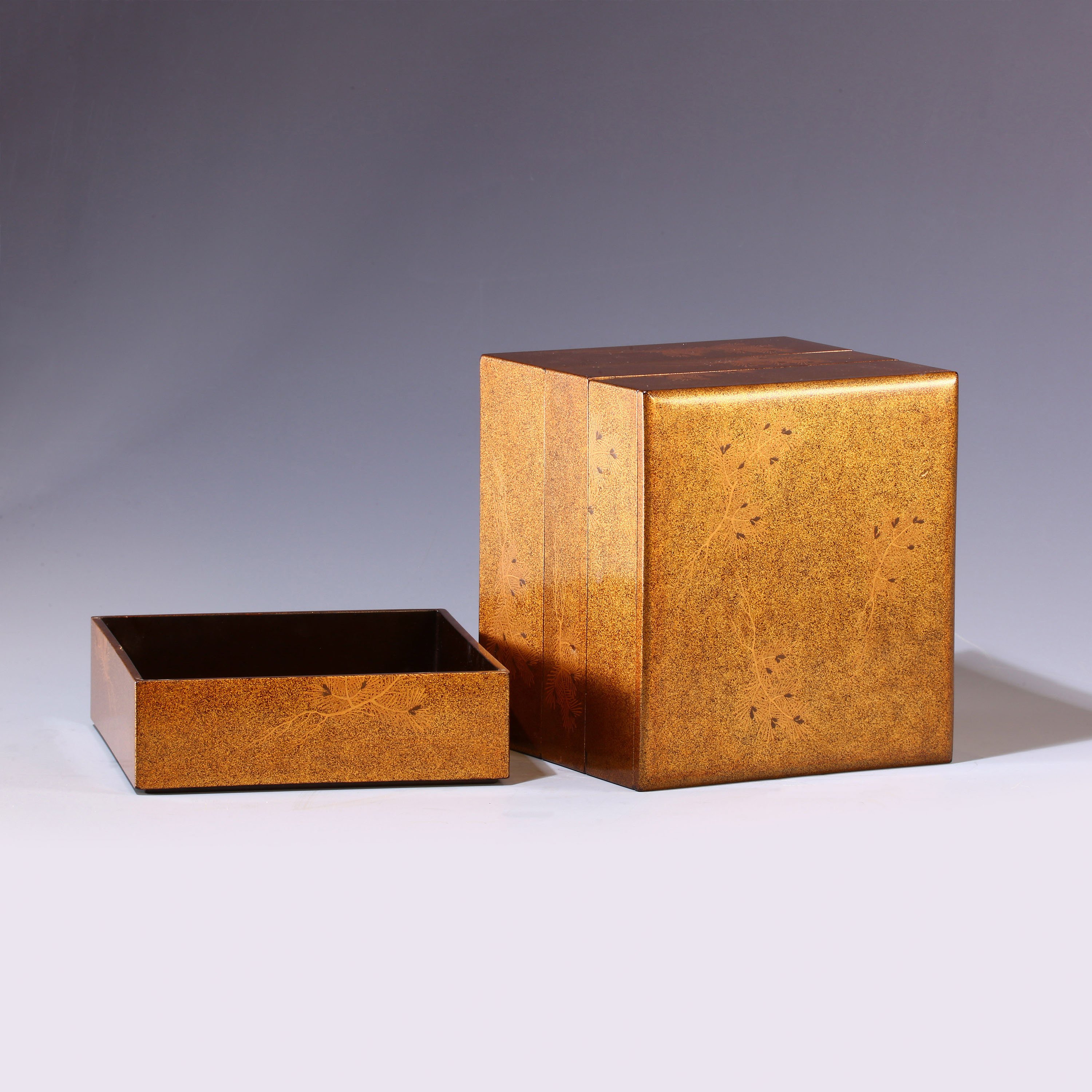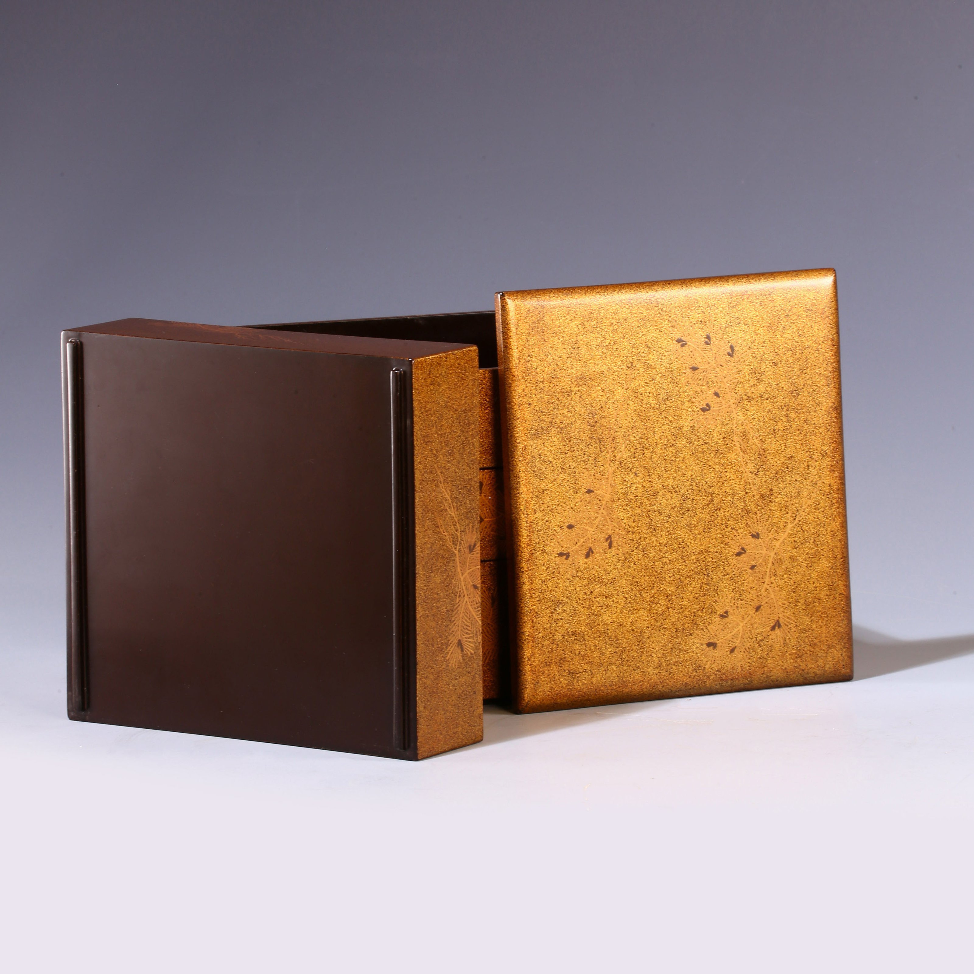 高:18.5cm 长:16.5cm 宽:15.5cm 金犁地莳绘四撞茶盒 茶盒长方形,共四撞,上三层高度相近,底层较高,可分层收纳不同尺寸小物。外部金犁地,金光奕奕,雍容华贵,上绘草叶,枝叶似羽,轻柔曼妙,内部黑漆,均匀光洁。纹饰跨层,而线条延续,颇为精美。底部两缘,平行双线足,可保底部干燥透气。