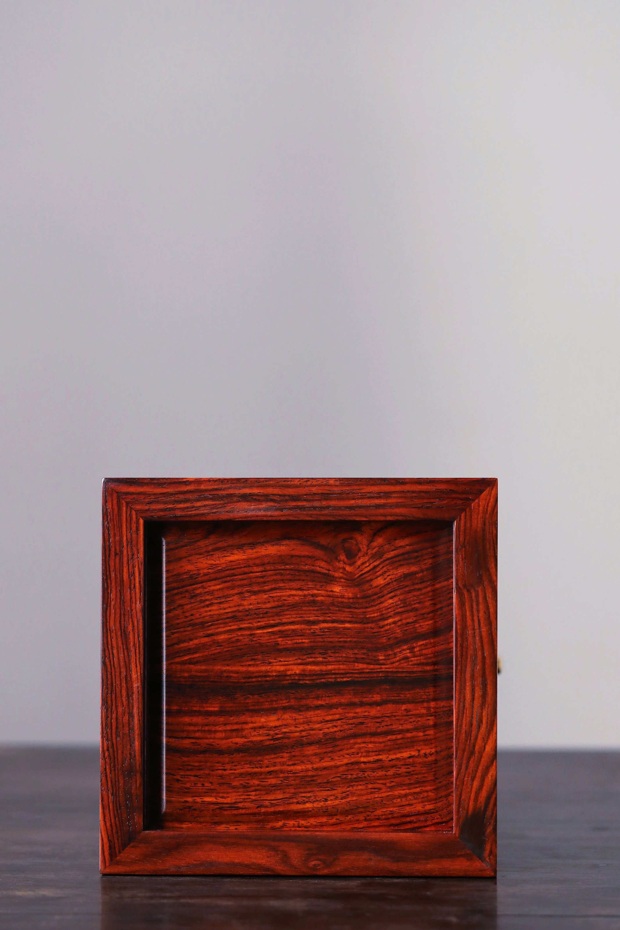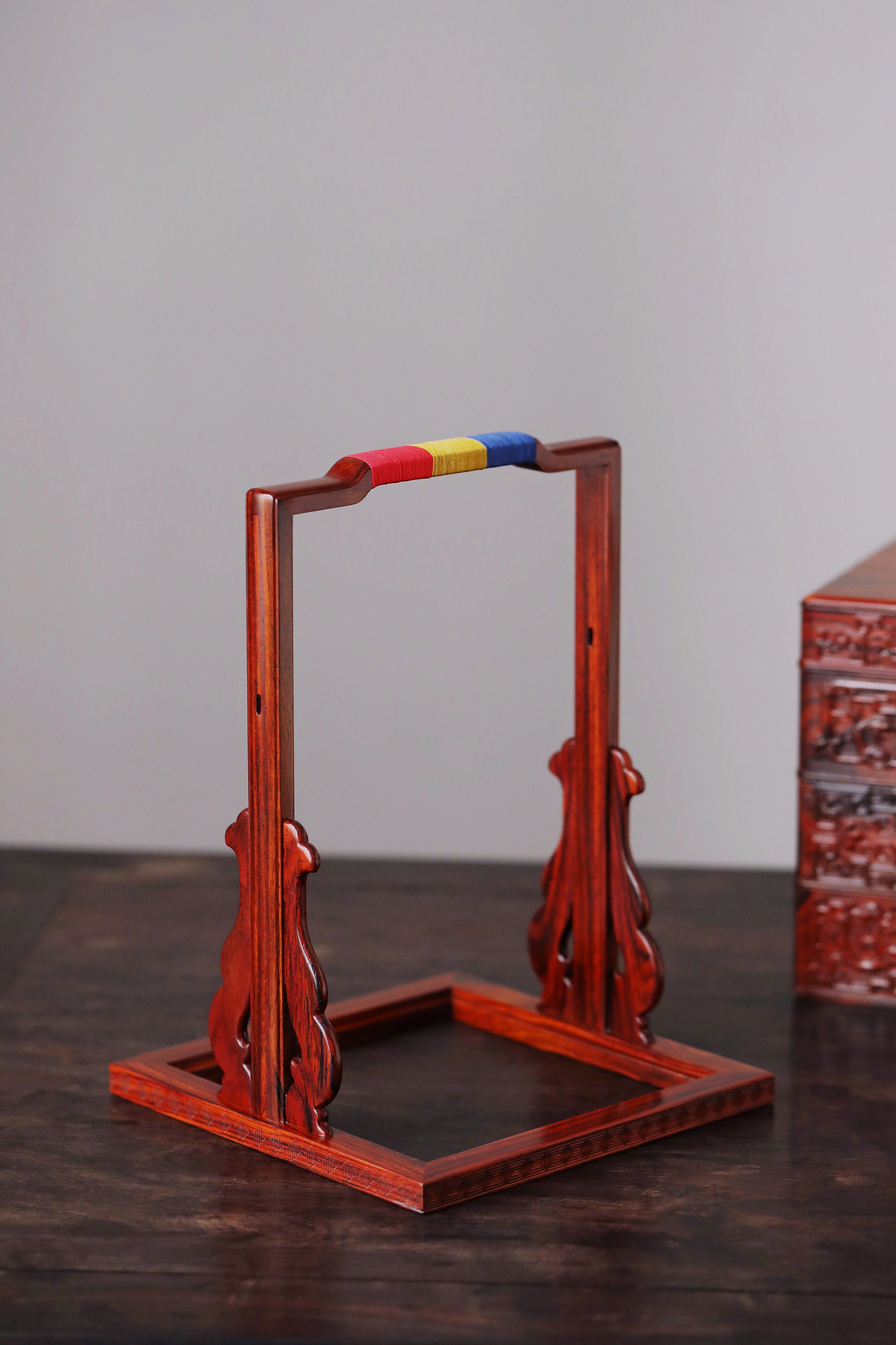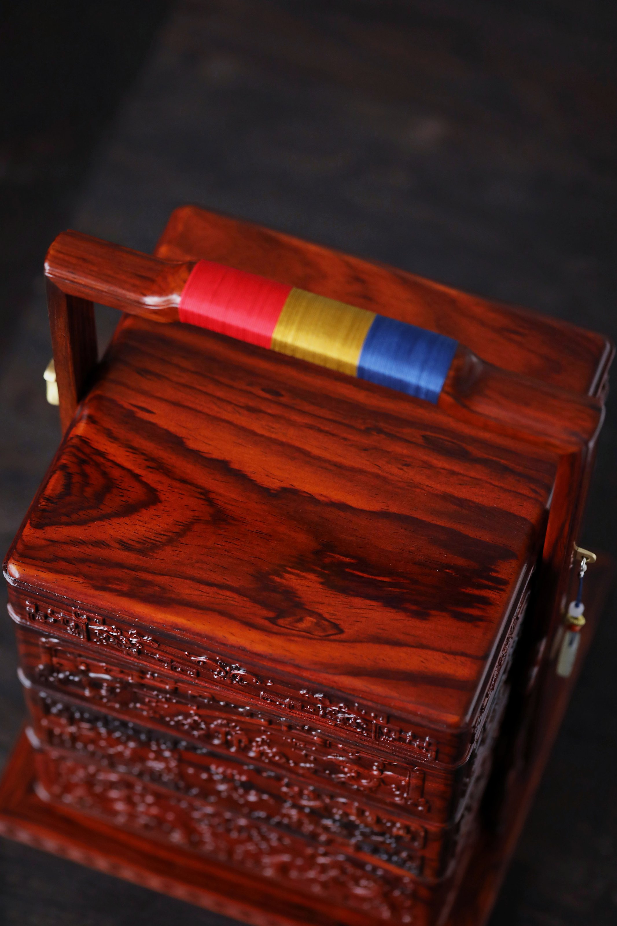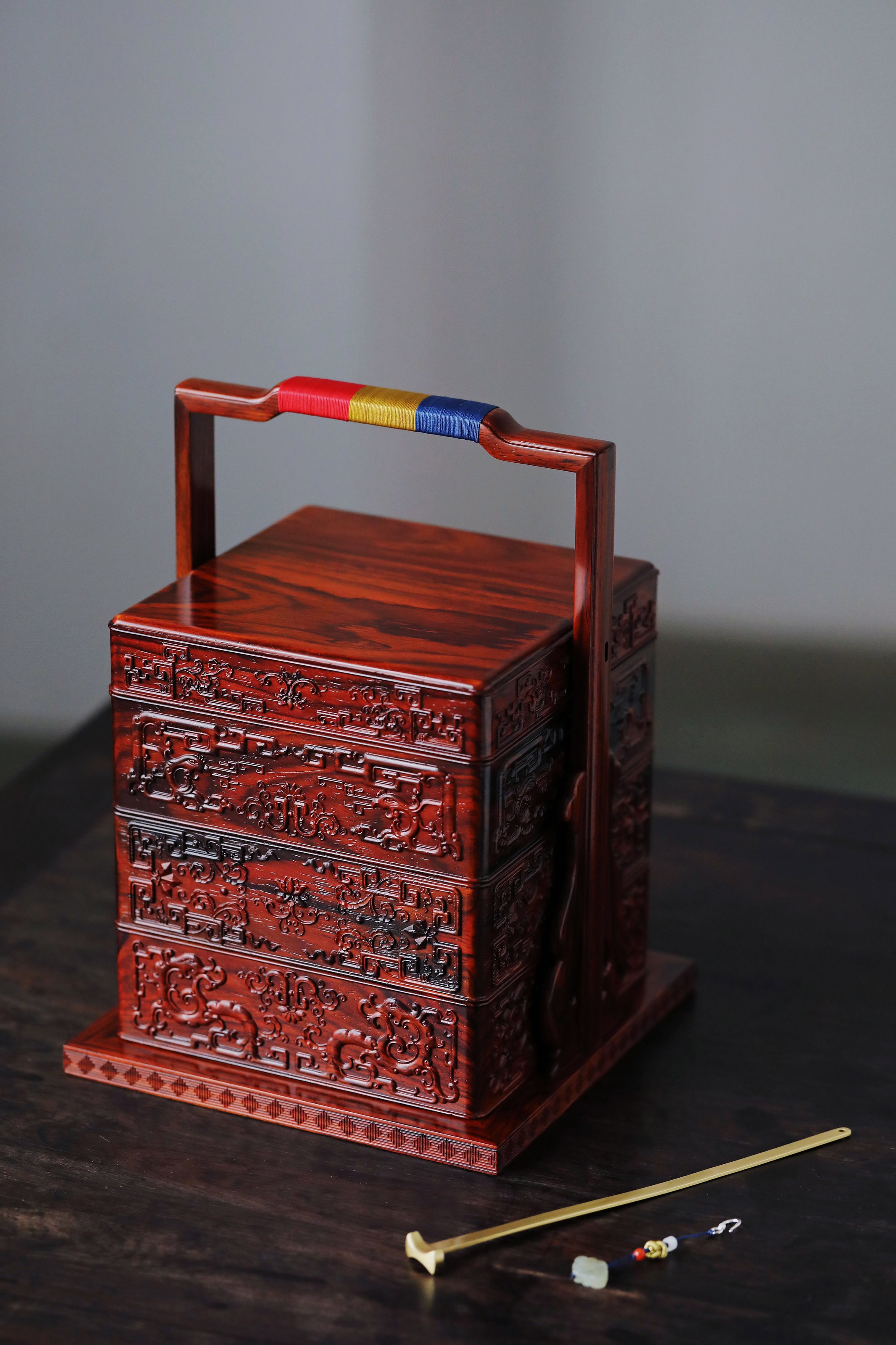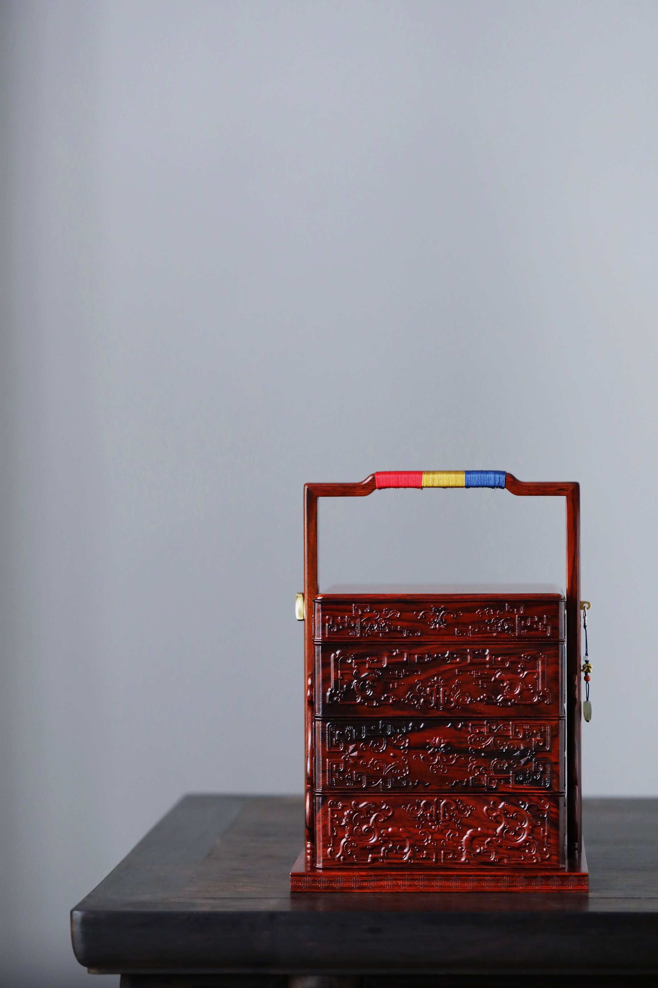 择材红酸枝,榫卯制器,造型端庄儒雅,巧而精致;周身满雕螭龙兽纹,吉祥如意;