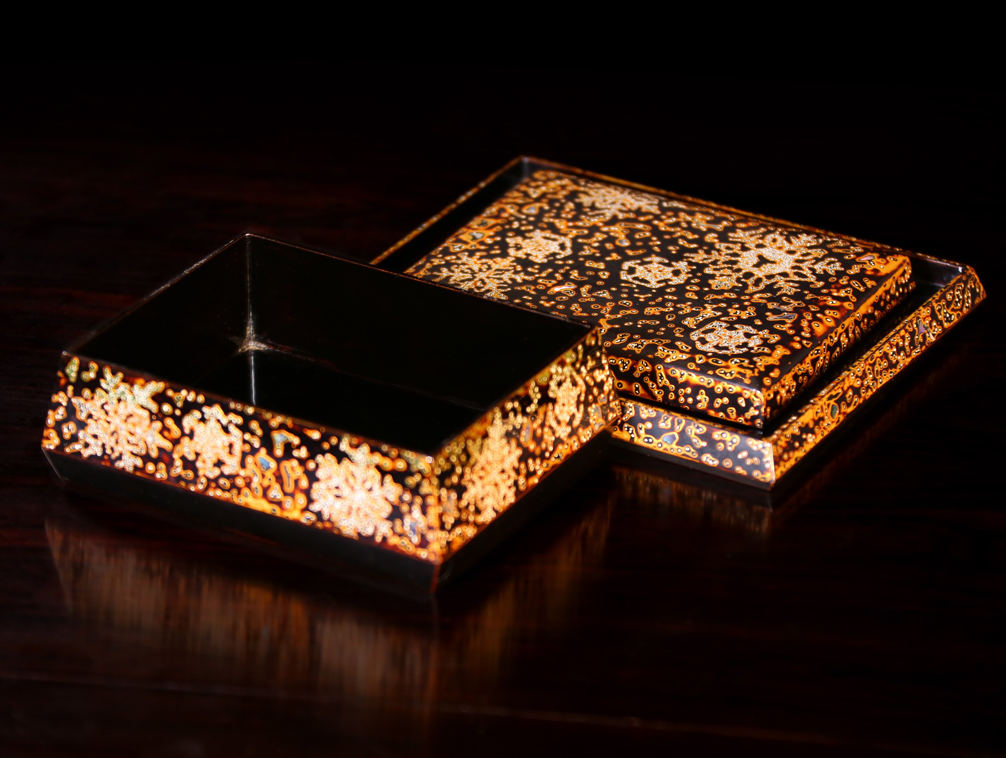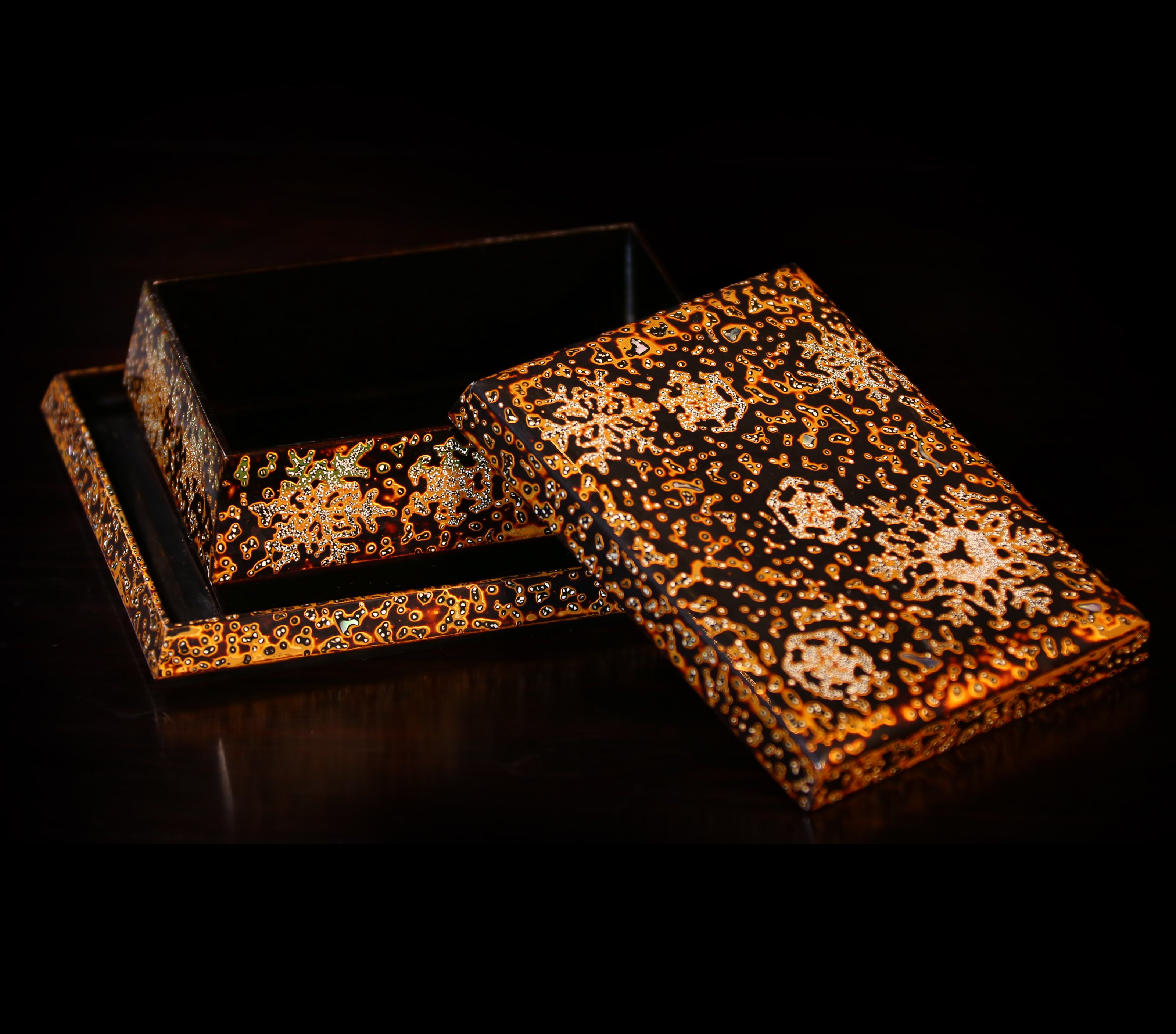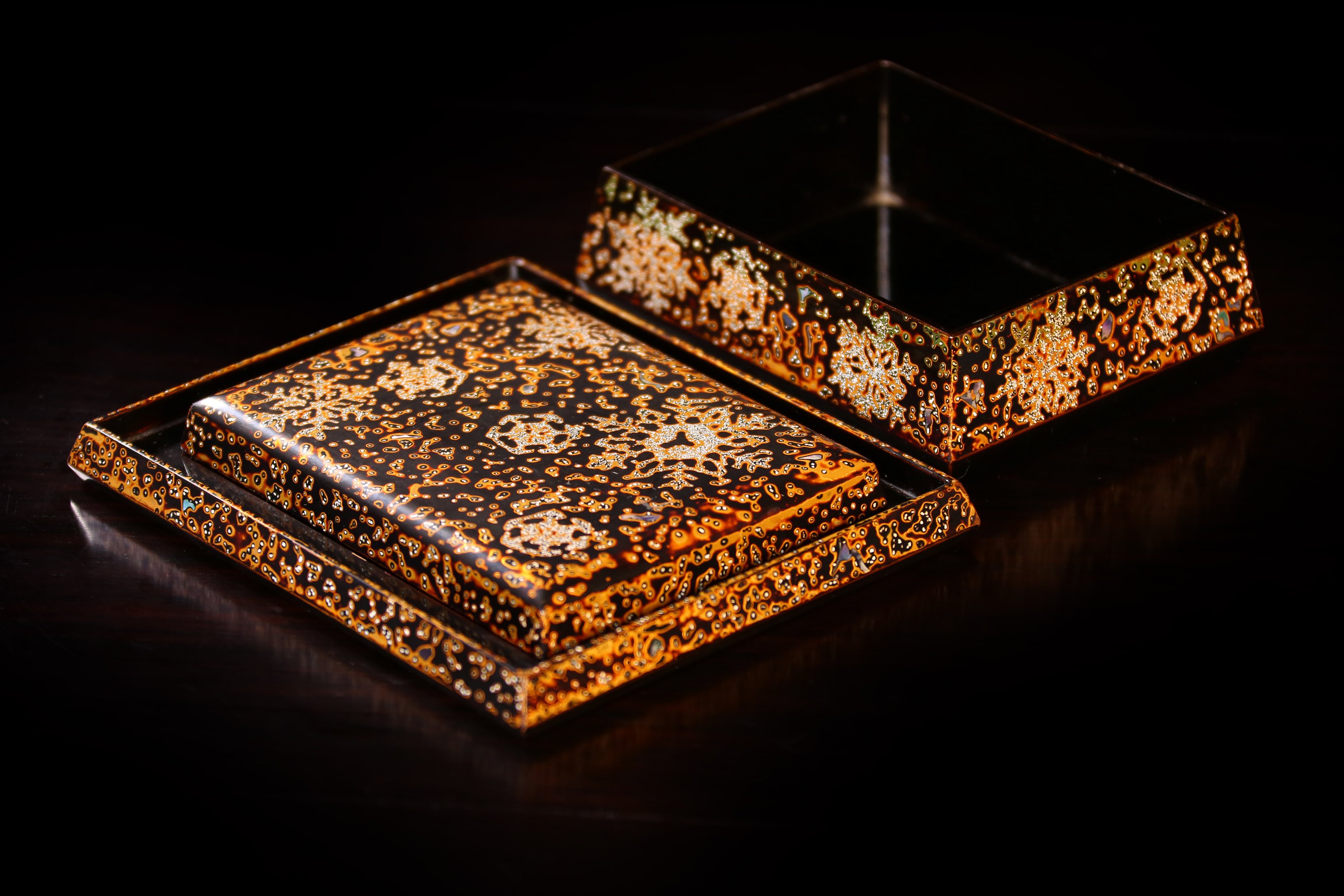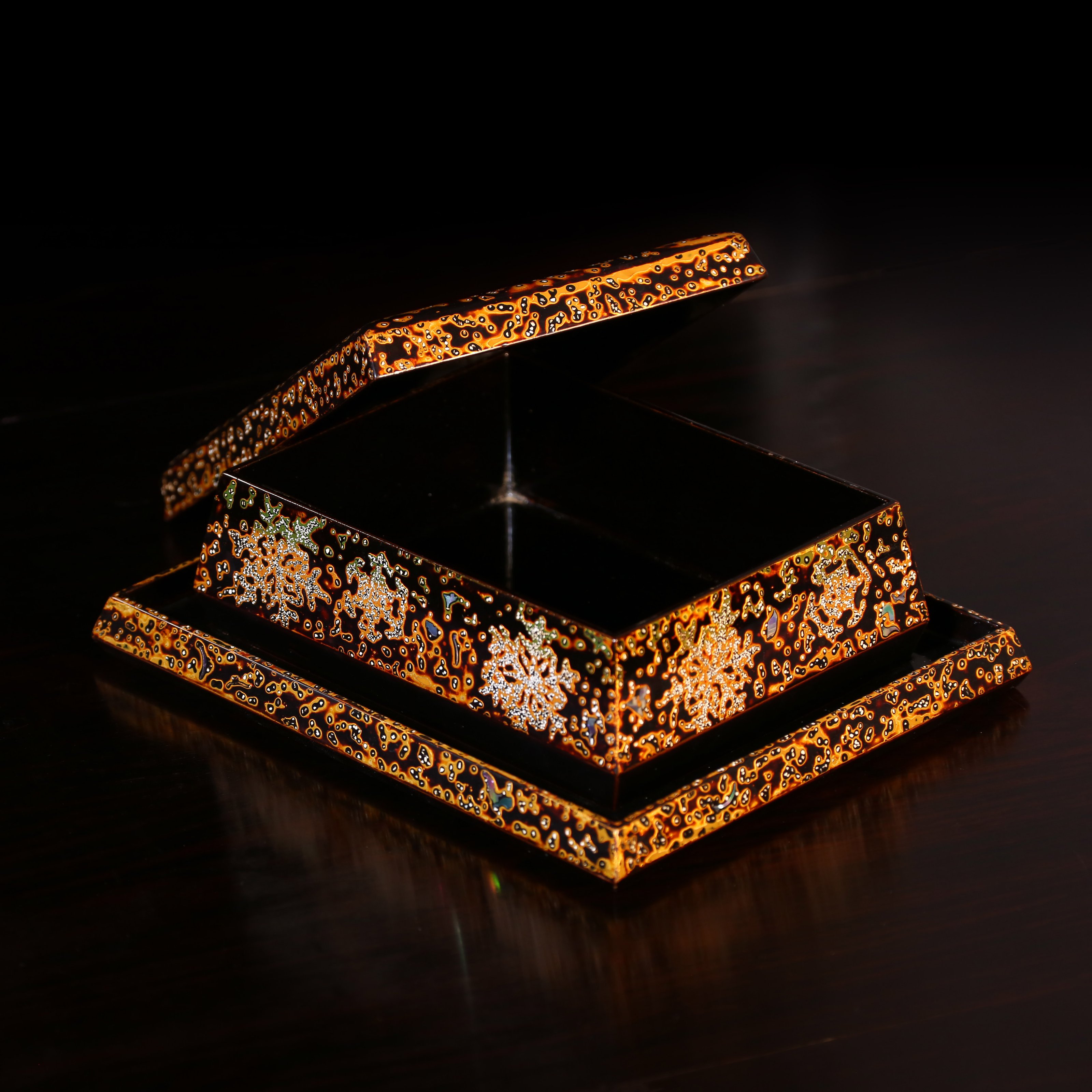 文盒:长:13cm,宽:10cm,高:4.5cm托长:17cm,宽:14cm 金虫涂文盒 金虫涂工艺已经失传,这件文盒,盖、盒、托共三件。黑色与金色的搭配,灿烂美观。此套茶道具,虽年沧桑,依然风采照人,工艺之精美,选料之精粹,非触摸把玩不可知。
