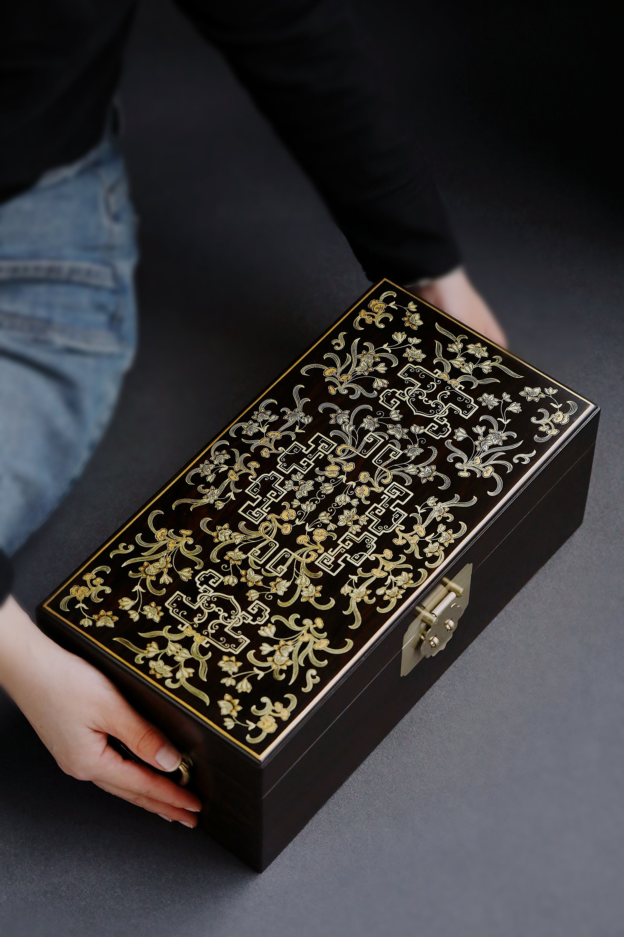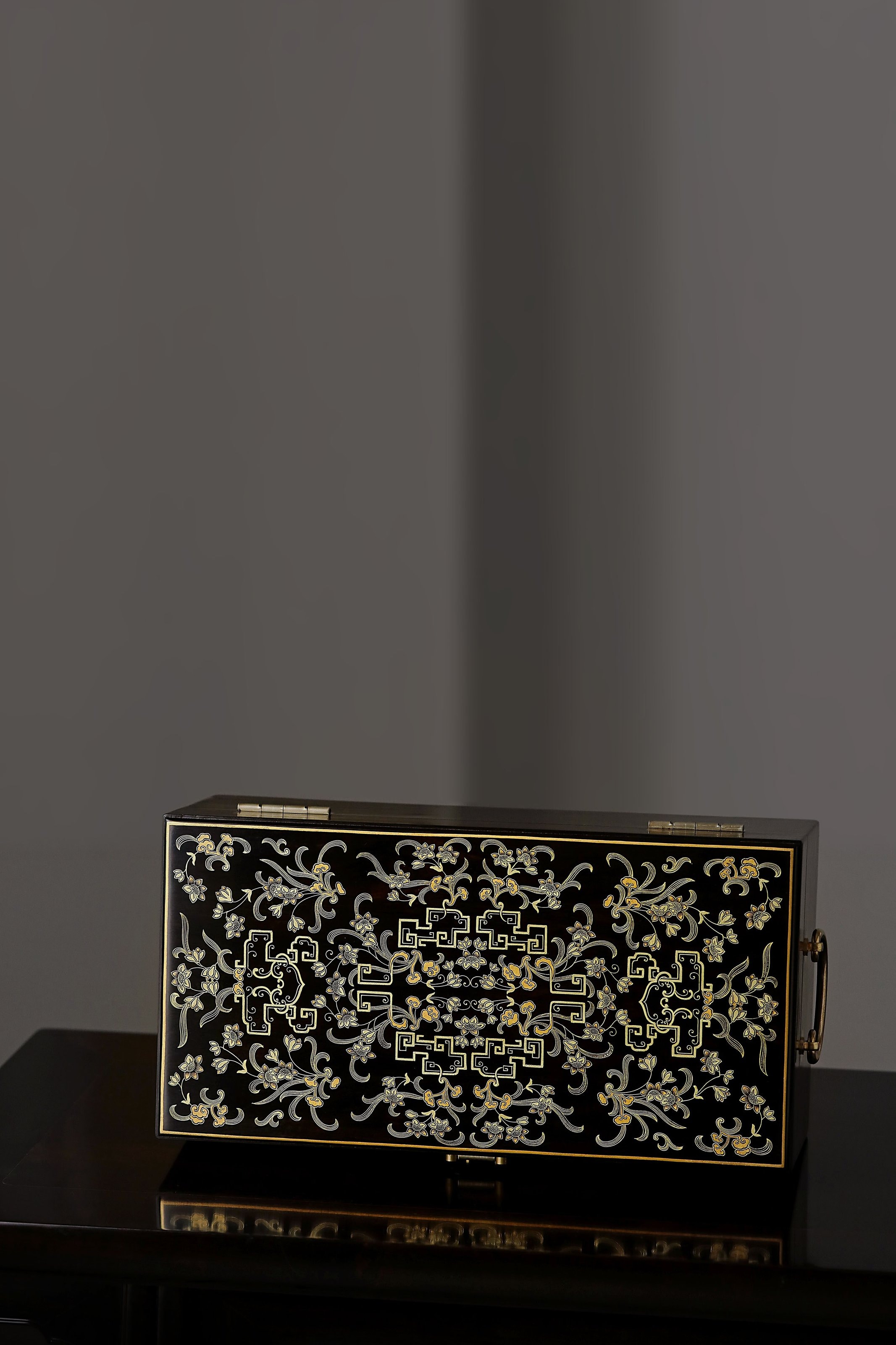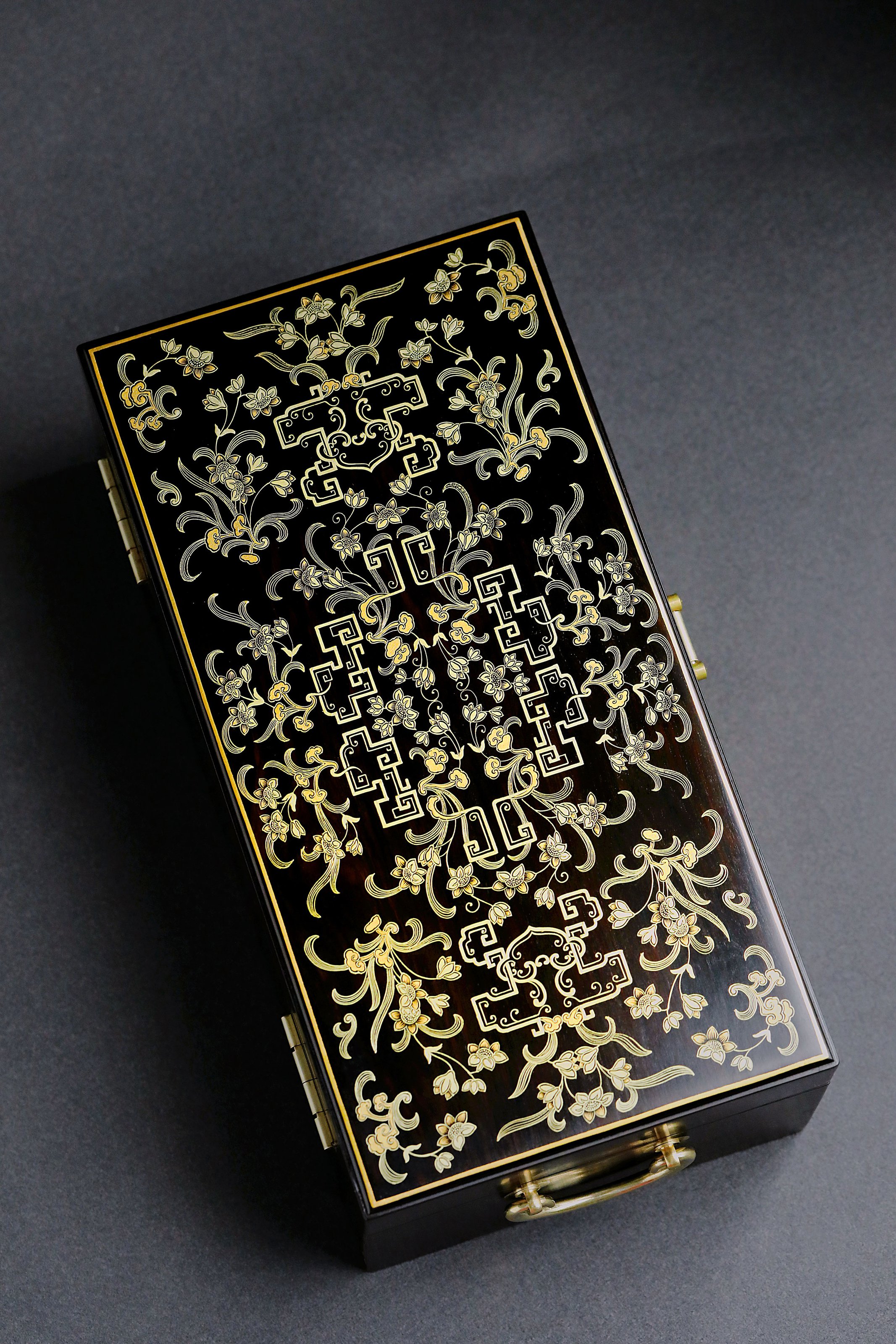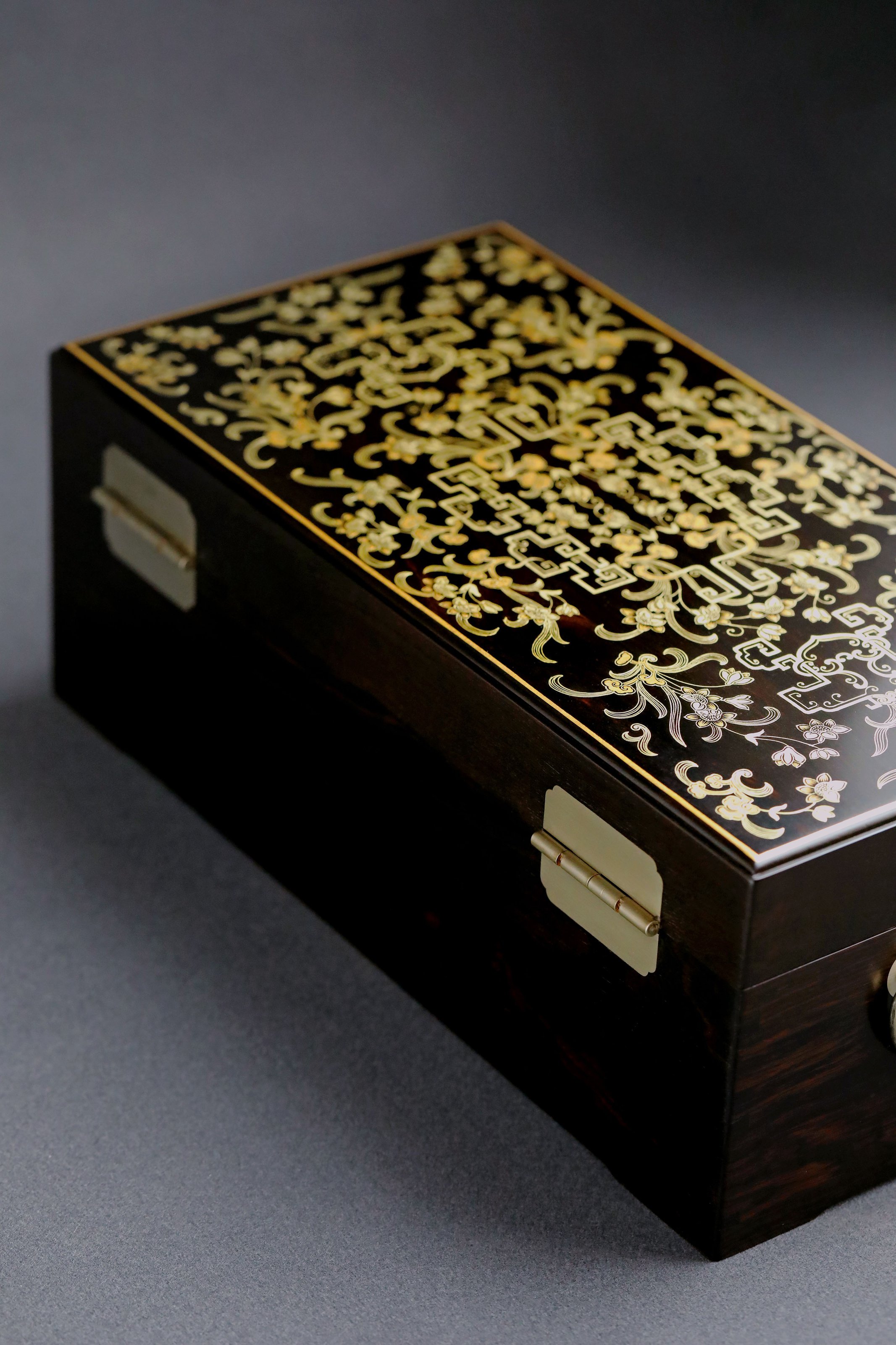 手工描金灵芝如意图,缠枝环绕错落有致,金碧璀璨;