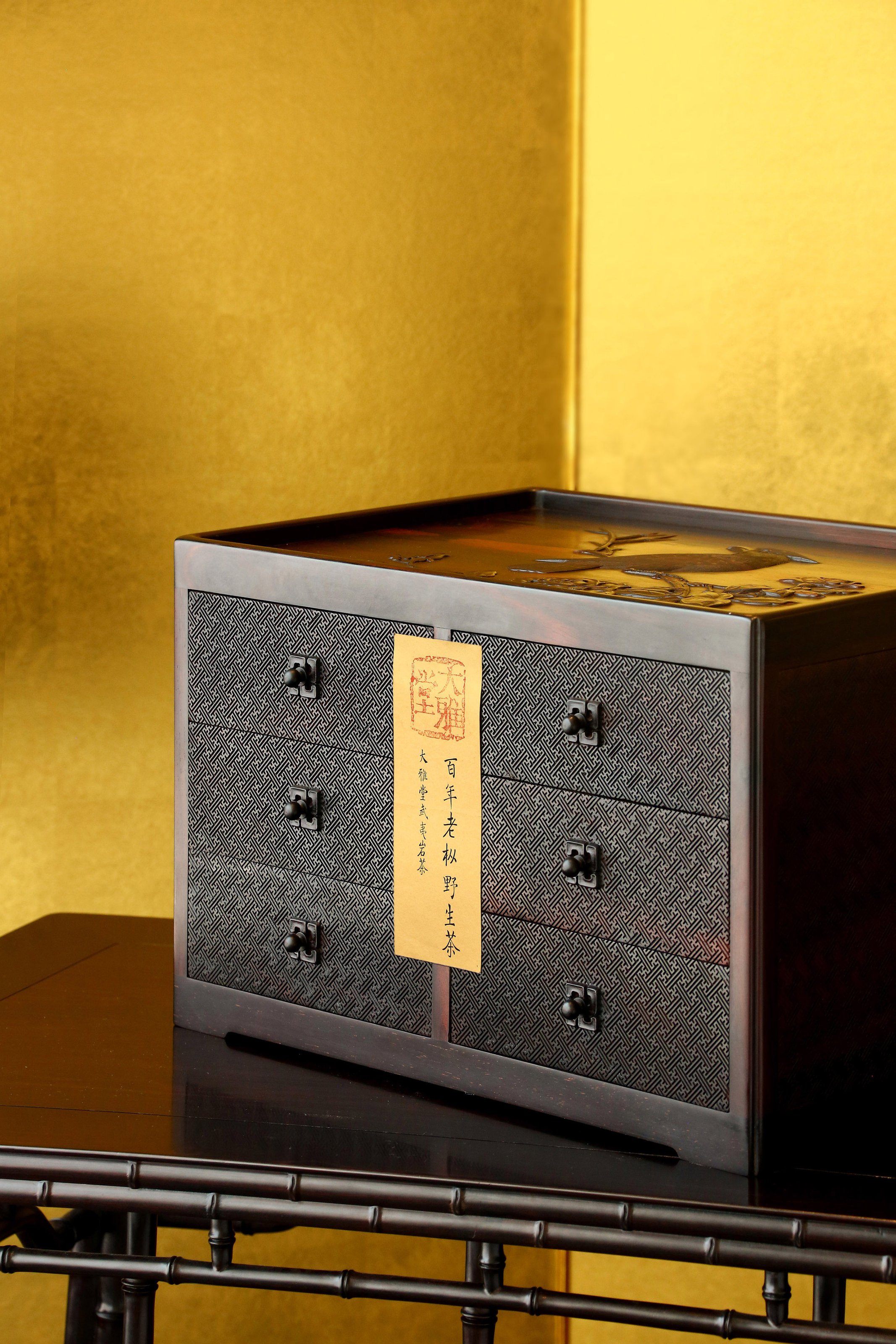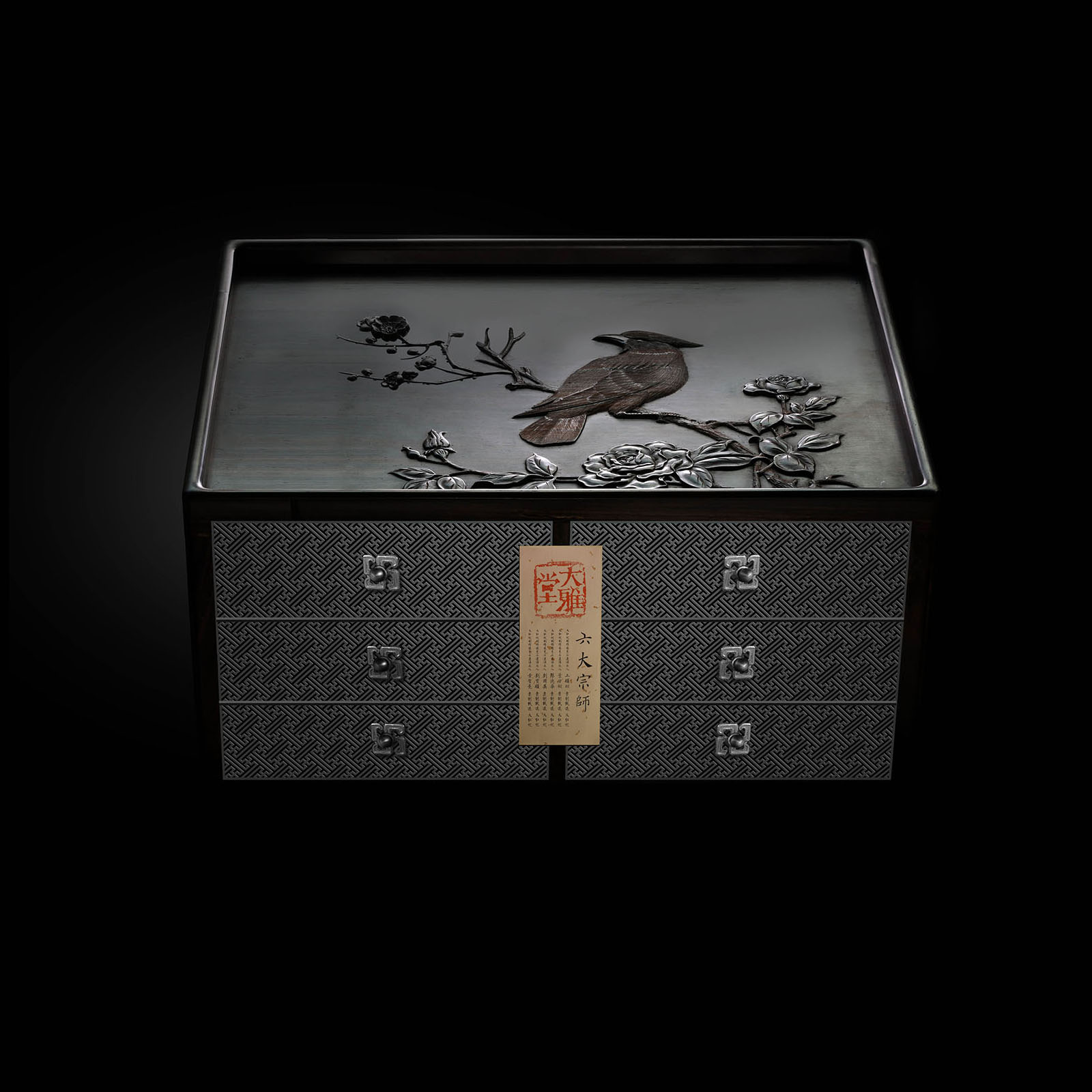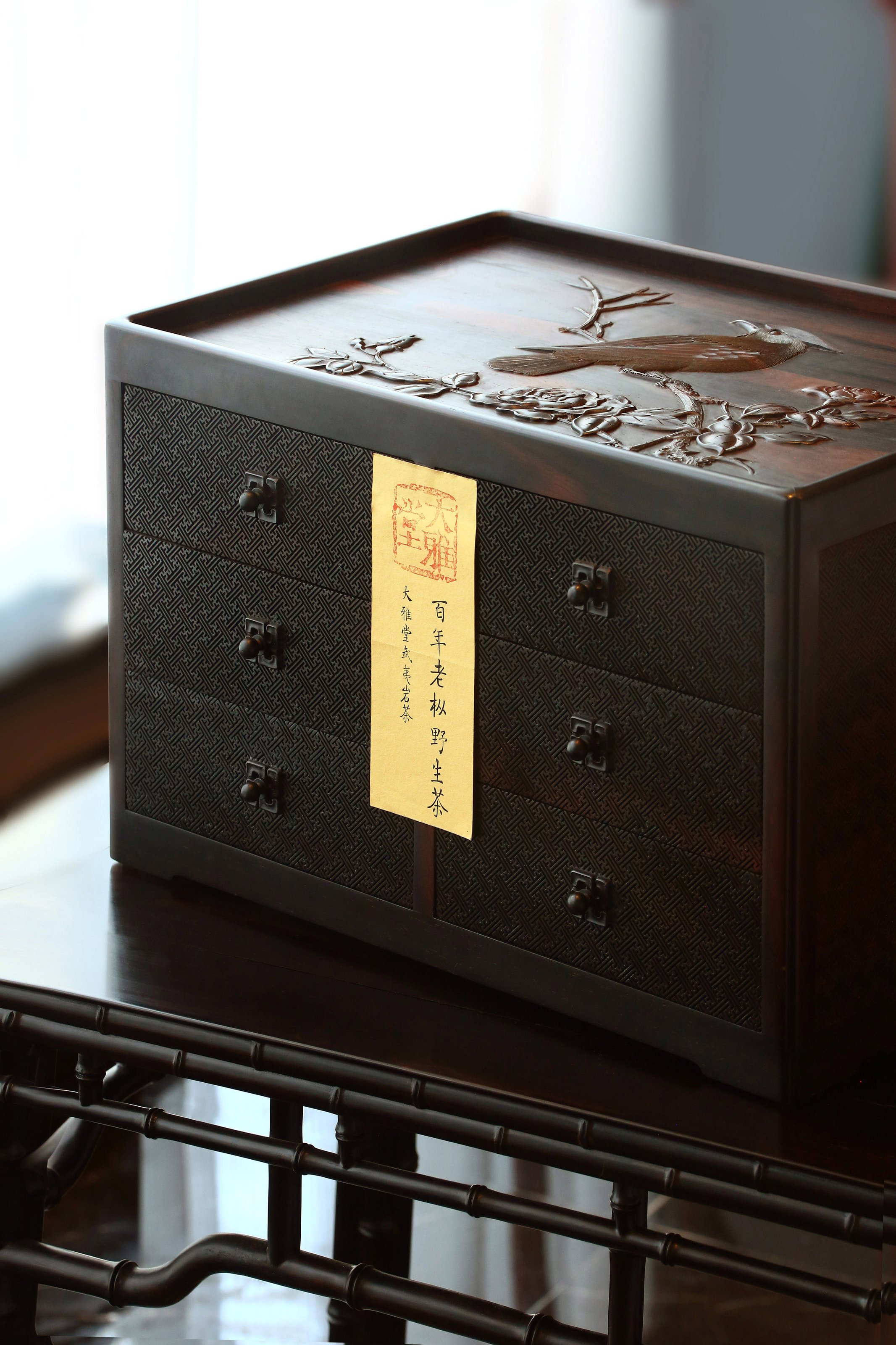 长:45cm,宽:30cm,高:28cm 六屉花鸟丝翎檀雕茶盒 茶盒大叶紫檀制,规整长方形,承四足,边框骨架光素,顶面浮雕戴胜登枝,鸟羽精细,花开饱满,枝叶舒展。立面满铺万字流水纹,均匀细腻,分设六屉,左右各三,以便分类收纳,每屉皆万字纹设钮,纹饰统一,雍容富丽,气韵不凡。