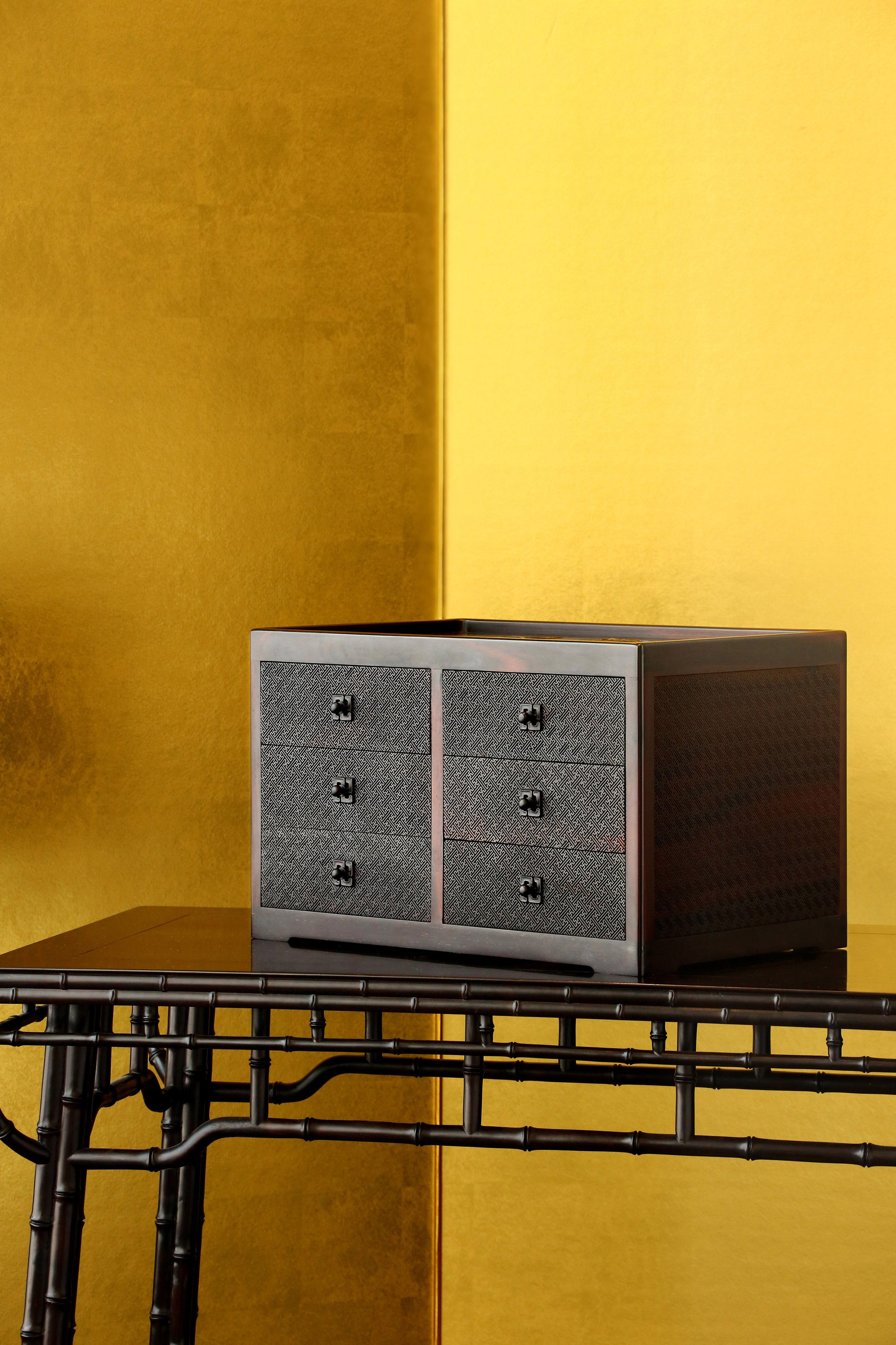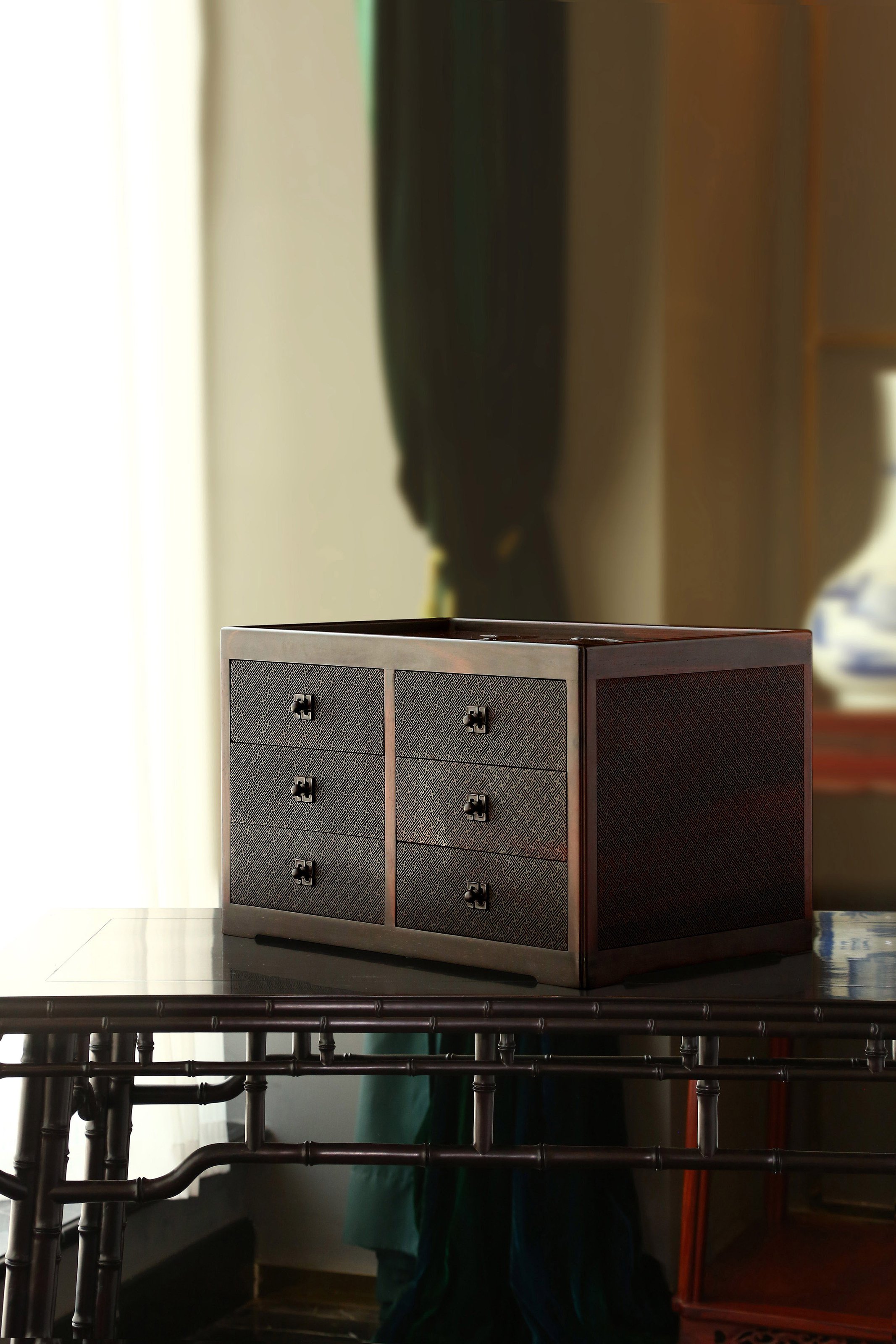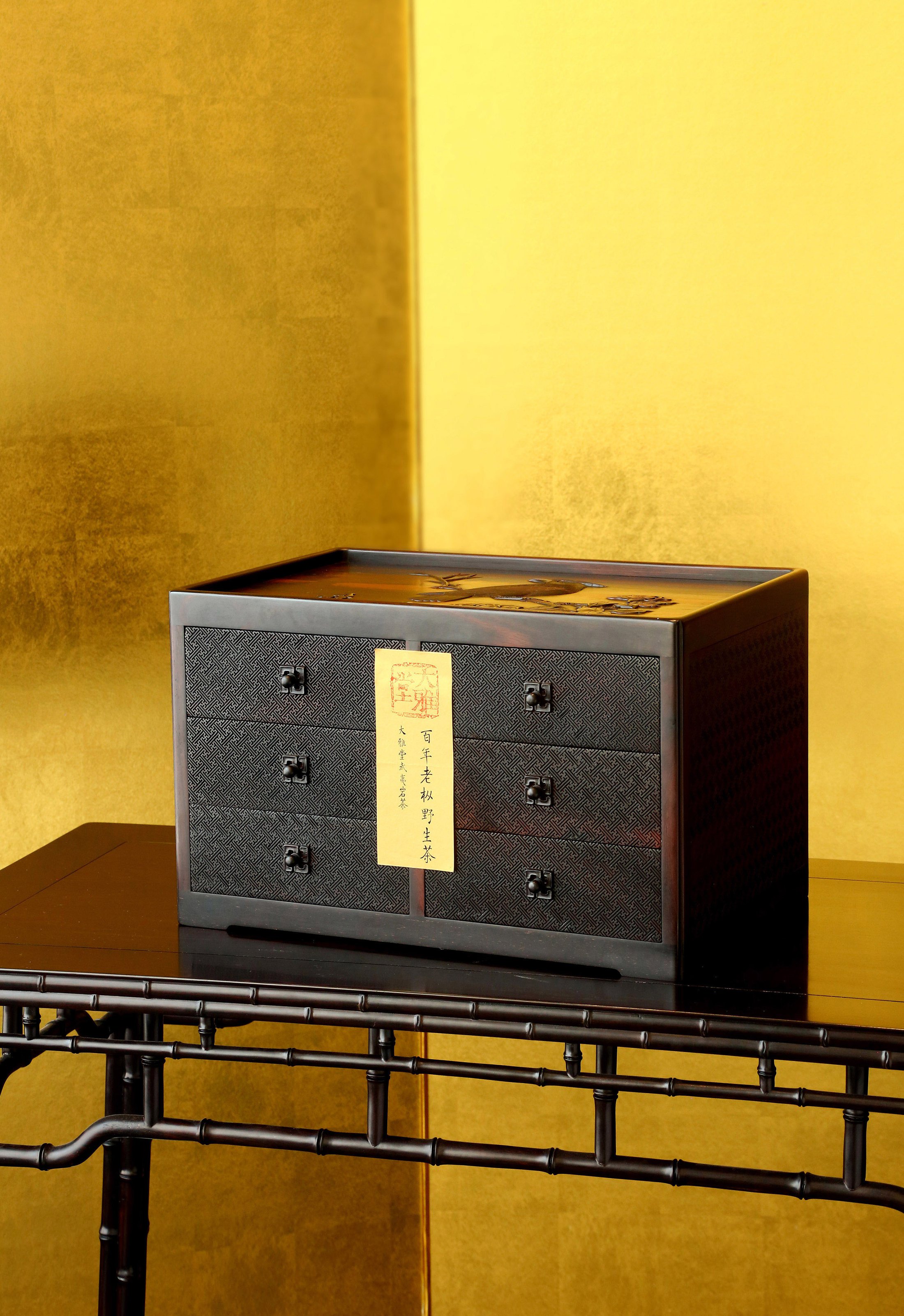 长:45cm,宽:30cm,高:28cm 六屉花鸟丝翎檀雕茶盒 茶盒大叶紫檀制,规整长方形,承四足,边框骨架光素,顶面浮雕戴胜登枝,鸟羽精细,花开饱满,枝叶舒展。立面满铺万字流水纹,均匀细腻,分设六屉,左右各三,以便分类收纳,每屉皆万字纹设钮,纹饰统一,雍容富丽,气韵不凡。