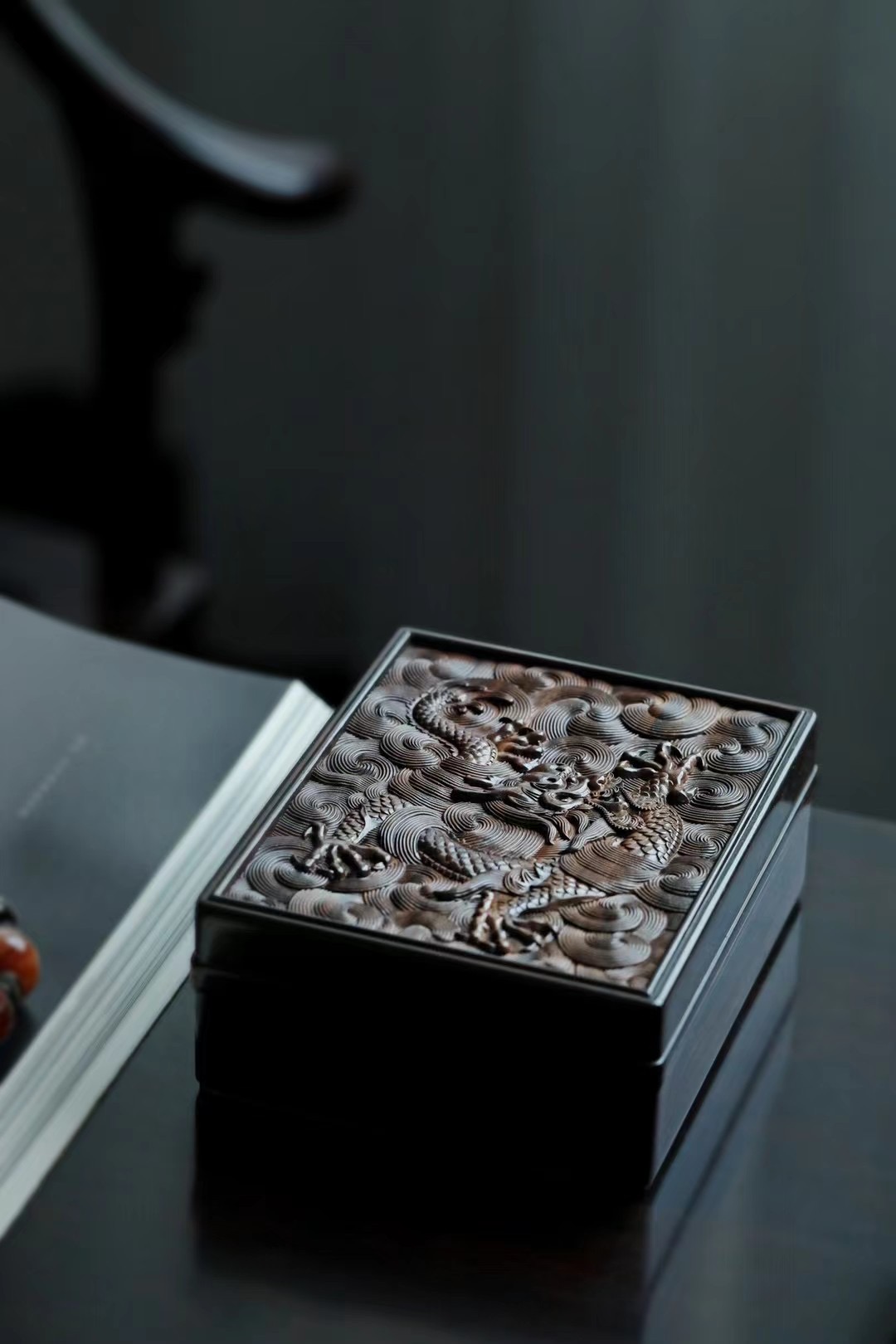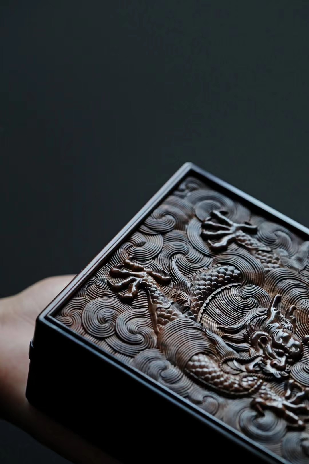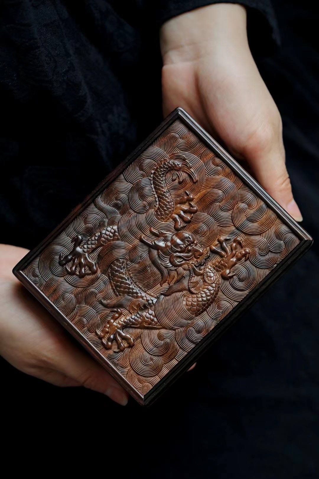 长:14.2cm 宽:11.6cm 厚度:5.6cm材料:紫光檀 龙腾万里茶盒|紫光檀 苍龙腾云,非云足不踏,举则冲天翔,雕刻栩栩如生, 祥云纹环绕,繁而不乱,文房茶室雅物。 尺寸:长14.2cm 宽11.6cm 厚度5.6cm
