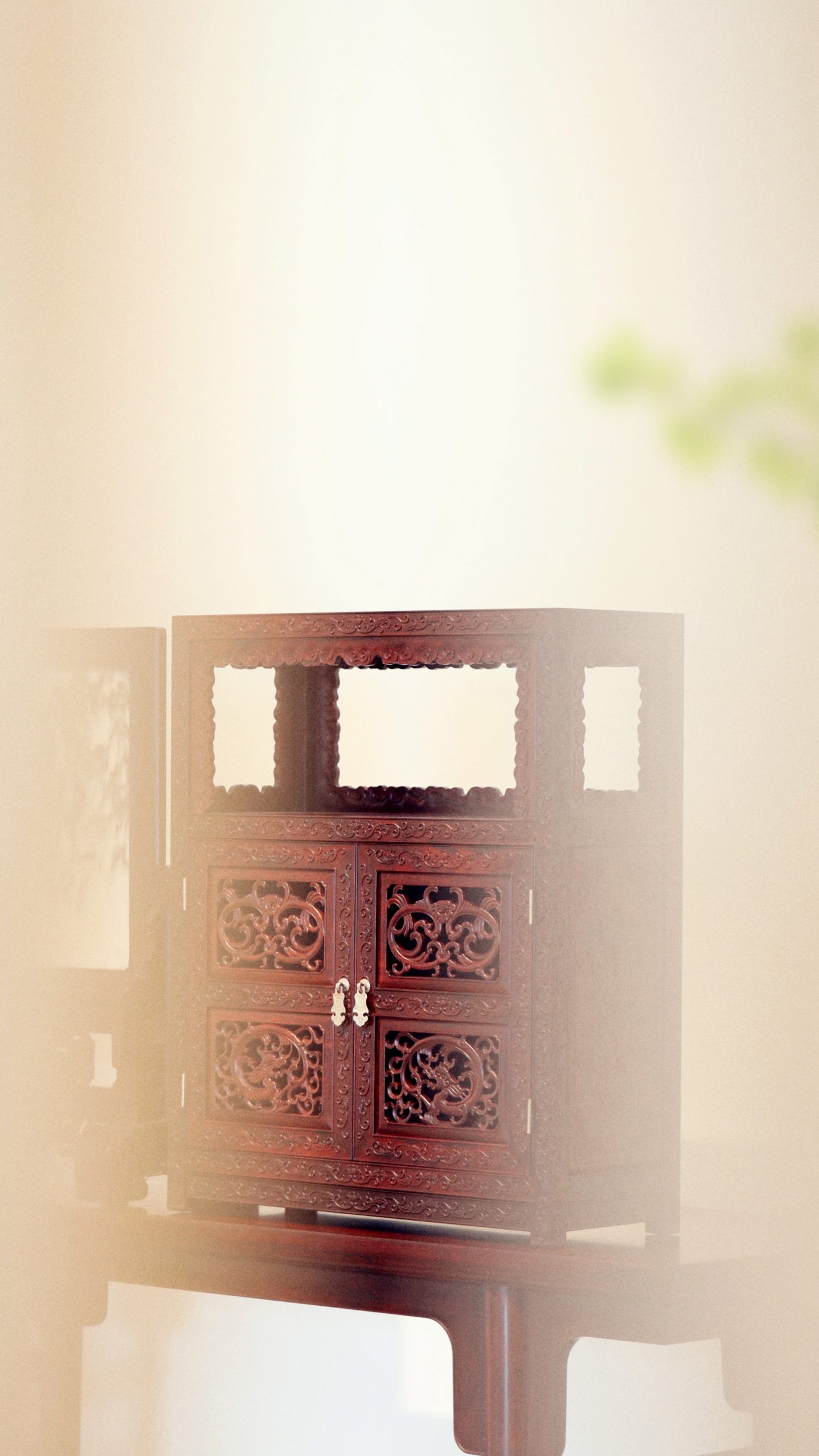 高:60cm 宽:50cm 厚度:20cm 小叶紫檀 |透雕夔龙纹方角柜 高:60cm 宽:50cm 厚度:20cm 经典复刻,此柜所有边框均打洼,双门中间有立栓,扇门透雕对称的双螭龙纹,侧边雕西番莲纹,此柜器型端庄,细节十分丰富,做工细腻,整体上梳下密的设计格局,线条丰富,生动灵活。