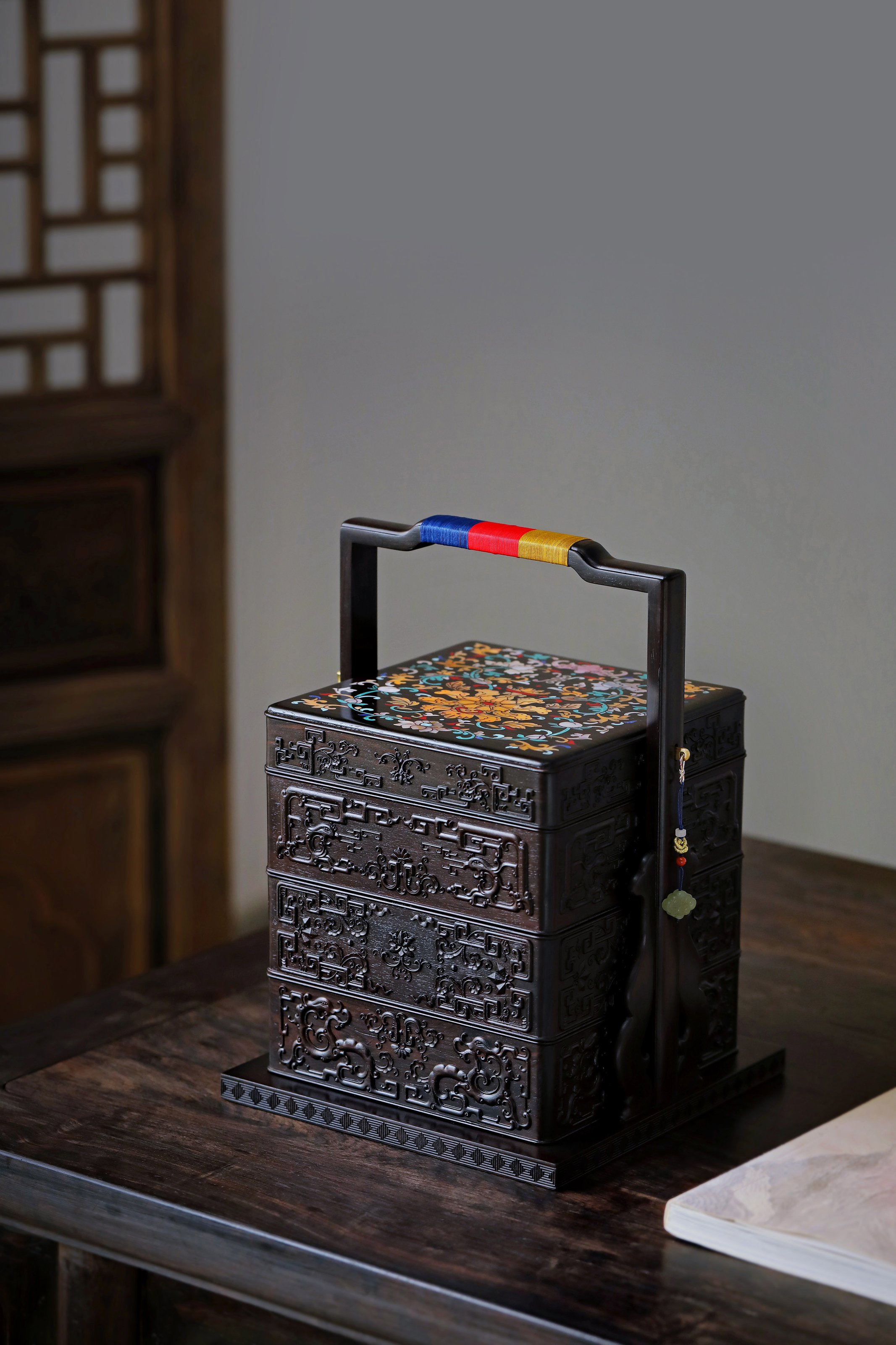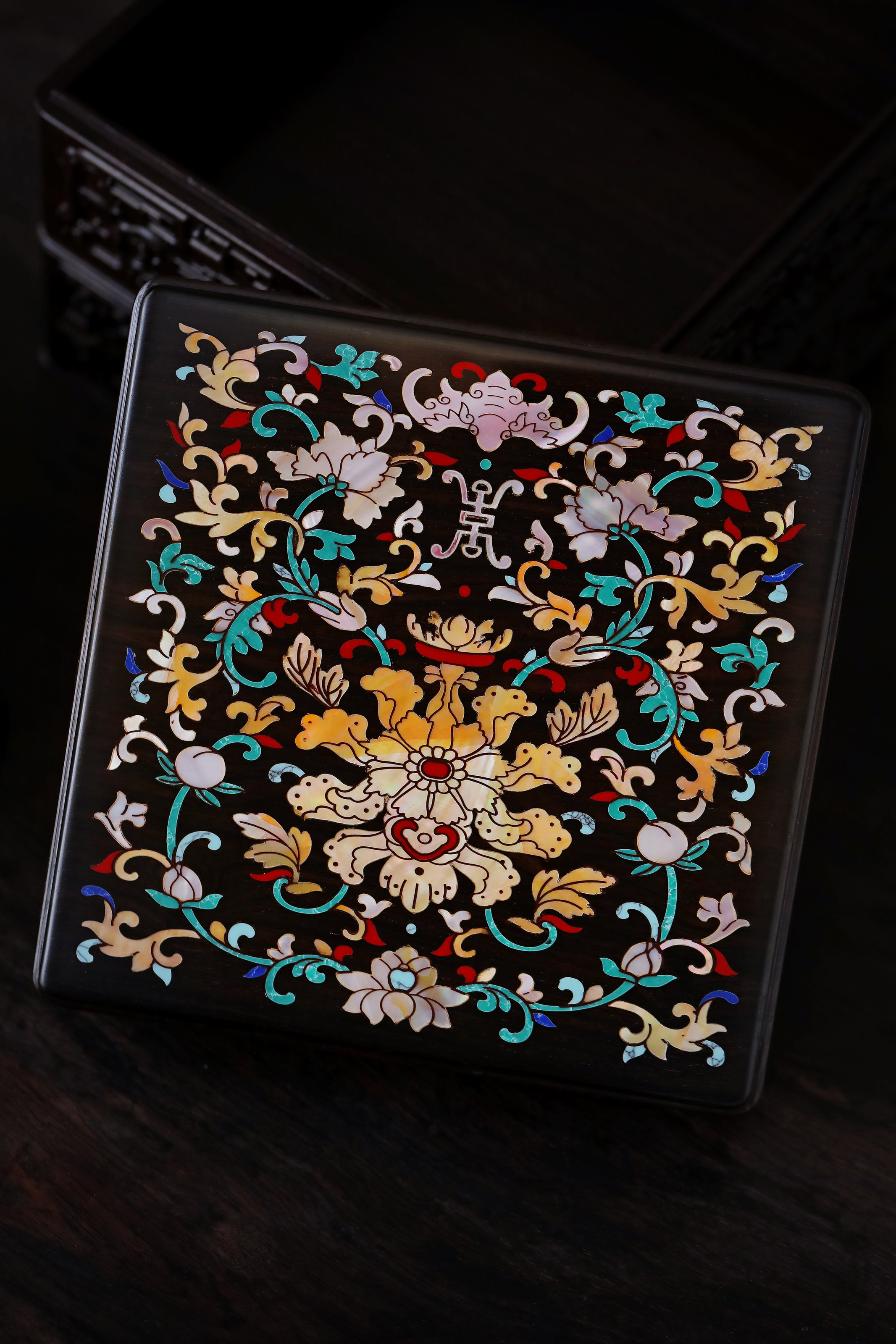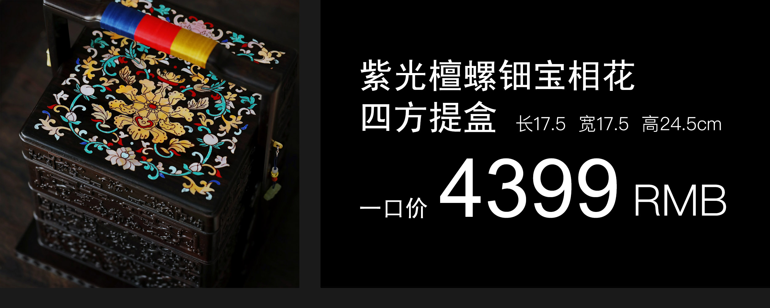 紫光檀 螺钿宝相花四方提盒 长17.5宽17.5高24.5cm 紫光檀榫卯制器,细腻高密度材质满雕螭龙兽纹;盒盖镶嵌螺钿宝相花、缠枝纹,吉祥如意; 三层设计,可作茶席之上存茶点之用。 紫光檀 螺钿宝相花四方提盒