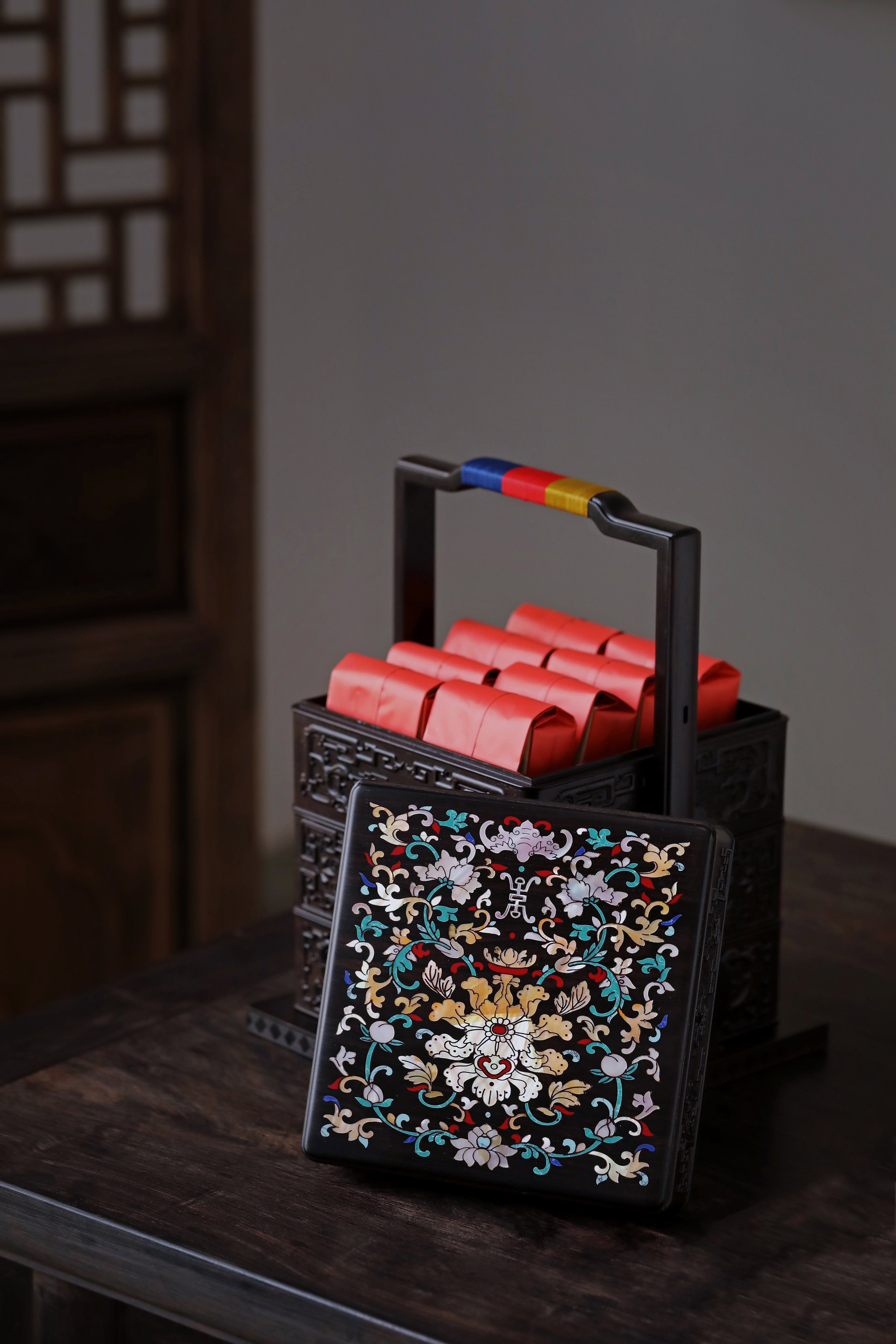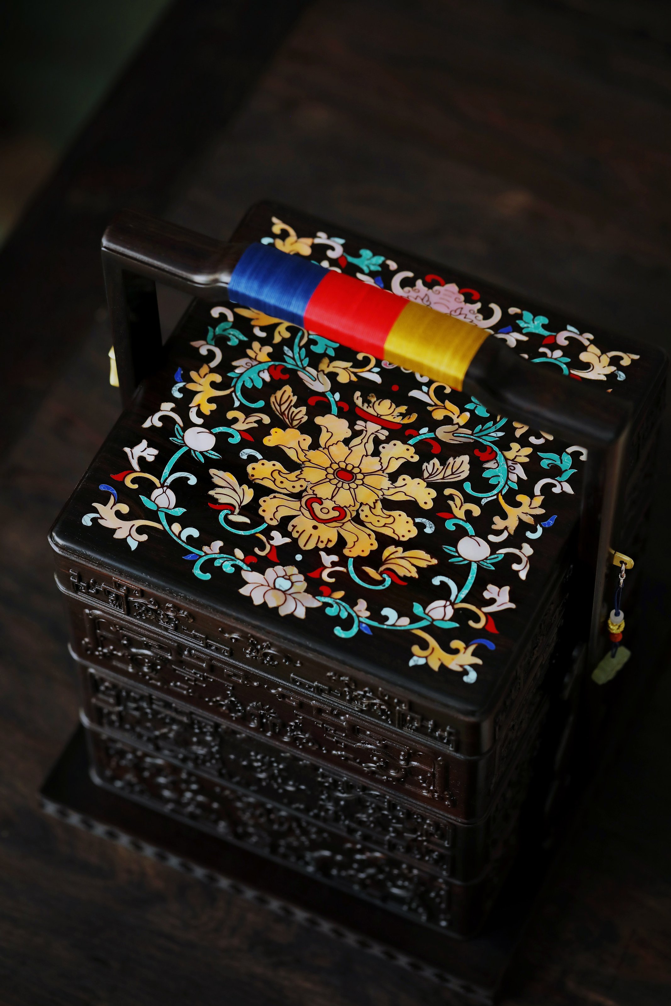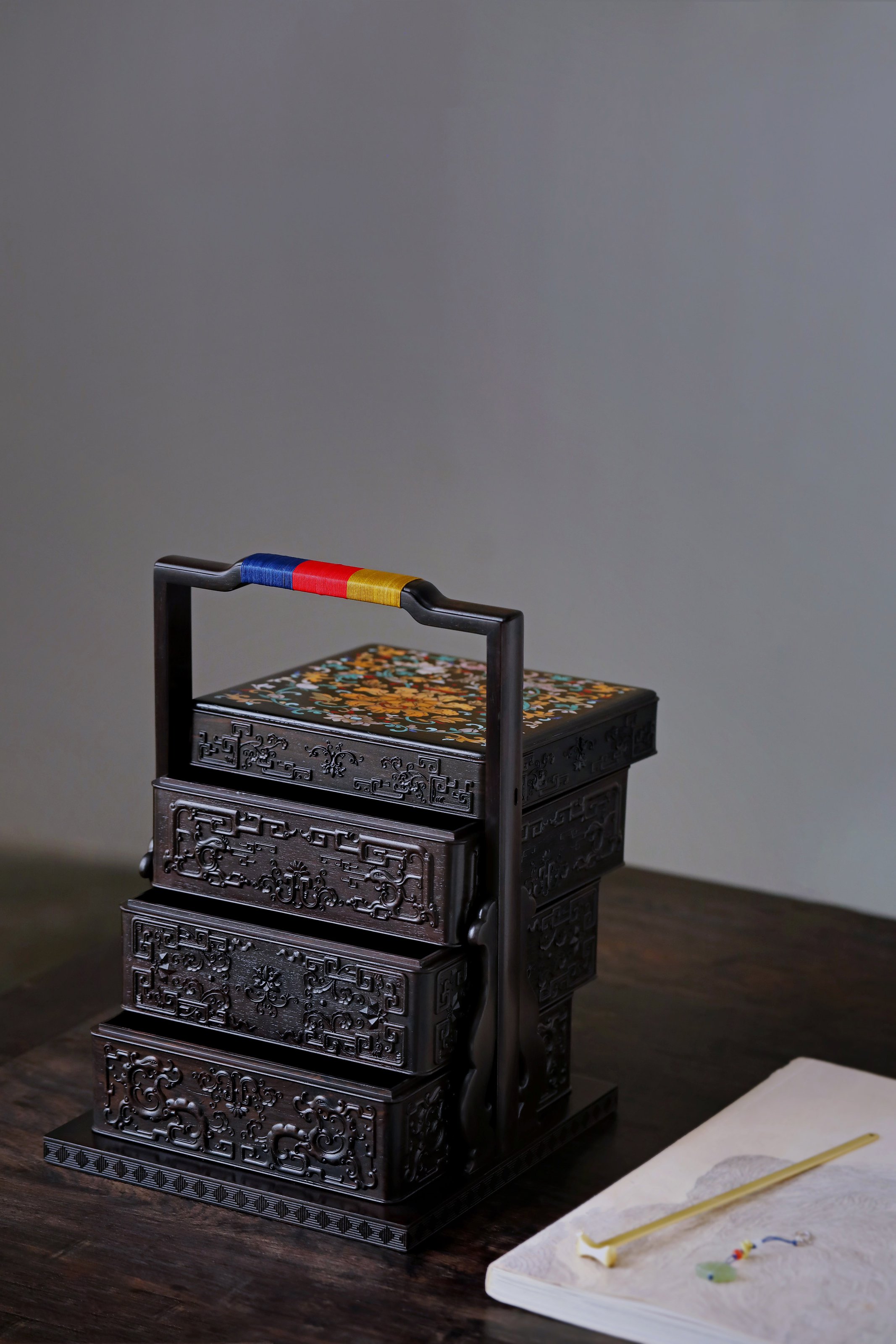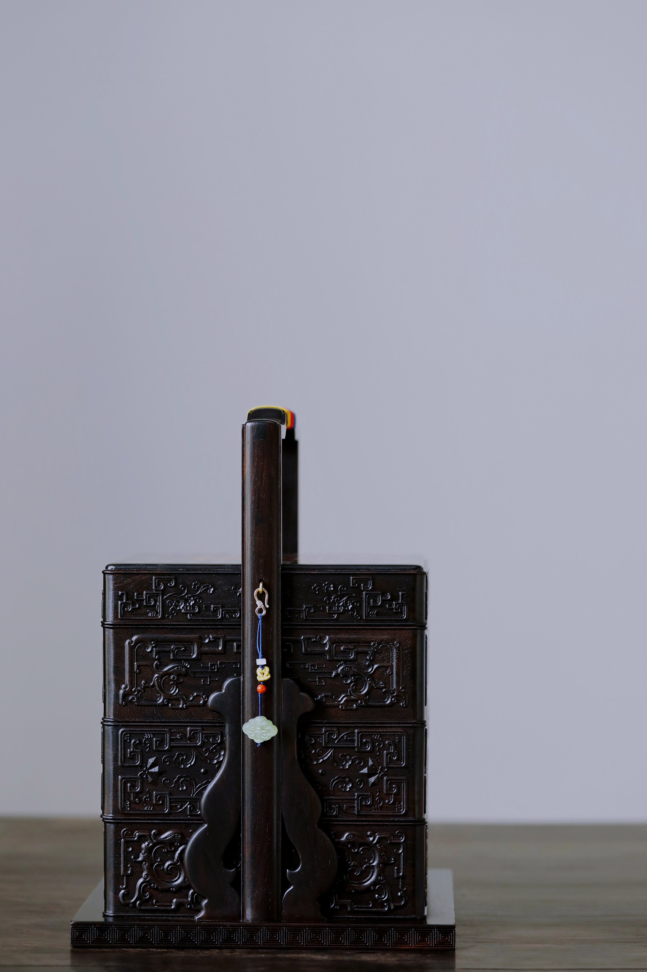 紫光檀 螺钿宝相花四方提盒 长17.5宽17.5高24.5cm 紫光檀榫卯制器,细腻高密度材质满雕螭龙兽纹;盒盖镶嵌螺钿宝相花、缠枝纹,吉祥如意; 三层设计,可作茶席之上存茶点之用。 紫光檀 螺钿宝相花四方提盒