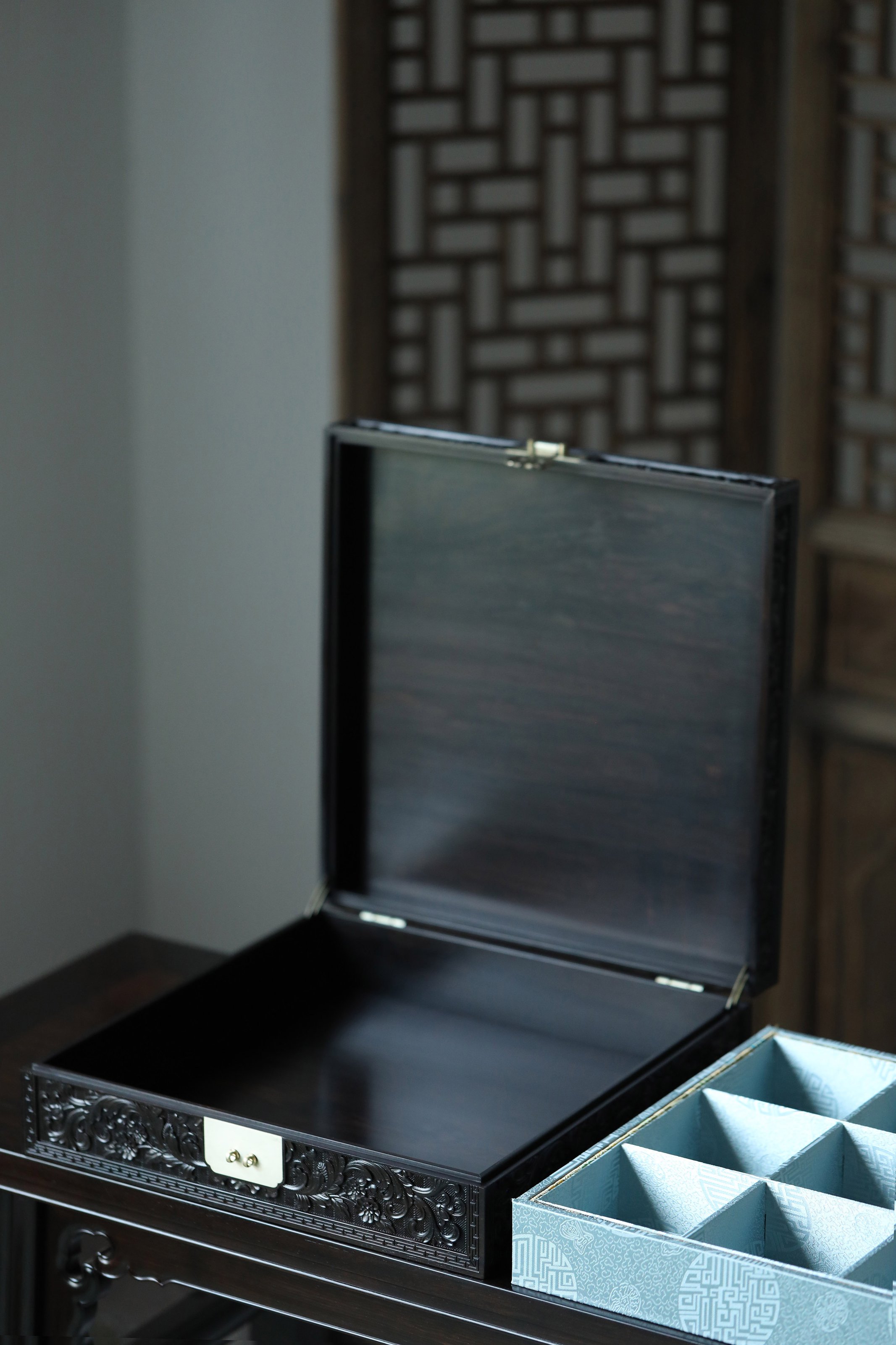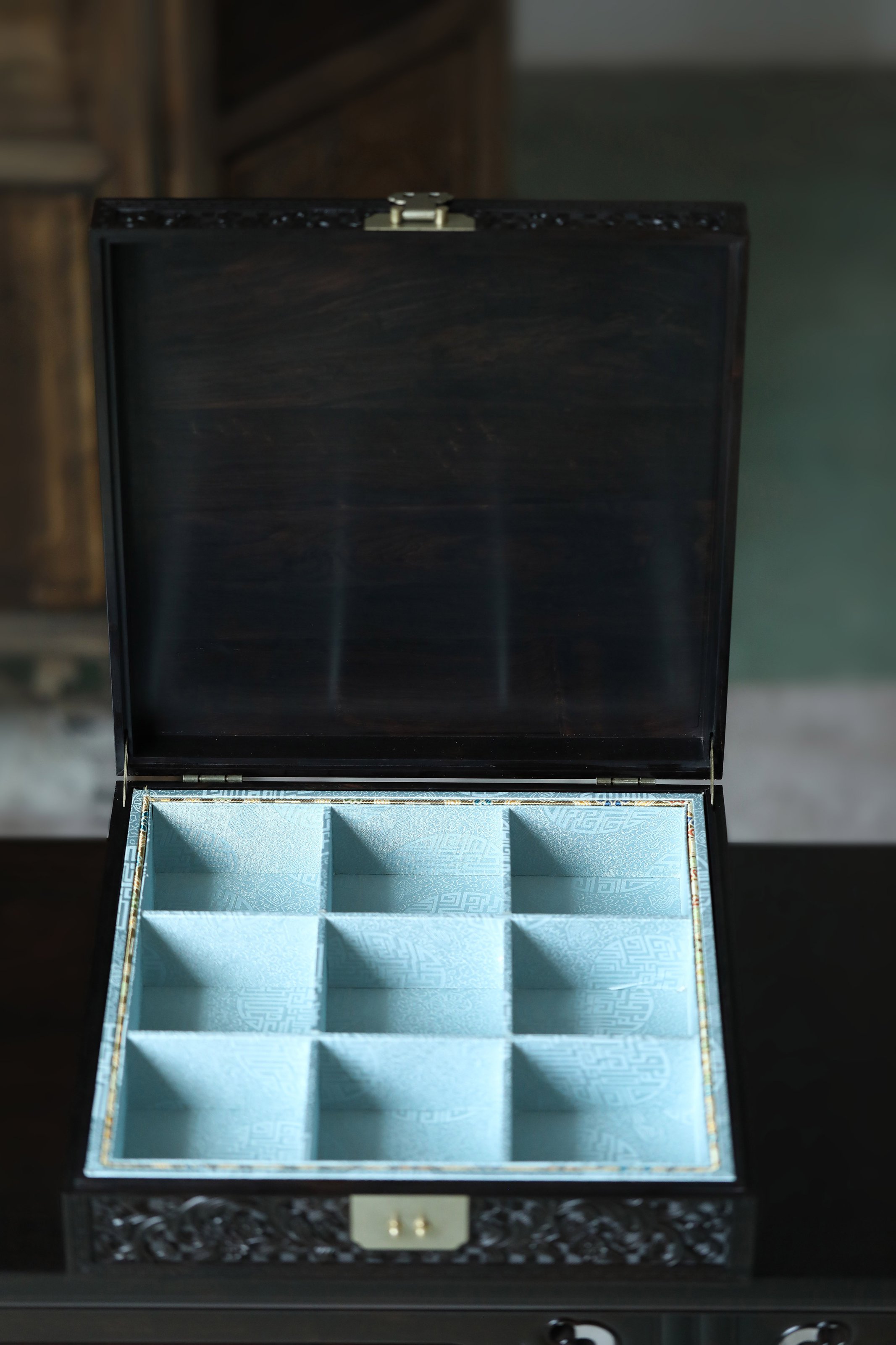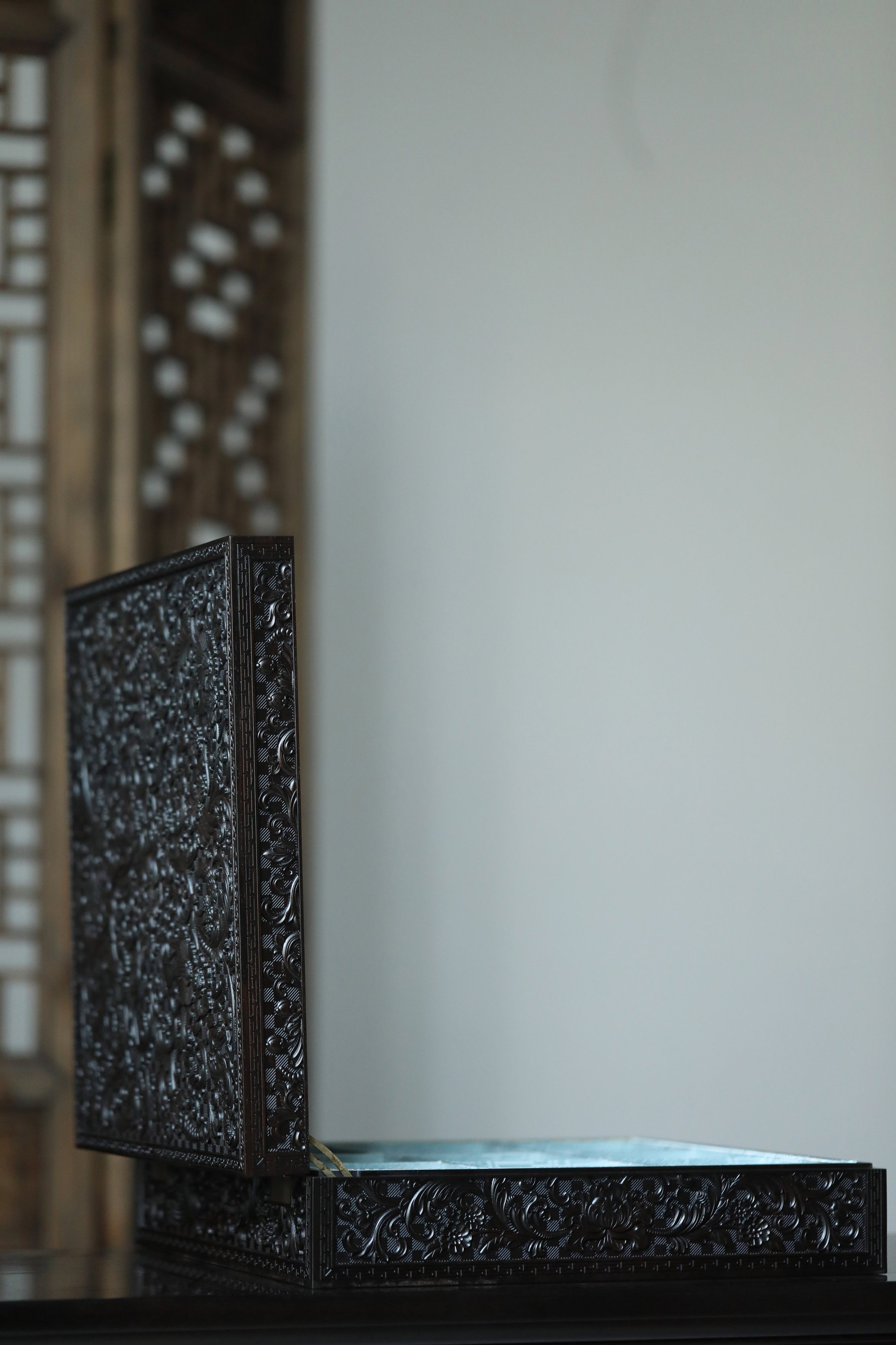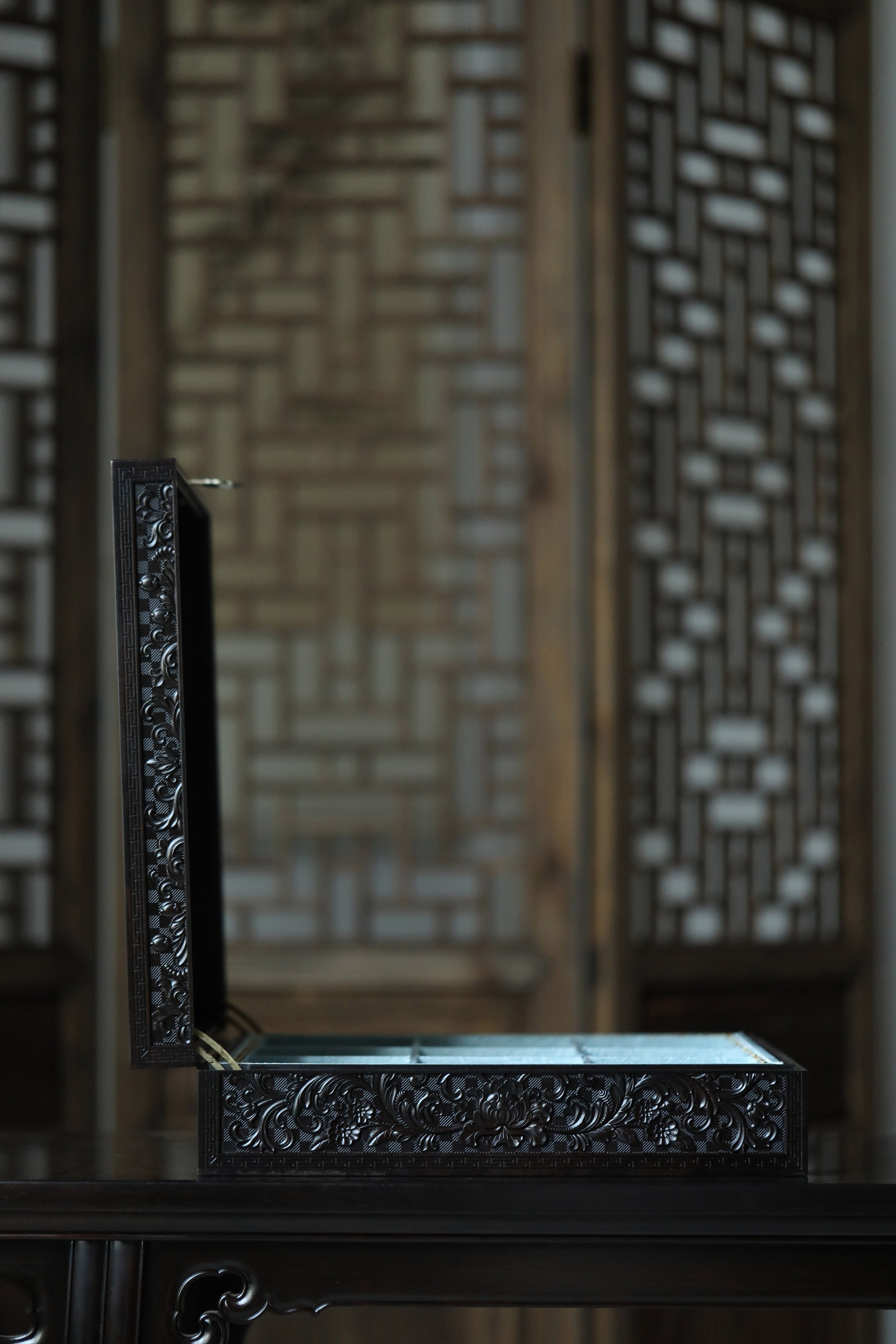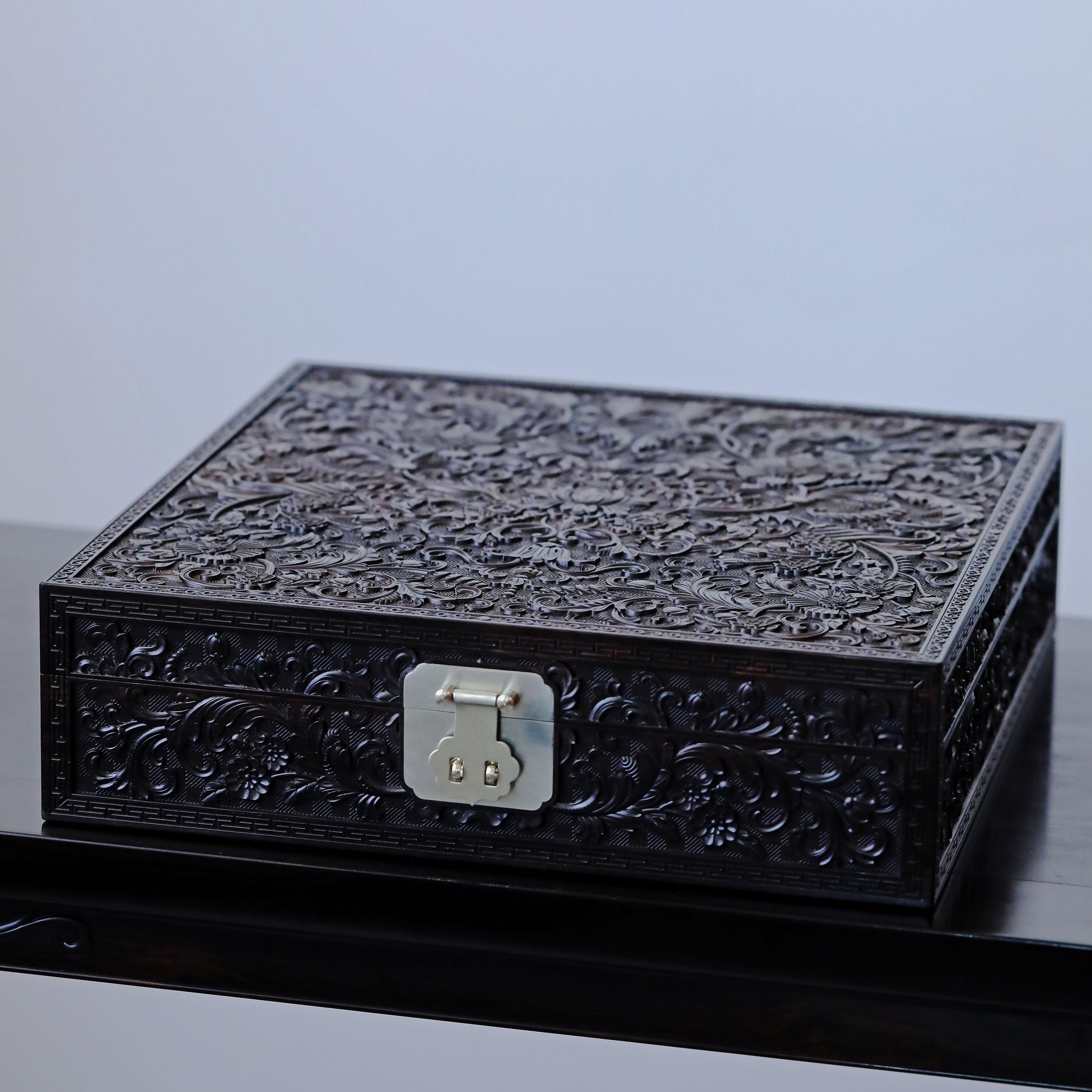 紫光檀料质润泽,周身满雕西番莲纹,莲姿生动,精致华丽,整器方正尊贵奢华。内设小格,满目琳琅,可藏心爱之物。