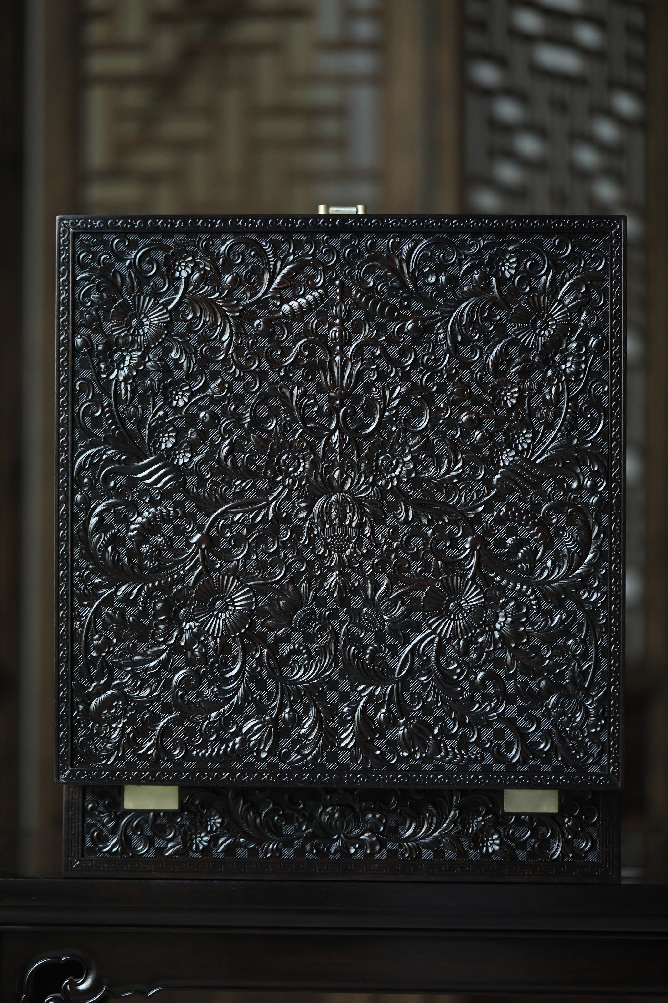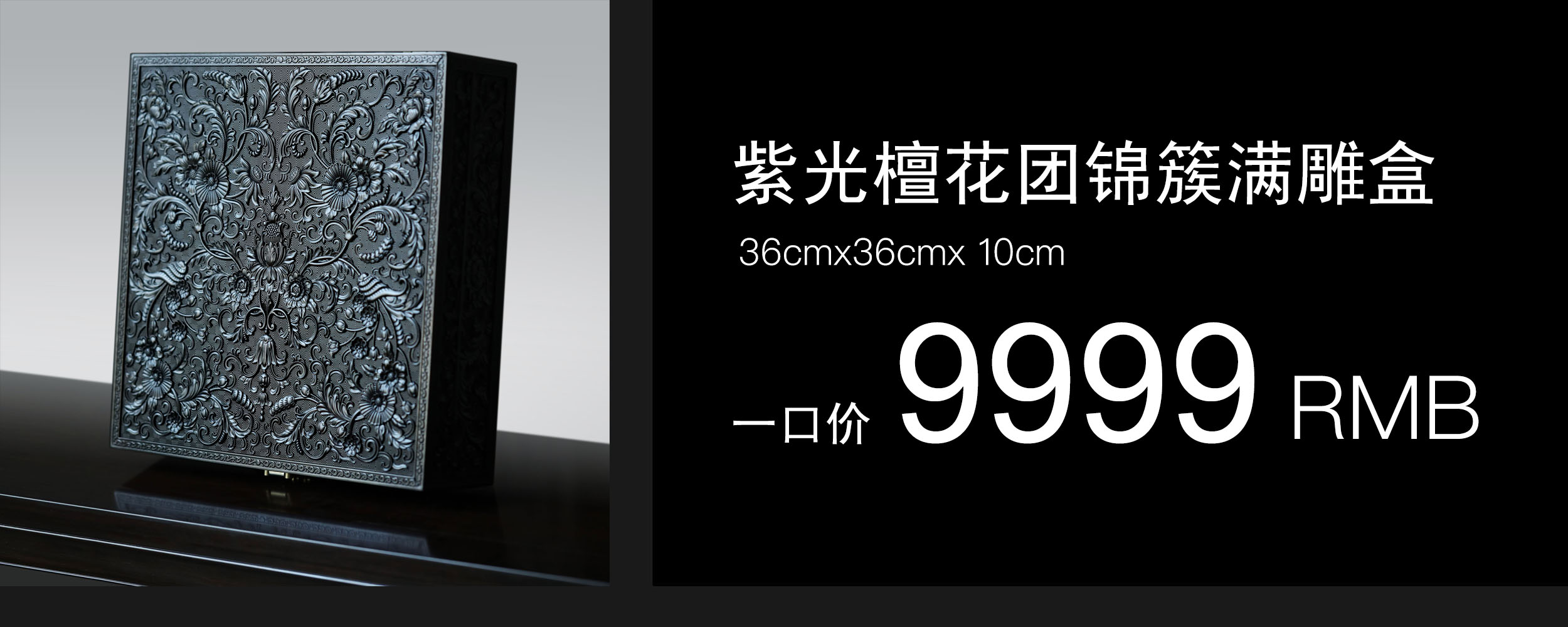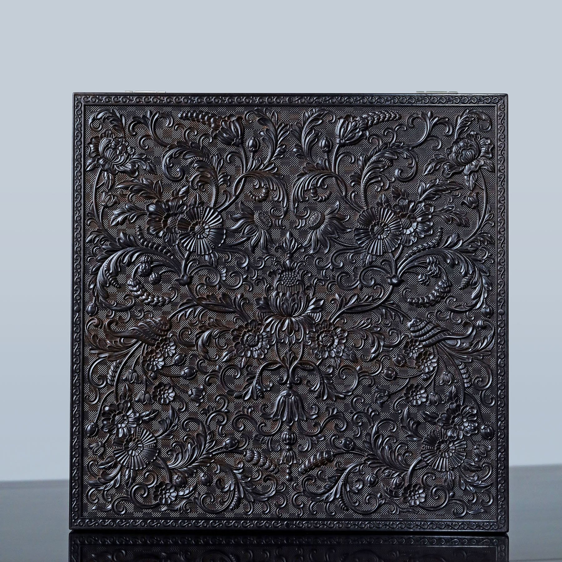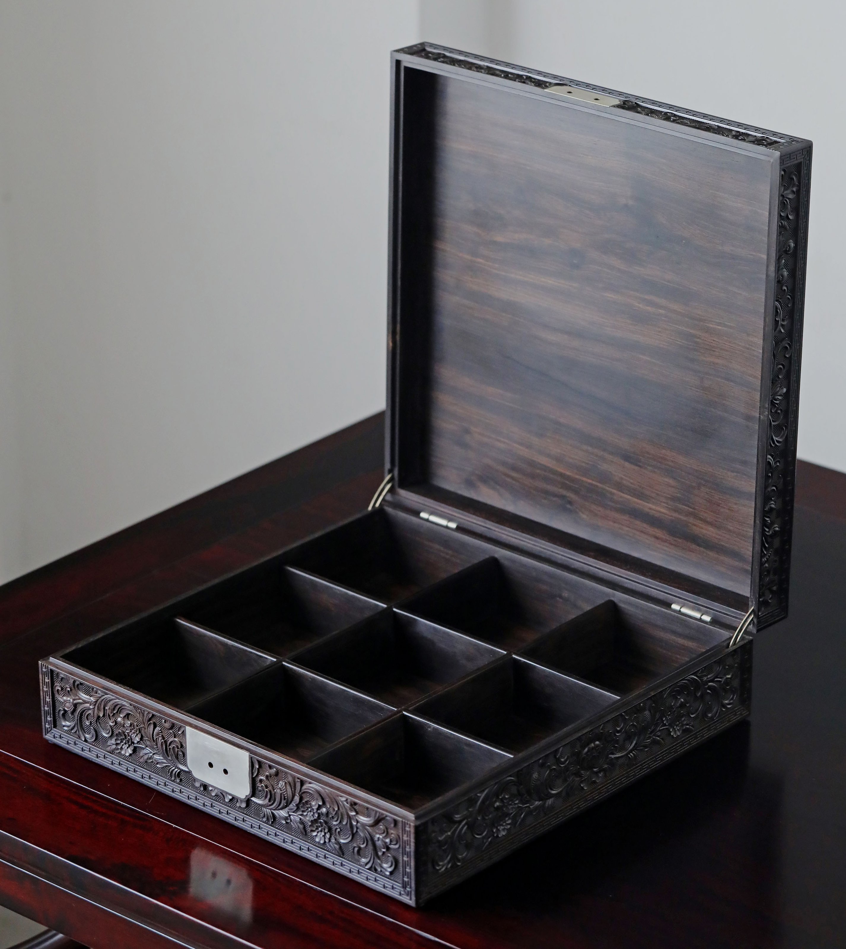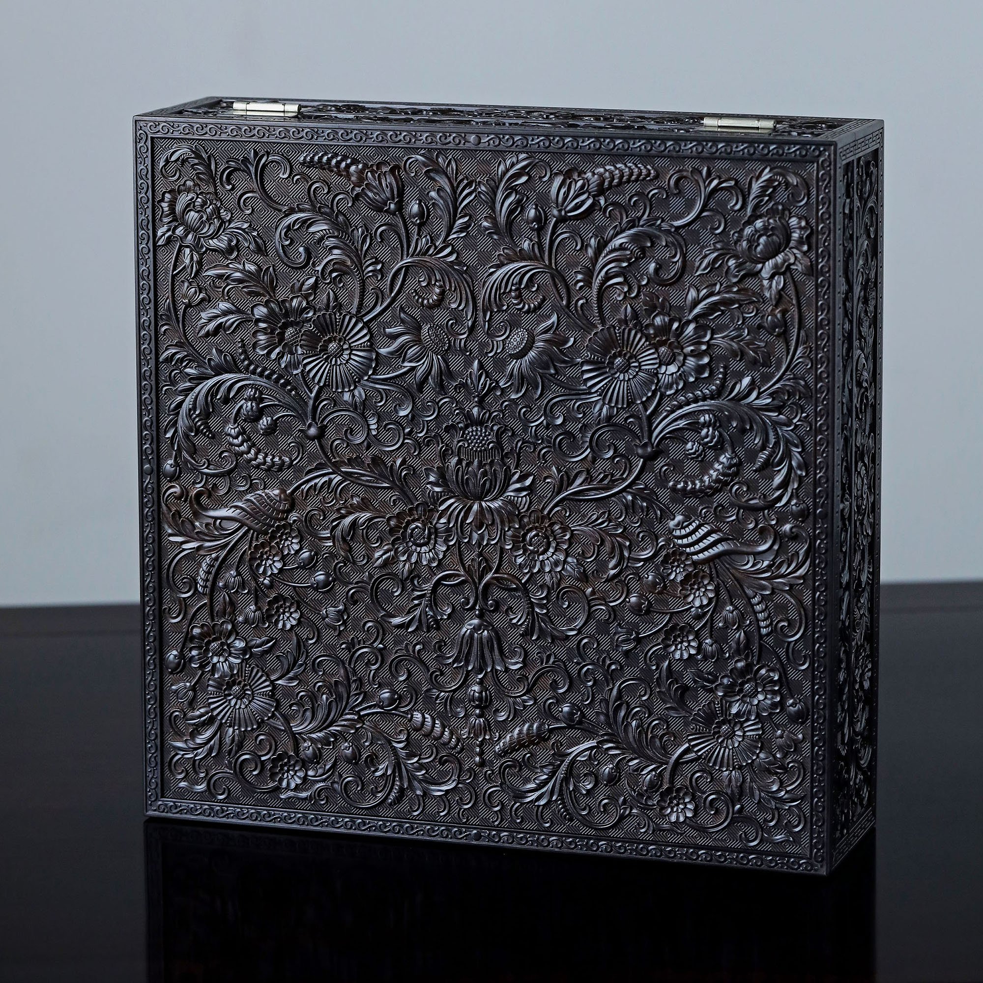紫光檀料质润泽,周身满雕西番莲纹,莲姿生动,精致华丽,整器方正尊贵奢华。内设小格,满目琳琅,可藏心爱之物。