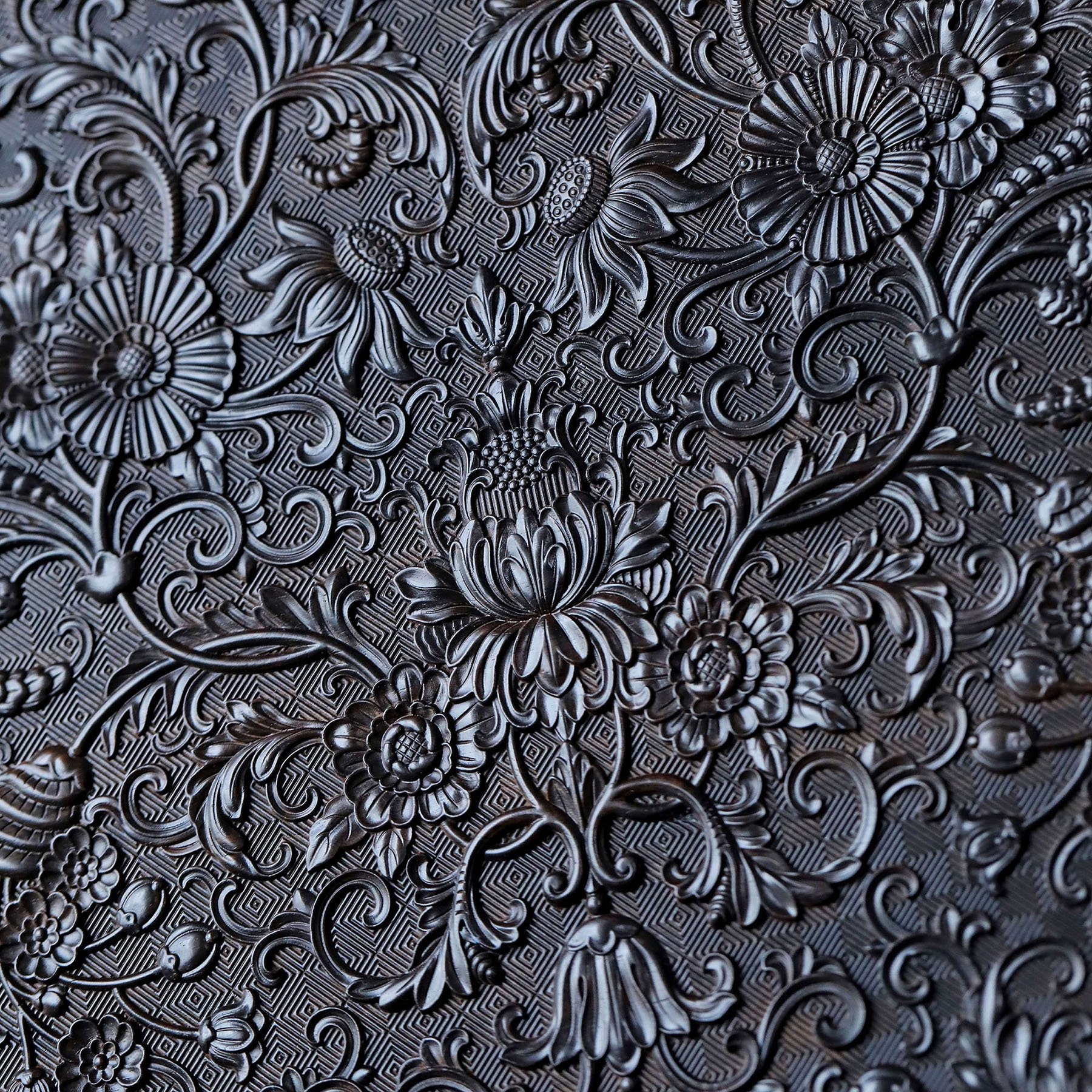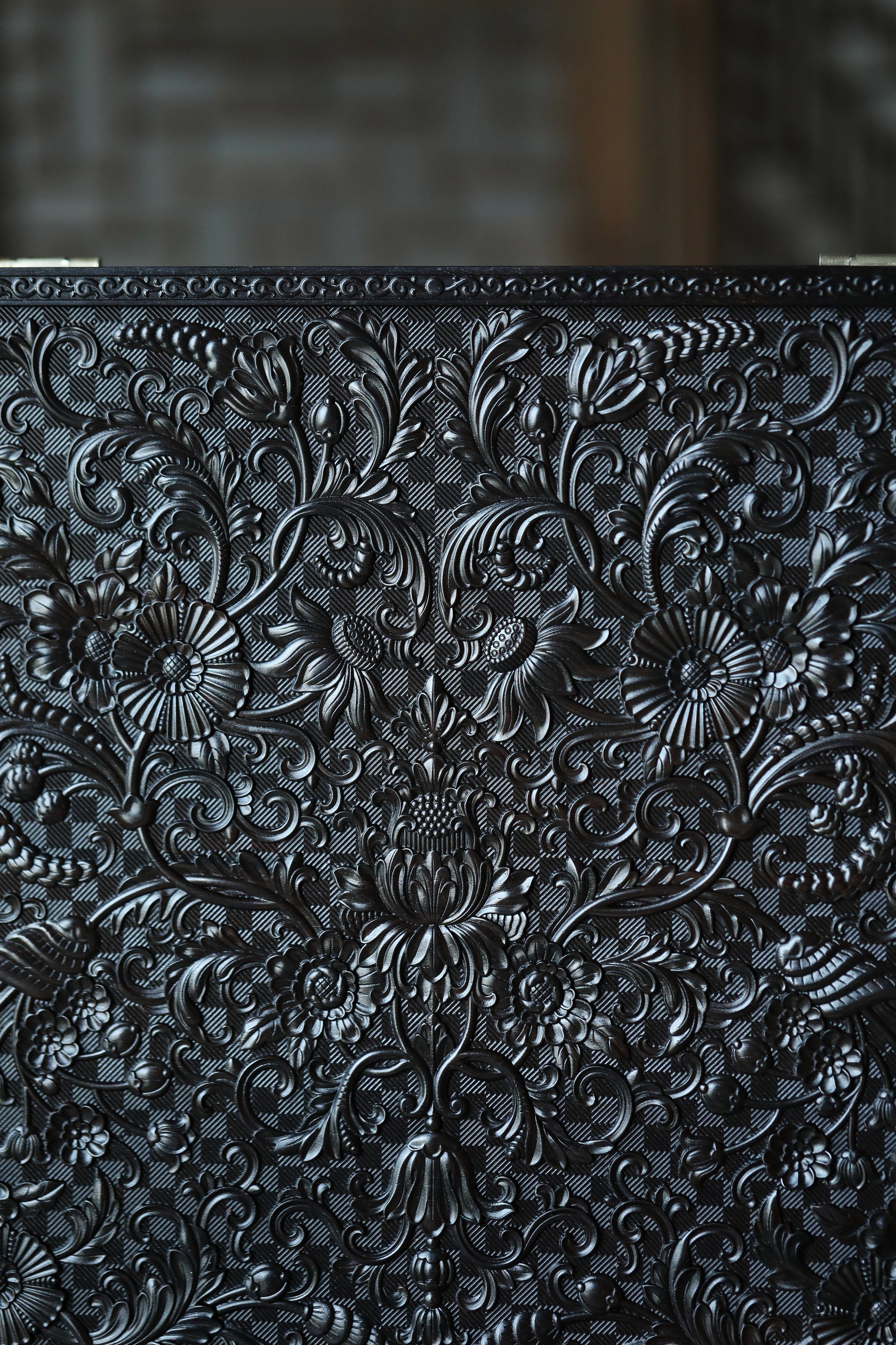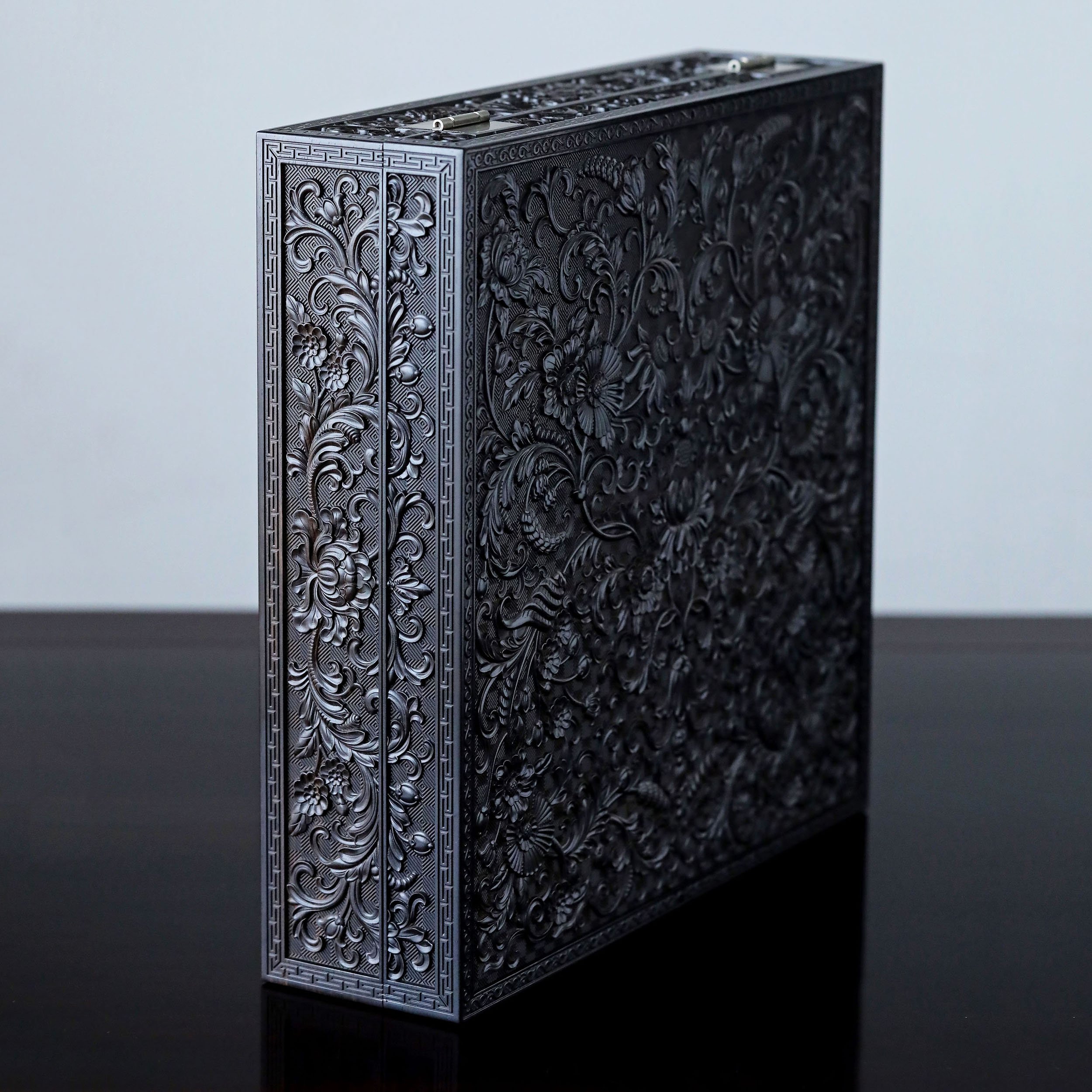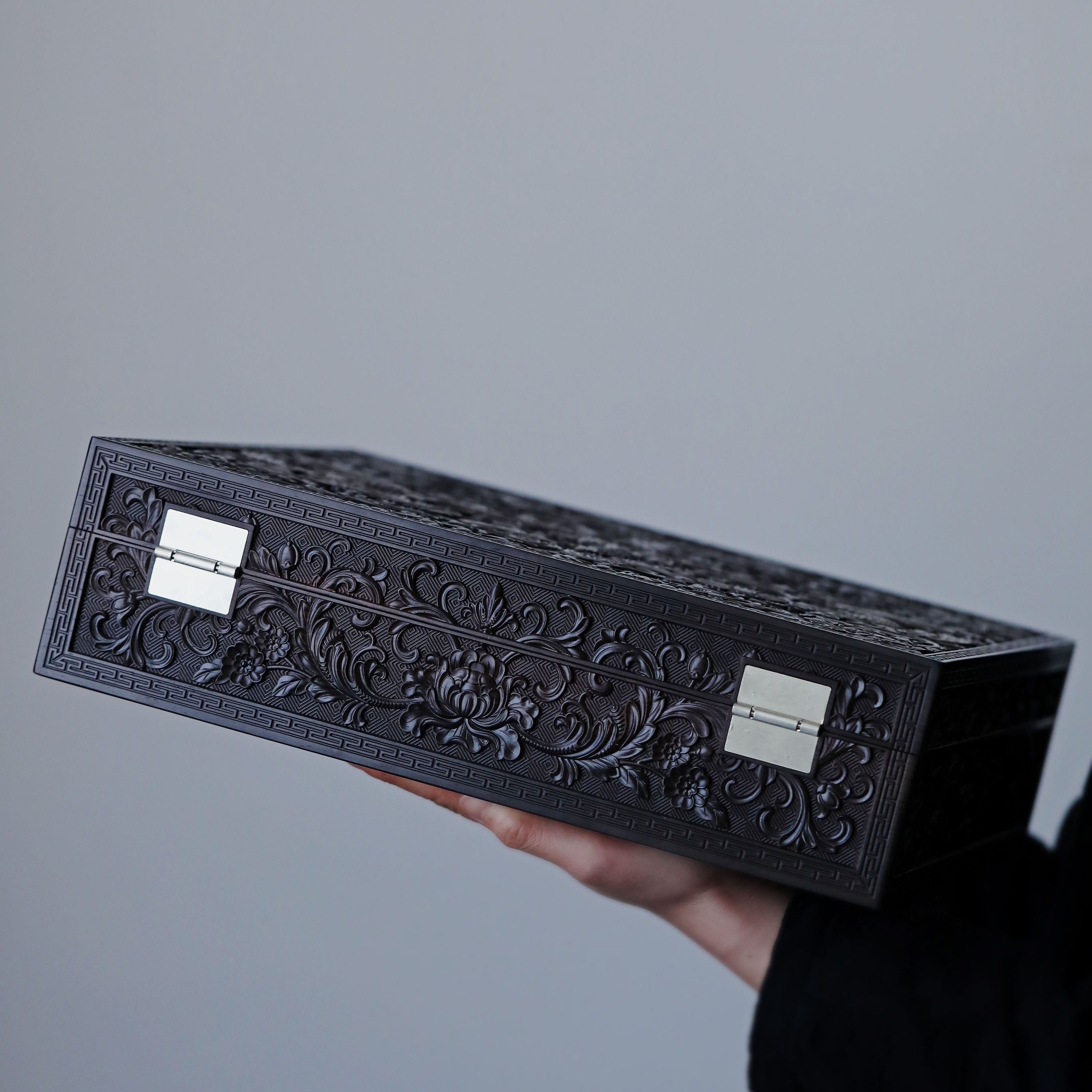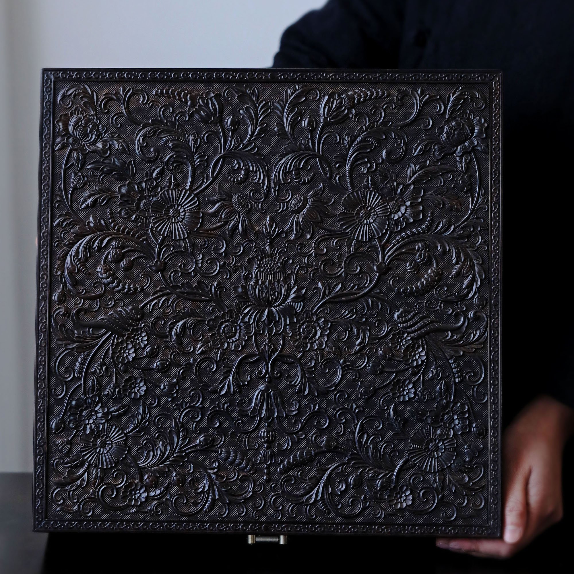 紫光檀料质润泽,周身满雕西番莲纹,莲姿生动,精致华丽,整器方正尊贵奢华。内设小格,满目琳琅,可藏心爱之物。