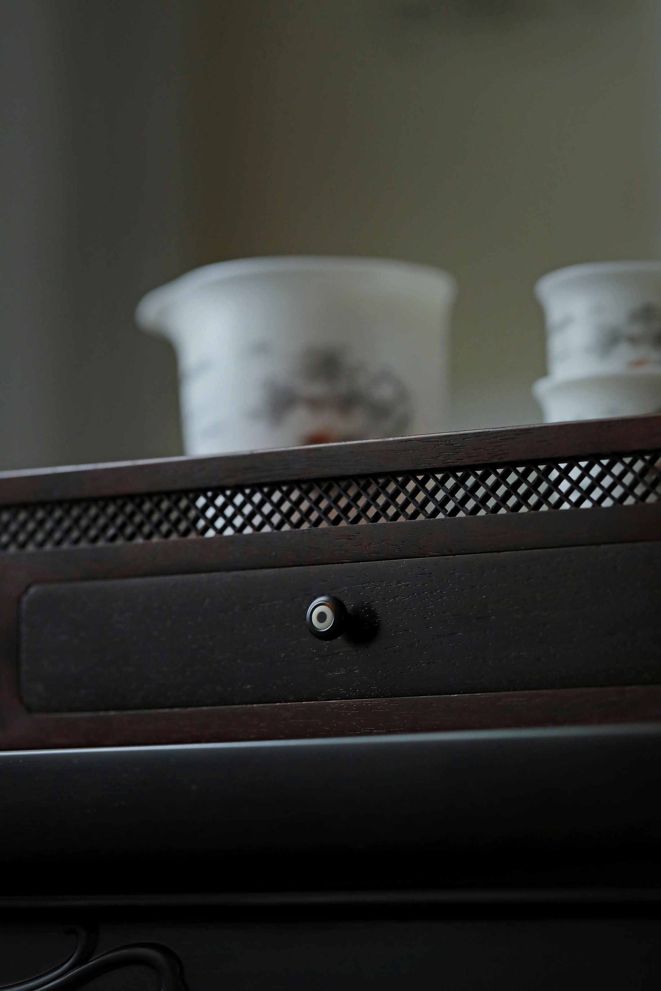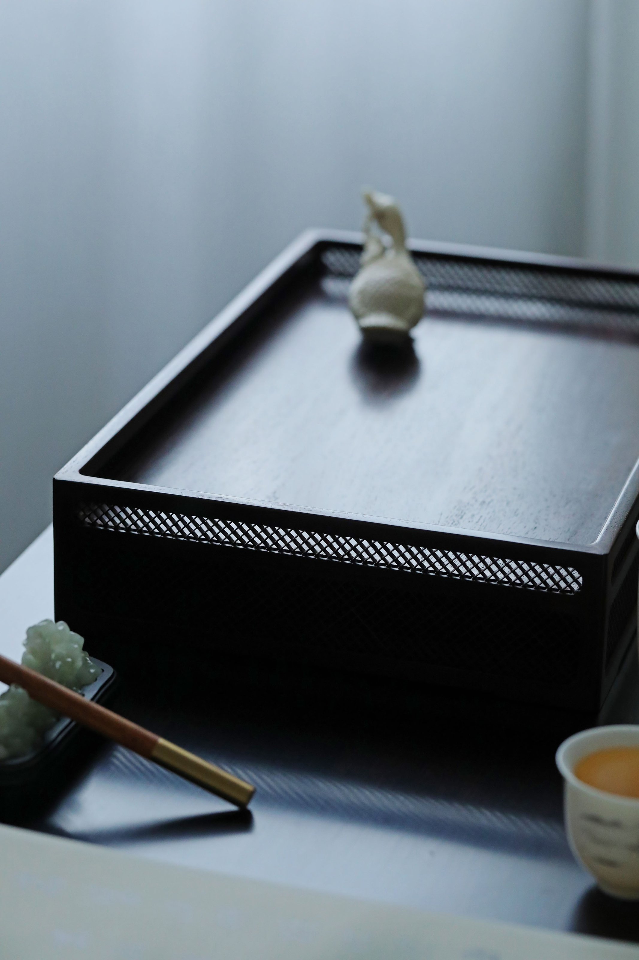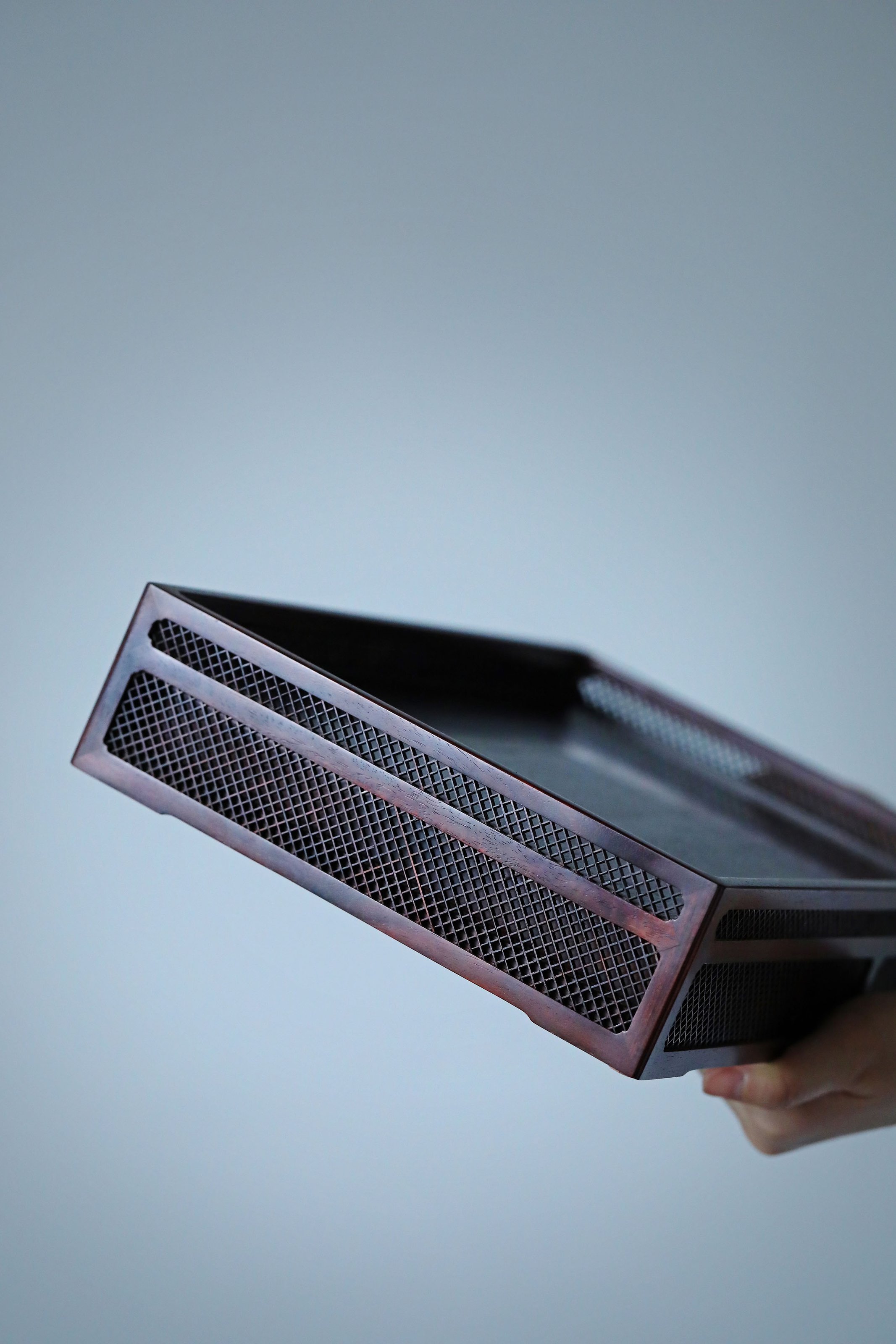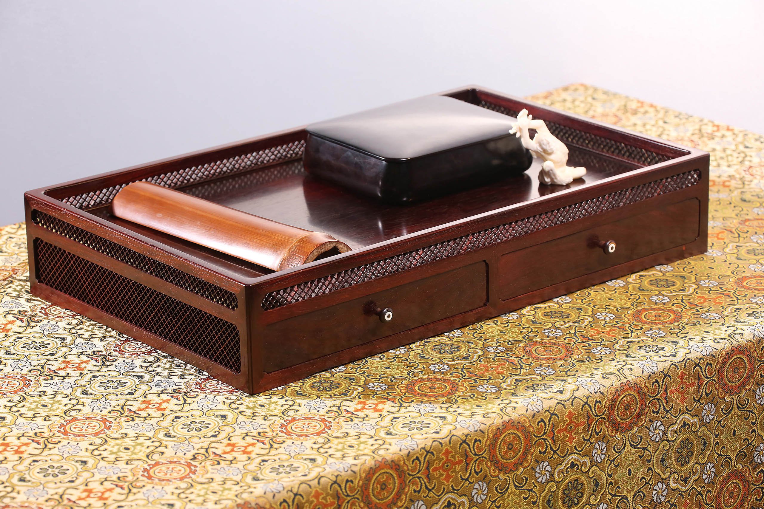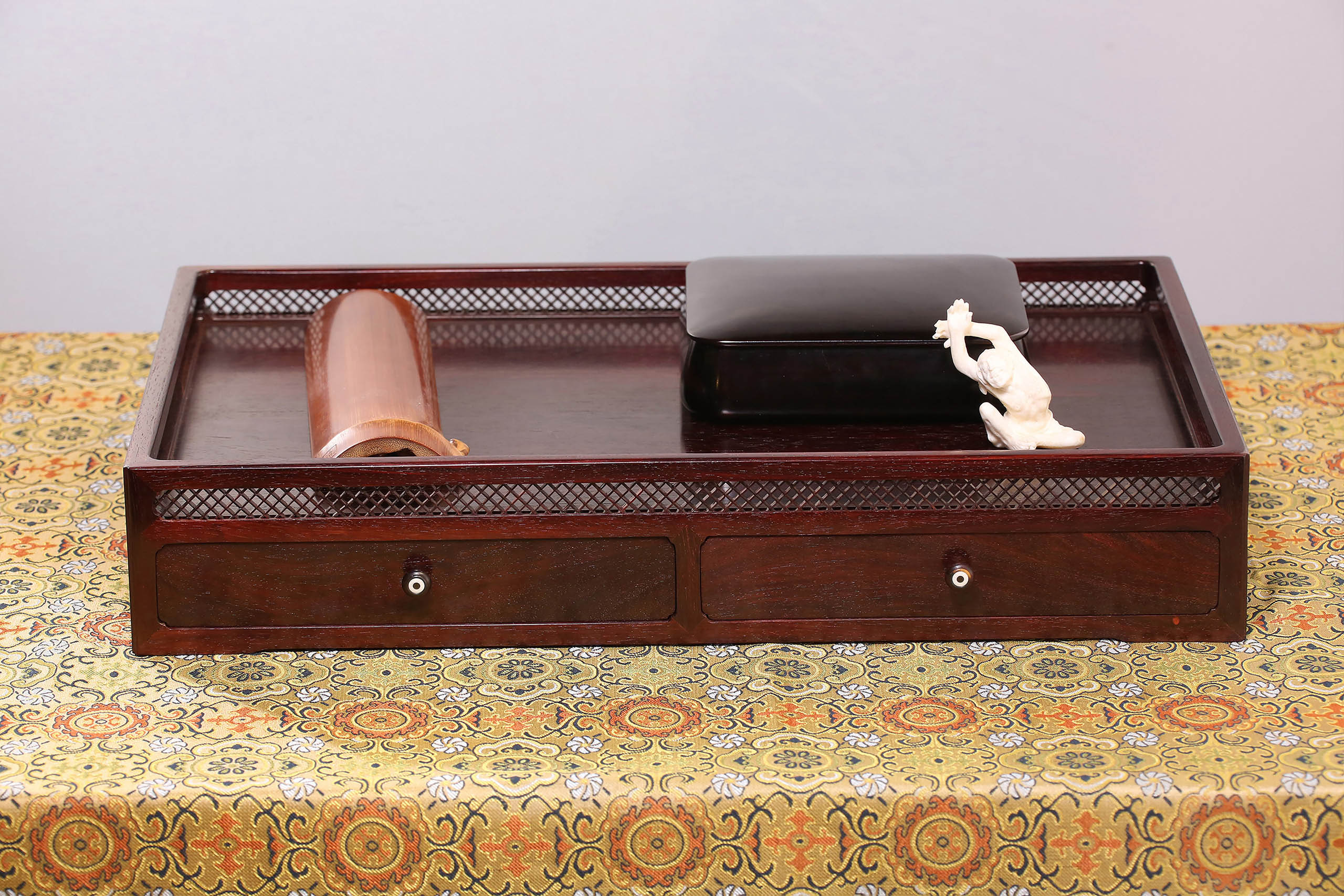 长:37.7cm 宽:23cm 高:6.5cm 小叶紫檀文盘 整器全榫卯工艺,大到板面之间的连接,小到承盘四周的网格是一块一块开榫、拼接而成。文盘下设两抽屉,用以陈置雅物。 长37.7cm 宽23cm 高6.5cm 长:37.5cm宽:23cm高:7cm 文盘|小叶紫檀 长:37.5cm宽:23cm高:7cm