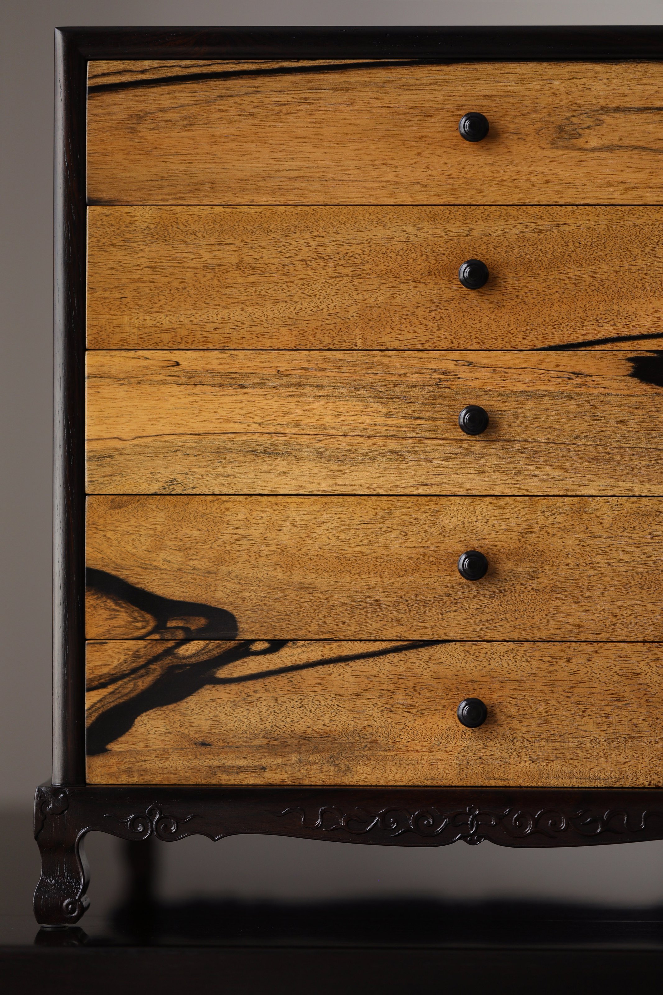 长26.5cm 宽26.5cm 高27.3cm 紫光檀|黑白檀五斗柜,茶边柜 长26.5cm 宽26.5cm 高27.3cm 紫光檀榫卯结构,老料制作。五斗多层储物空间。 抽屉面板黑白檀天然花纹与紫光檀一深一浅,相应成辉,气韵典雅。