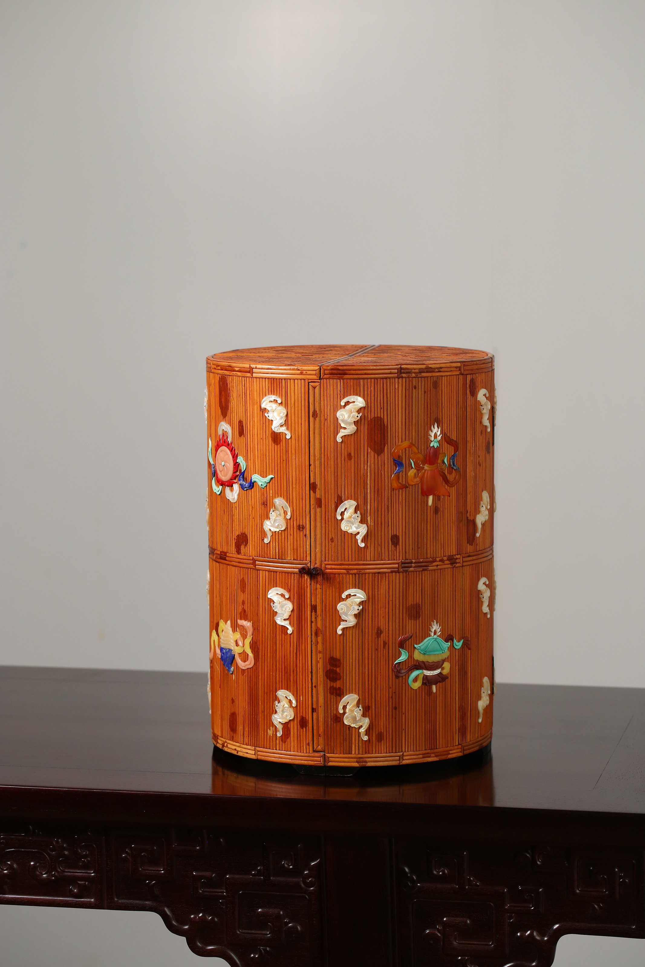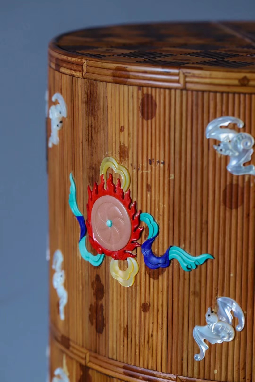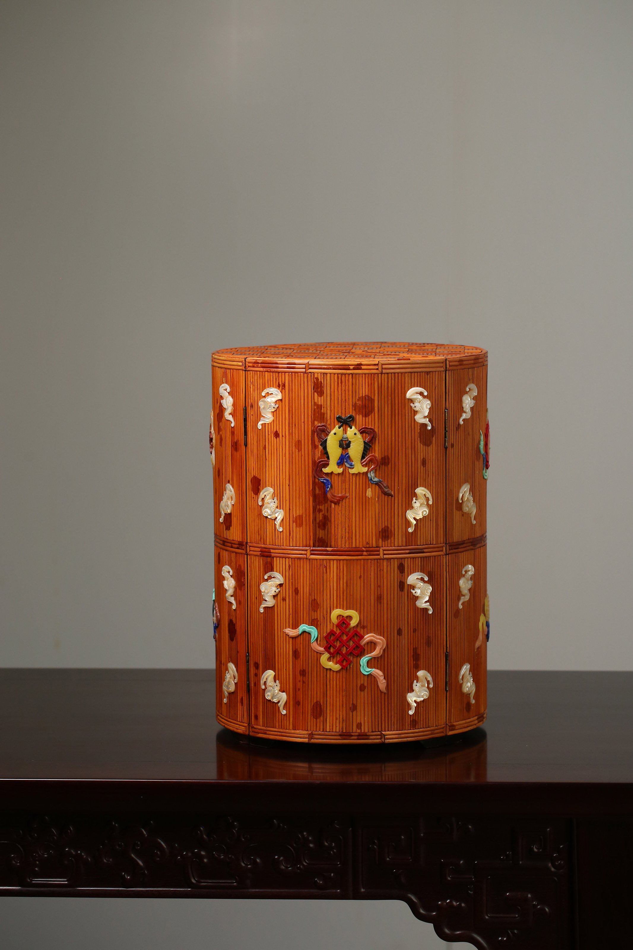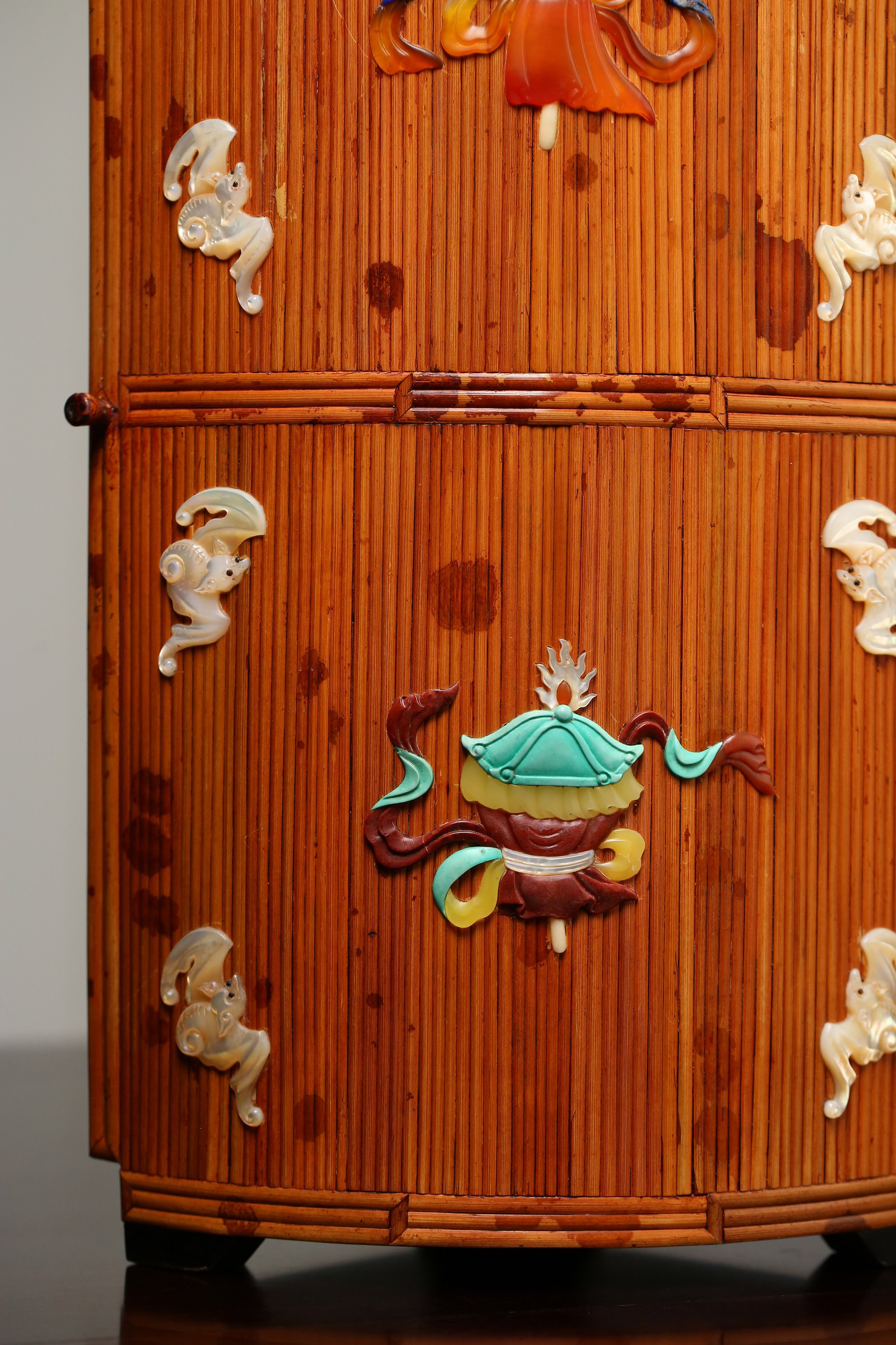 直径:29cm 高:40.5cm 展开尺寸:长58cm 厚:14.5cm 高:40.5cm 重:3940g 湘妃竹百宝嵌多宝柜 循清宫多宝阁制式,湘妃竹攒镶,外饰百宝嵌,内髹大漆描金,架格错落有致。全器匠心独运,层层展开,雅趣无边。