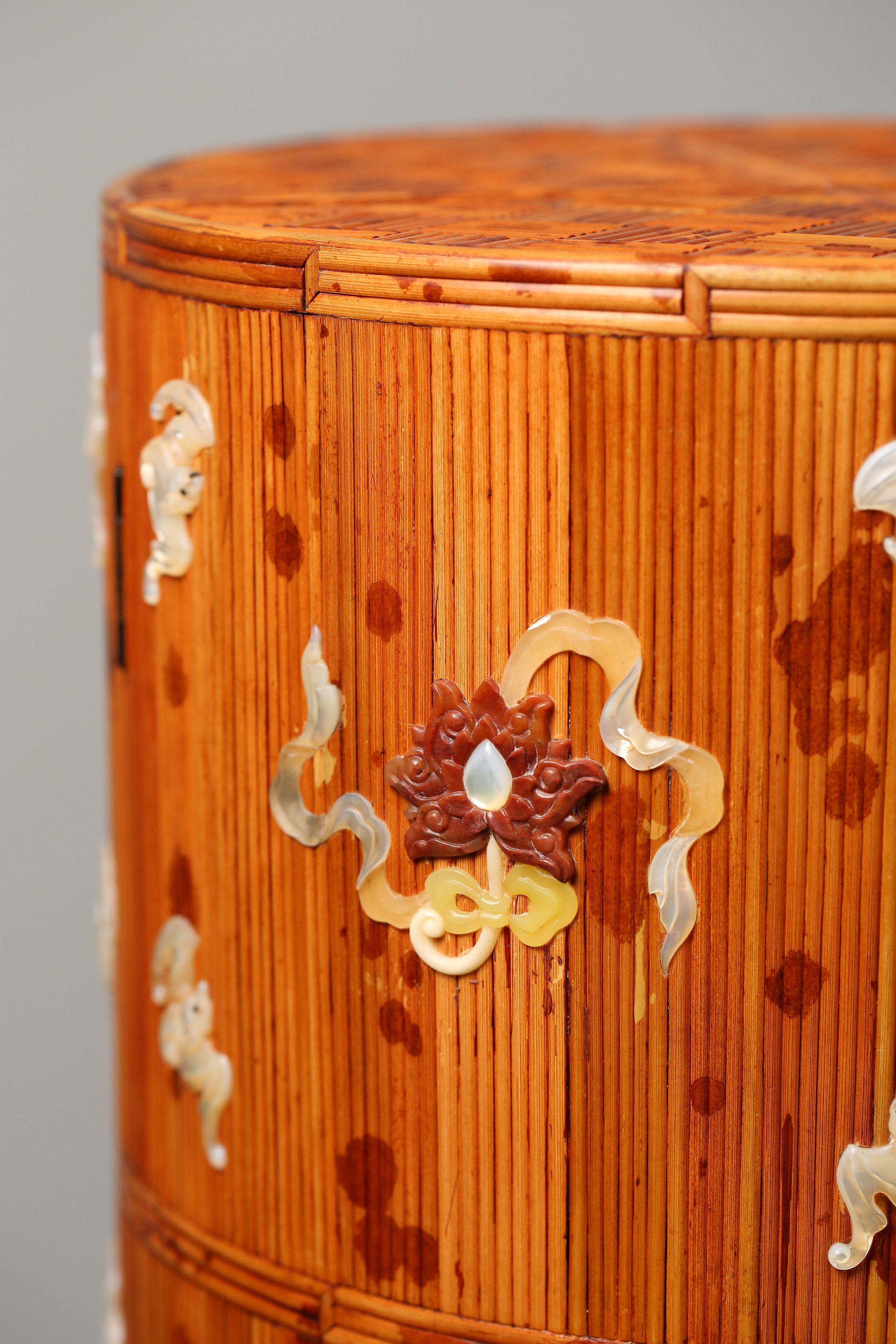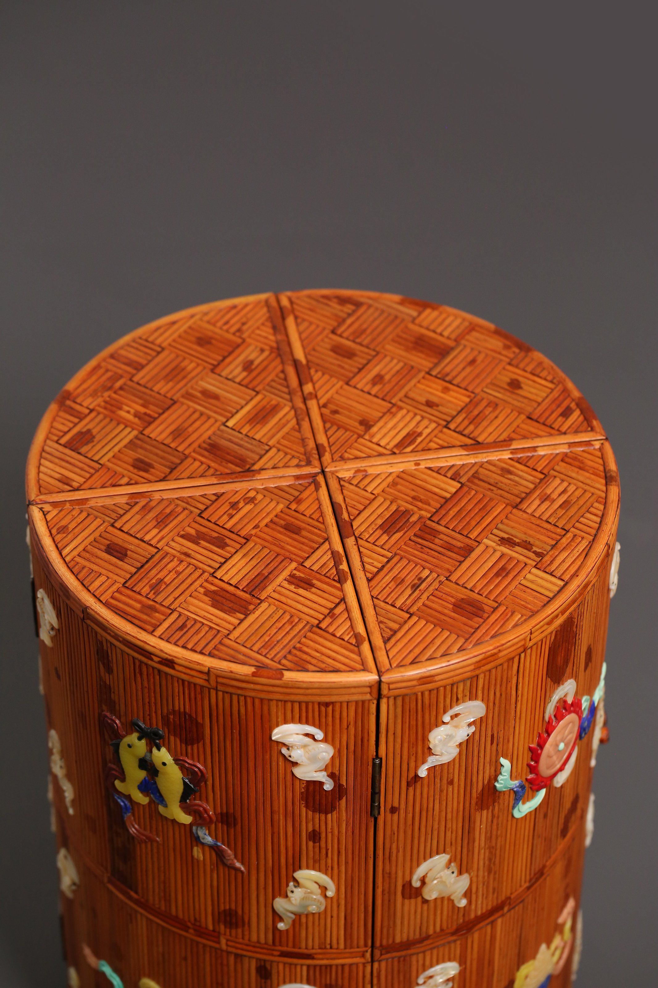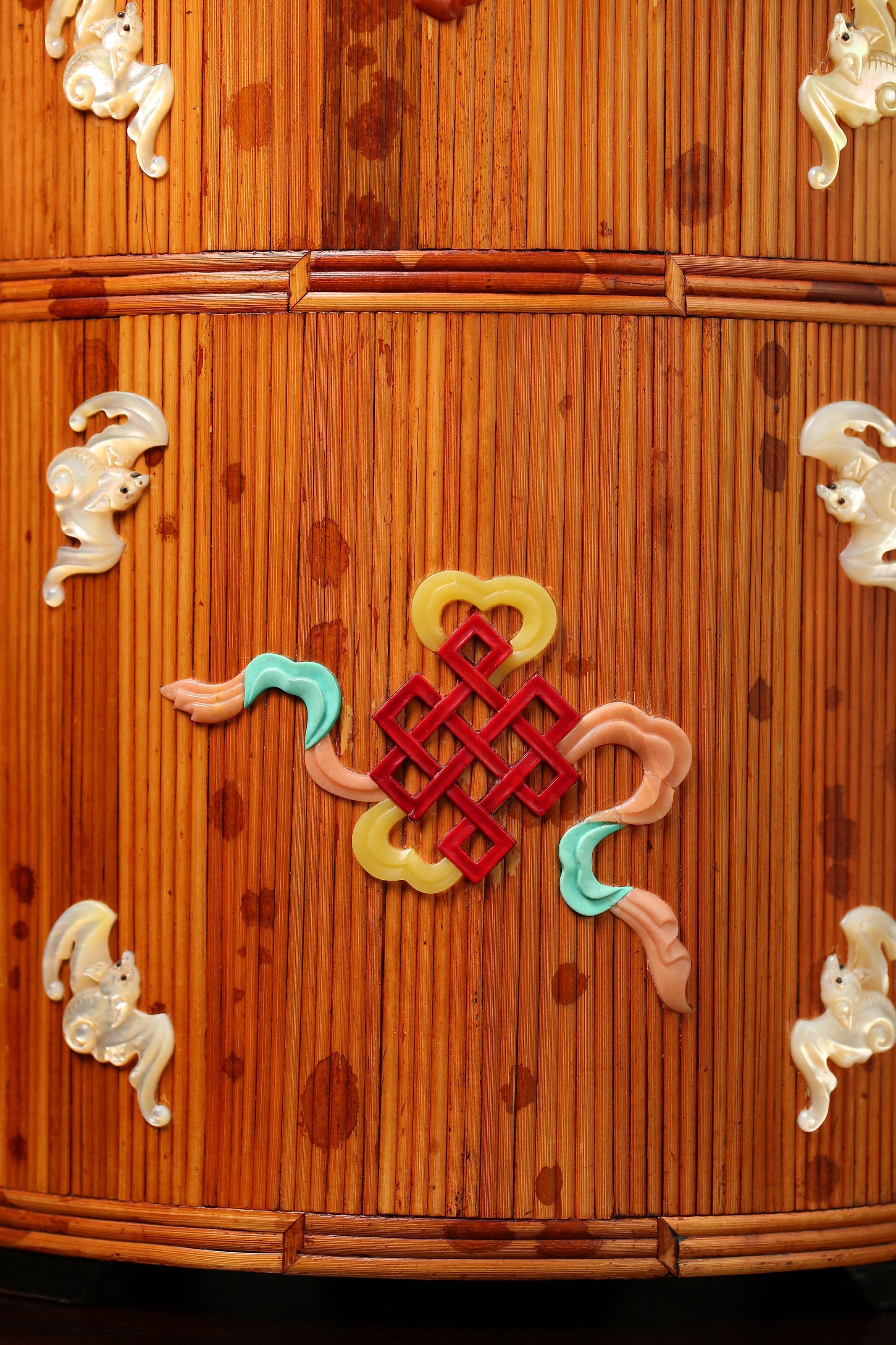 直径:29cm 高:40.5cm 展开尺寸:长58cm 厚:14.5cm 高:40.5cm 重:3940g 湘妃竹百宝嵌多宝柜 循清宫多宝阁制式,湘妃竹攒镶,外饰百宝嵌,内髹大漆描金,架格错落有致。全器匠心独运,层层展开,雅趣无边。