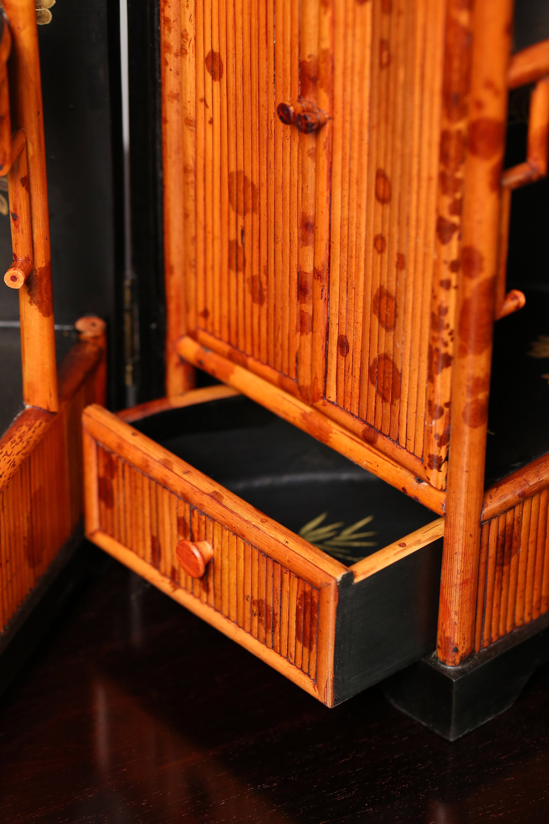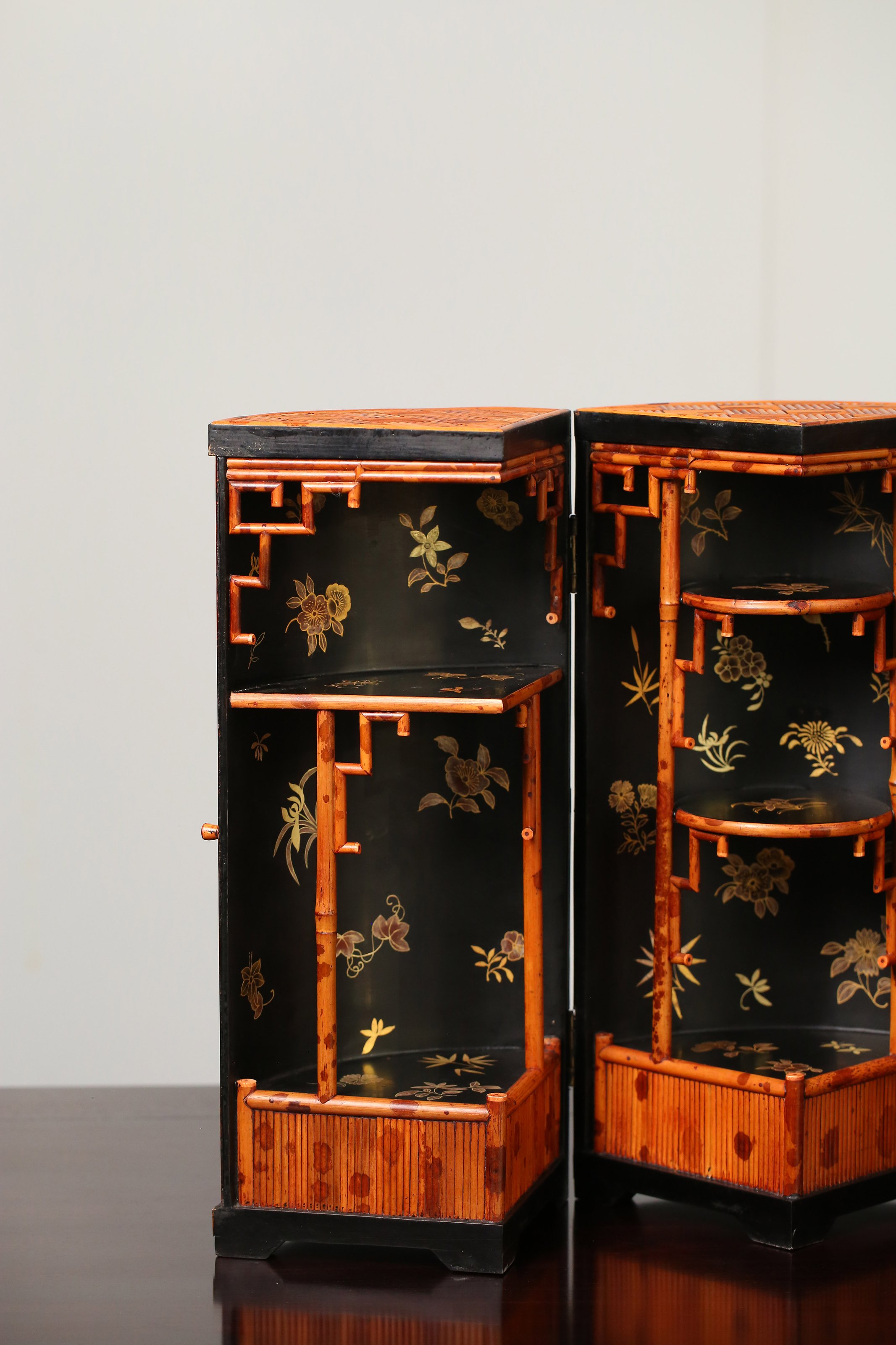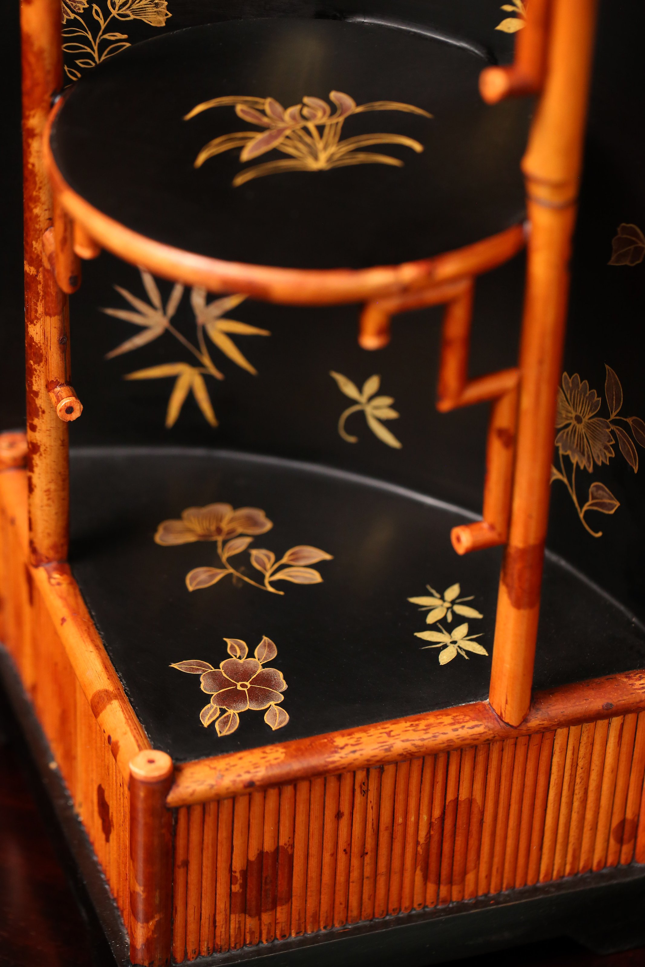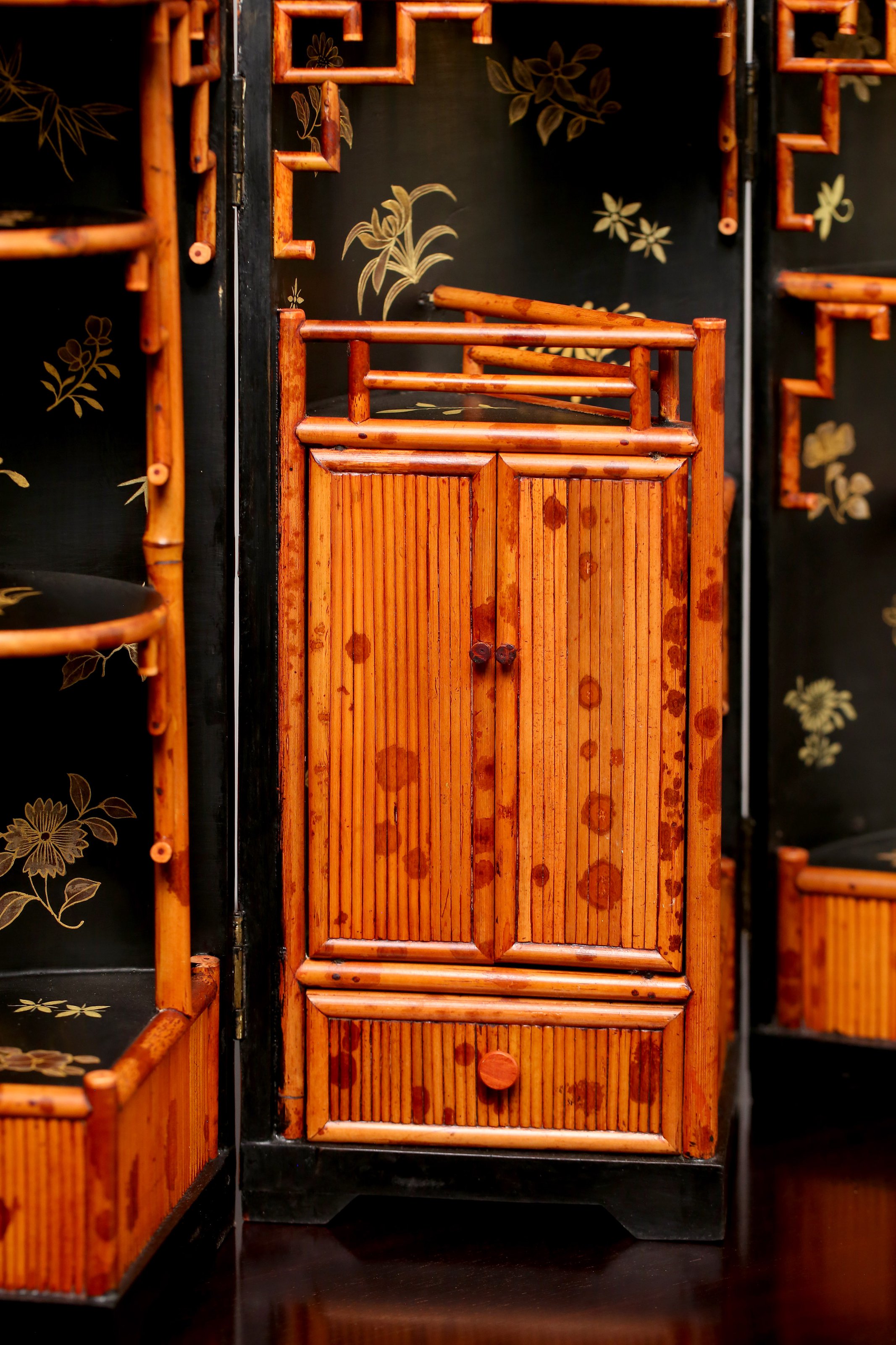 直径:29cm 高:40.5cm 展开尺寸:长58cm 厚:14.5cm 高:40.5cm 重:3940g 湘妃竹百宝嵌多宝柜 循清宫多宝阁制式,湘妃竹攒镶,外饰百宝嵌,内髹大漆描金,架格错落有致。全器匠心独运,层层展开,雅趣无边。