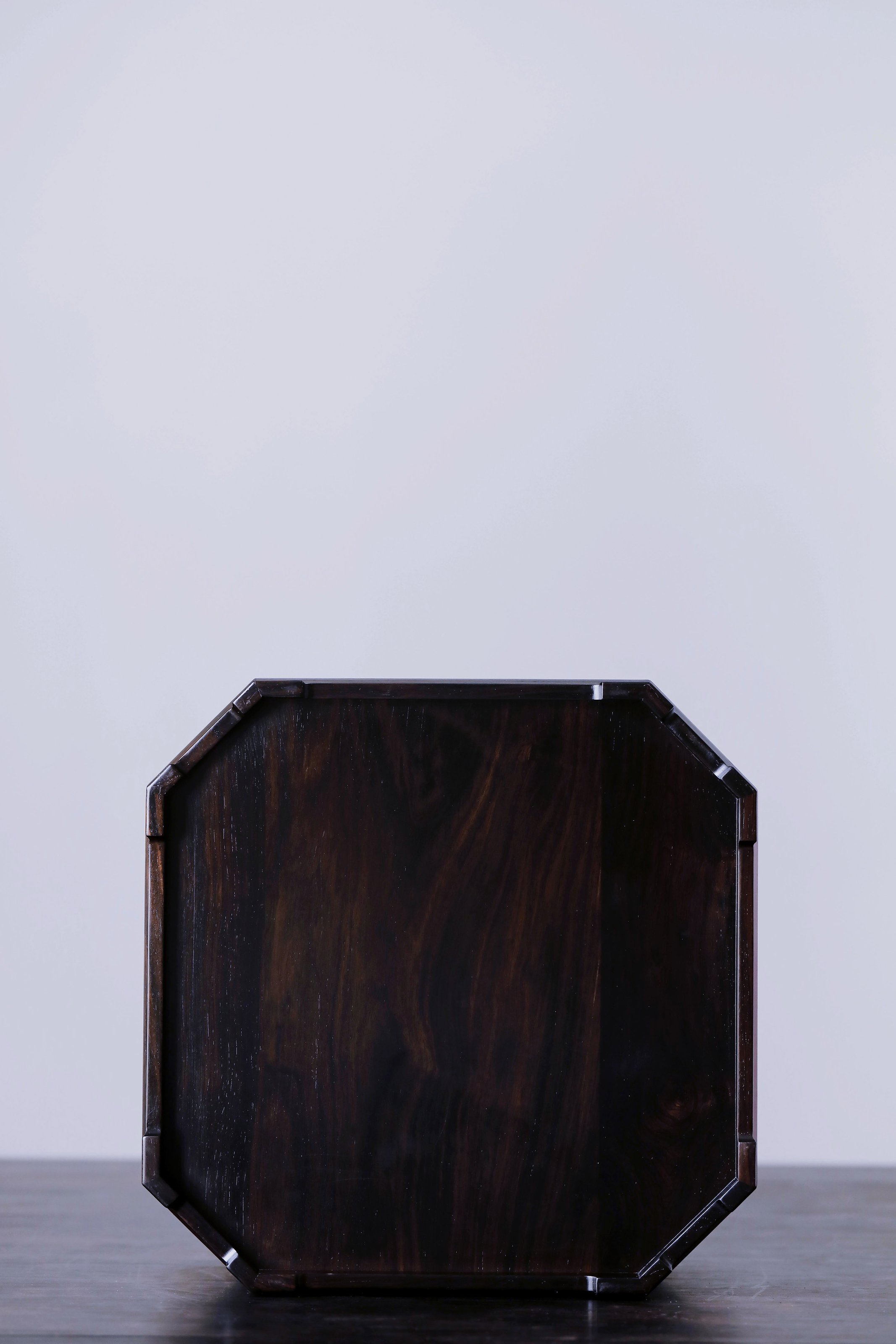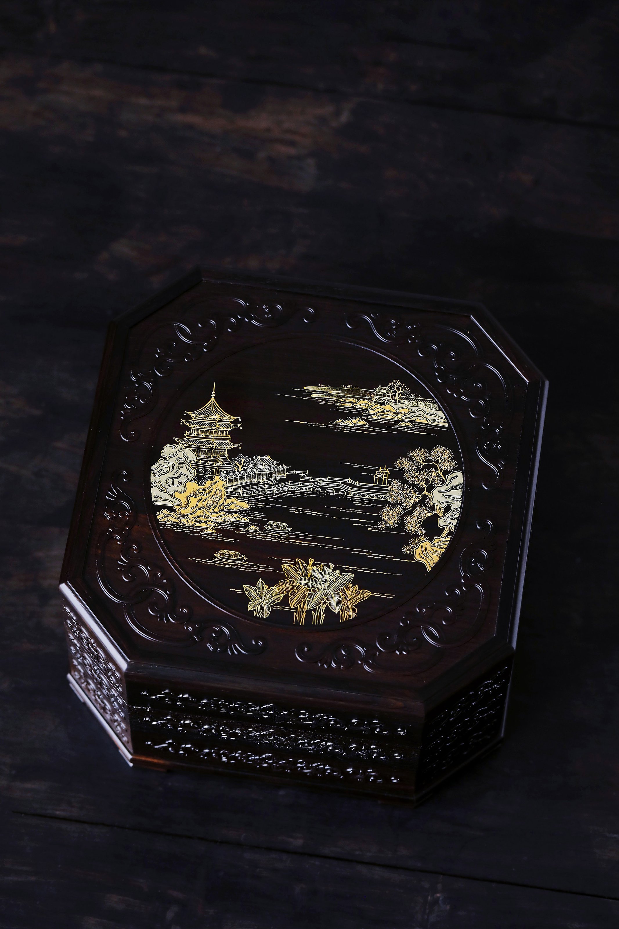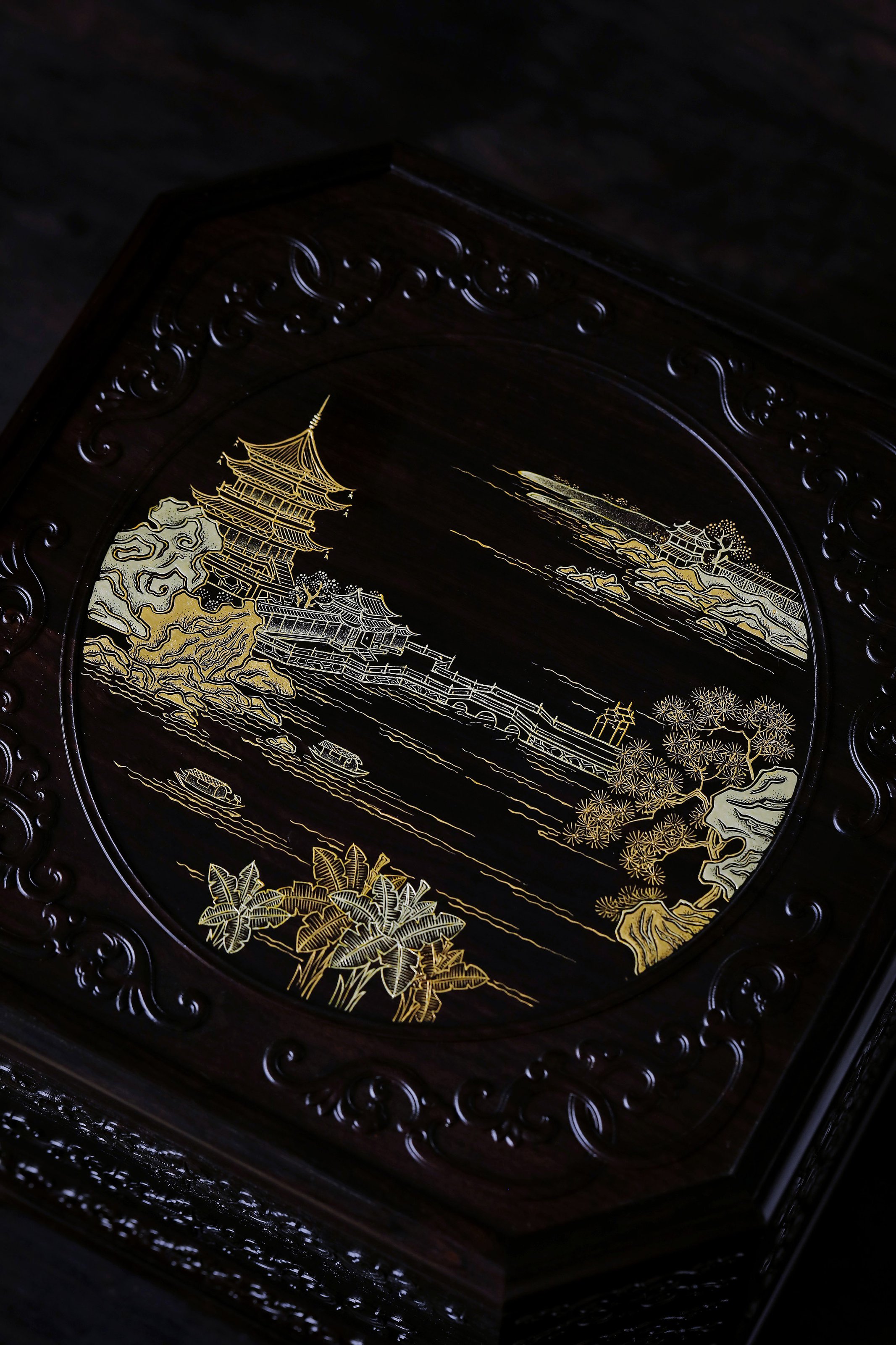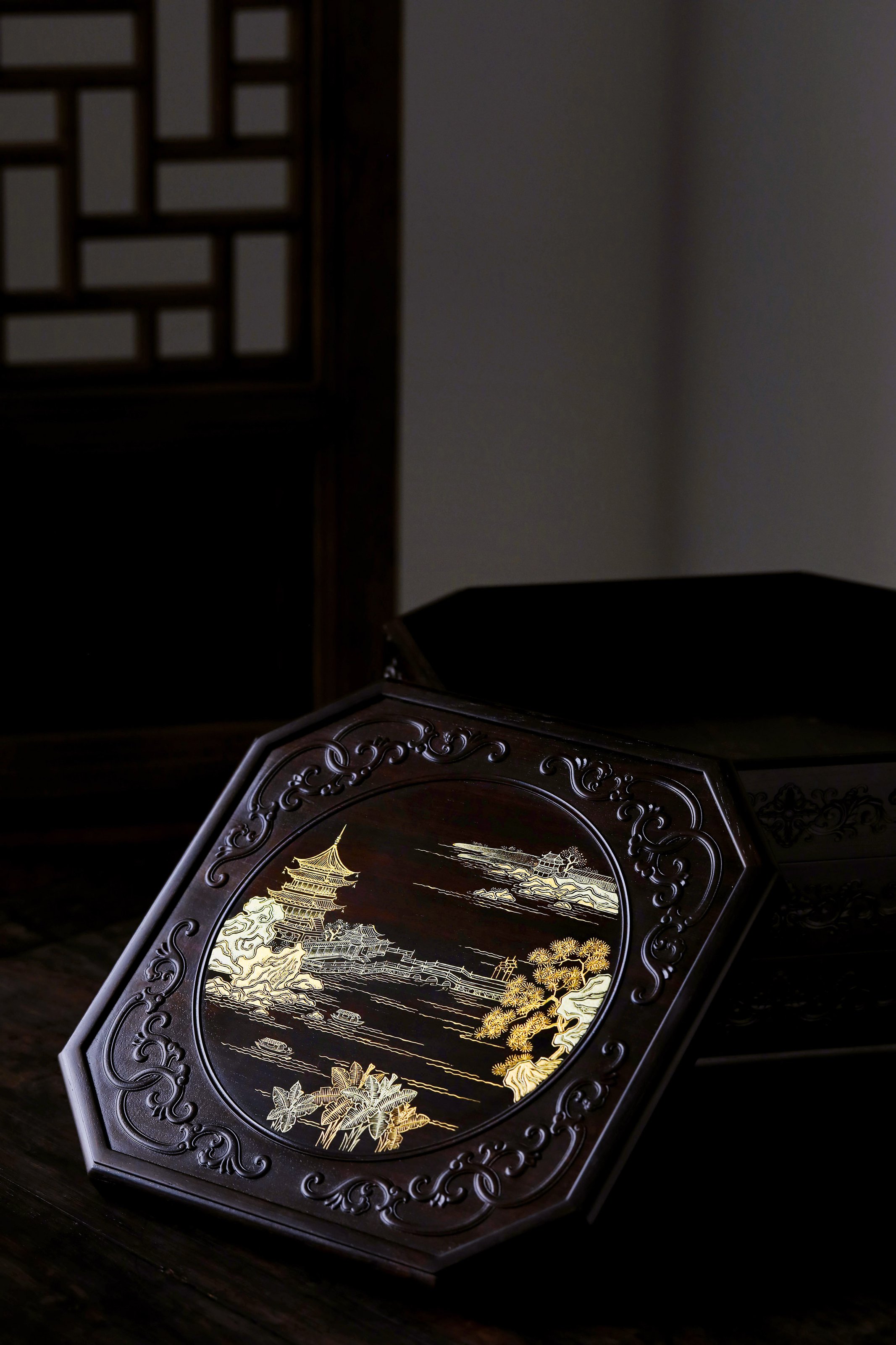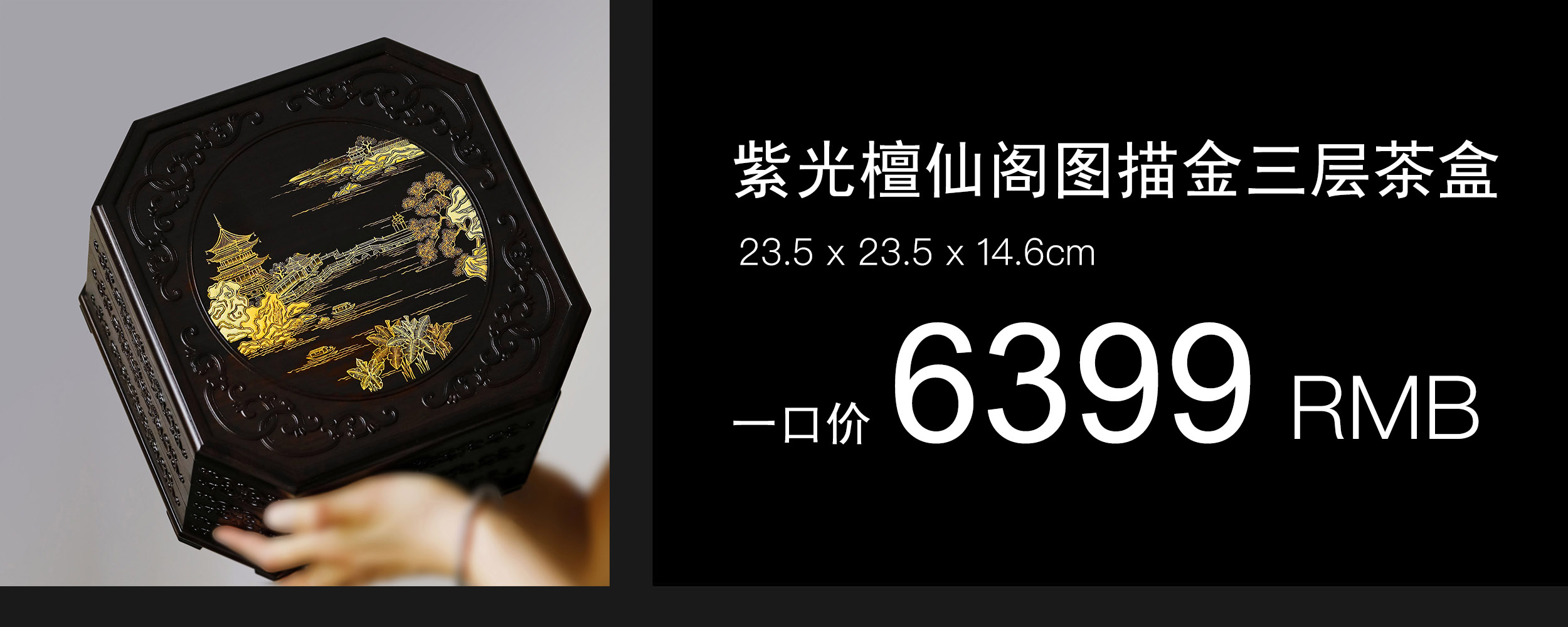 取材紫光檀老料,盒呈八角三层天地盖,榫卯结构,非遗描金仙阁图;周身雕饰西番莲纹,司茶雅物。