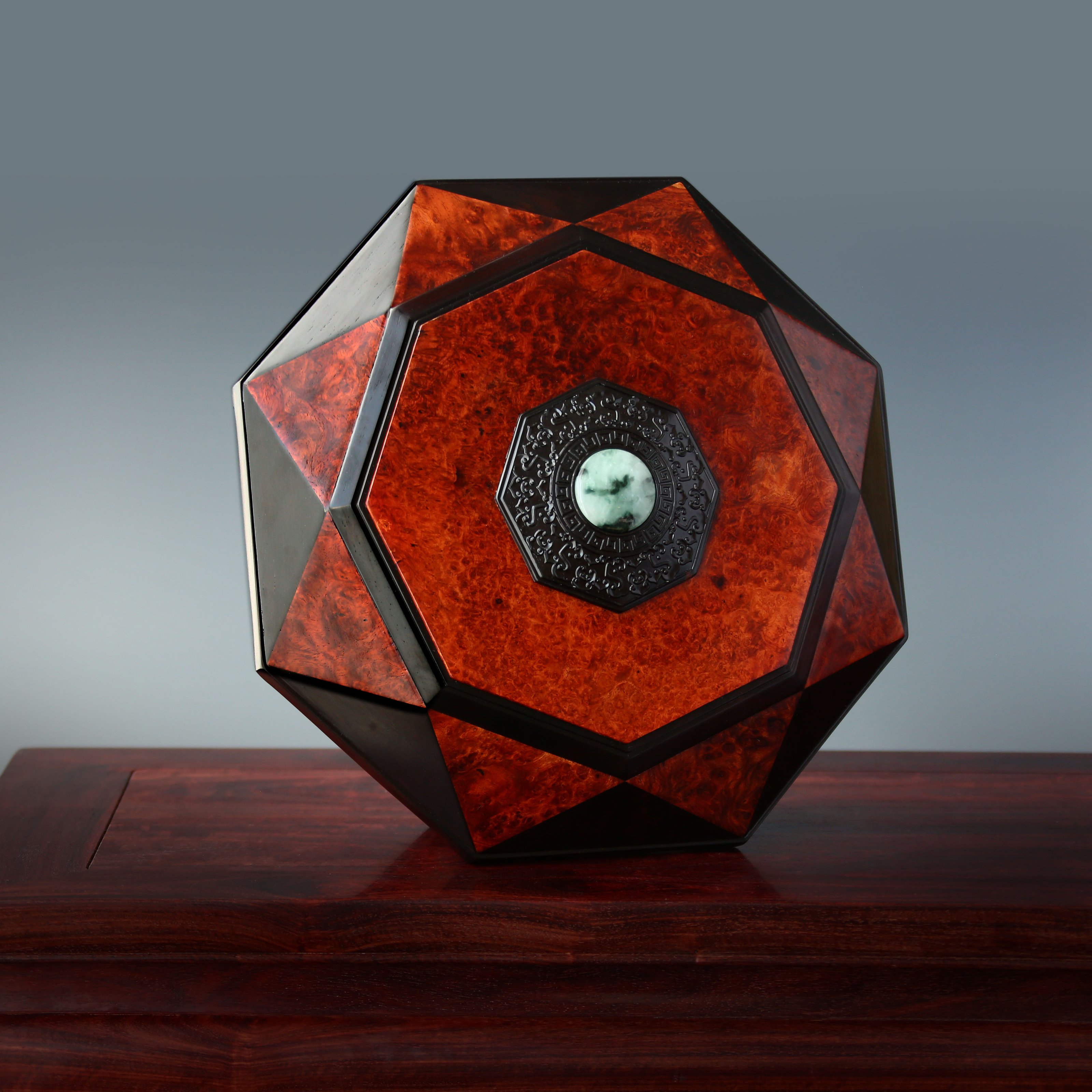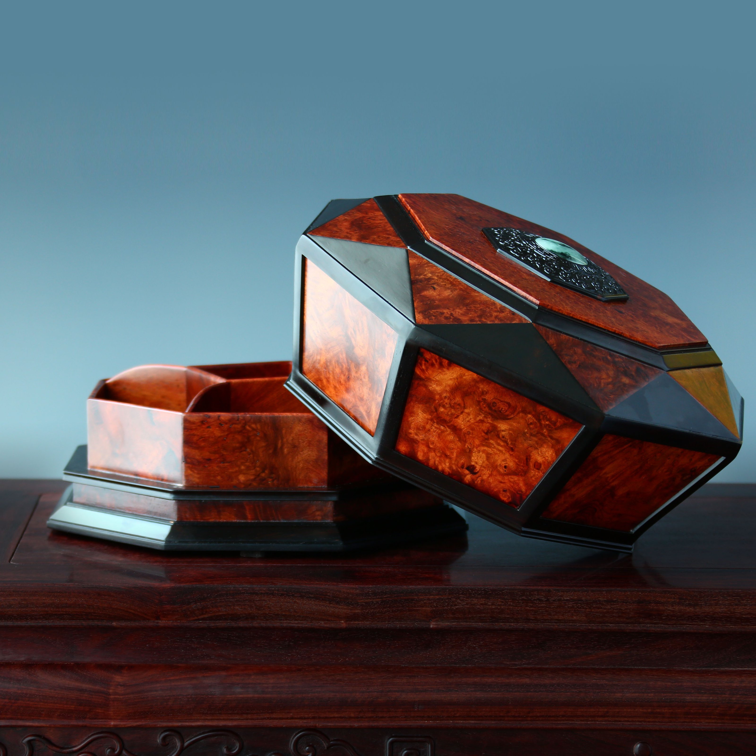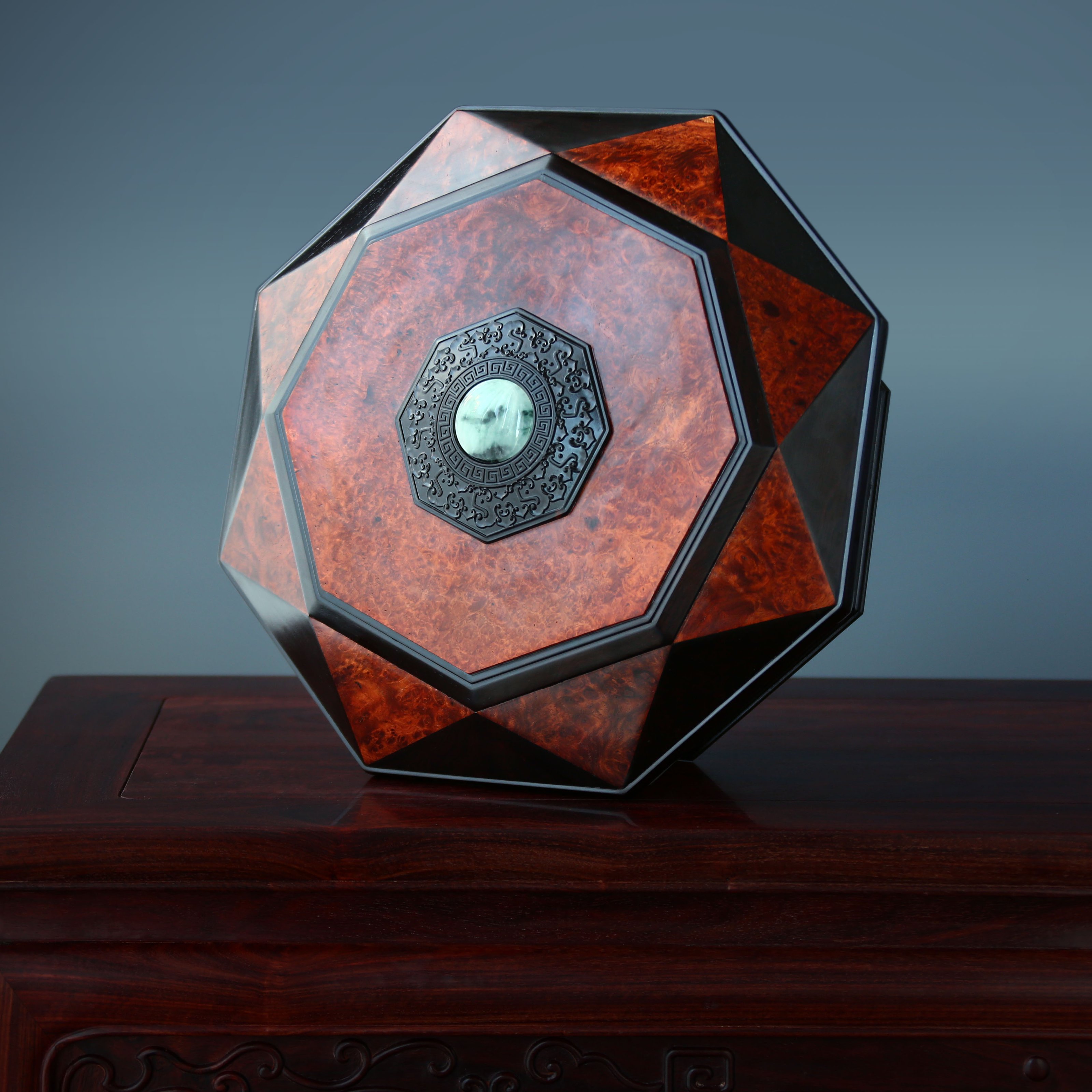 长:36cm 宽:36cm 高:21cm 瘿木宝石盒 宝盒切角八棱面,紫光檀为框架,嵌瘿木心,纹理瑰美璀璨。盖面中央饰八边形开关,雕刻宝珠纹,中央圆形开光内镶嵌玉石。立墙八面亦饰树瘤瘿木,向内收敛。打开盖子,内分小格,方便分类收纳。底座为须弥座的式样,束腰亦为瘿木,工艺和形制考究。