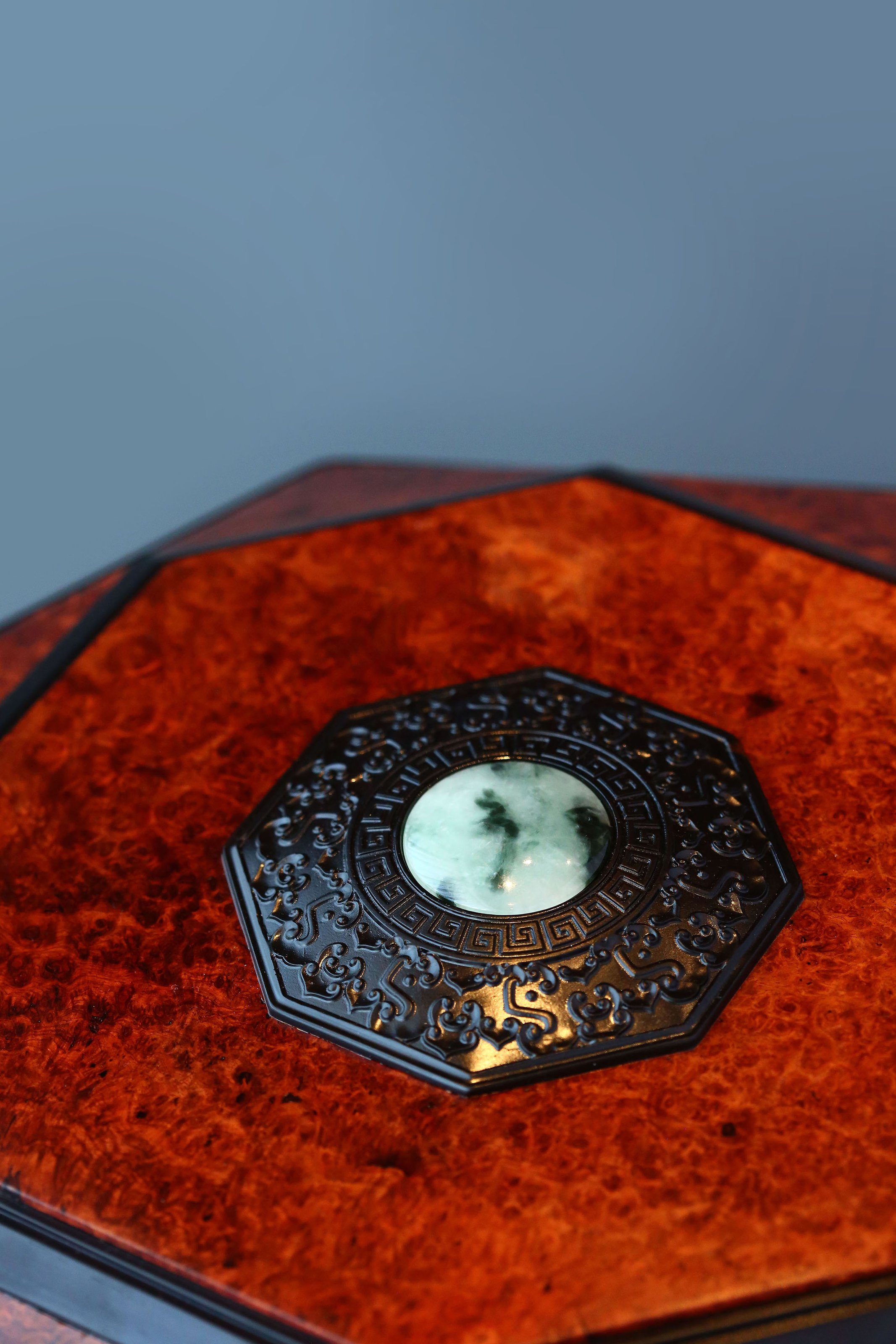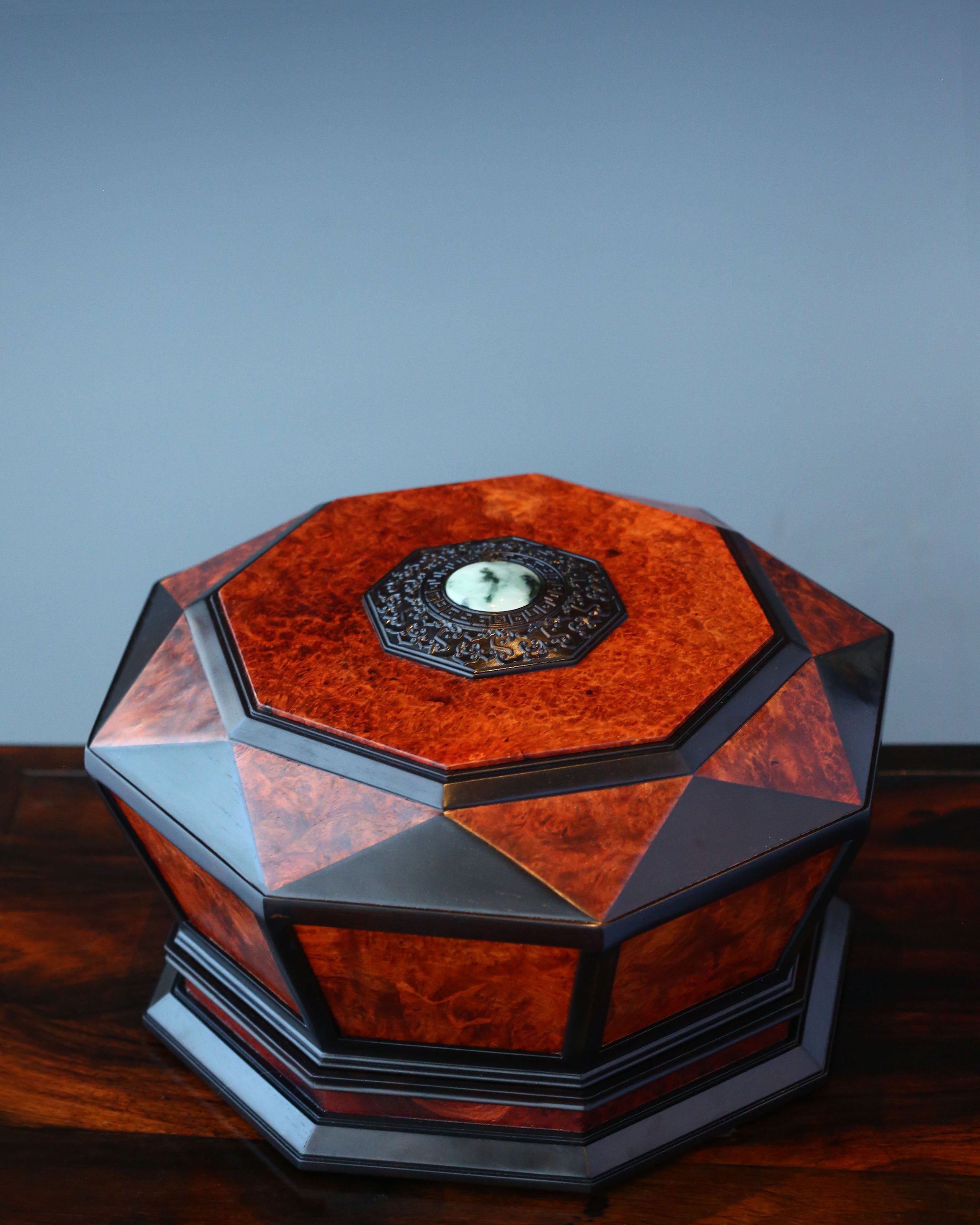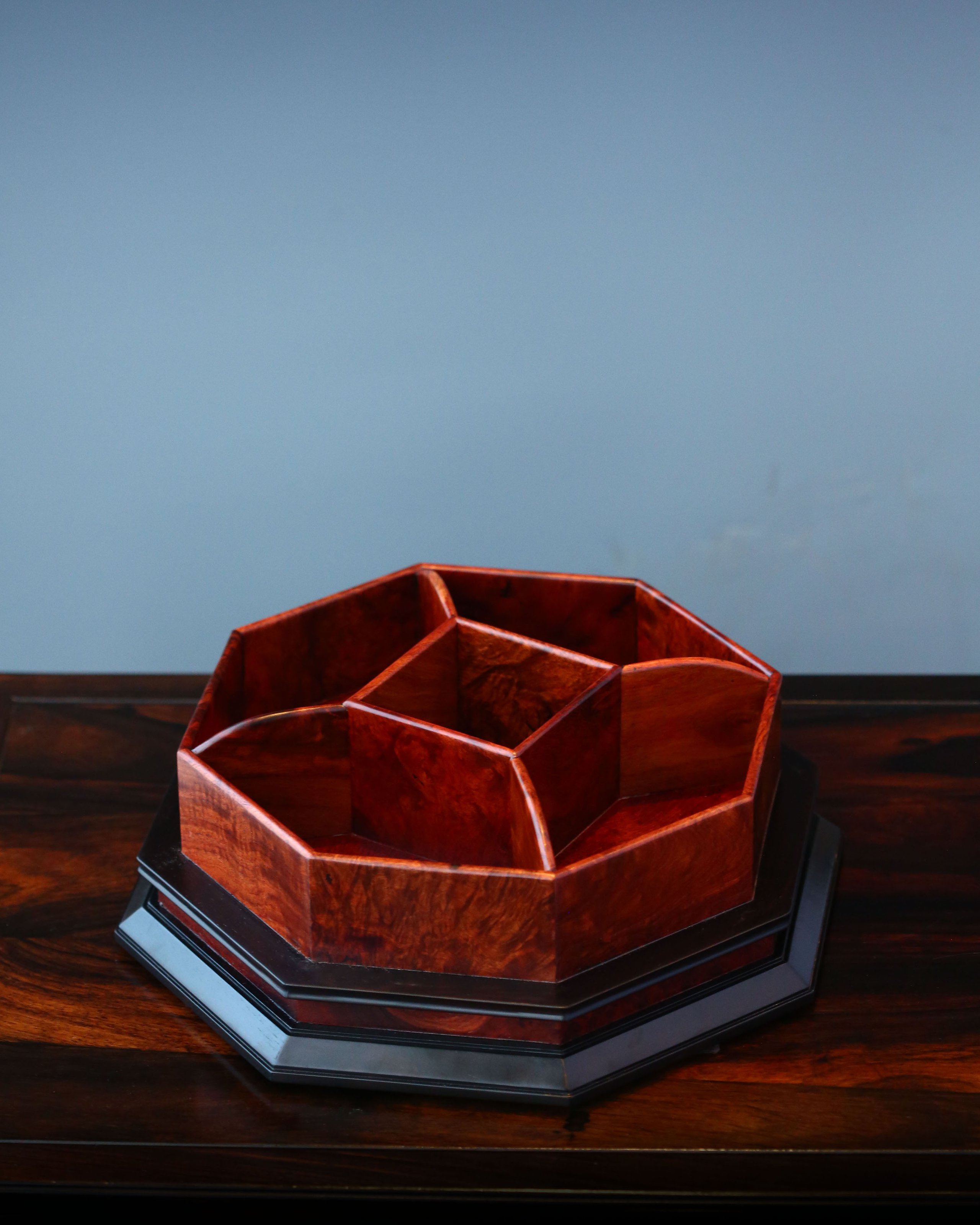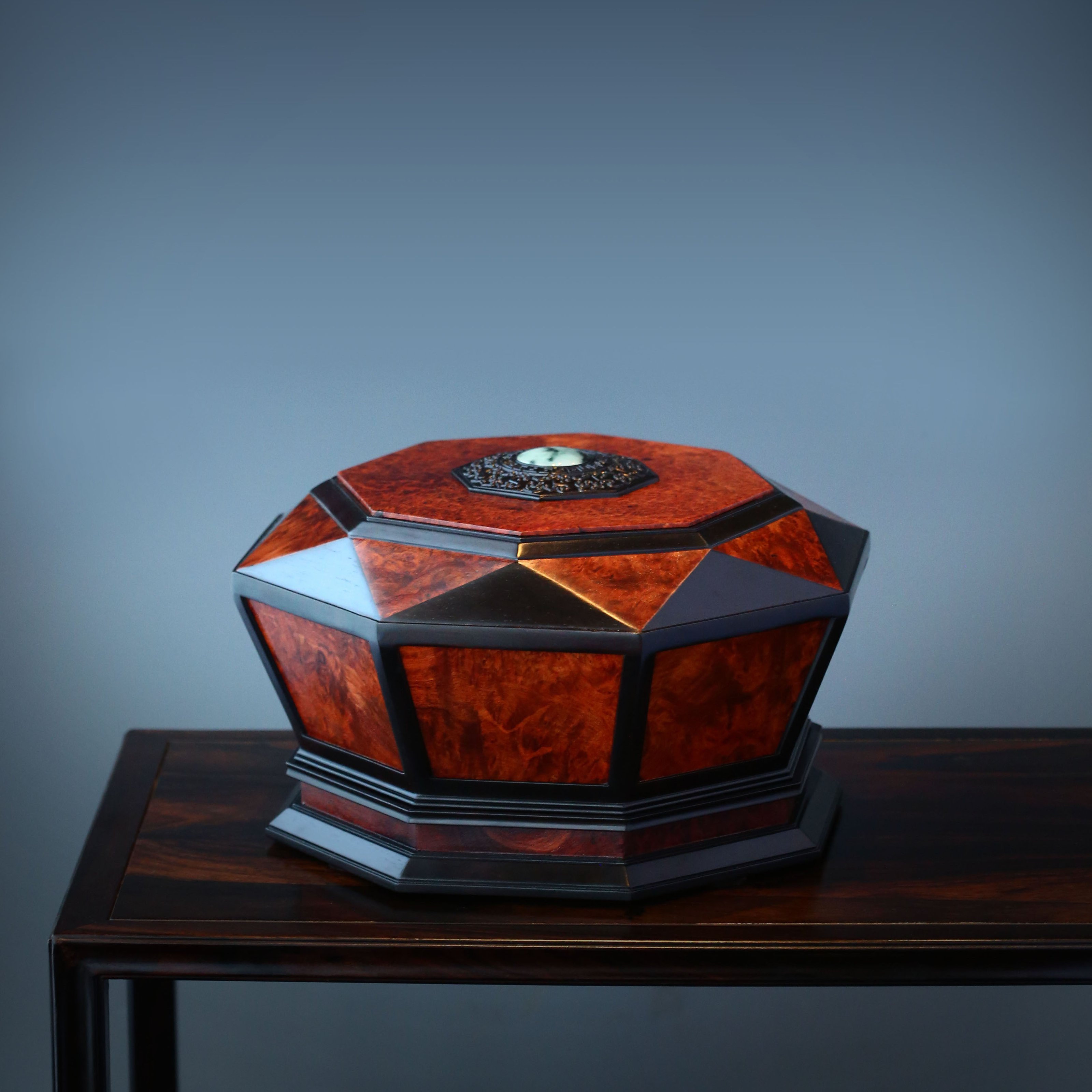 长:36cm 宽:36cm 高:21cm 瘿木宝石盒 宝盒切角八棱面,紫光檀为框架,嵌瘿木心,纹理瑰美璀璨。盖面中央饰八边形开关,雕刻宝珠纹,中央圆形开光内镶嵌玉石。立墙八面亦饰树瘤瘿木,向内收敛。打开盖子,内分小格,方便分类收纳。底座为须弥座的式样,束腰亦为瘿木,工艺和形制考究。
