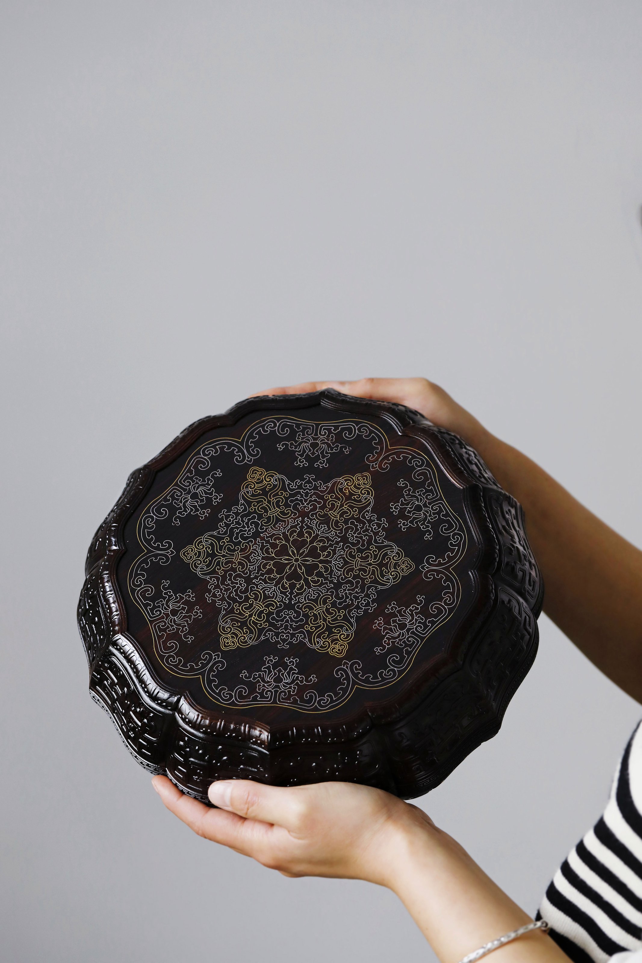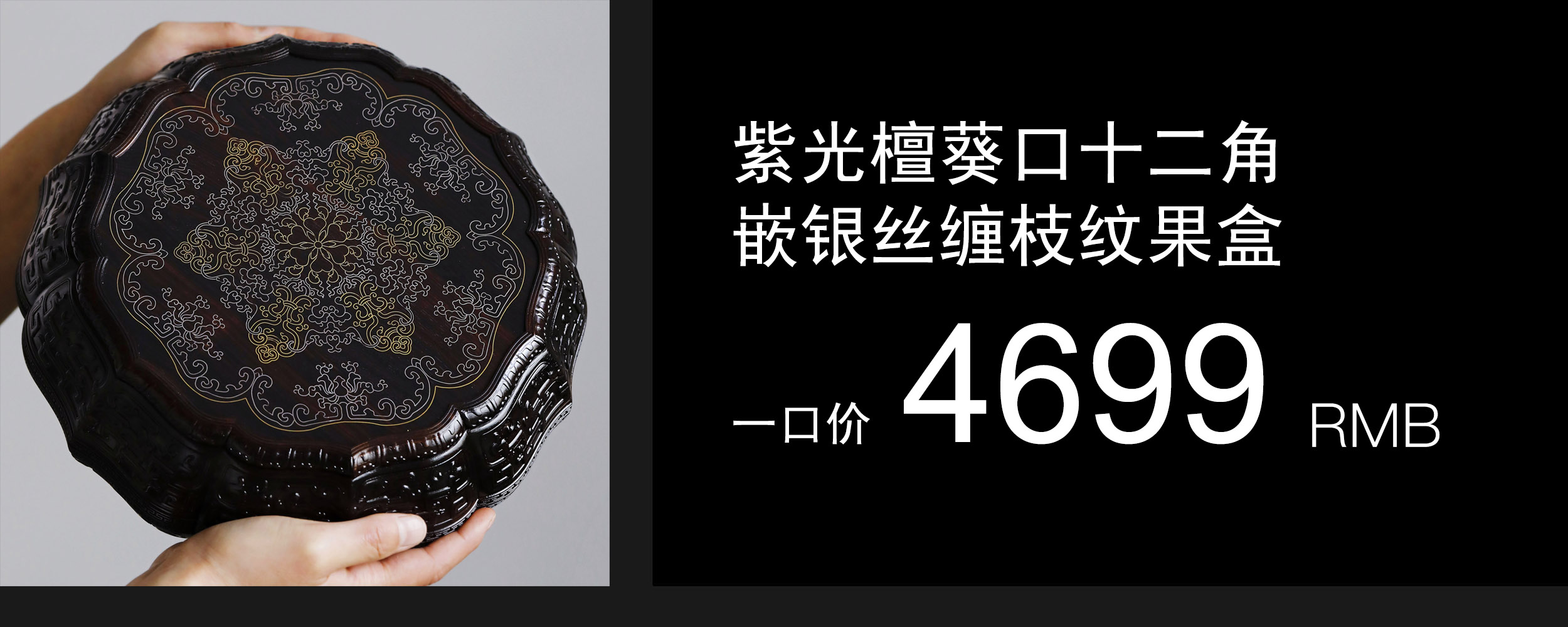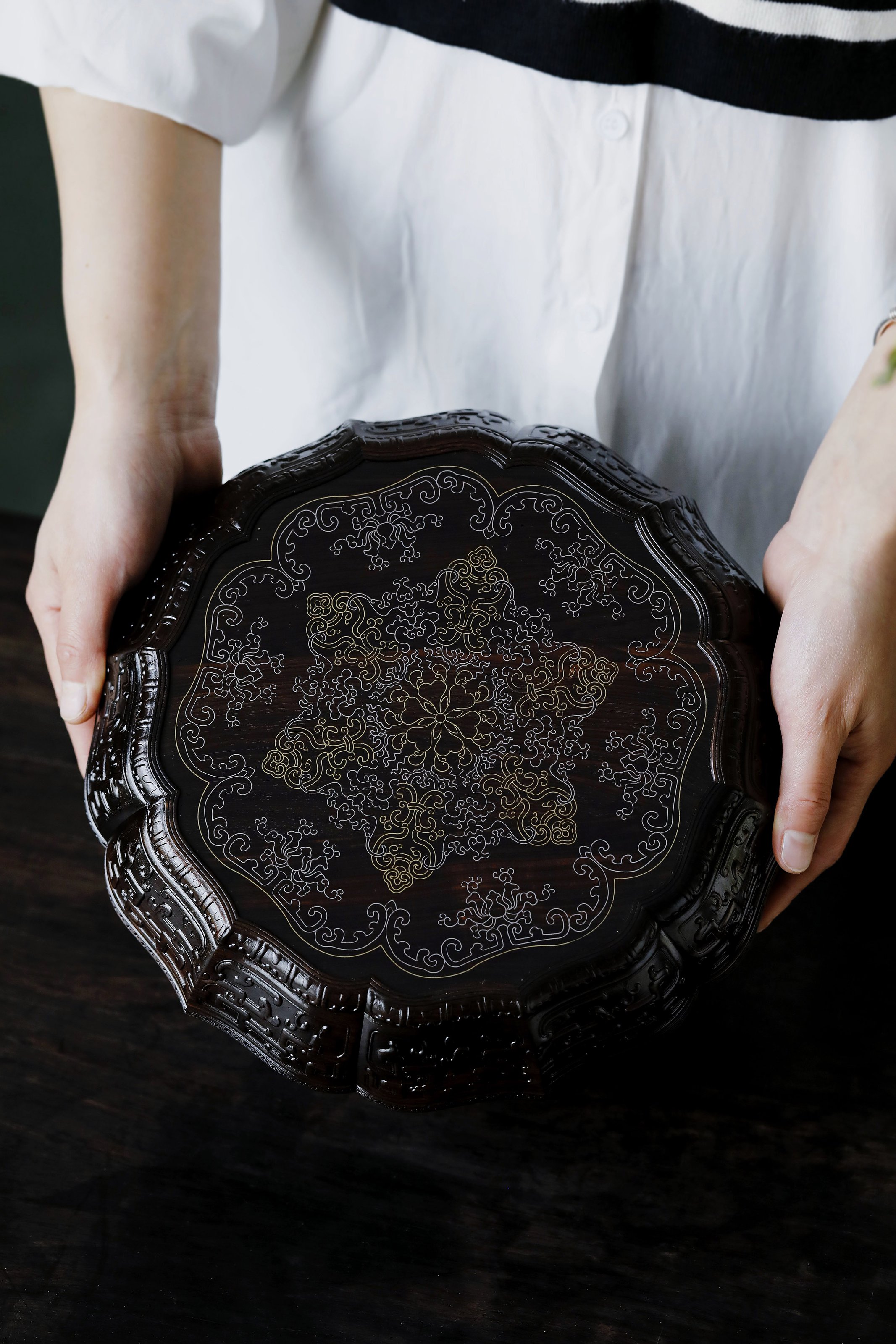 紫光檀葵口十二角嵌银丝缠枝纹果盒 尺寸:直径25cm 高10.6cm 取材紫光檀老料,盒呈花口十二角,嵌银、嵌铜技艺, 嵌以枝繁叶茂,连绵不断的缠枝莲纹,寓意福寿绵长;周身满雕万寿纹饰,寓意万福万寿,绵长不断… 器型素朴典雅,实用美物