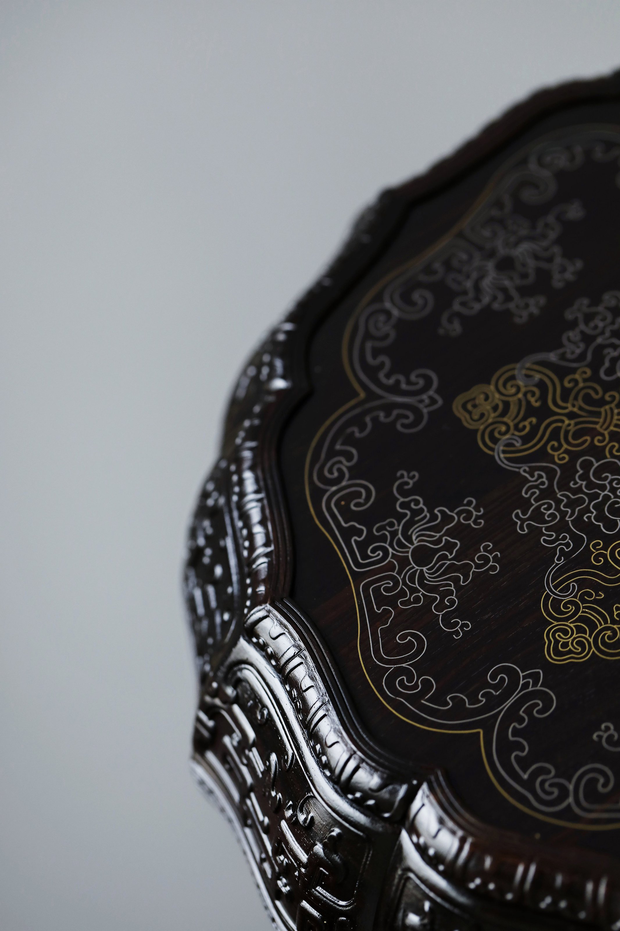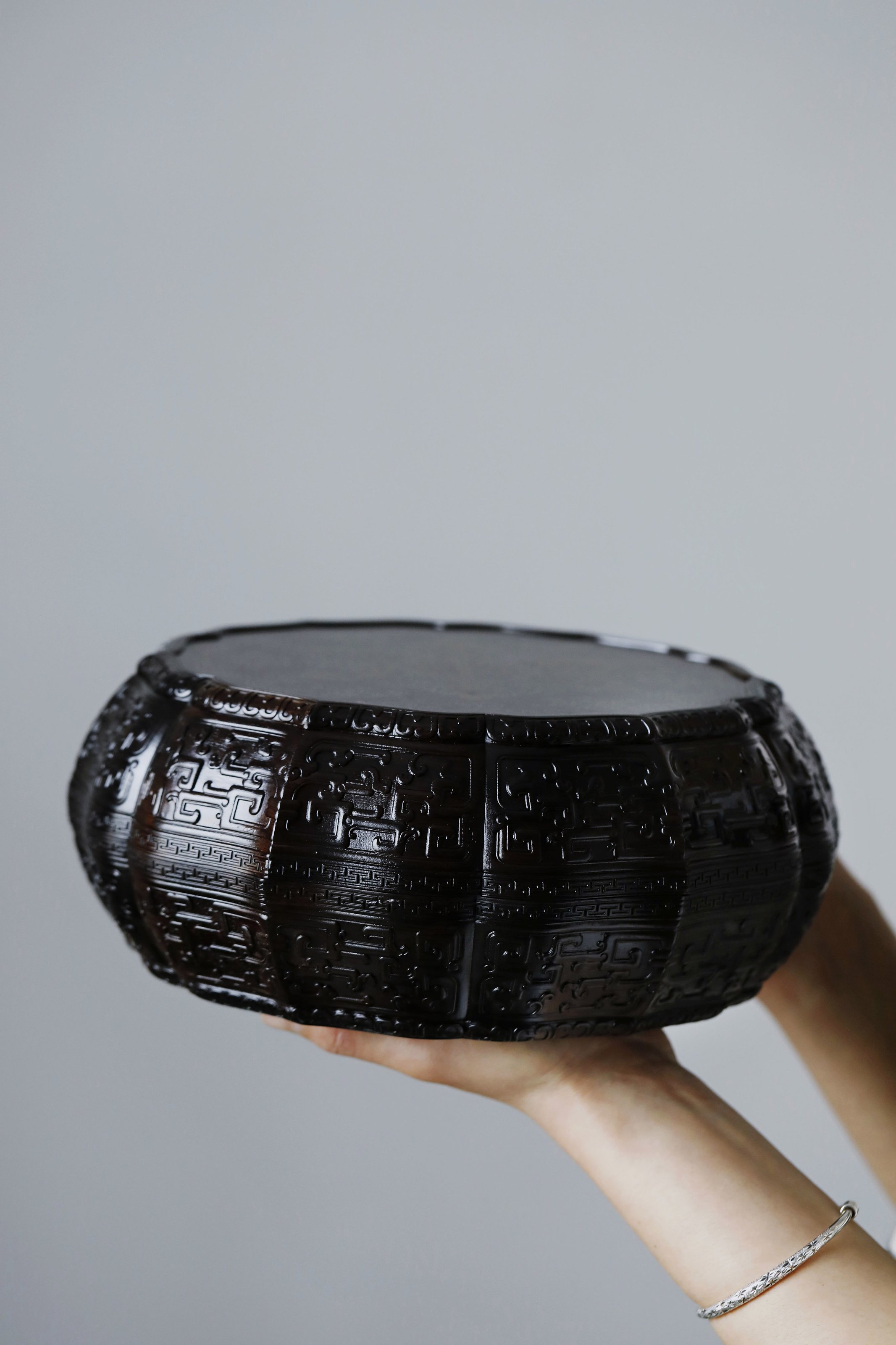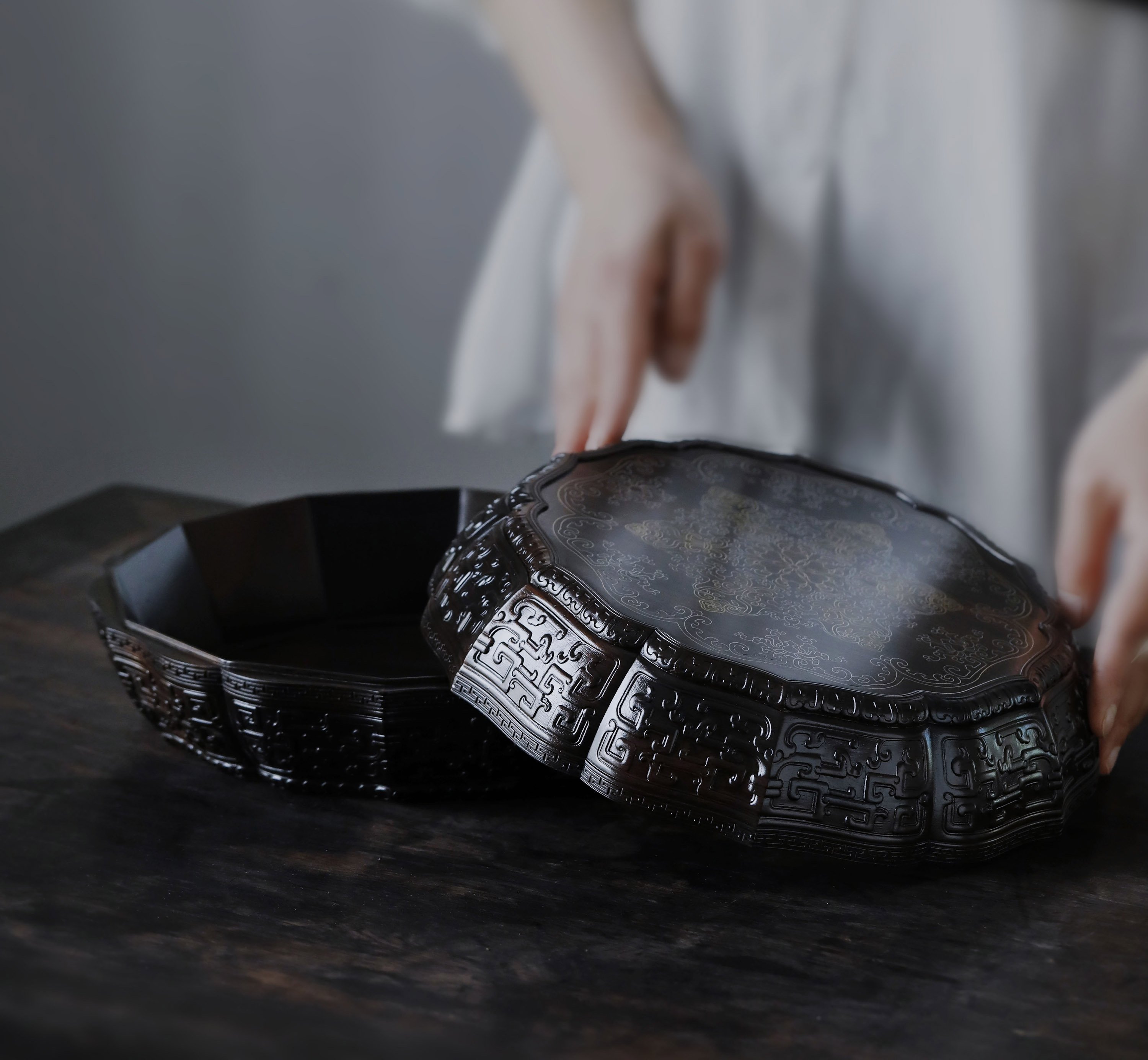 紫光檀葵口十二角嵌银丝缠枝纹果盒 尺寸:直径25cm 高10.6cm 取材紫光檀老料,盒呈花口十二角,嵌银、嵌铜技艺, 嵌以枝繁叶茂,连绵不断的缠枝莲纹,寓意福寿绵长;周身满雕万寿纹饰,寓意万福万寿,绵长不断… 器型素朴典雅,实用美物