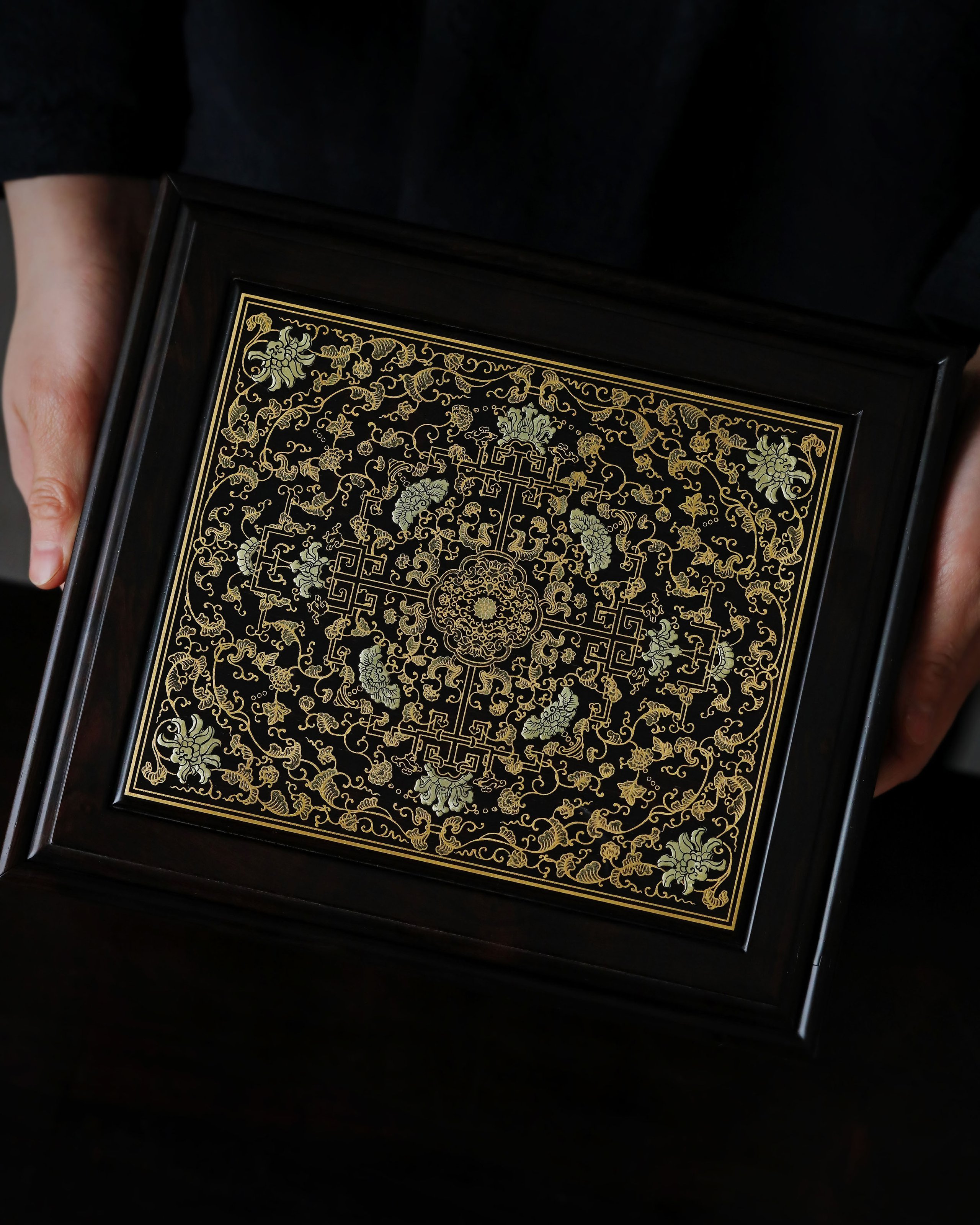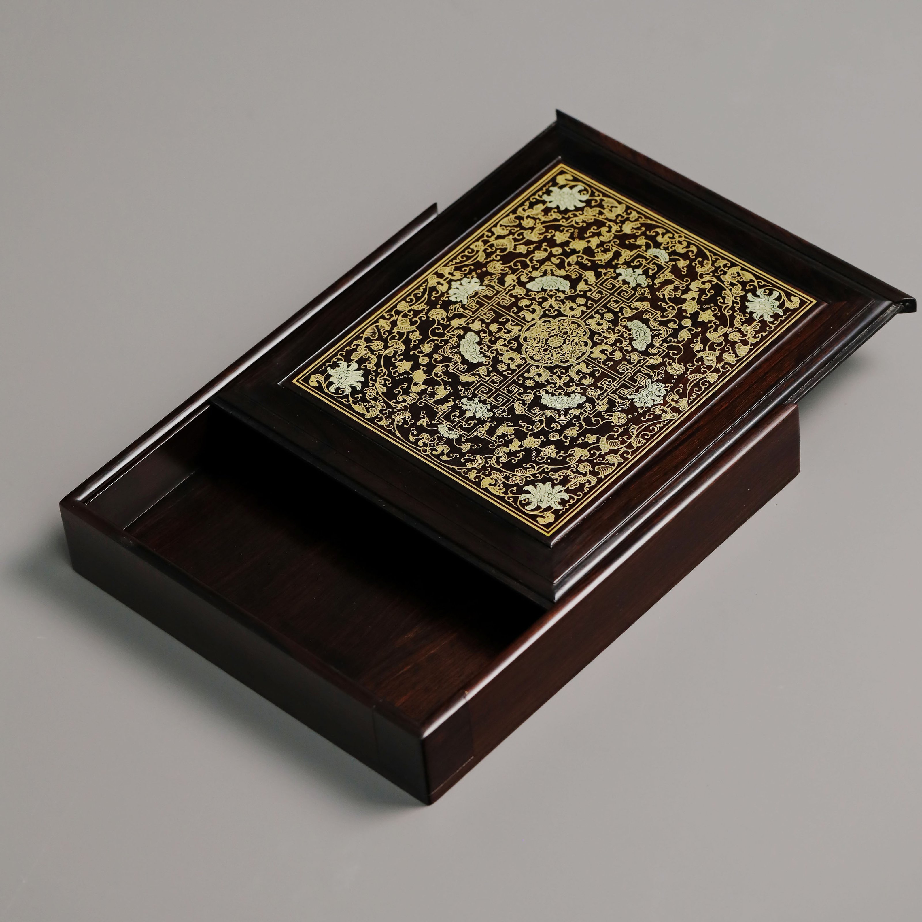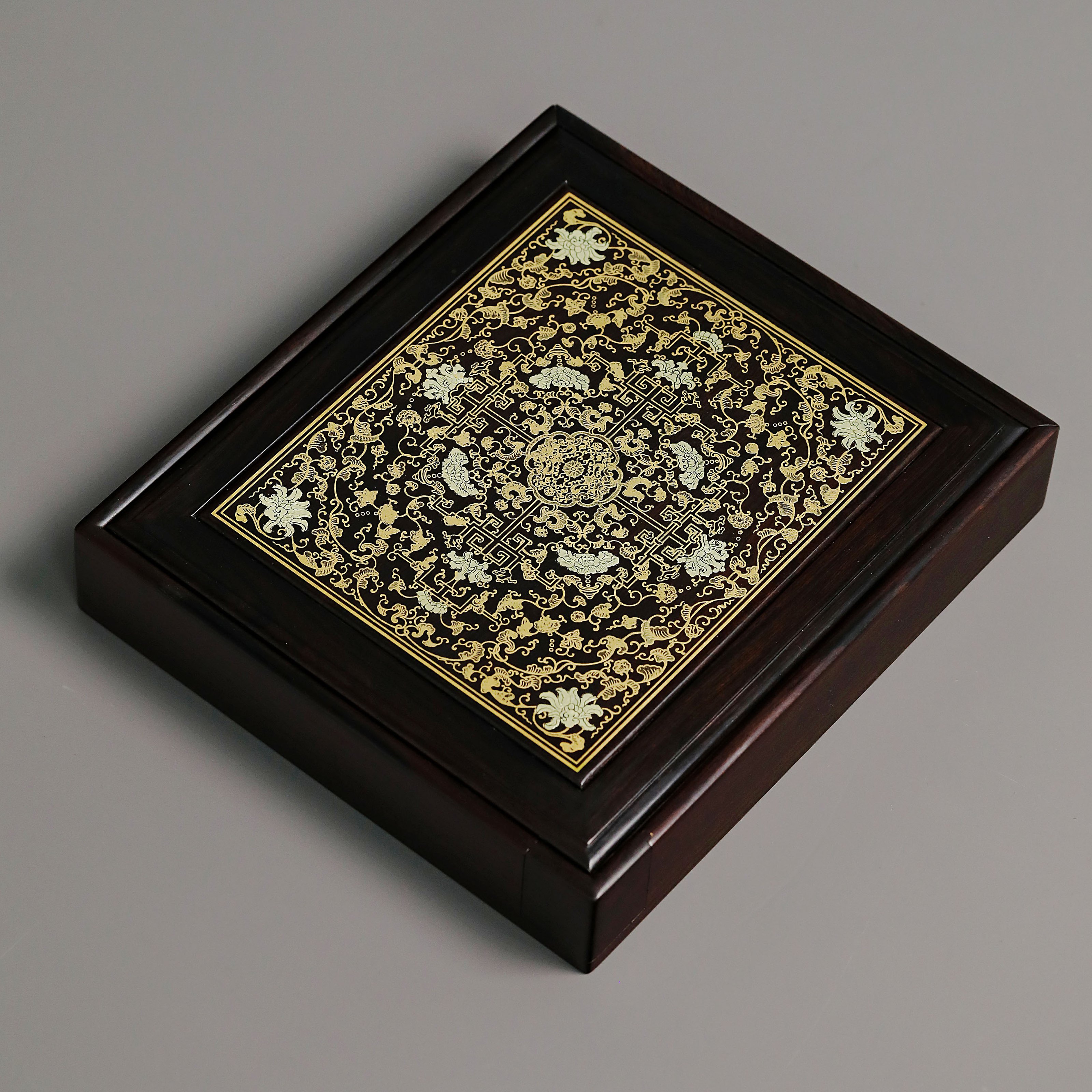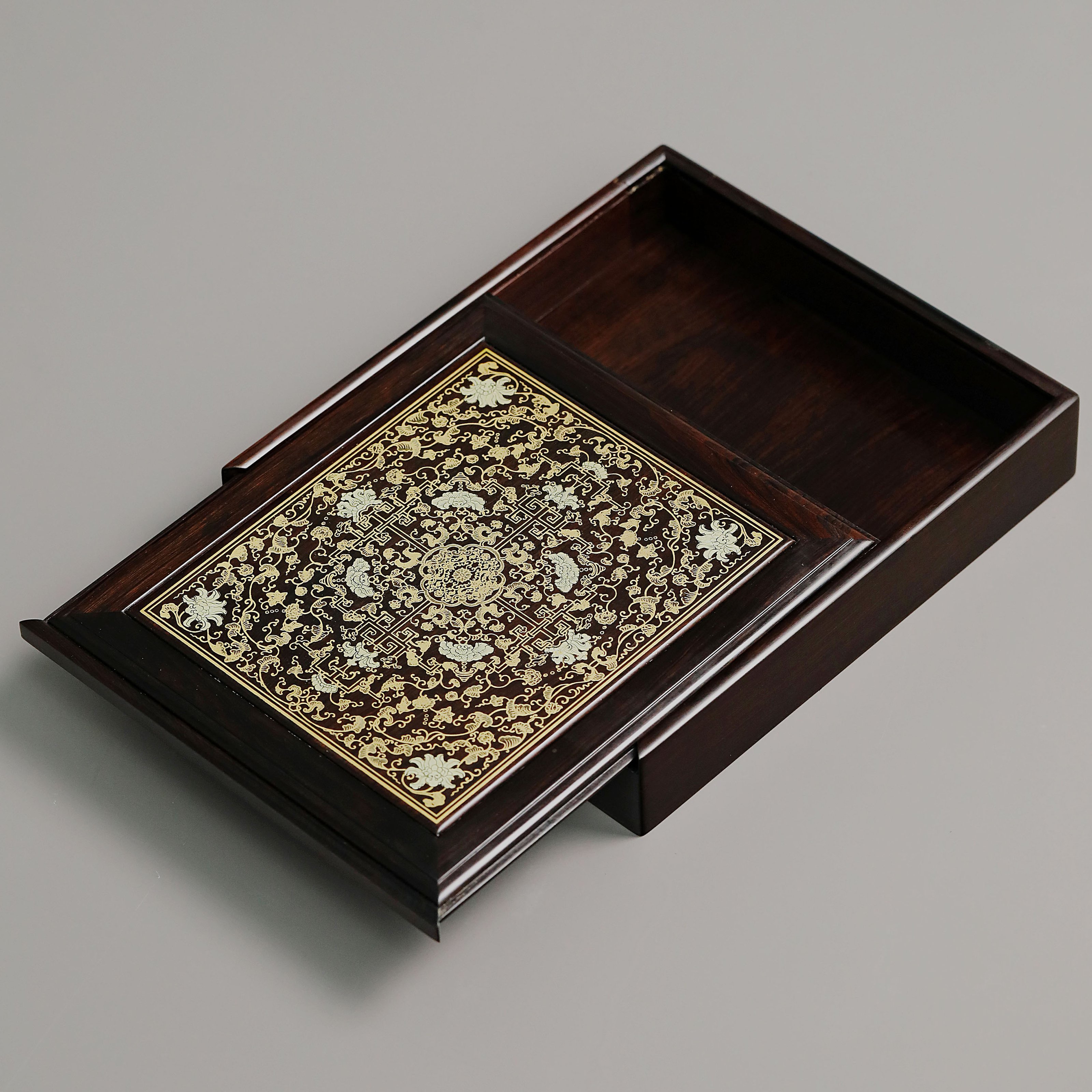 长:26cm 宽:23cm 高:5cm 紫光檀 普洱茶盒抽拉式描金工艺 茶盒规制方形,东非黑黄檀老料制,东非黑黄檀又称紫光檀,色泽沉稳静穆,盖面描金以绘缠枝莲宝相花之精彩图案。整器榫卯结构严谨,盖面可从一侧抽出,转角开口,方便分茶,专设边槽,存放茶刀,设计精妙,匠心之作。